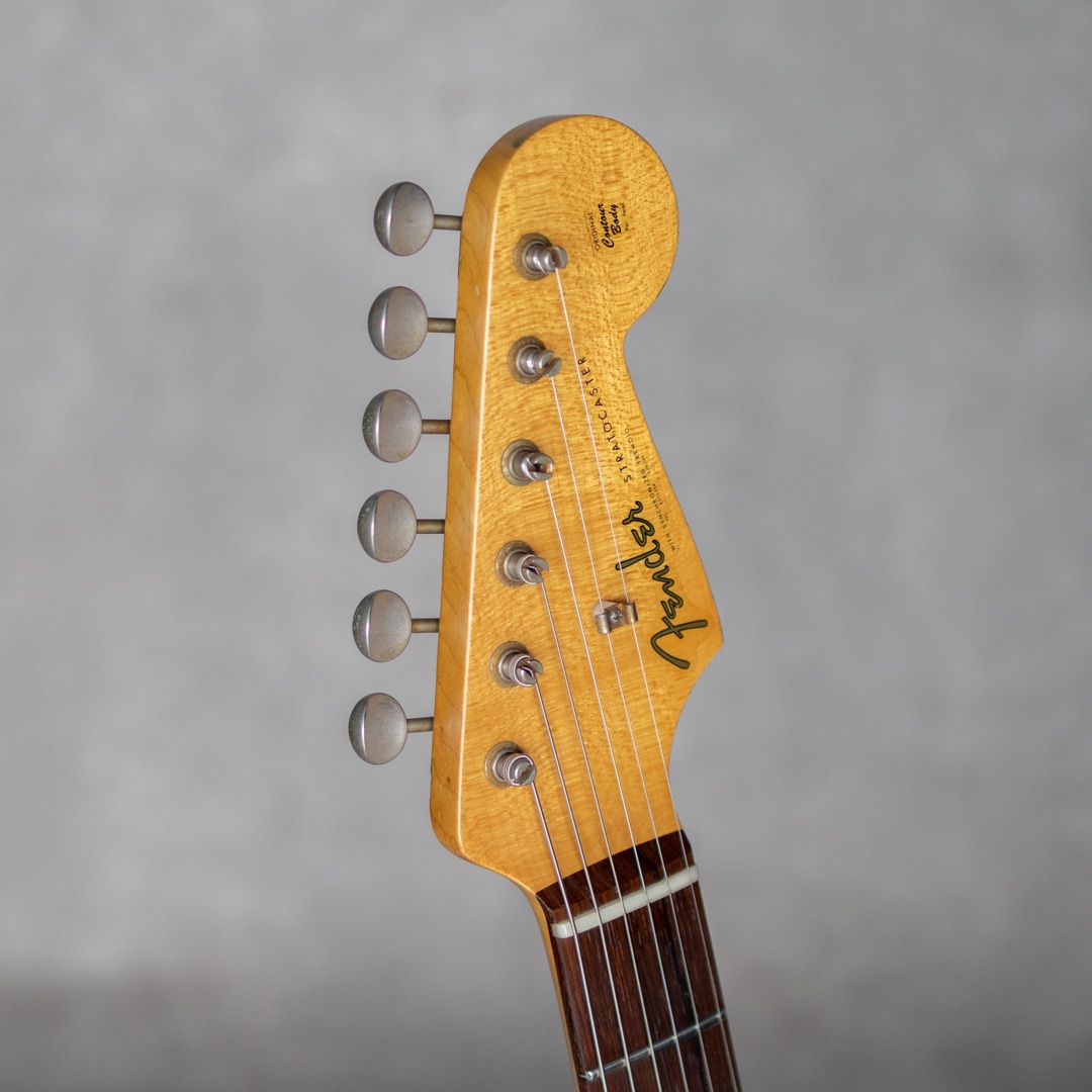 "Fender Custom Shop"最高峰の憧れ"Master Built"。本器は”Jason Smith(ジェイソン・スミス)”作の”1962 Stratocaster Heavy Relic Black Overlay Seminole Red”。クールなレイヤーカラードの貫禄ヘビーレリックモデル2007年製USED品。アルダーオフセット2ピースボディ、クオーターソーンメイプルネックにスラブローズ指板の1962年仕様。ネックのメイプル材はしっかりとド柾目で採られた少し握り心地のあるオーバル”C”シェイプ。指板材にはハカランダのような杢が出たアフリカンローズウッドを使用。9.5”R指板、ミディアムジャンボフレット。ピックガードには4plyのトートイスシェルガード、そしてピックアップにはFAT’50sピックアップと0.1uFフィルムコンデンサーを搭載。もちろん62ですので、2パテントナンバー入りのヘッドロゴです。フィニッシュは、渋い雰囲気満点レイヤーカラードの貫禄ヘビーレリック仕上げ。オリジナルでは滅多にお目にかかれないレアカラーのセミノールレッドにブラックをオーバーレイした通好みのカラー。マルチレイヤーカラーならではの下地が覗き見える1本です。ネック裏も元よりノーフィニッシュになっており、ヘビーレリックならではの仕上がりを存分にお楽しみいただけます。父親である”Dan Smith(ダン・スミス)"や師事した”John English(ジョン・イングリッシュ)"などから深く引き継がれているフェンダースピリットとロックミュージックがDNAに流れている”Jason Smith”。ビンテージフェンダーから受け継ぐトーンバランスを持ち、しっかりと芯があり反応の良いサウンド。62らしい甘い倍音を含みながらもゴリっと応えてくれるロックなフィールを持ち合わせた本器。ブライトできらきらした音色から、甘いしっとりしたトーン、エッジの聞いたドライブサウンドまで、幅広いストラトらしいサウンドを味わっていただけます。使用に伴う傷や使用感は伺いにくく、とても良好なコンディションで保たれた本器。ネックコンディションも良好でフレット減りも殆んど無く、弾きやすいアクションでしっかりとお使いいただけます。憧れのマスタービルト、MBSならではのエイジド具合やカラーパターンを楽しめるビンテージモデル好きにはたまらない正統派アプローチのビンテージモデルです。オリジナルハードケース、認定書、スペックシートや新品時付属品等もしっかりと付属します。