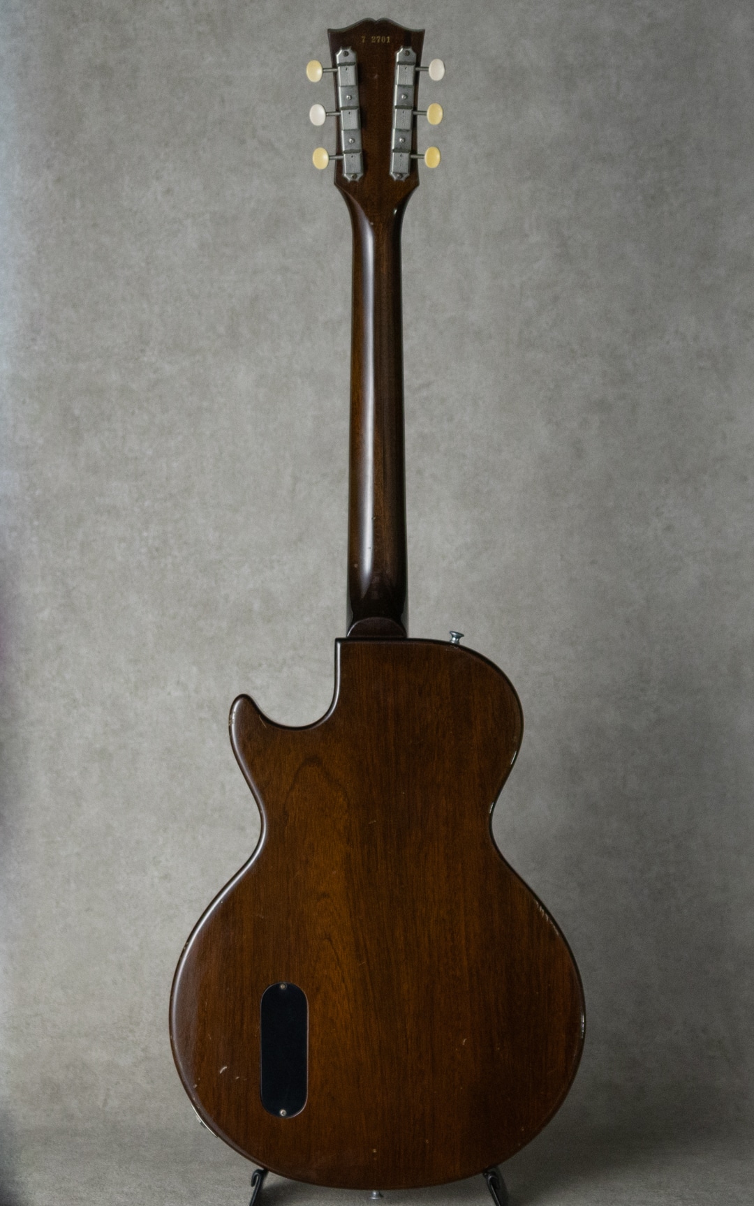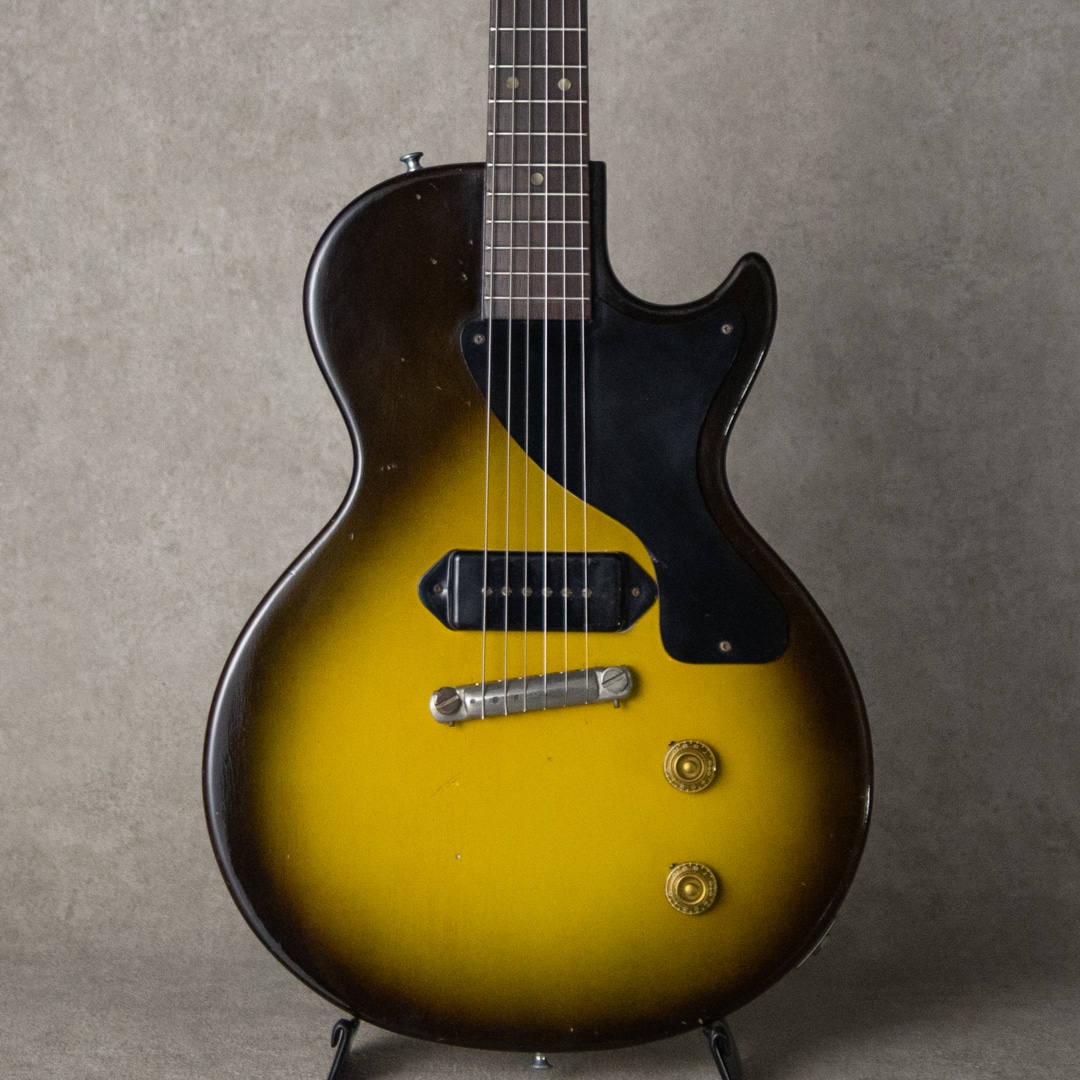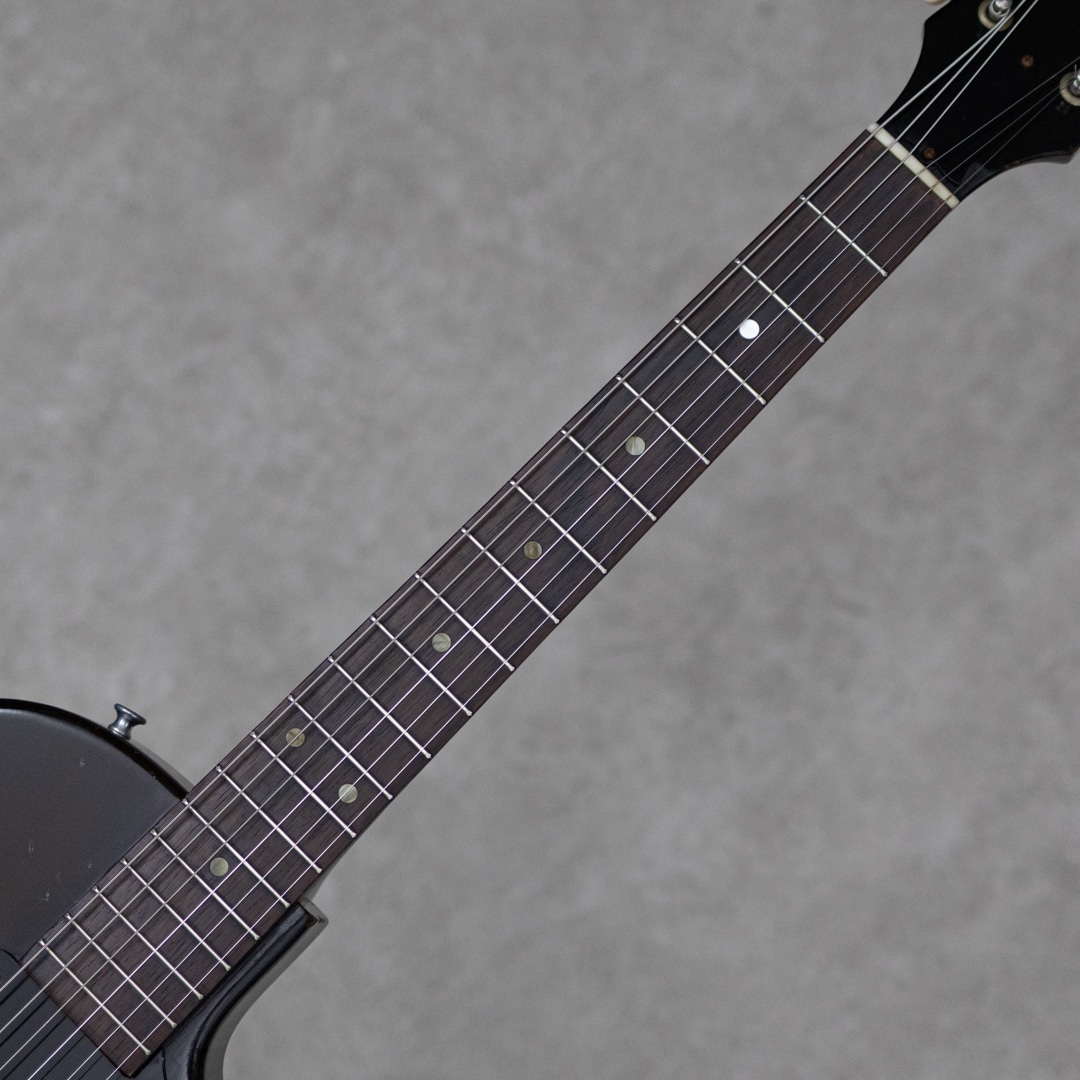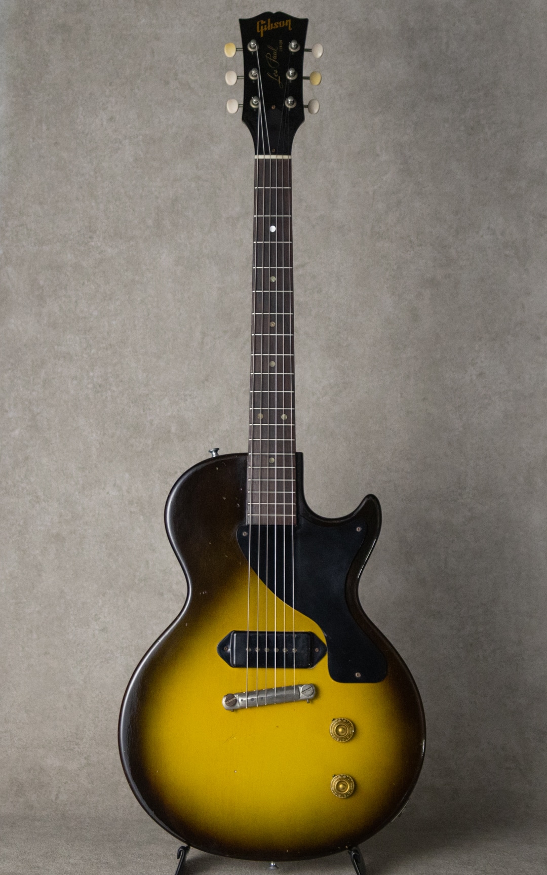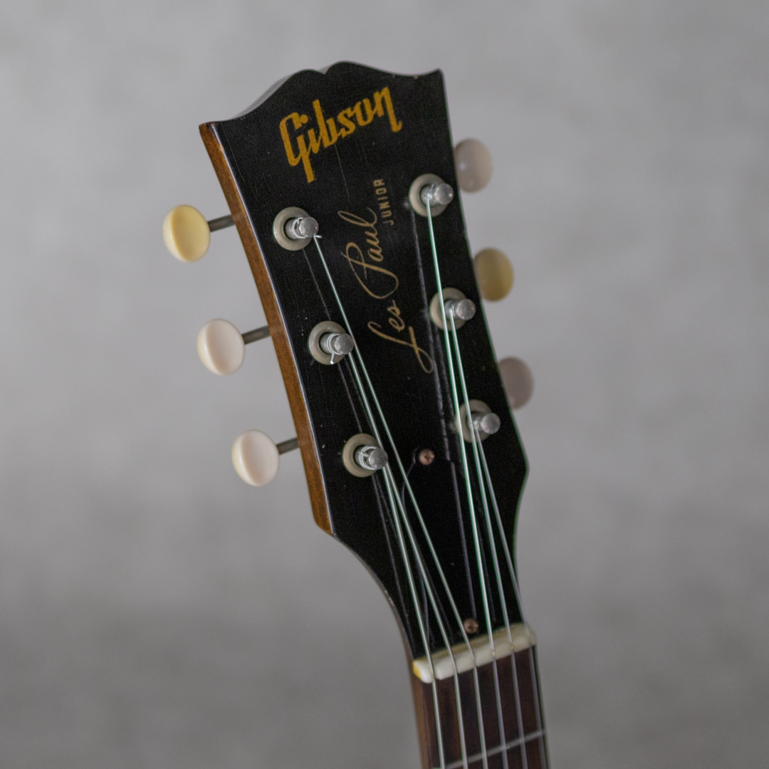 22 3/4インチ・スケールに19フレットのスペックをもつLes Paul Junior 3/4。通常仕様の"Junior"登場の2年後、56年に登場した本モデルは、"Junior"のマホガニーボディが流用され、フレットを減らして短くなった専用のネックと合わせることによって製作されました。59年には通常サイズモデルがダブルカットのスタイルに変更され、"3/4"に関してもダブルカットのボディシェイプとなります。ダブルカット期ではネックジョイント部の兼ね合いで、通常モデルと大きく異なるデザインとなりますが、こちらのシングルカット期に関してはラップアラウンドブリッジの位置が僅かに下がり、PUとの距離が広がる他、ほぼ変わらないデザインでパッと見た限りでは通常仕様の"Junior"と見間違えてしまうほどです。このサイズながらしっかりと50'sギブソンらしさを感じられる本器。短いスケールと華奢なネックにより余計な倍音が落とされた印象があり、クッキリとした音像、ハリやコシを感じさせてくれる自然な芯の太さ等、P-90の旨みを存分に感じられる響きを持ちます。スケールが短い分チョーキングやビブラートのかけ方に一癖あり、少し慣れが必要ですが、その演奏性のスリリングさもまた、ユニークなアウトプットを演出してくれる楽しい楽器です。こちら全体的に赤みが飛んで退色しており、ピックガードを外すと元のカラーとの対比が一目瞭然ですが、黄色と黒のモノトーンなサンバーストも良い雰囲気です。その他細かな打痕、ウェザーチェックなどあるものの、著しく外観を損ねるダメージはなく、50年代の製造であることを鑑みるとむしろ良い印象の貫禄溢れるヴィンテージです。ペグは近年製のKlusonに交換済み。その他、ピックアップ、ポット、コンデンサ等電装系は全てオリジナル。フレットの残りは7‐8割程、ロッドの調整も含めネックコンディション良好で、まだまだ現状でも長くお楽しみいただける状態。