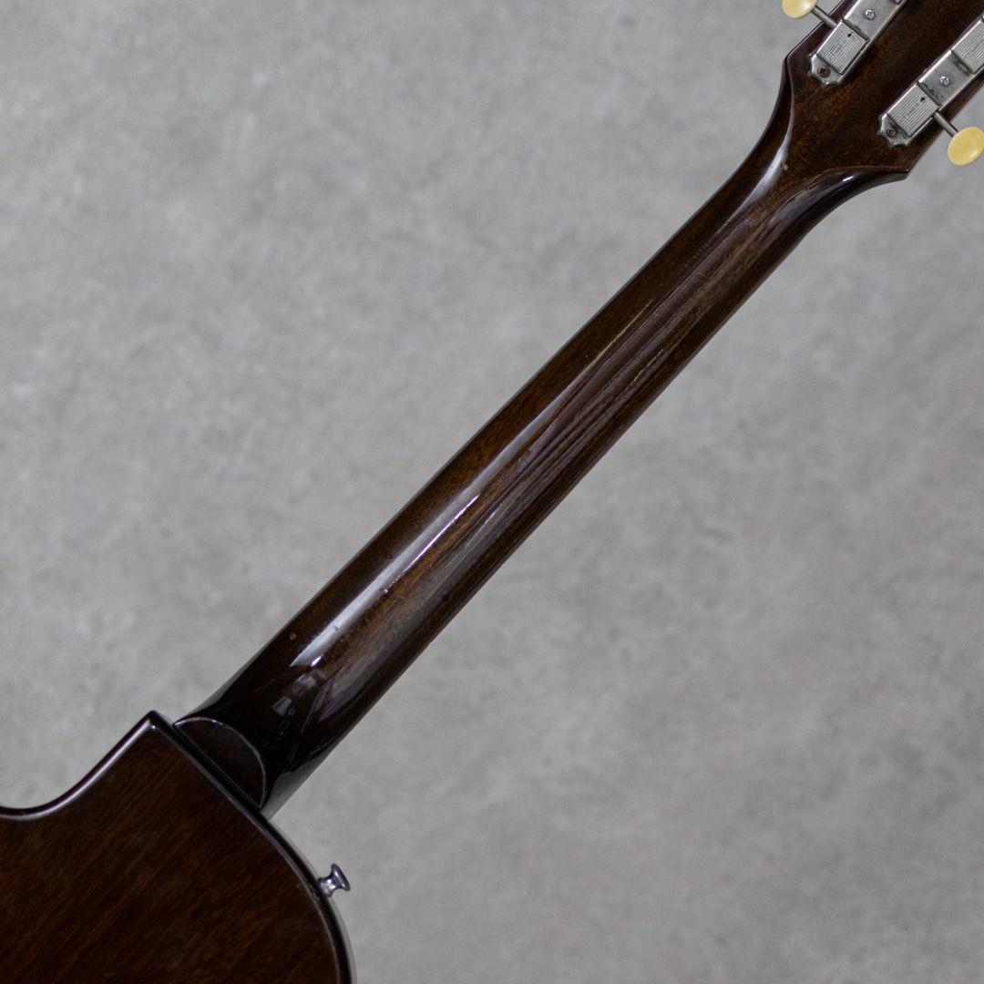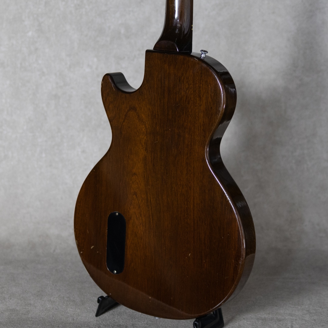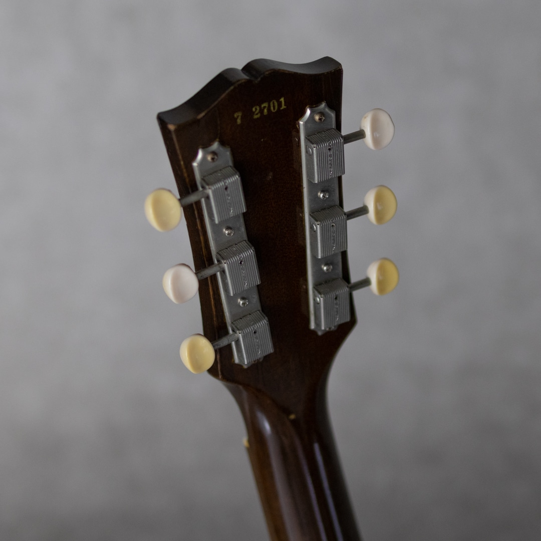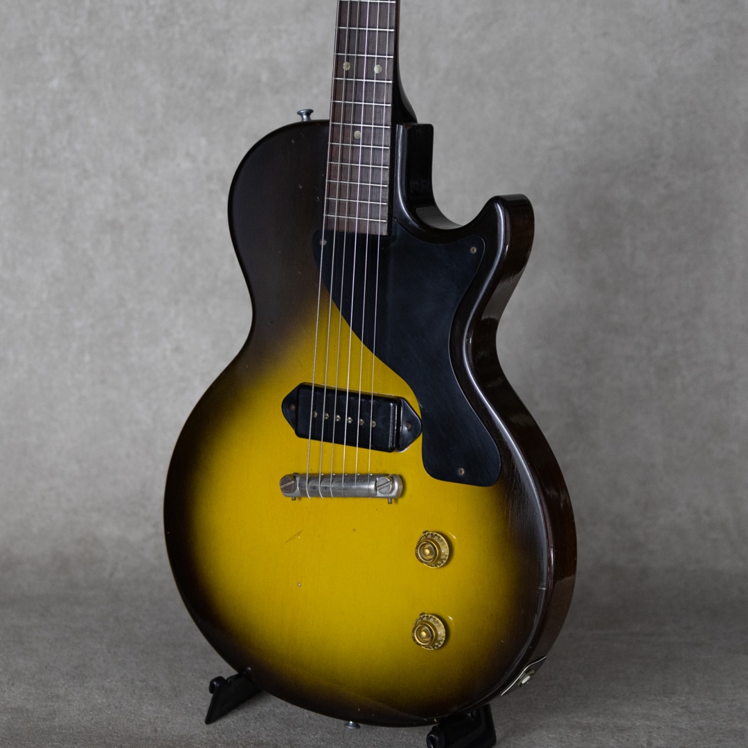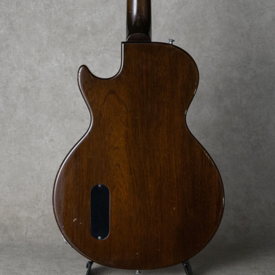 22 3/4インチ・スケールに19フレットのスペックをもつLes Paul Junior 3/4。通常仕様の"Junior"登場の2年後、56年に登場した本モデルは、"Junior"のマホガニーボディが流用され、フレットを減らして短くなった専用のネックと合わせることによって製作されました。59年には通常サイズモデルがダブルカットのスタイルに変更され、"3/4"に関してもダブルカットのボディシェイプとなります。ダブルカット期ではネックジョイント部の兼ね合いで、通常モデルと大きく異なるデザインとなりますが、こちらのシングルカット期に関してはラップアラウンドブリッジの位置が僅かに下がり、PUとの距離が広がる他、ほぼ変わらないデザインでパッと見た限りでは通常仕様の"Junior"と見間違えてしまうほどです。このサイズながらしっかりと50'sギブソンらしさを感じられる本器。短いスケールと華奢なネックにより余計な倍音が落とされた印象があり、クッキリとした音像、ハリやコシを感じさせてくれる自然な芯の太さ等、P-90の旨みを存分に感じられる響きを持ちます。スケールが短い分チョーキングやビブラートのかけ方に一癖あり、少し慣れが必要ですが、その演奏性のスリリングさもまた、ユニークなアウトプットを演出してくれる楽しい楽器です。こちら全体的に赤みが飛んで退色しており、ピックガードを外すと元のカラーとの対比が一目瞭然ですが、黄色と黒のモノトーンなサンバーストも良い雰囲気です。その他細かな打痕、ウェザーチェックなどあるものの、著しく外観を損ねるダメージはなく、50年代の製造であることを鑑みるとむしろ良い印象の貫禄溢れるヴィンテージです。ペグは近年製のKlusonに交換済み。その他、ピックアップ、ポット、コンデンサ等電装系は全てオリジナル。フレットの残りは7‐8割程、ロッドの調整も含めネックコンディション良好で、まだまだ現状でも長くお楽しみいただける状態。