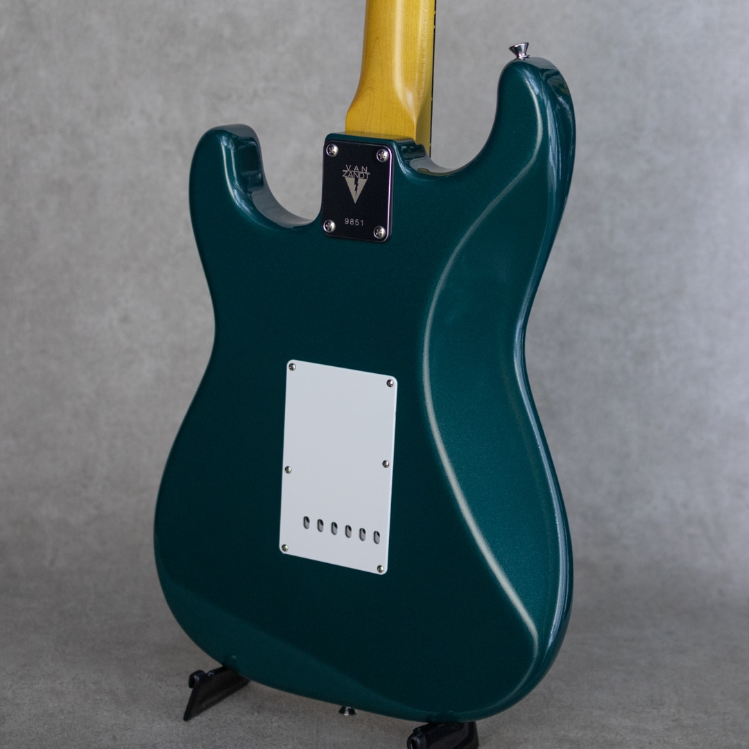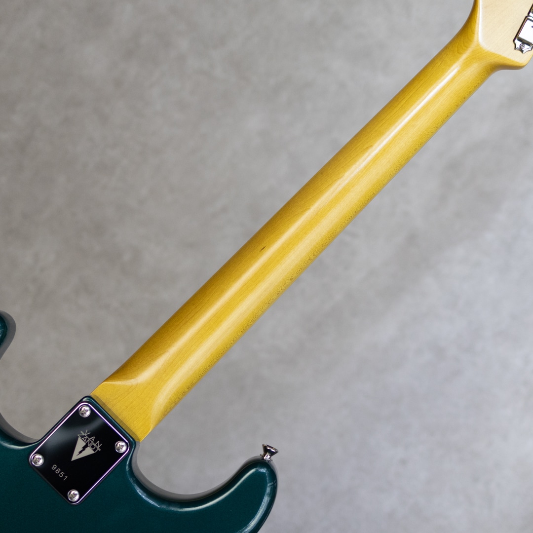 “Neo Vintage”を感じさせる”Vanzandt”。数多くのミュージシャンから愛されたテキサス生まれの”Van Zandt”ピックアップを搭載し、国産の確かな技術で作り上げられるギターは、その価格以上のクオリティを感じずにはいられない実力派ギター。本器は60年代モデルを踏襲した”STV-R2 Lake Placid Blue”。ピックアップに"Van Zandt” TrueVintage&Bluesを搭載したショップセミオーダーモデル。アルダー2pcsボディ、こだわりの板目取りメイプルネックにインディアンローズウッドスラブ指板のウッドスペックといった王道スペック。ネックグリップは22フレット仕様の60 Style Oval Cシェイプで、厚すぎず薄すぎない弾き心地の良いネックシェイプ。通常モデルのピックアップは”Van Zandt”Bluesx3が搭載されておりますが、本器にはフロントPU&センターPUに”Van Zandt”TrueVintageを、リアPUには”Van Zandt”Bluesを搭載。トーンコンデンサーにはヴァンザントオリジナルレプリカコンデンサーを使用。フロント・センター時のクリアで乾いた響きは、より奥行きのあるベルトーンを思わせるレンジの広い響きで、リア時のパンチのあるミッドの効いたサウンドはドライブサウンドにも持ってこいです。より繊細で表現力のあるフロントやハーフトーンでファットでメロウなトーンから、エッジの効いたアグレッシブなパワー感の得られるリアサウンドまで幅広いサウンドメイクを可能にしてくれる1本です。