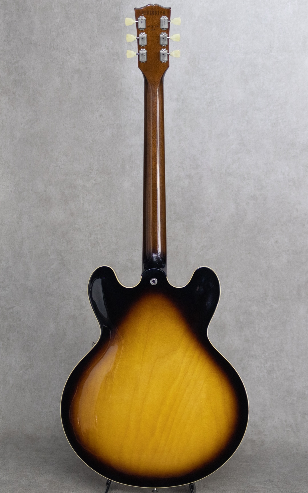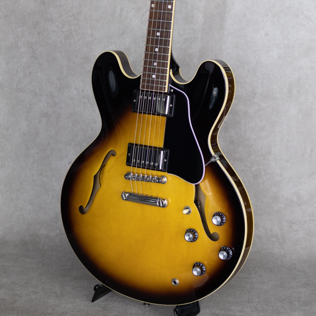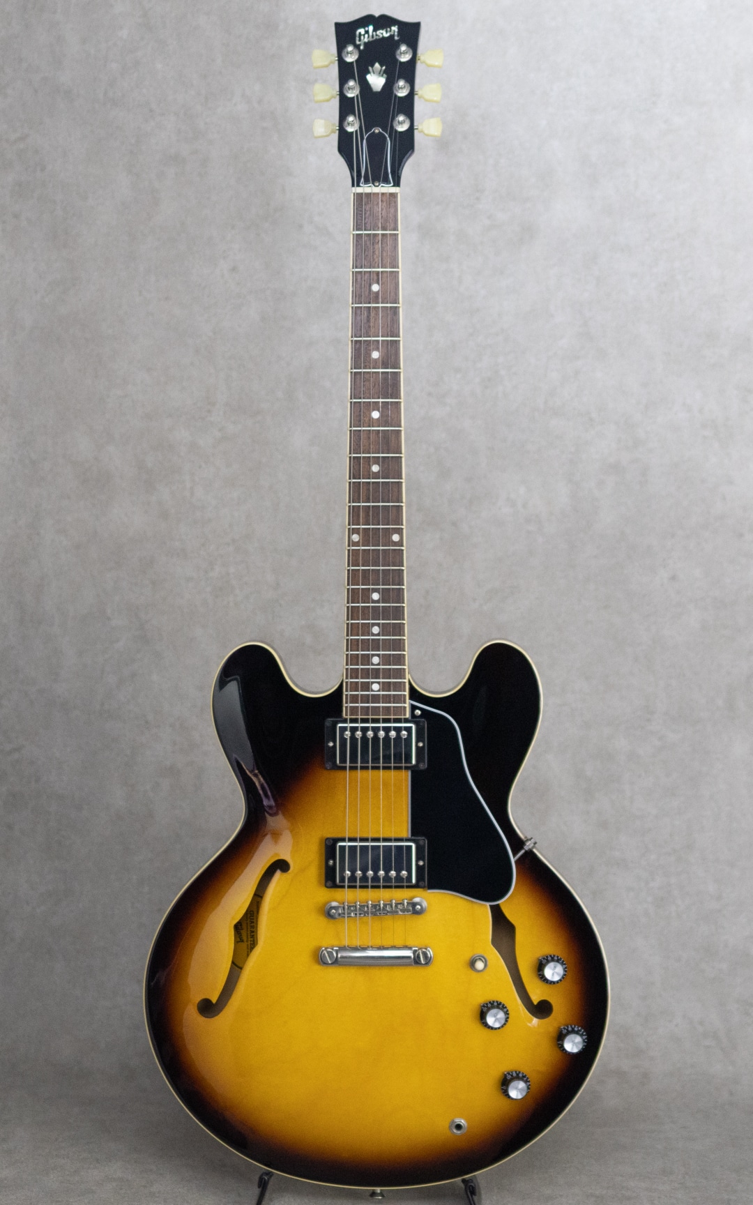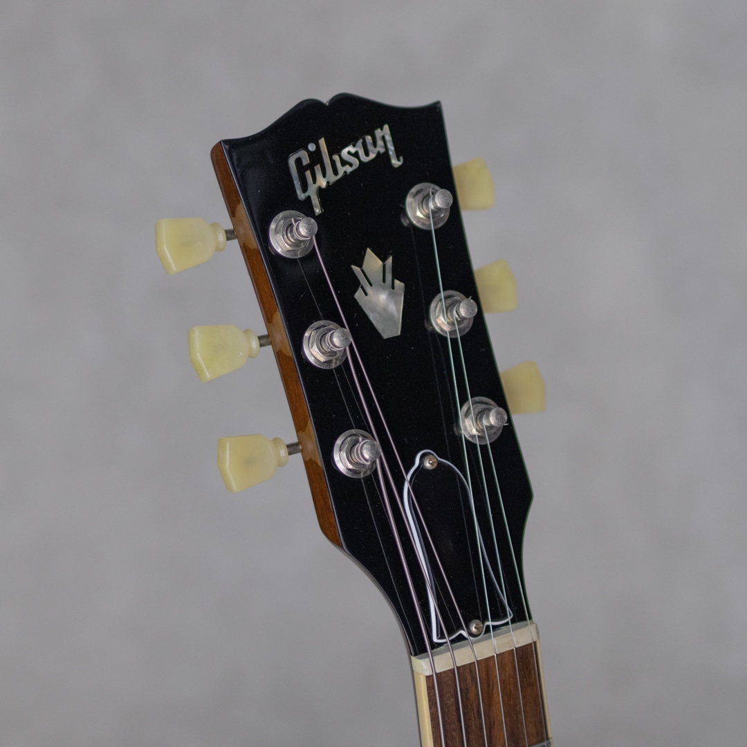 Les Paulに続き、憧れのGibsonエレクトリックとして君臨する王道モデルES-335。"セミアコ"の代名詞としての存在感は言わずもがな、バーサタイルな実用性を伴った完成度から、古今あらゆる場面でプレイヤーたちに愛用され数々の名演を彩ってきたことも絶えない人気の所以でしょう。本器は2020年製ES-335 Vintage Burst。2000年Memphis工場立ち上げ以降、ESモデルの生産はそちらに移行をされていきましたが、Memphis工場は2019年に惜しまれつつも閉鎖。本器モデルは従来のNashville工場での製造に戻って来てからのモデルとなります。ラミネートメイプルボディ、Rounded "C"シェイプマホガニーネック、ドットポジション、ニッケルハードウェアと普遍的デザインのレギュラーES-335。ピックアップには"Calibrated T-Type"を採用。こちらは前述のMemphis最終期にES専用ピックアップとして開発された"MHS(Memphis Historic Spec)"の後継モデルで、マグネットにはアルニコVを採用。ヴィンテージライクなタッチレスポンス、"箱モノ"らしいエアリーなニュアンスをしっかり再生しつつも、ローミッドの厚みと安定感のある出力でドライブの乗りも抜群です。ABR-1ブリッジとアルミテールピースの王道コンビネーションはニッケルメッキ仕様で、使い込むほどに味わいが深まる様子も楽しみの一つ。こちら極細かな当てキズや細かな擦れ跡等はあるものの、顕著に目立つダメージはございません。フレットも多少の使用感はあるもののまだまだ十分お楽しみいただけるコンディション。ロッドの調整を含めネックの状態も良好です。オリジナルハードケースが付属。