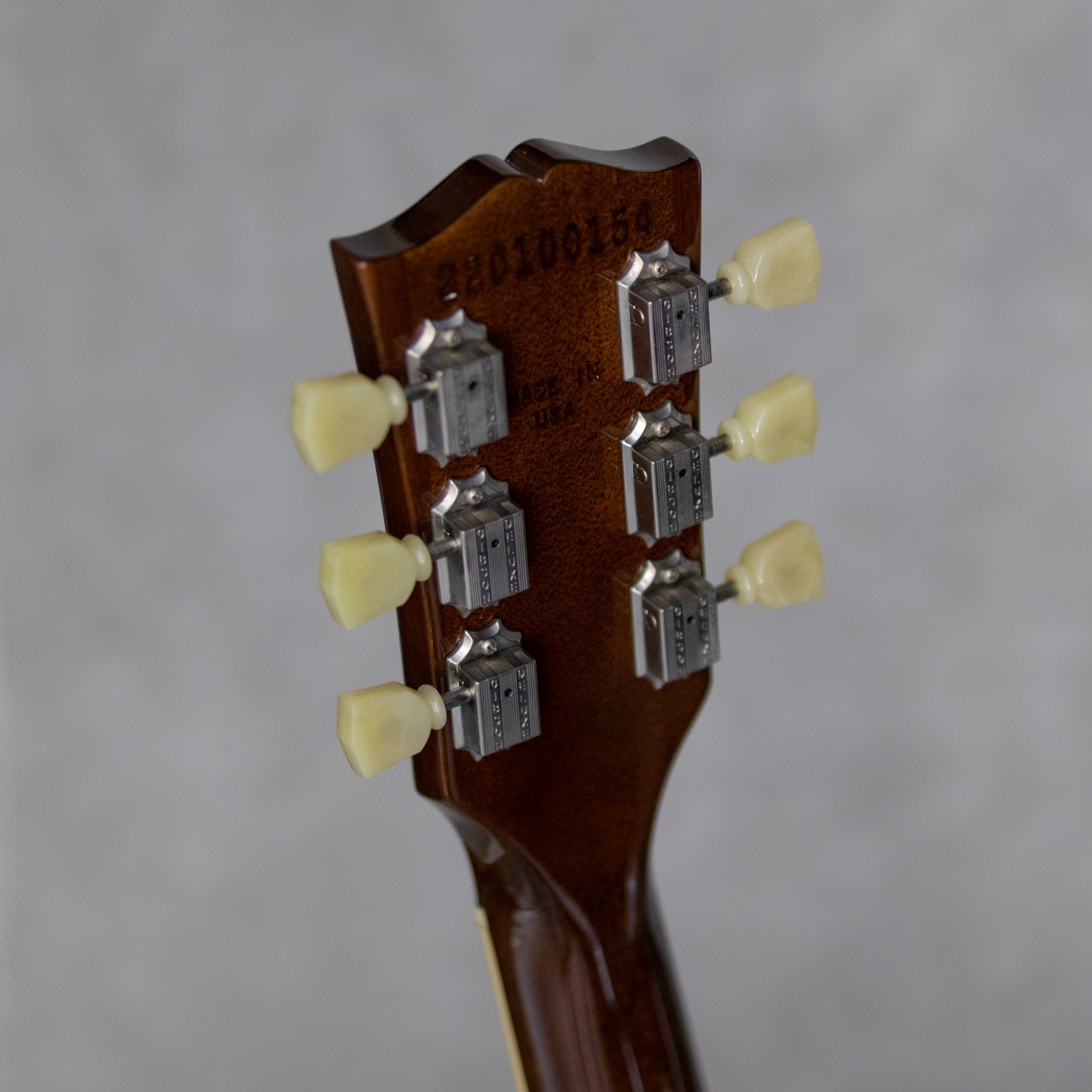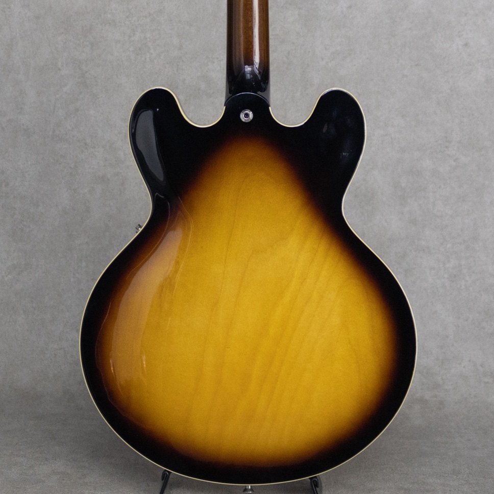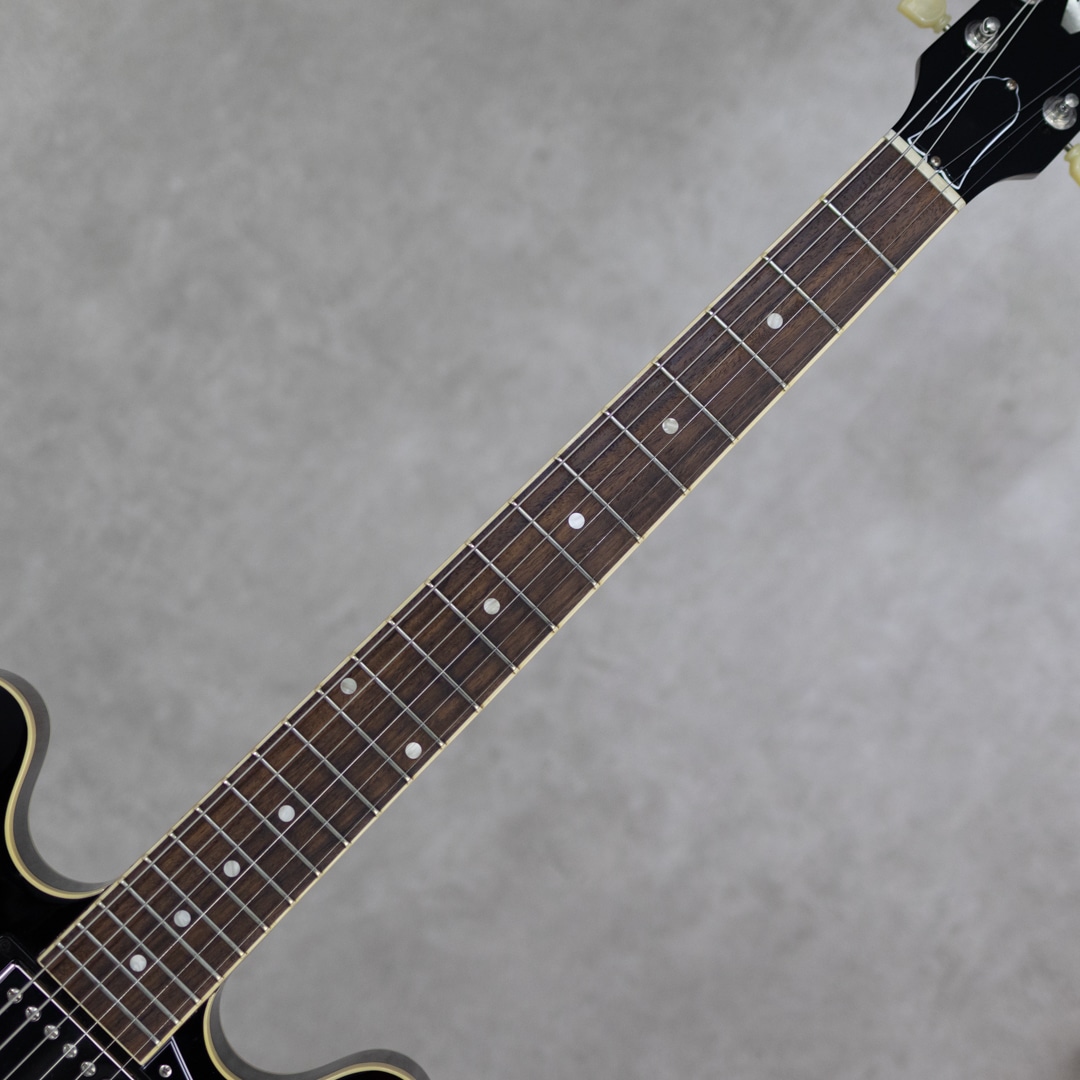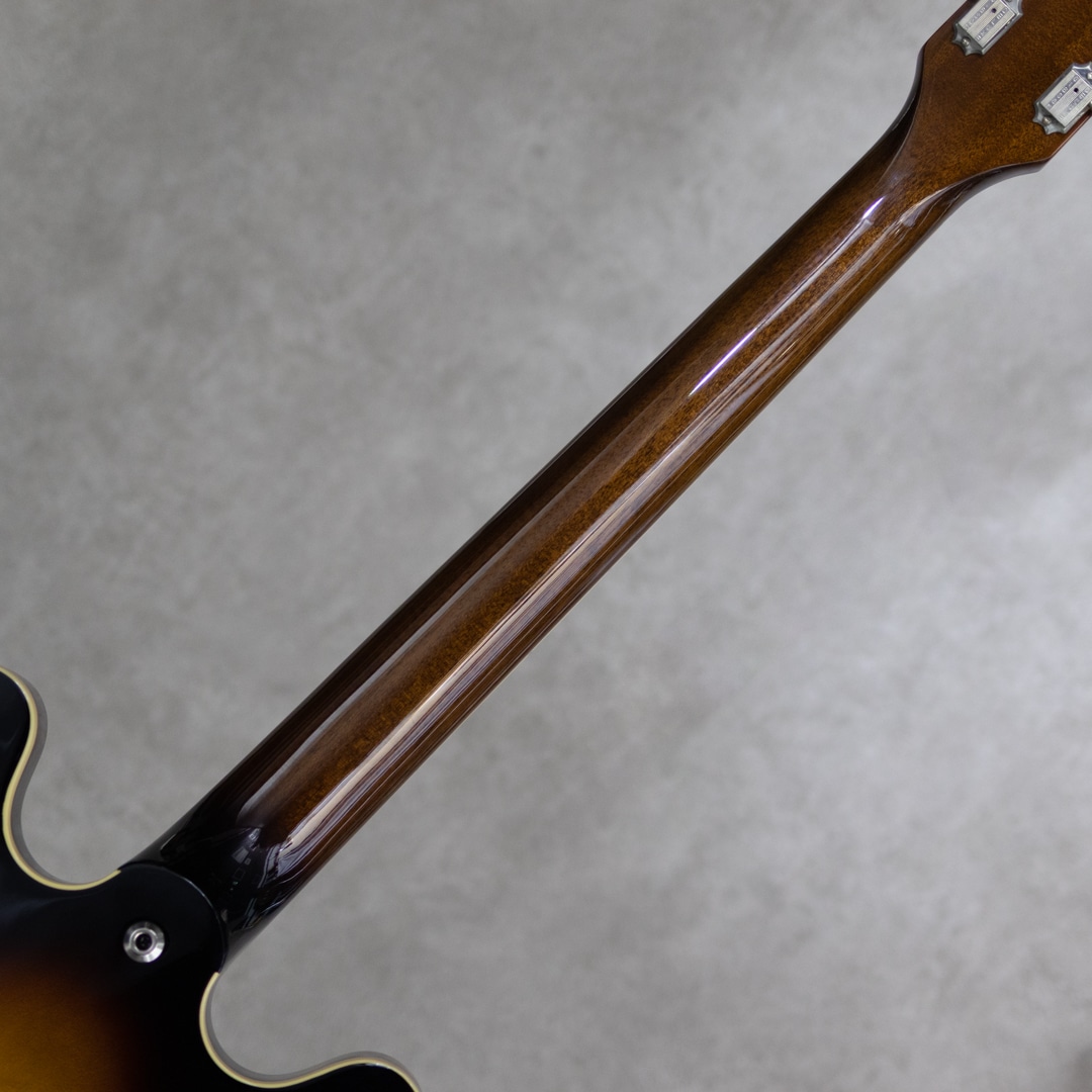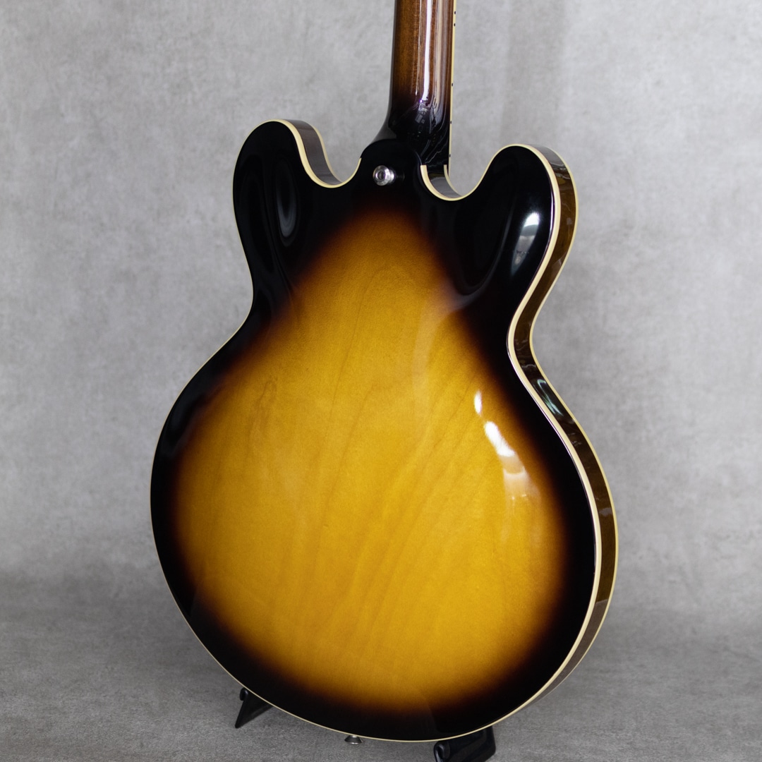 Les Paulに続き、憧れのGibsonエレクトリックとして君臨する王道モデルES-335。"セミアコ"の代名詞としての存在感は言わずもがな、バーサタイルな実用性を伴った完成度から、古今あらゆる場面でプレイヤーたちに愛用され数々の名演を彩ってきたことも絶えない人気の所以でしょう。本器は2020年製ES-335 Vintage Burst。2000年Memphis工場立ち上げ以降、ESモデルの生産はそちらに移行をされていきましたが、Memphis工場は2019年に惜しまれつつも閉鎖。本器モデルは従来のNashville工場での製造に戻って来てからのモデルとなります。ラミネートメイプルボディ、Rounded "C"シェイプマホガニーネック、ドットポジション、ニッケルハードウェアと普遍的デザインのレギュラーES-335。ピックアップには"Calibrated T-Type"を採用。こちらは前述のMemphis最終期にES専用ピックアップとして開発された"MHS(Memphis Historic Spec)"の後継モデルで、マグネットにはアルニコVを採用。ヴィンテージライクなタッチレスポンス、"箱モノ"らしいエアリーなニュアンスをしっかり再生しつつも、ローミッドの厚みと安定感のある出力でドライブの乗りも抜群です。ABR-1ブリッジとアルミテールピースの王道コンビネーションはニッケルメッキ仕様で、使い込むほどに味わいが深まる様子も楽しみの一つ。こちら極細かな当てキズや細かな擦れ跡等はあるものの、顕著に目立つダメージはございません。フレットも多少の使用感はあるもののまだまだ十分お楽しみいただけるコンディション。ロッドの調整を含めネックの状態も良好です。オリジナルハードケースが付属。