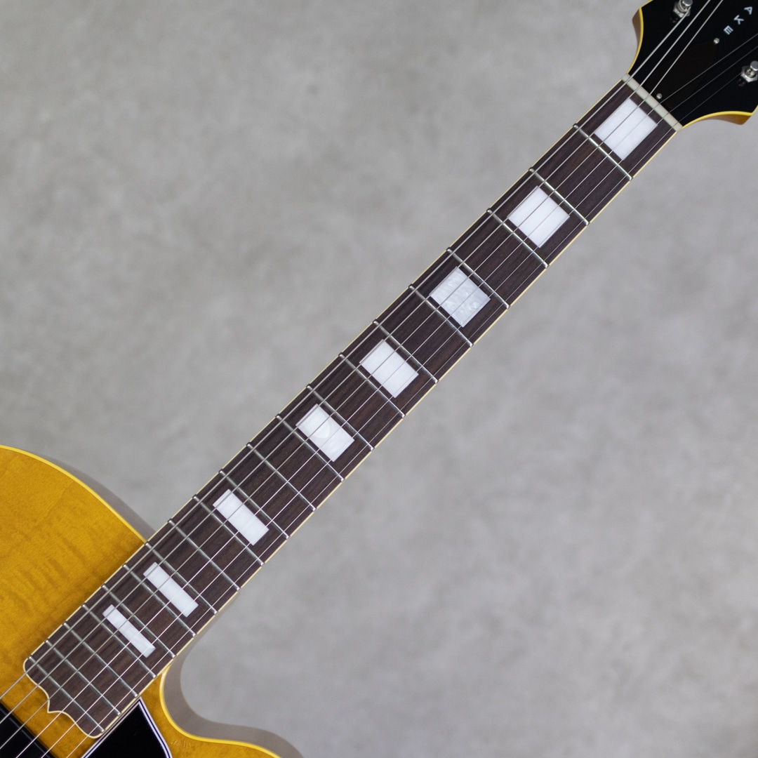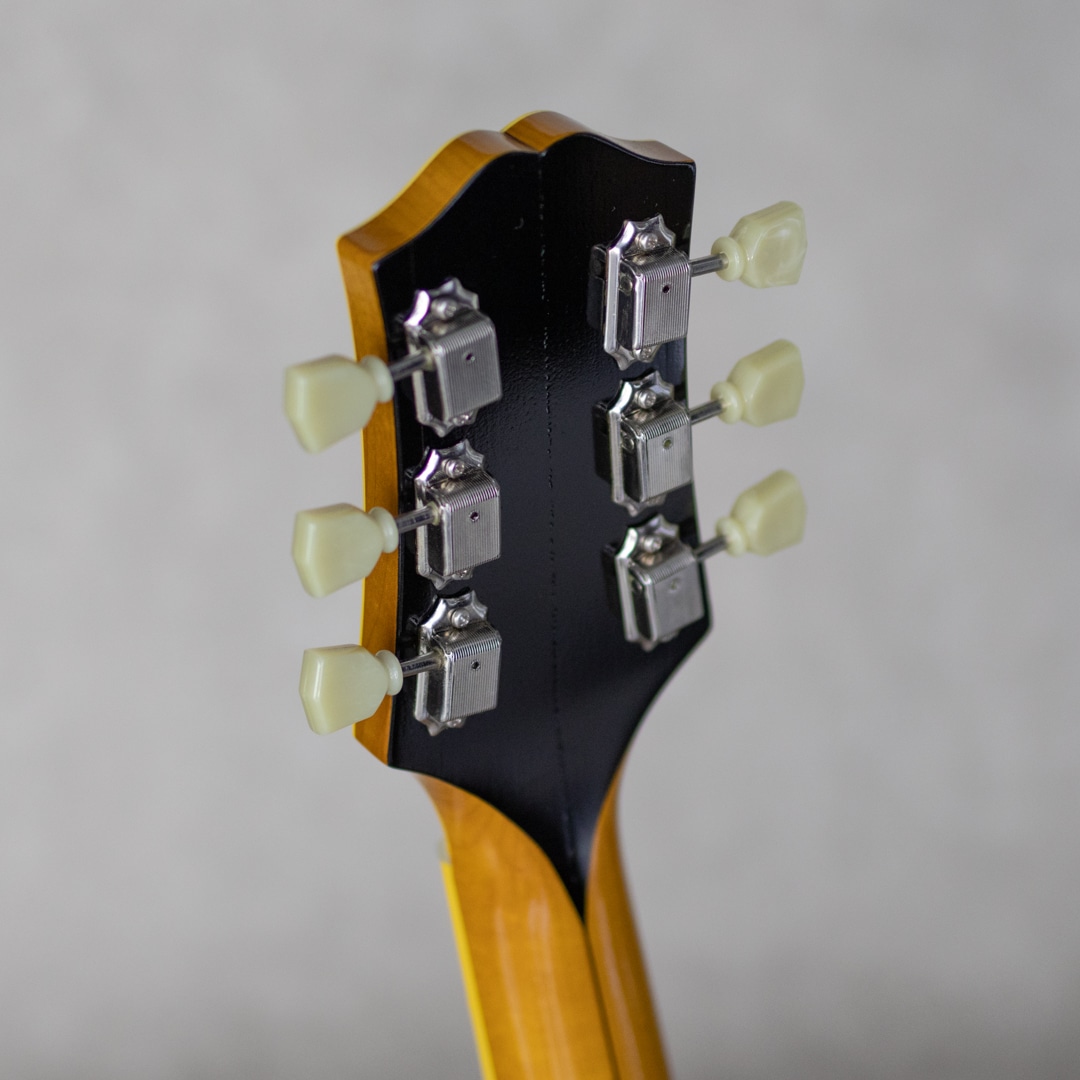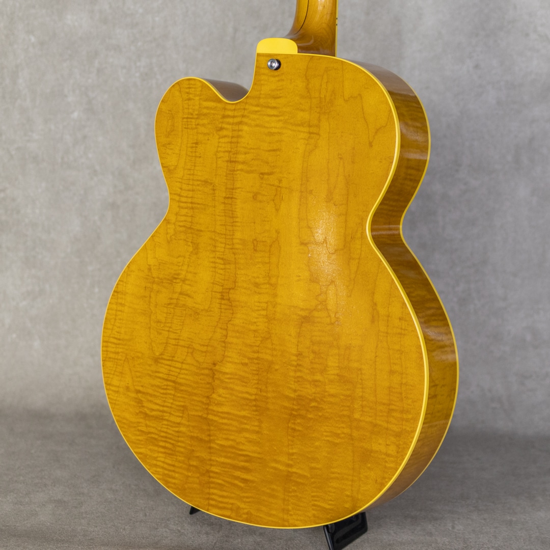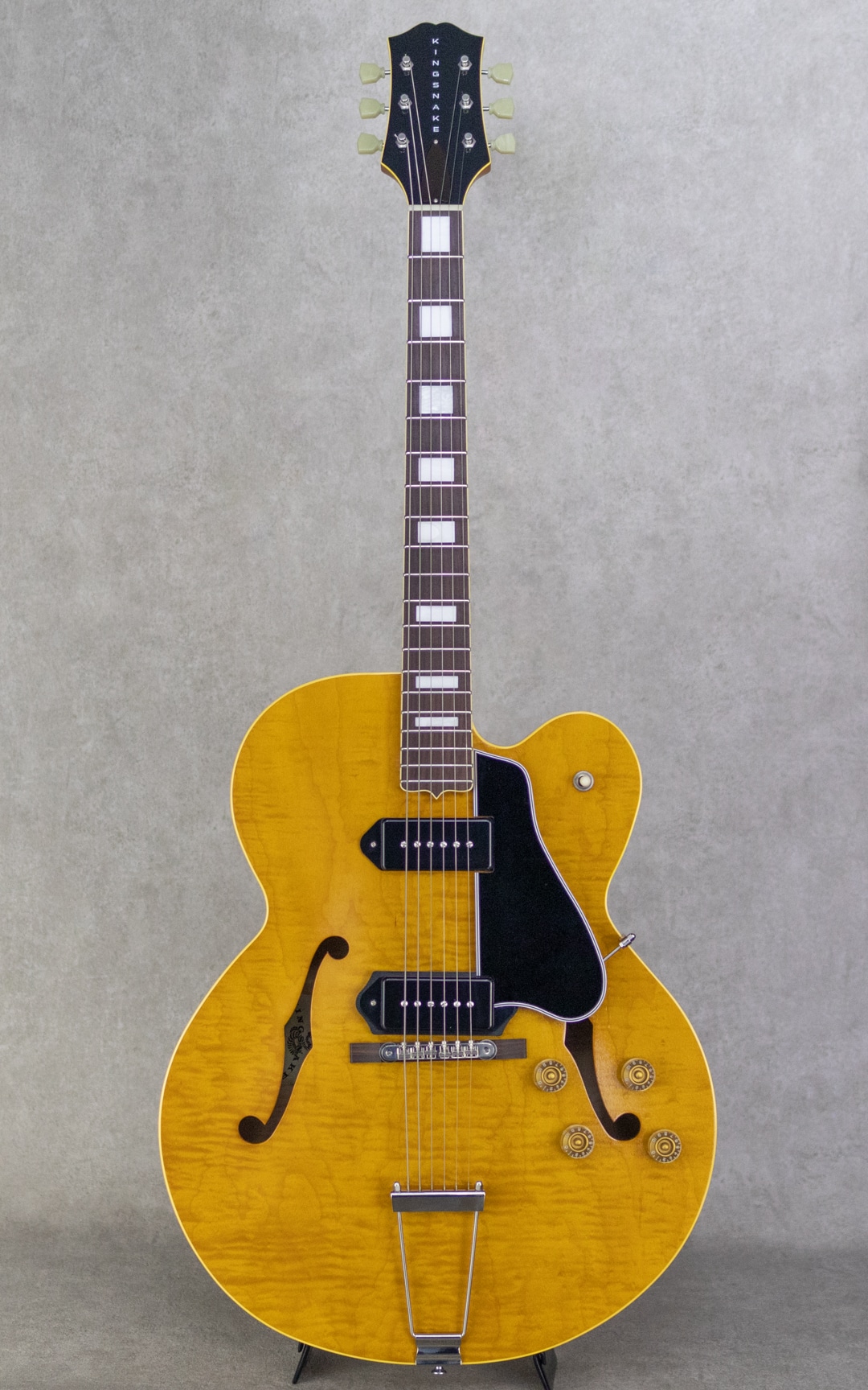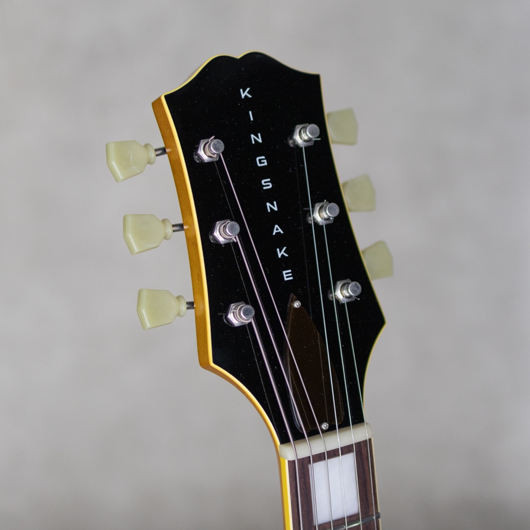 抜群のコストパフォーマンスを誇り、随所にこだわったハイクオリティな製品を生み出す"KING SNAKE"。現在ではフルアコ=ジャズというイメージが先行しますが、ソリッドギターの誕生以前はほとんどのエレクトリックはアーチトップであり、ブルースや初期のロックで聞ける小型アンプをオーバードライブさせた図太いトーンはソリッドギターには無い魅力です。そうした"箱モノ"モデルのもう一つの側面を再認識させてくれる、そんなコンセプトに振ったブランドこそが"KING SNAKE"です。本器は17インチ・ディープボディの2ピックアップモデル"TWO BONE"。17インチのラミネイトカーリーメイプル、フルデプスボディ、ローズウッド指板&ブリッジ、メイプルネック、オリジナルP-90スタイルピックアップ×2基搭載。ピックアップは独自にハンドワイヤリングにて製作。ネックピックアップはワイヤーのターン数を抑え、アルニコ5マグネットを採用、低音が前に出過ぎないチューニング。ブリッジピックアップはアルニコ4を用い、ターン数は多めでテンションを緩めにワインドし、キレがありながらもミッド&ローが力強いトーンとなるように設計されております。見るからに薄く仕上げられたニトロセルロースラッカーの塗膜だけでなく、ボディを構成するプライウッドに関しても極限まで薄く作られており、抜群のレスポンスと木の鳴感、強い入力がされた際のワイルドなうねり感を実現しております。とはいえ、あくまでもエレキギターとして、アンプに通した際のサウンドメイクを基調としている当ブランド。ブリッジ裏側にスプルースブロックを配置。ES-225にも見られる構造を彷彿とさせるこのブロックは、当モデルにおいては複数スリットを入れることで絶妙に調整されており、気持ちの良いサスティーンやコシのある立ち上がり、ブルージーなフィーリングの実現と共に、ハウリングへの対策にも役立っています。こちら極僅かに塗装の擦れ等あるものの、ほとんど使用感は感じさせない良好なコンディション。フレットの摩耗も感じられず、ロッドの調整も含め良い状態。オリジナルのハードケースが付属。