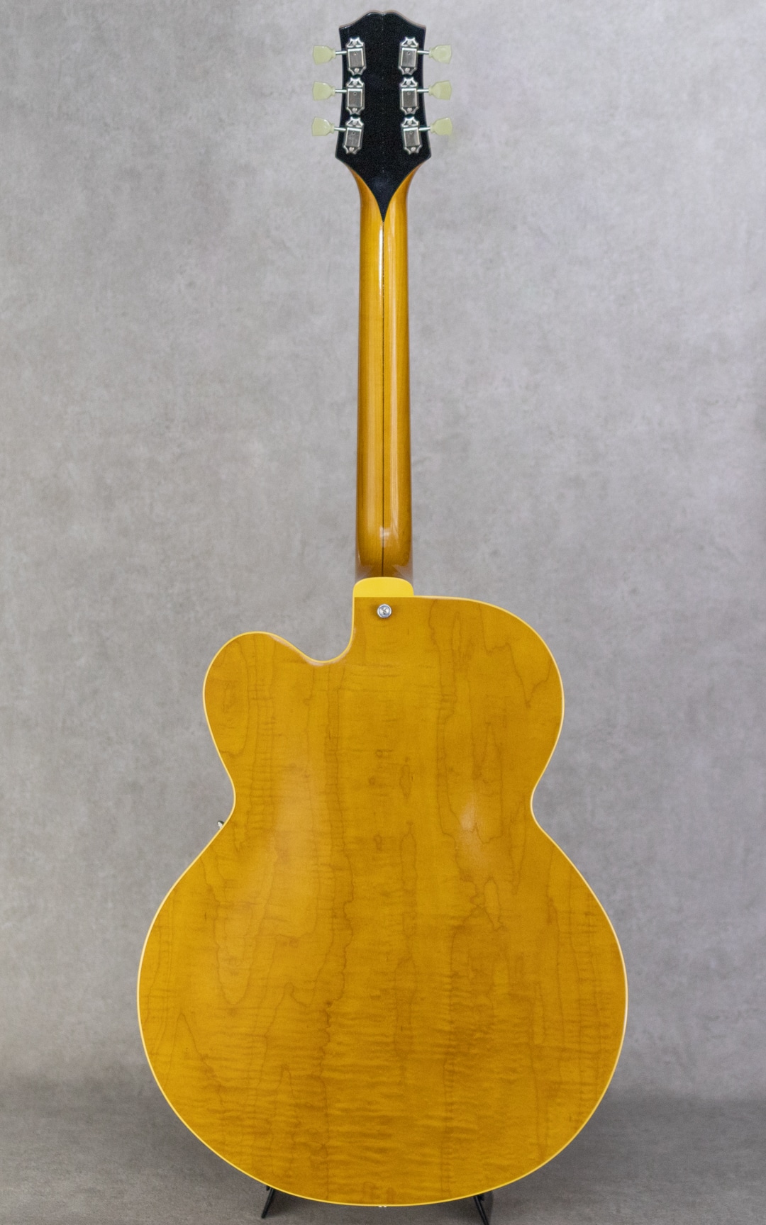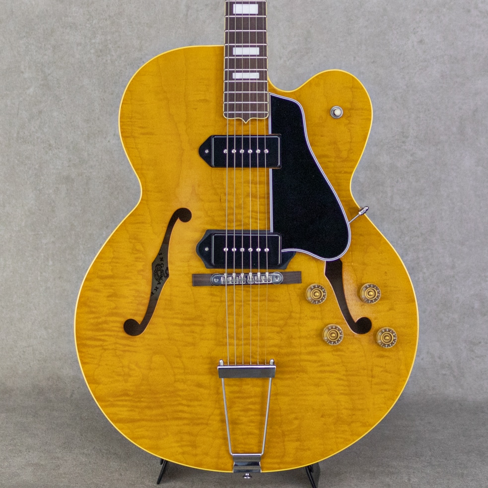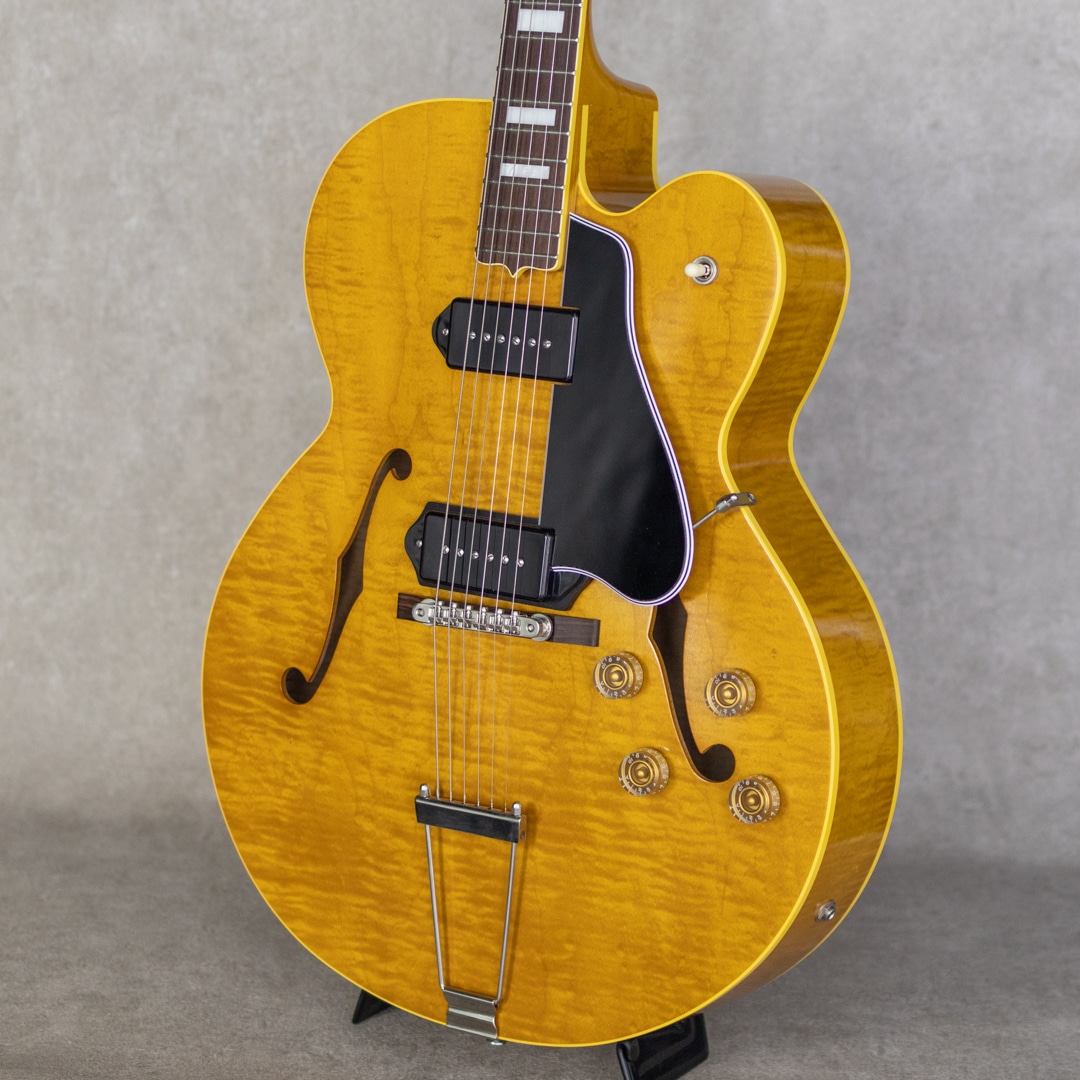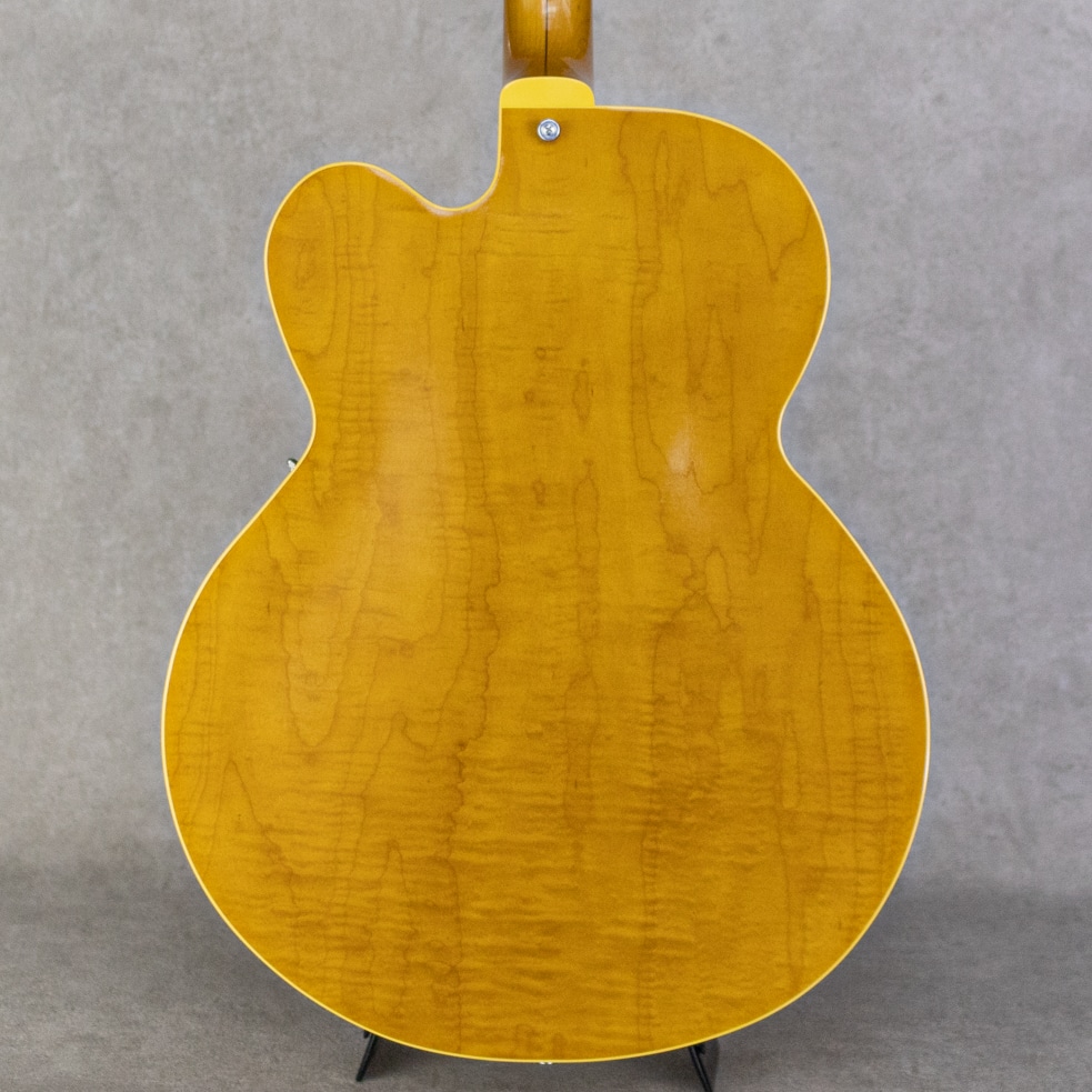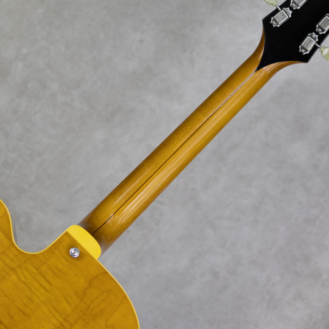 抜群のコストパフォーマンスを誇り、随所にこだわったハイクオリティな製品を生み出す"KING SNAKE"。現在ではフルアコ=ジャズというイメージが先行しますが、ソリッドギターの誕生以前はほとんどのエレクトリックはアーチトップであり、ブルースや初期のロックで聞ける小型アンプをオーバードライブさせた図太いトーンはソリッドギターには無い魅力です。そうした"箱モノ"モデルのもう一つの側面を再認識させてくれる、そんなコンセプトに振ったブランドこそが"KING SNAKE"です。本器は17インチ・ディープボディの2ピックアップモデル"TWO BONE"。17インチのラミネイトカーリーメイプル、フルデプスボディ、ローズウッド指板&ブリッジ、メイプルネック、オリジナルP-90スタイルピックアップ×2基搭載。ピックアップは独自にハンドワイヤリングにて製作。ネックピックアップはワイヤーのターン数を抑え、アルニコ5マグネットを採用、低音が前に出過ぎないチューニング。ブリッジピックアップはアルニコ4を用い、ターン数は多めでテンションを緩めにワインドし、キレがありながらもミッド&ローが力強いトーンとなるように設計されております。見るからに薄く仕上げられたニトロセルロースラッカーの塗膜だけでなく、ボディを構成するプライウッドに関しても極限まで薄く作られており、抜群のレスポンスと木の鳴感、強い入力がされた際のワイルドなうねり感を実現しております。とはいえ、あくまでもエレキギターとして、アンプに通した際のサウンドメイクを基調としている当ブランド。ブリッジ裏側にスプルースブロックを配置。ES-225にも見られる構造を彷彿とさせるこのブロックは、当モデルにおいては複数スリットを入れることで絶妙に調整されており、気持ちの良いサスティーンやコシのある立ち上がり、ブルージーなフィーリングの実現と共に、ハウリングへの対策にも役立っています。こちら極僅かに塗装の擦れ等あるものの、ほとんど使用感は感じさせない良好なコンディション。フレットの摩耗も感じられず、ロッドの調整も含め良い状態。オリジナルのハードケースが付属。