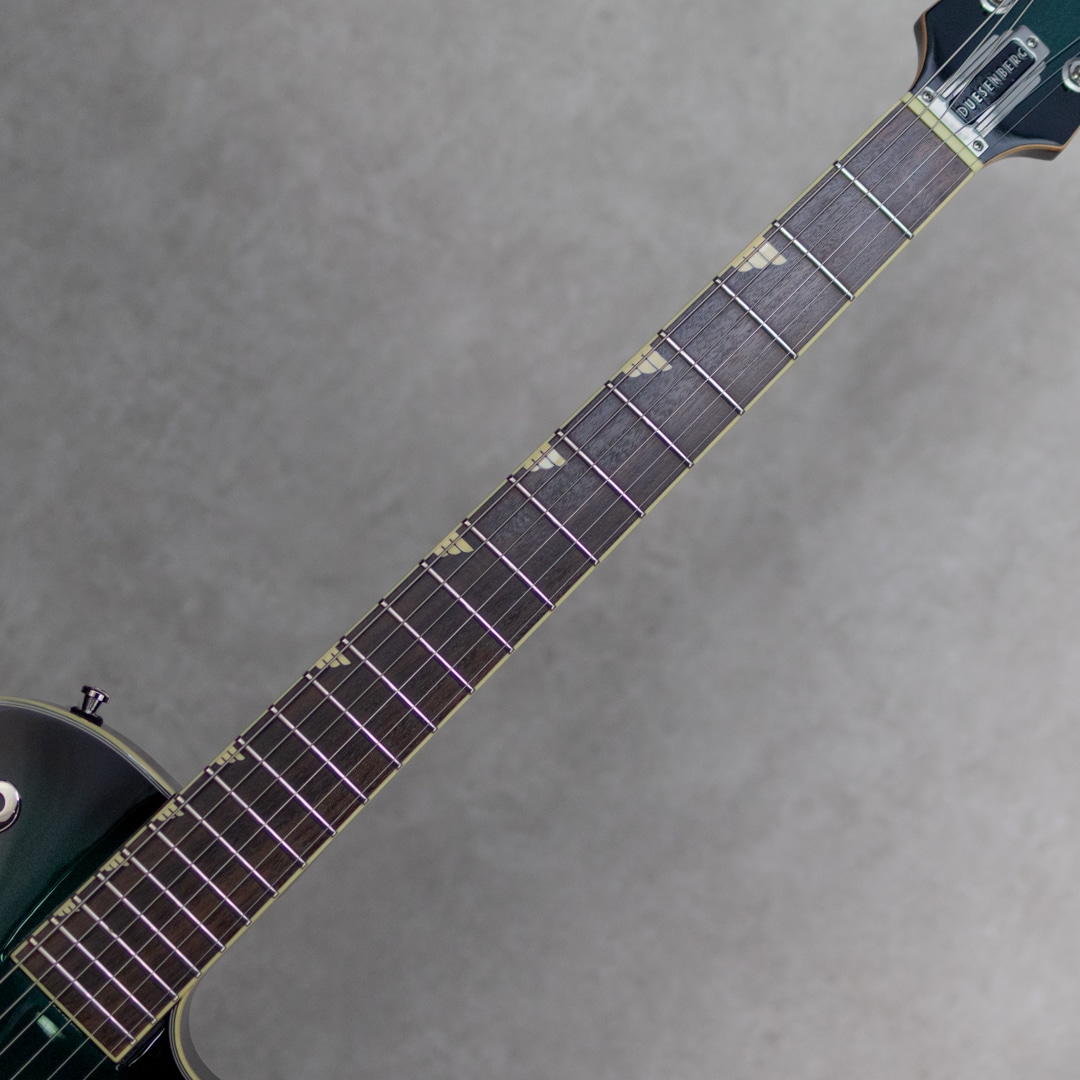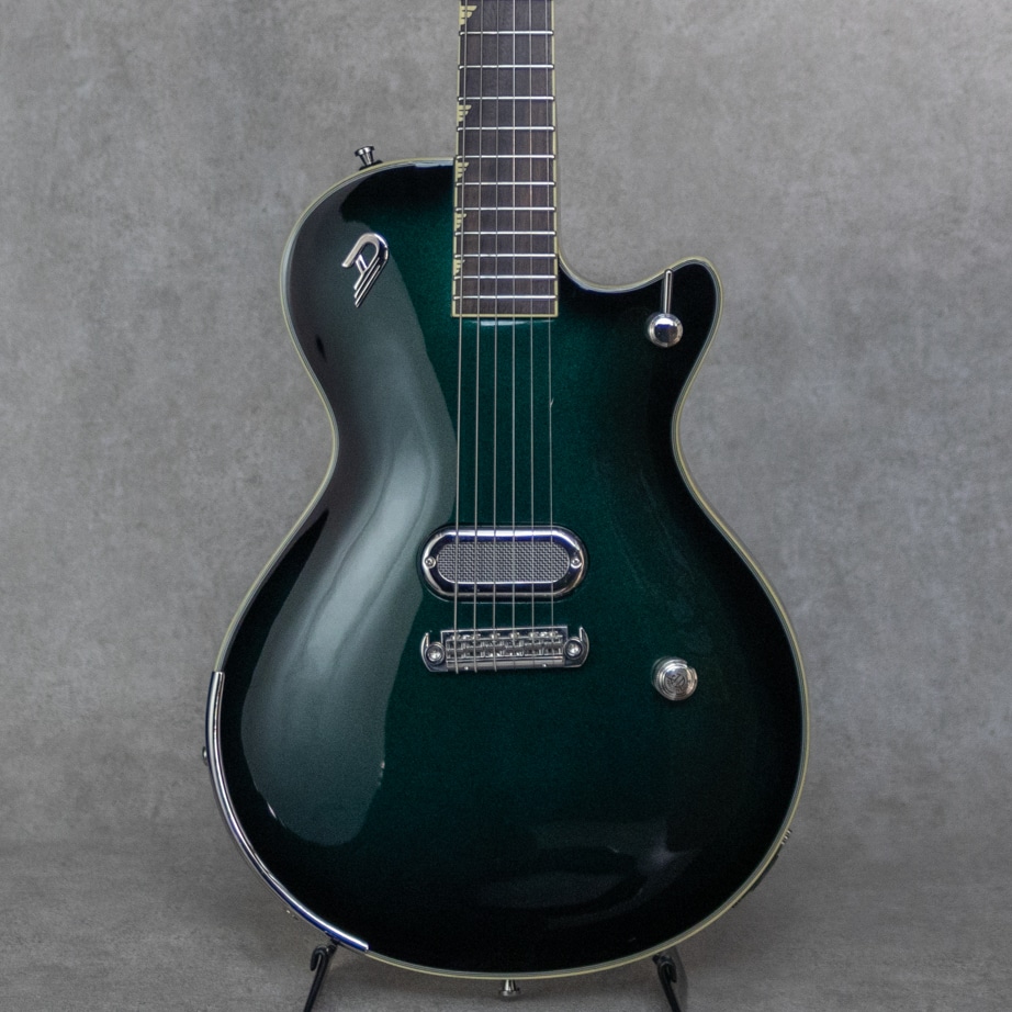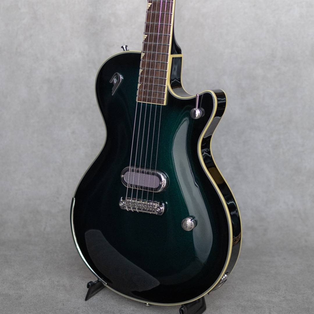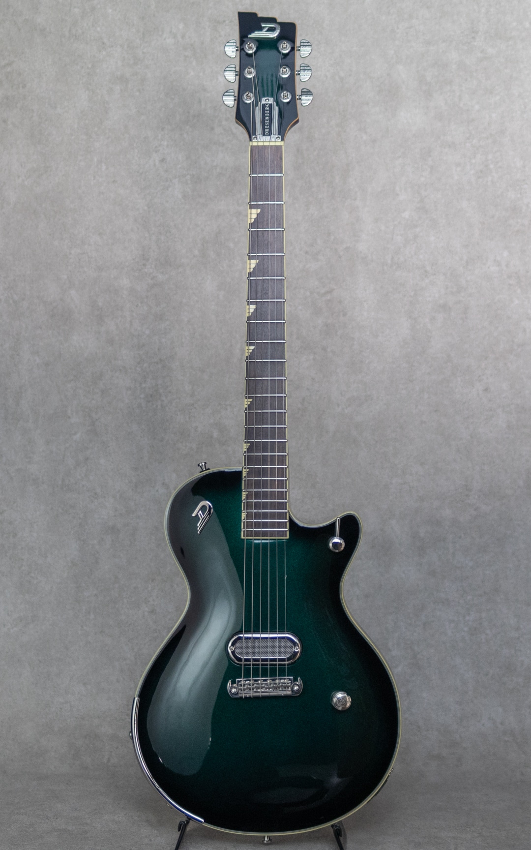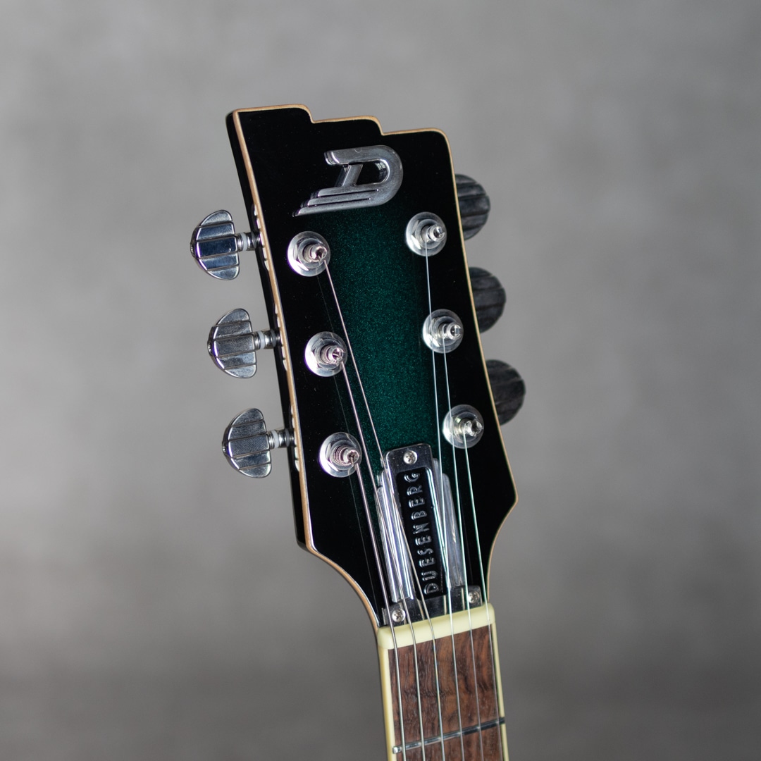 ドイツのギターデザイナー 、ディエター・ゴルスドルフにより1986年に立ち上げられたメーカー、"デューセンバーグ"。機能性とアールデコ調の装飾美とを兼ね備えたデザインは、クラシカルながらも先進性に富み、他のブランドとは一線を画す存在感を示すブランドです。搭載される各種パーツ、ハードウェア類の多くは汎用的なパーツを利用するのではなく、独自設計による自社製を採用。製造業大国ドイツらしい堅牢さを感じられる品質もまた大きな魅力です。本器はボストンを中心に活躍するケルティック・パンク・バンド、"ドロップキック・マーフィーズ"のギタリスト、"ジェフ・ダローサ"とのコラボレーションモデル。1pcマホガニーネック、チェンバードマホガニーボディ、"Phonico"ピックアップカバー、ラップアラウンドスタイルブリッジ。デューセンバーグの新モデル"The Senior"のスペックをベースに、アームレスト、ヘッドデザインにも準拠した"Wing"ポジションインレイ、レーザー彫刻のコントロールノブ等を追加。奥行きのある"カタリナグリーンバースト" カラーの仕上げは、上品な細かさのラメフレークやニッケルメッキのハードウェアとも相まってシンプルながら重厚で落ち着いた雰囲気。チェンバード構造のボディにより軽い取り回しですが、分厚く倍音感にあふれた深みのあるトーンに、ラップアラウンドブリッジとの相乗による抜群のサスティーンといった優れた音響効果を実現。搭載の"SPLIT/KING"ピックアップはシングルコイルピックアップとハムバッキングとを兼ね備えた構造。通常のハムバッカーのコイルスプリットとは異なり、シングルコイルに特殊設計の2番目のコイルを使いハムバッカーサウンドに拡張をする設計思想。異なる接続方法で中間的なサウンドを3つ目のオプションとしています。"スピードポット"は70°、つまり通常の10メモリのボリュームであれば10~8程度の可動域に絞られており、ほぼミュートスイッチのような動作。エレガントなルックスにパンクロックマシンとしての精神が感じられる振り切った仕様です。こちら中古品であるものの、ほとんど使用感は感じられず、ニッケルハードウェアの僅かな曇りや塗装の細かな拭き傷程度の他に目立ったダメージはございません。ロッドの調整含め良好なネックコンディション。オリジナルハードケースが付属。