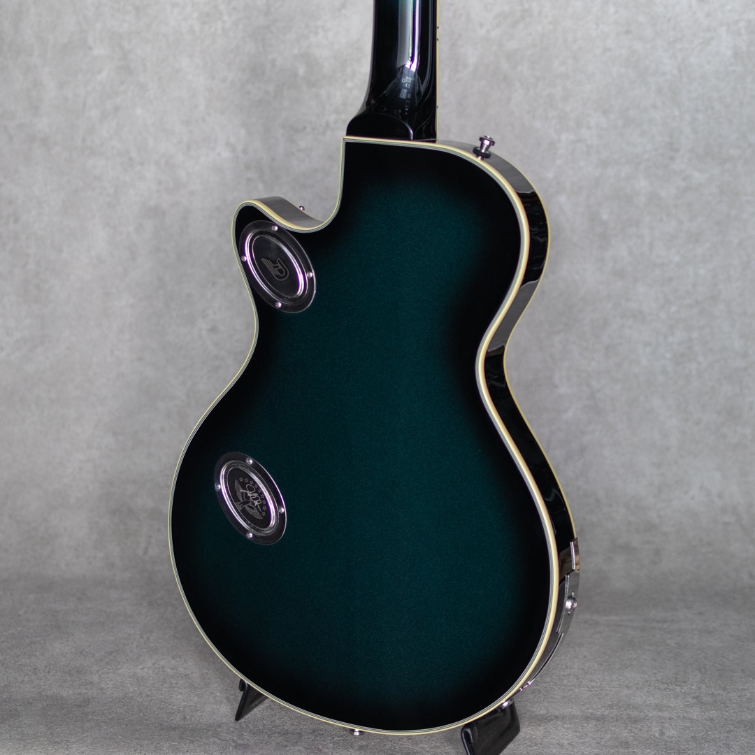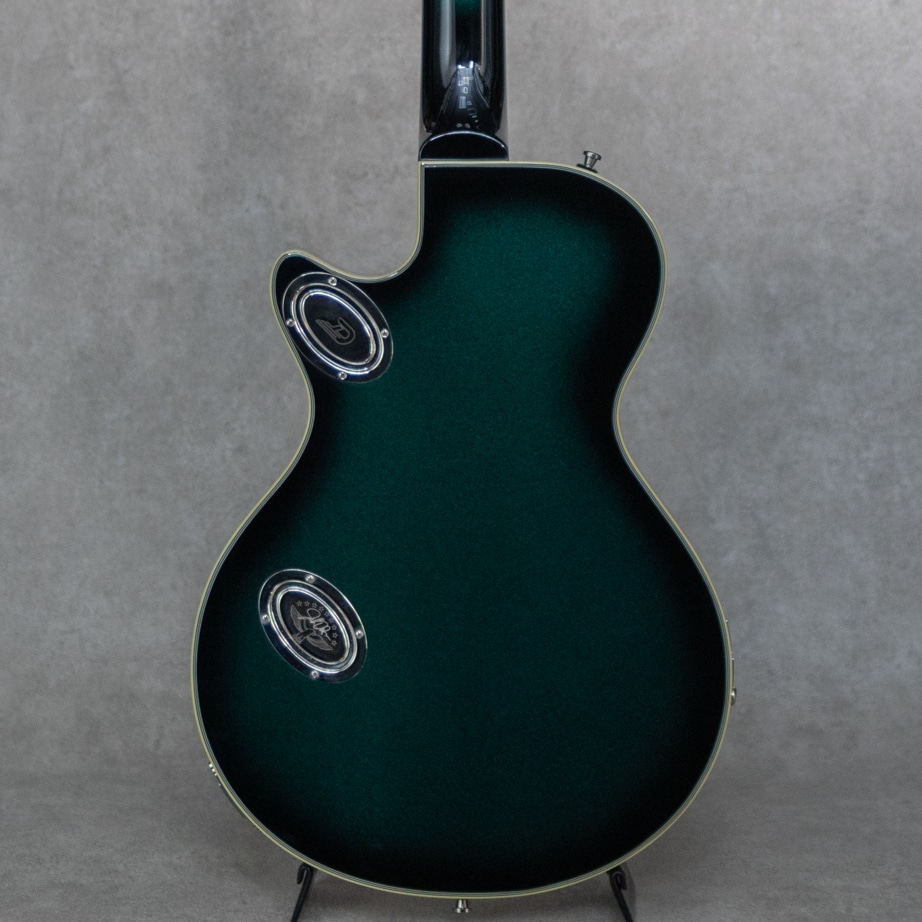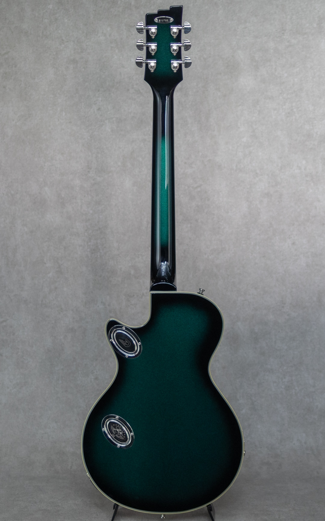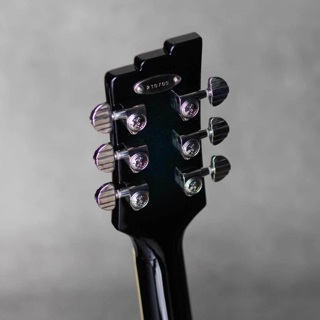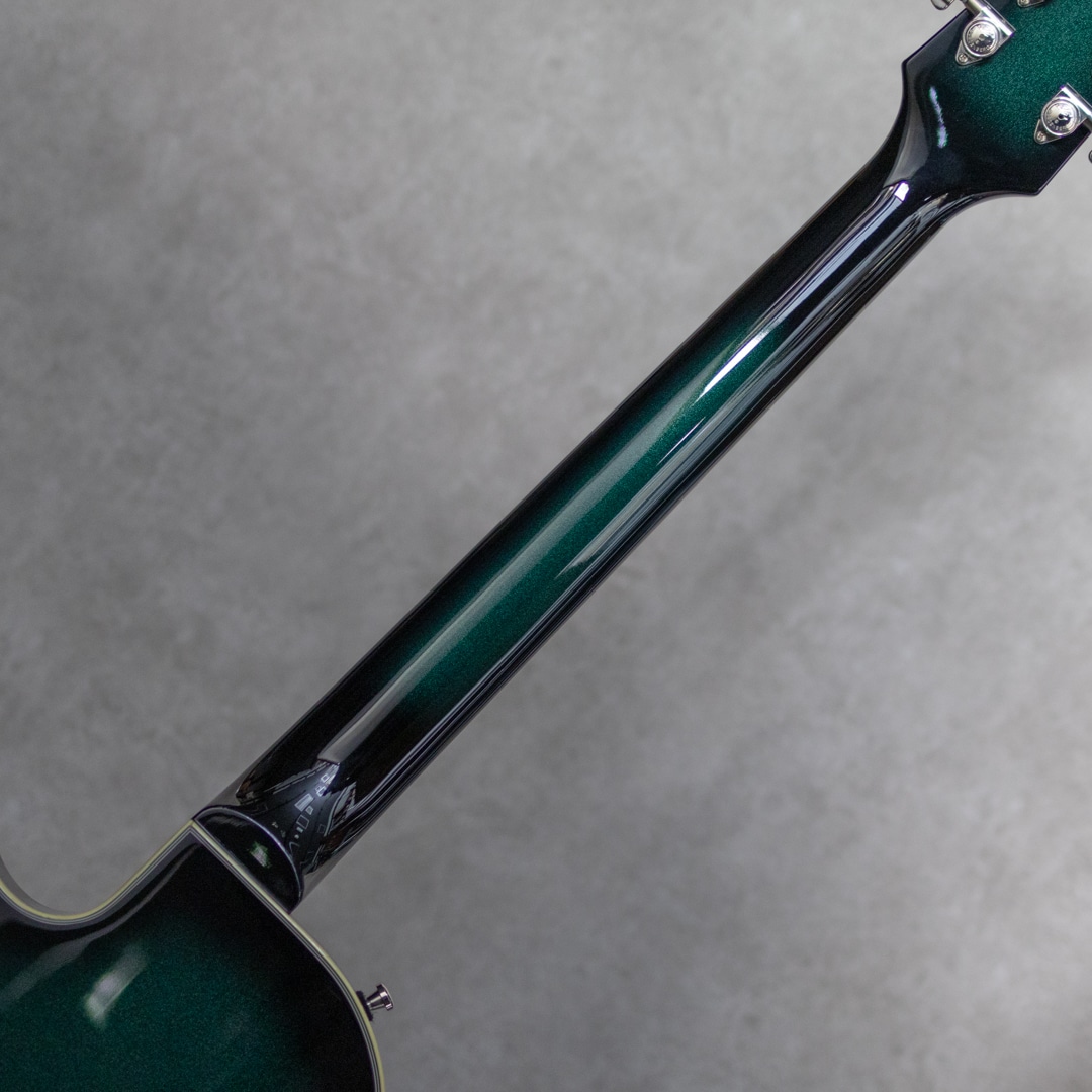 ドイツのギターデザイナー 、ディエター・ゴルスドルフにより1986年に立ち上げられたメーカー、"デューセンバーグ"。機能性とアールデコ調の装飾美とを兼ね備えたデザインは、クラシカルながらも先進性に富み、他のブランドとは一線を画す存在感を示すブランドです。搭載される各種パーツ、ハードウェア類の多くは汎用的なパーツを利用するのではなく、独自設計による自社製を採用。製造業大国ドイツらしい堅牢さを感じられる品質もまた大きな魅力です。本器はボストンを中心に活躍するケルティック・パンク・バンド、"ドロップキック・マーフィーズ"のギタリスト、"ジェフ・ダローサ"とのコラボレーションモデル。1pcマホガニーネック、チェンバードマホガニーボディ、"Phonico"ピックアップカバー、ラップアラウンドスタイルブリッジ。デューセンバーグの新モデル"The Senior"のスペックをベースに、アームレスト、ヘッドデザインにも準拠した"Wing"ポジションインレイ、レーザー彫刻のコントロールノブ等を追加。奥行きのある"カタリナグリーンバースト" カラーの仕上げは、上品な細かさのラメフレークやニッケルメッキのハードウェアとも相まってシンプルながら重厚で落ち着いた雰囲気。チェンバード構造のボディにより軽い取り回しですが、分厚く倍音感にあふれた深みのあるトーンに、ラップアラウンドブリッジとの相乗による抜群のサスティーンといった優れた音響効果を実現。搭載の"SPLIT/KING"ピックアップはシングルコイルピックアップとハムバッキングとを兼ね備えた構造。通常のハムバッカーのコイルスプリットとは異なり、シングルコイルに特殊設計の2番目のコイルを使いハムバッカーサウンドに拡張をする設計思想。異なる接続方法で中間的なサウンドを3つ目のオプションとしています。"スピードポット"は70°、つまり通常の10メモリのボリュームであれば10~8程度の可動域に絞られており、ほぼミュートスイッチのような動作。エレガントなルックスにパンクロックマシンとしての精神が感じられる振り切った仕様です。こちら中古品であるものの、ほとんど使用感は感じられず、ニッケルハードウェアの僅かな曇りや塗装の細かな拭き傷程度の他に目立ったダメージはございません。ロッドの調整含め良好なネックコンディション。オリジナルハードケースが付属。