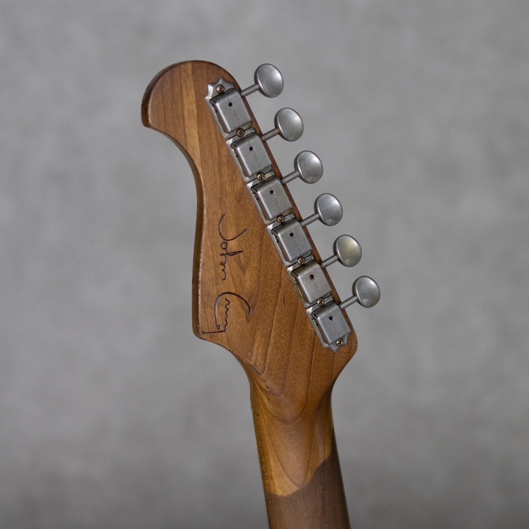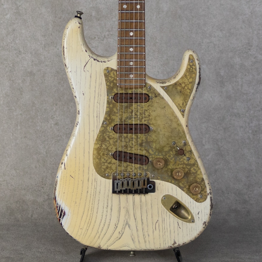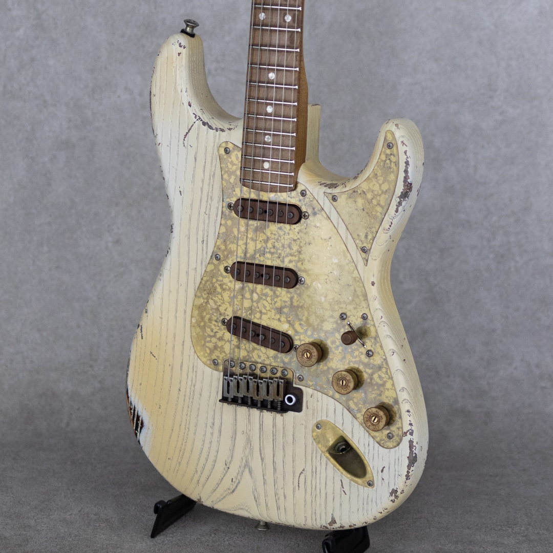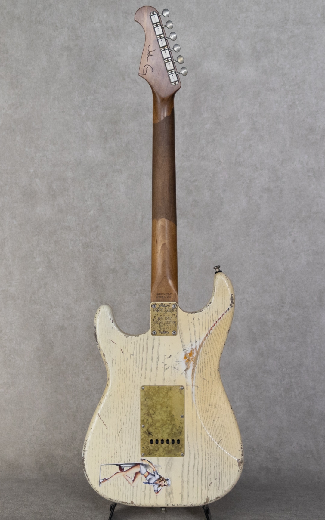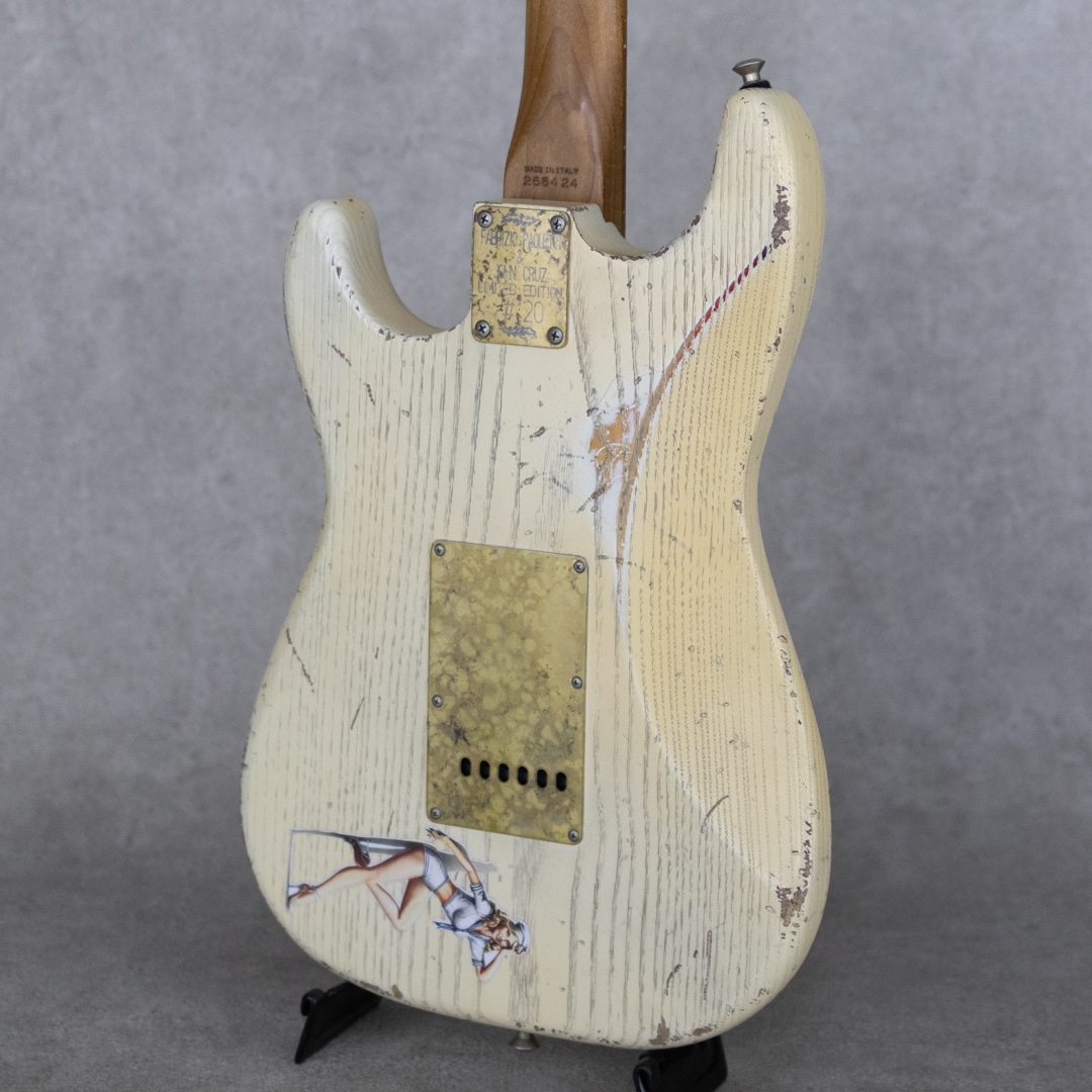 イタリア・トスカーナ州にて製造される”Paoletti Guitars”。世界的に有名なワイン醸造の名門トスカーナ州・キャンティ地方の一族である"Fabrizio Paoletti(ファブリツィオ・パオレッティ)”。彼の曾々祖父は19世紀終わり頃からワイン作りを行なっていました。ファブリツィオは廃園したワイン農家より回収したワイン樽を使用してギター製造を始めました。それらワイント共に熟成されたオールド・チェスナットを使用して作られるギターは、とても豊かな倍音と美しい音色を響かせてくれます。そんな”Paoletti Guitars”が元フェンダーマスタービルダーでありレリックマスターの呼び声が高く数多くのミュージシャンやギタリストに愛される”John Cruz(ジョン・クルーズ)”と共同製作にて新たなモデルを発表しました。それが本器、”Afla Loft SSS -Paoletti-Cruz Master Piece Limited Edition”です。20本限定生産にて作られた逸品。ボディ材にお得意のオールド・チェスナットを使用し、ネックには板目で取られたカナディアン・ローステッドメイプルを採用。貼りメイプル構造になっているツバ出し22フレット仕様、Dunlop 6110ジャンボフレット。少し太めのミディアム”C"シェイプネックグリップで、握り心地がありながらファットなレスポンスをもたらしてくれます。ピックガードやブリッジ、ノブなどはブラス製で作られたオリジナリティ溢れるアードウェアを装備。クルーソンデラックスペグ、”Paoletti OEM”トレモロブリッジ、ダンロップロックストラップピン。ピックアップはアルニコ5マグネットを使用した”Paoletti Walnut 60s”x3を搭載。コントロールレイアウトはスタンダードナ5wayセレクターと、マスターVol、フロントTone、ミドルToneになっています。とても雰囲気と遊び心のあるルックスで、ジョンクルーズのセンスが輝く本器。サンバーストカラーにオーバーレイで吹かれた褪色したヘビーホワイトカラーが渋い雰囲気で、オーバーレイとは思えない塗膜の薄さを実現。そして、ボディバックには各モデルごとに異なるセクシーガールのステッカーが貼られる遊び心。またブラス製パーツはジョンクルーズお得意のエイジング加工でクールな雰囲気を助長しています。ハードウェアはもちろんのことながら、ピックアップもジョンクルーズによりエイジングがされており、そのサウンドは驚くほどに倍音溢れるサウンド。クリアでサスティンに飛んだミドルを有しながら、伴う倍音でソリッドさや金属感を感じさせないトーン。ファットでガッツのあるサウンドから、メロウでソフトなタッチまで、ストラトモデルで求められる要素を高いレベルで兼ね備える実力派モデルに仕上がっています。トーンコンデンサーにはヴァンザントオリジナルレプリカコンデンサーを使用。フロント・センター時のクリアで乾いた響きは、より奥行きのあるベルトーンを思わせるレンジの広い響きで、リア時のパンチのあるミッドの効いたサウンドはドライブサウンドにも持ってこいです。より繊細で表現力のあるフロントやハーフトーンでファットでメロウなトーンから、エッジの効いたアグレッシブなパワー感の得られるリアサウンドまで幅広いサウンドメイクを可能にしてくれる1本です。国内入荷も極僅かな”Paoletti Guitars”のリミテッドモデル。お手元のコレクションに、是非お見逃しなく。。カスタムプレミアムハードケース、オリジナルアーム、ロップストラップアタッチメント、レザーストラップ、Tシャツ、ブックレット、サイン入証書など、付属品も充実しています。