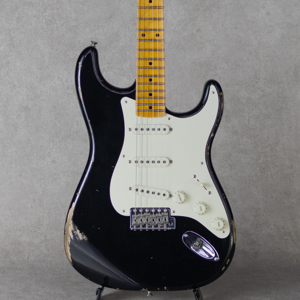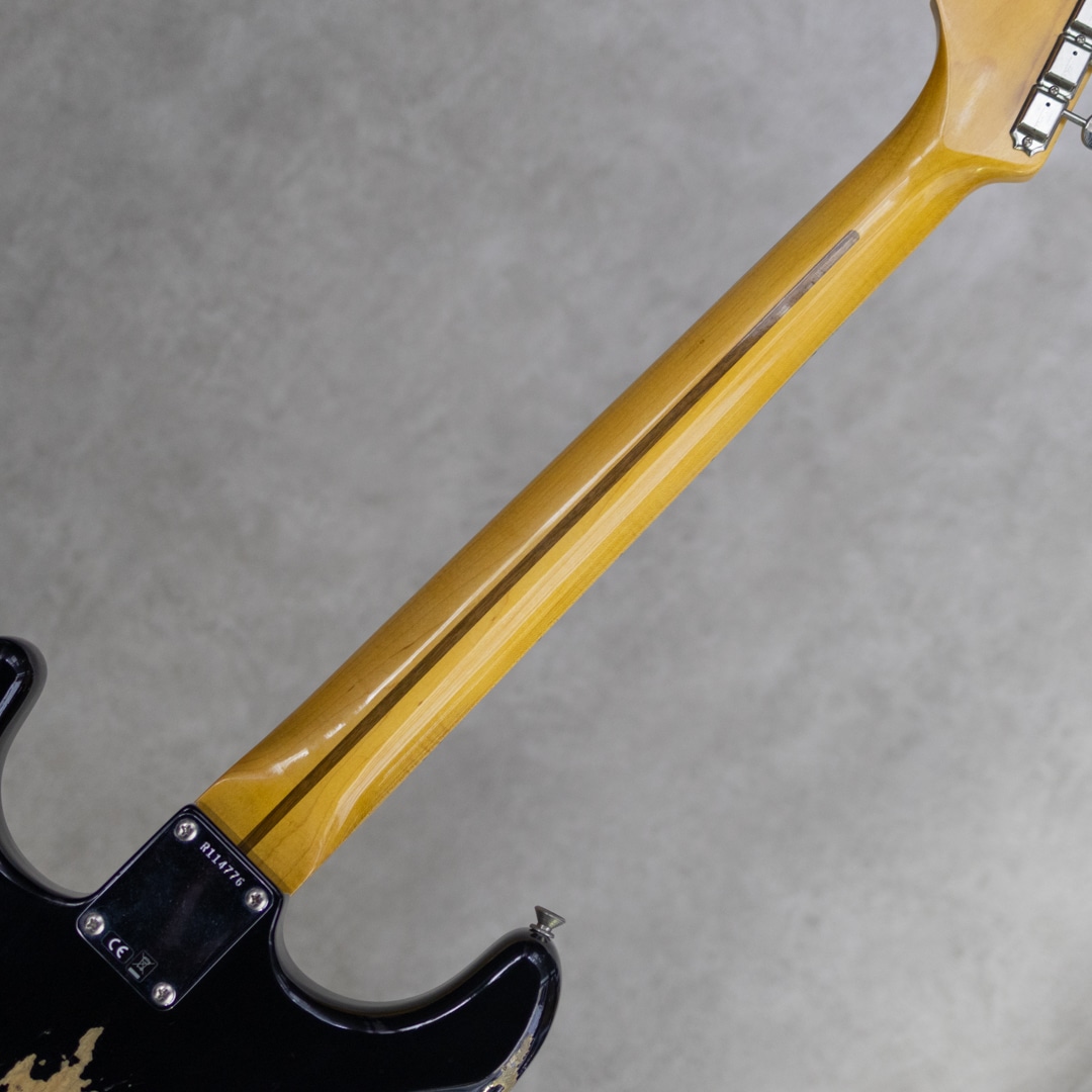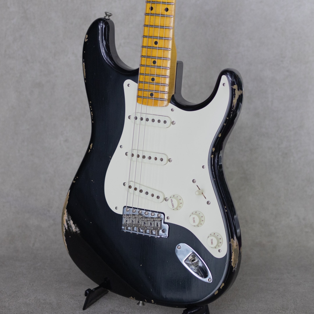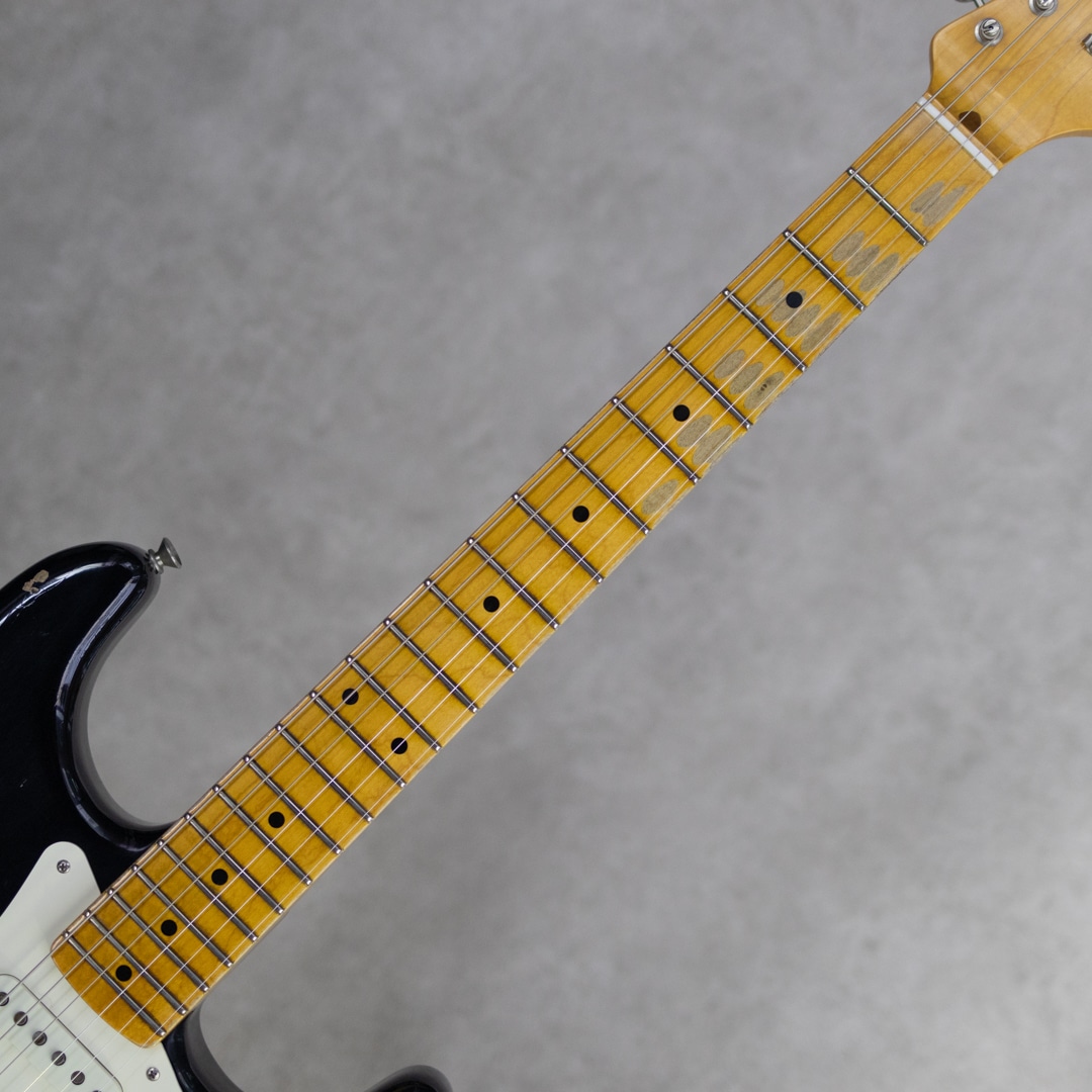 多くのファンが強い憧れを抱く”1957 Stratocaster Black”。本器は上品で雰囲気あるエイジド加減とCCハードウェアを持つ日本企画モデルの”1957 Stratocaster Relic CC Hardware Black"。 2021年製極上USED品。アルダー2pcsボディ、ワンピースメイプルネックのウッドスペック。良い顔つきをしたブラックカラーのレリックモデルで、ウェザーチェックもびっしりと入った貫禄の外観。それに合わせるクローゼット・クラシックのハードウェアが上品佐を上長しています。ネックグリップは57 Style Soft Vシェイプで、握り心地がありながら手に馴染むネックシェイプ。エイジドホワイトカラーの1plyピックガード、カスタムショップ製50sピックアップx3、0.1uFフィルムコンデンサー搭載。グラッシーで透明感のある50sサウンド。倍音感がありながらもたつきのないブライトでレンジのある響き。トーン回路がフロント、ミドル・リアの配線にされており、フィンガーニュアンスを活かしながらブルージーに決められる1本です。使用に伴う傷や使用感は伺いにくく、とても良好なコンディションで保たれた本器。ネックコンディションも良好でフレット減りも殆んど無く、弾きやすいアクションでしっかりとお使いいただけます。愛でてよし奏でてよしの極上のヴィンテージリイシュー・ストラト。実戦向きかつコレクタブルなストラトをお探しの方にオススメの1本です。オリジナルホワイトトーレックスハードケース、認定書、オリジナルトレモロアーム、ブリッジカバー、トレモロスプリング、ストラップなど新品時付属類もしっかり付属します。