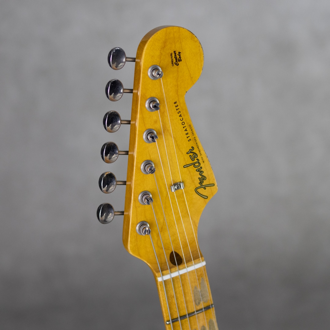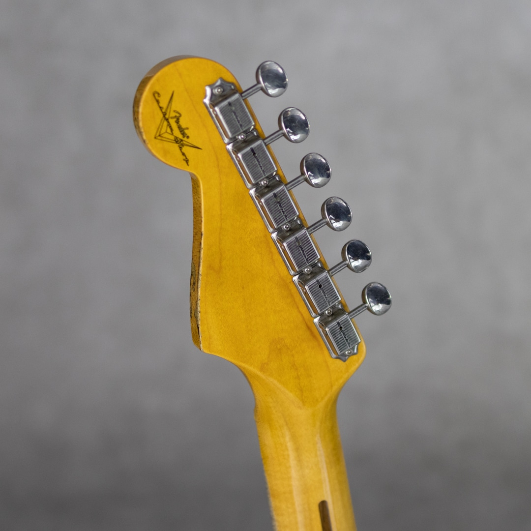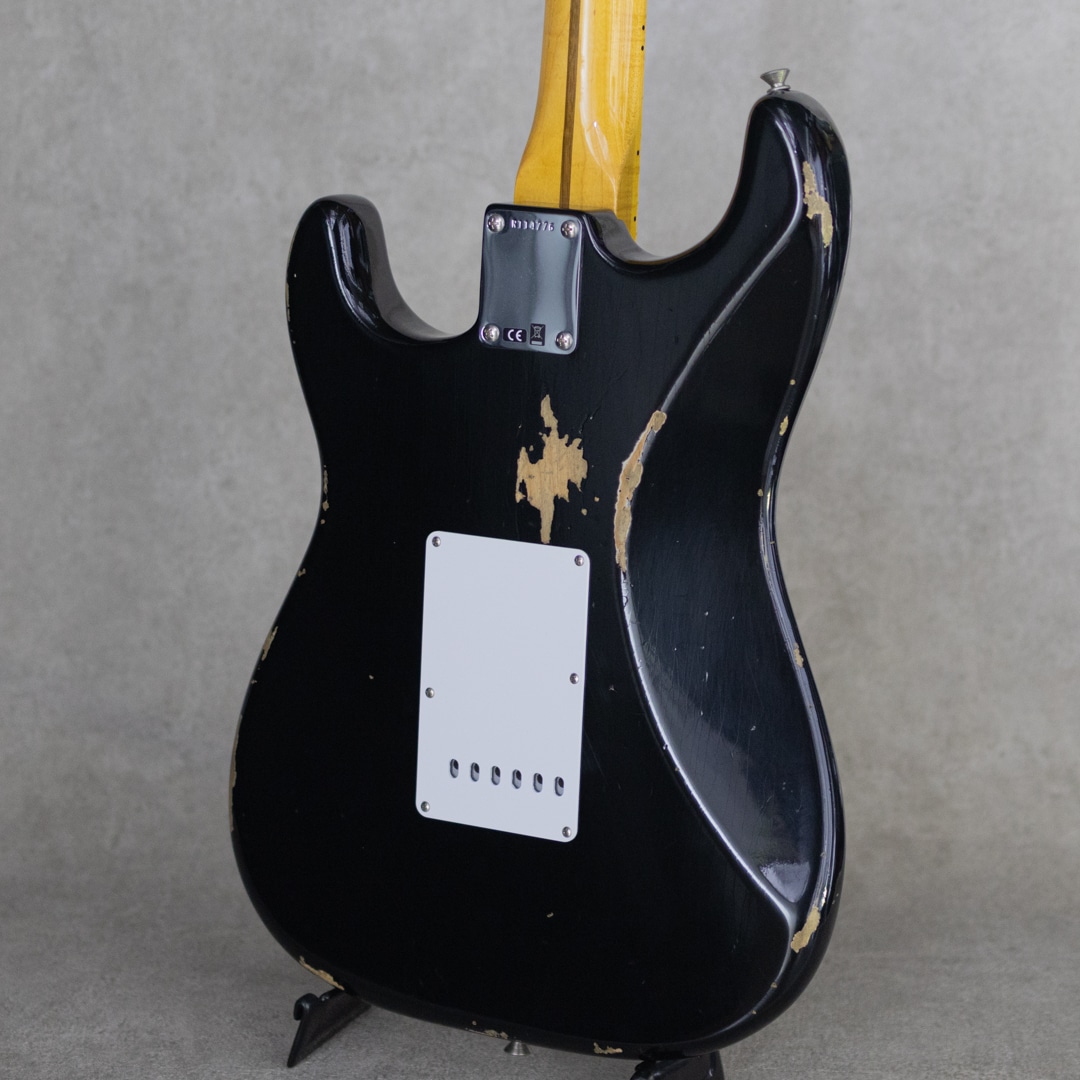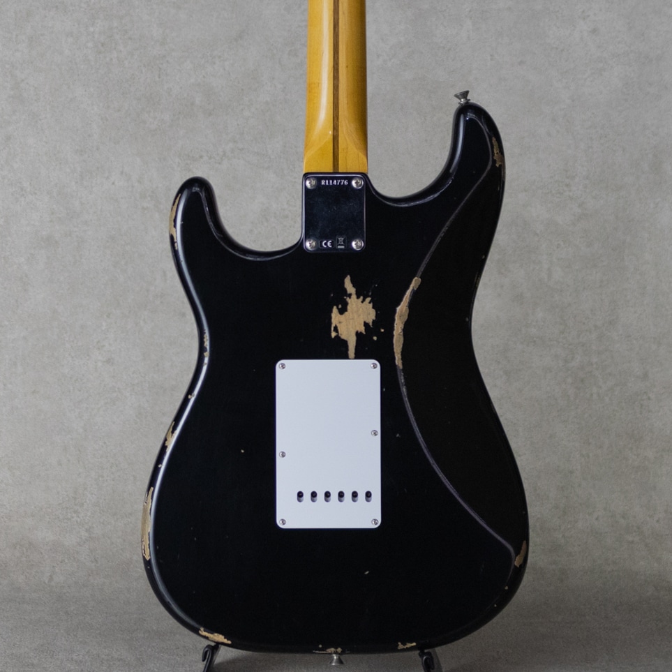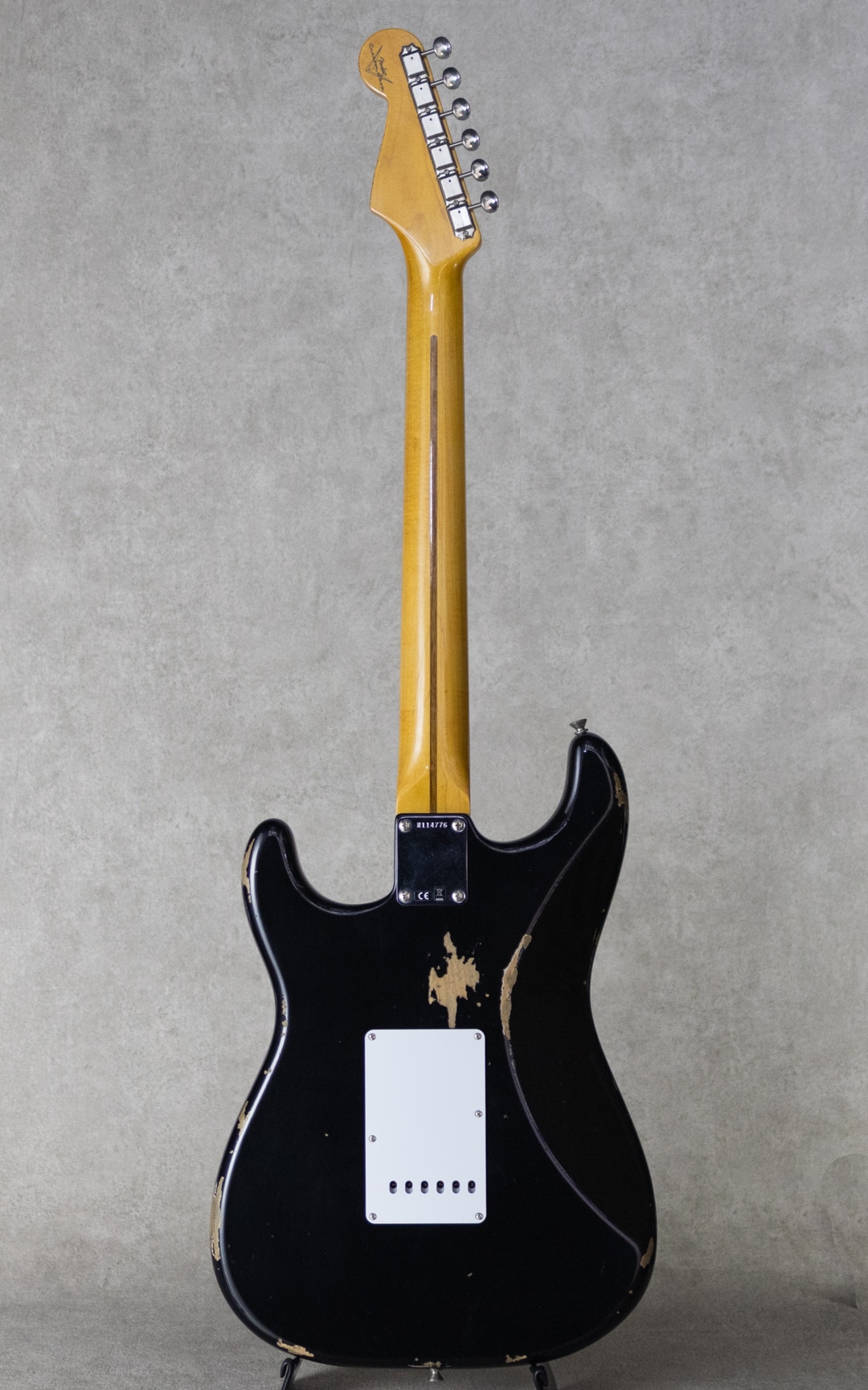 多くのファンが強い憧れを抱く”1957 Stratocaster Black”。本器は上品で雰囲気あるエイジド加減とCCハードウェアを持つ日本企画モデルの”1957 Stratocaster Relic CC Hardware Black"。 2021年製極上USED品。アルダー2pcsボディ、ワンピースメイプルネックのウッドスペック。良い顔つきをしたブラックカラーのレリックモデルで、ウェザーチェックもびっしりと入った貫禄の外観。それに合わせるクローゼット・クラシックのハードウェアが上品佐を上長しています。ネックグリップは57 Style Soft Vシェイプで、握り心地がありながら手に馴染むネックシェイプ。エイジドホワイトカラーの1plyピックガード、カスタムショップ製50sピックアップx3、0.1uFフィルムコンデンサー搭載。グラッシーで透明感のある50sサウンド。倍音感がありながらもたつきのないブライトでレンジのある響き。トーン回路がフロント、ミドル・リアの配線にされており、フィンガーニュアンスを活かしながらブルージーに決められる1本です。使用に伴う傷や使用感は伺いにくく、とても良好なコンディションで保たれた本器。ネックコンディションも良好でフレット減りも殆んど無く、弾きやすいアクションでしっかりとお使いいただけます。愛でてよし奏でてよしの極上のヴィンテージリイシュー・ストラト。実戦向きかつコレクタブルなストラトをお探しの方にオススメの1本です。オリジナルホワイトトーレックスハードケース、認定書、オリジナルトレモロアーム、ブリッジカバー、トレモロスプリング、ストラップなど新品時付属類もしっかり付属します。