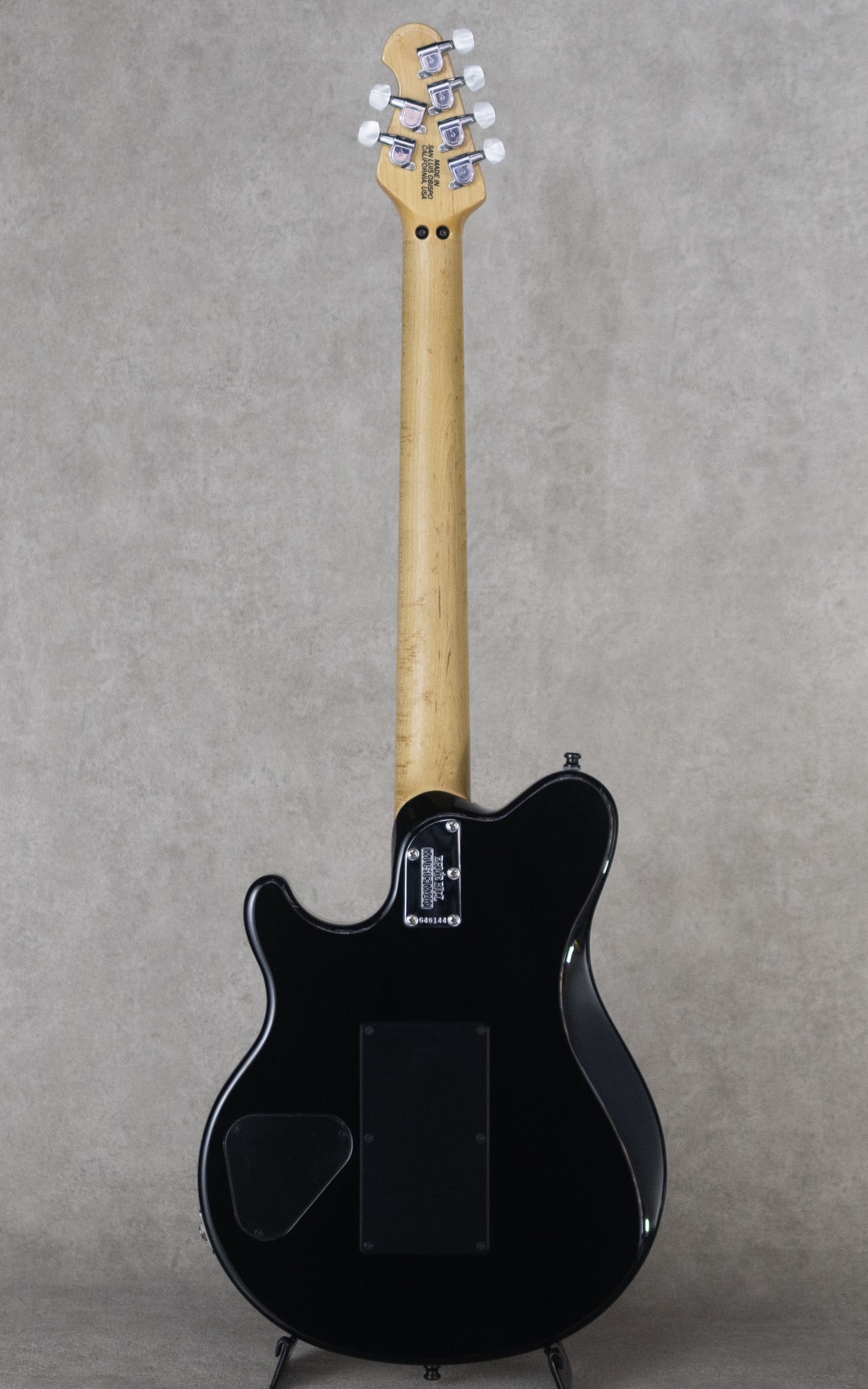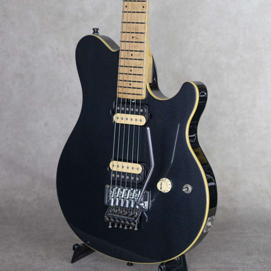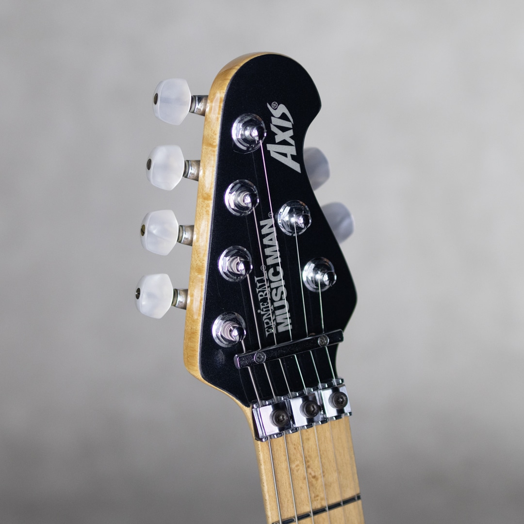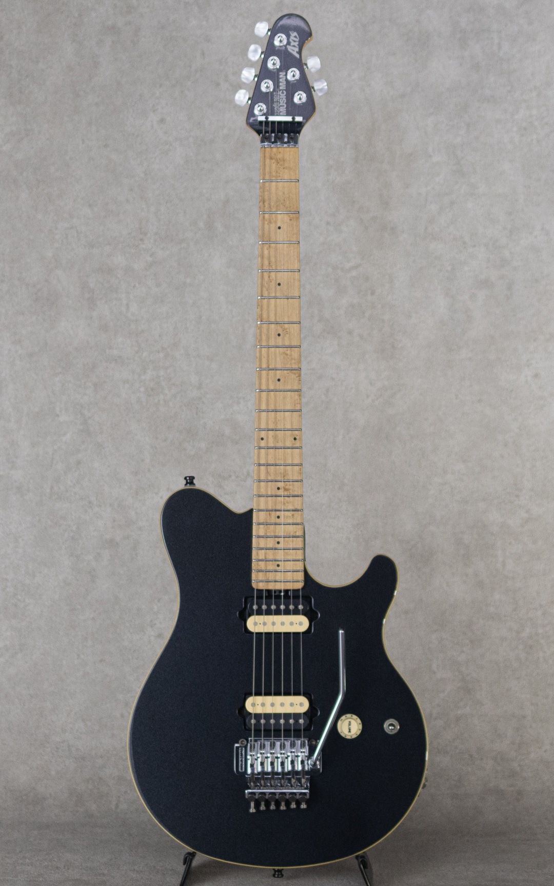 Musicmanを代表するソリッドモデル"Axis"。1991年登場のErnie Ball Music Man/Edward Van Halen Signatureにルーツをもつロングセラーモデルです。デビュー以降、その活躍の前半は改造ギターをアイコンとしたEdward Van Halenですが、90年代を前に突如Ernie Ball Music Manとのエンドース契約を開始。シグネイチャーモデル開発の噂は瞬く間に広がり、当時のファンを大きく賑わせました。その後Musicmanとエディの契約終了後は、小さなアップデートを加えモデル名を"Axis"と改めての展開が続けられることとなった本モデル。コンパクトなボディに非対称ネック、革新的な機能性を備えつつ、自然なトラッド感とモダンなカッコよさとをうまく両立したデザイン。単なるファンアイテムとしてだけではなく新時代のスタンダードたるポテンシャルを持つ実戦用ウェポンとして、あらゆるシーンで多くのプロギタリストの評価を得ることとなりました。本器は珍しい"Sapphire Black"カラーの2008年製Axis。バーズアイメイプルネック、メイプルトップ/バスウッドバックのウッドマテリアル。4:2に配置された小さなヘッドストックは、僅かにコンパクトなボディのアウトラインとも相まって、ロングスケール採用ながら小回りの良い取り回しを実現。見るからに上質なバーズアイメイプルのネックは、ネック裏・指板面にほぼ無塗装に近いオイルフィニッシュを採用している他、ネックシェイプの6弦側と1弦側を非対称にした独特のグリップで圧倒的に快適な演奏性を誇ります。また驚くことにネック・指板は1ピースの材から成っており、ネック材から指板部分をスライス、ロッドを仕込んだ後、再び接着するという方法がとられています。USA Axisでは"EVH"からのアップデートとして、ピッキング時に干渉しやすかったトグルスイッチの位置変更と、ボディバックコンターの追加が施されております。軽く柔らかな素材であるバスウッドにより得られる十二分な倍音の飽和感と、それを制して豊かなサスティーンを生み出すメイプルトップ。珍しいオペーク系カラーリングの本器ですが、光の加減でボディトップクリア層には波打つフレイムメイプルの杢が伺え、一般的なシースルーカラーモデル同様、素晴らしいフレイムメイプルトップを採用していることが判断できます。ピックアップには専用のディマジオ製カスタムハムバッカーをダイレクトマウント。フロイドローズライセンスド・ロック式ナット+ブリッジとの組み合わせによる明るくハーモニクスに溢れたリアトーンもさることながら、スムースなフロントトーンや分離感の綺麗なセンターポジションも万能性が高い実力を感じさせるポイントです。こちらボディトップブリッジ右横辺り、3・程の軽いひっかき傷がございますが、その他顕著に気になる打痕やキズは感じられず、年式を考えると比較的綺麗な印象。黒ずみが目立ちやすいネックに関してもほとんど汚れを感じず、フレットも綺麗なコンディションを維持しています。ロッド調整含めネックコンディションも良好。上品でクールな印象も感じさせる"Sapphire Black"、即戦力としてまだまだがっつり弾きこんでいただきたい1本、ぜひご確認ください。オリジナルハードケースが付属。