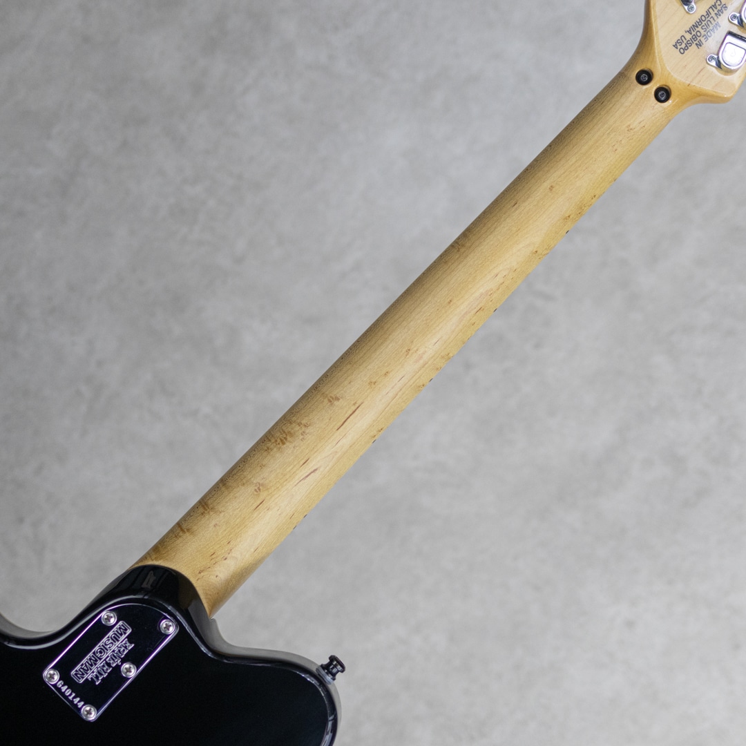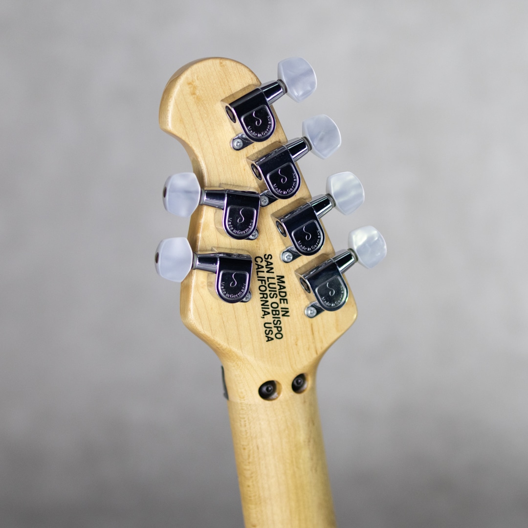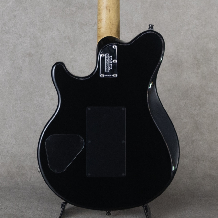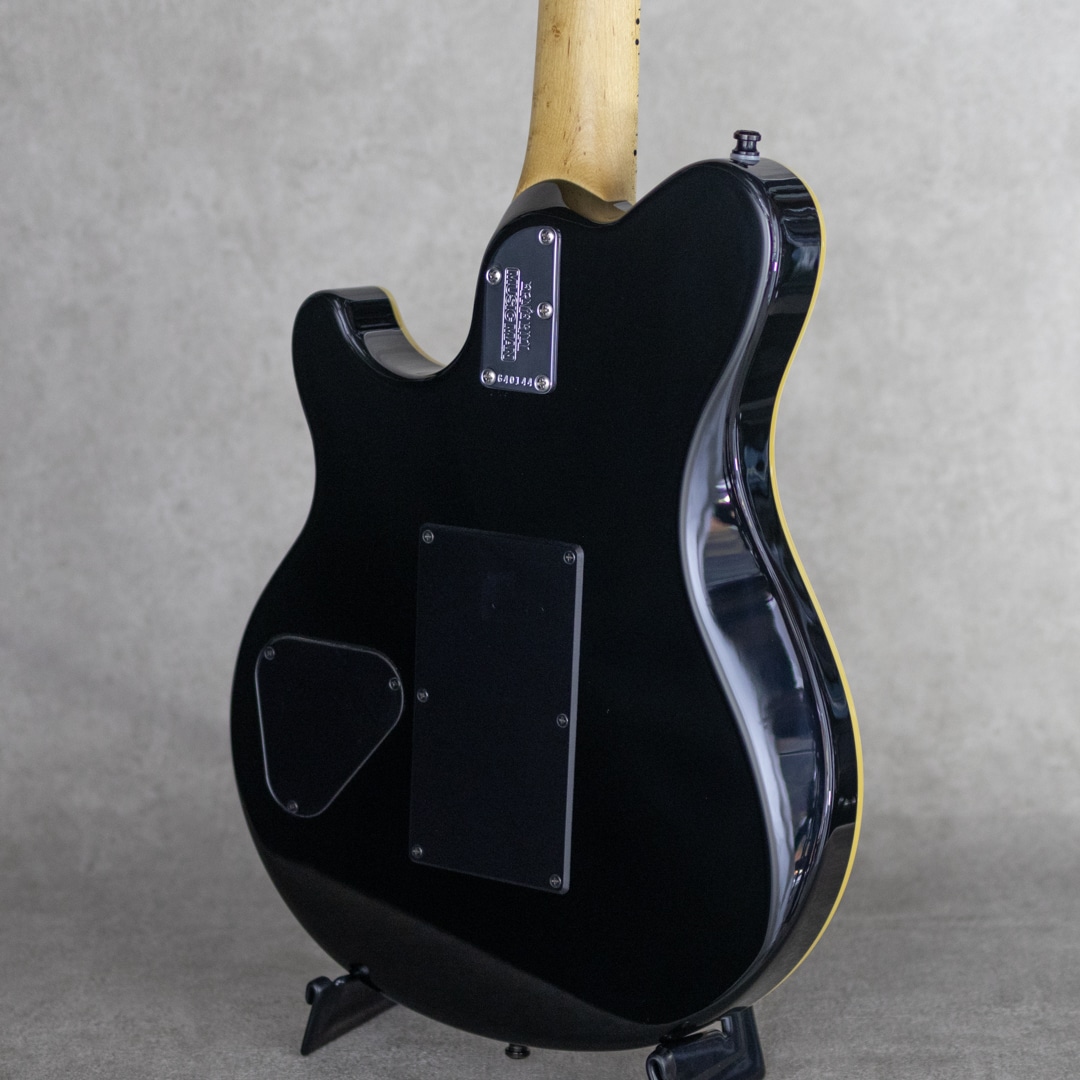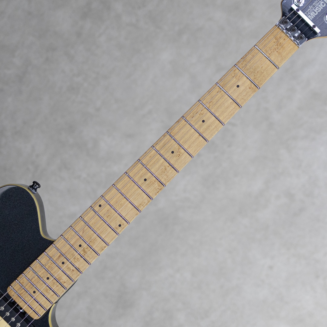 Musicmanを代表するソリッドモデル"Axis"。1991年登場のErnie Ball Music Man/Edward Van Halen Signatureにルーツをもつロングセラーモデルです。デビュー以降、その活躍の前半は改造ギターをアイコンとしたEdward Van Halenですが、90年代を前に突如Ernie Ball Music Manとのエンドース契約を開始。シグネイチャーモデル開発の噂は瞬く間に広がり、当時のファンを大きく賑わせました。その後Musicmanとエディの契約終了後は、小さなアップデートを加えモデル名を"Axis"と改めての展開が続けられることとなった本モデル。コンパクトなボディに非対称ネック、革新的な機能性を備えつつ、自然なトラッド感とモダンなカッコよさとをうまく両立したデザイン。単なるファンアイテムとしてだけではなく新時代のスタンダードたるポテンシャルを持つ実戦用ウェポンとして、あらゆるシーンで多くのプロギタリストの評価を得ることとなりました。本器は珍しい"Sapphire Black"カラーの2008年製Axis。バーズアイメイプルネック、メイプルトップ/バスウッドバックのウッドマテリアル。4:2に配置された小さなヘッドストックは、僅かにコンパクトなボディのアウトラインとも相まって、ロングスケール採用ながら小回りの良い取り回しを実現。見るからに上質なバーズアイメイプルのネックは、ネック裏・指板面にほぼ無塗装に近いオイルフィニッシュを採用している他、ネックシェイプの6弦側と1弦側を非対称にした独特のグリップで圧倒的に快適な演奏性を誇ります。また驚くことにネック・指板は1ピースの材から成っており、ネック材から指板部分をスライス、ロッドを仕込んだ後、再び接着するという方法がとられています。USA Axisでは"EVH"からのアップデートとして、ピッキング時に干渉しやすかったトグルスイッチの位置変更と、ボディバックコンターの追加が施されております。軽く柔らかな素材であるバスウッドにより得られる十二分な倍音の飽和感と、それを制して豊かなサスティーンを生み出すメイプルトップ。珍しいオペーク系カラーリングの本器ですが、光の加減でボディトップクリア層には波打つフレイムメイプルの杢が伺え、一般的なシースルーカラーモデル同様、素晴らしいフレイムメイプルトップを採用していることが判断できます。ピックアップには専用のディマジオ製カスタムハムバッカーをダイレクトマウント。フロイドローズライセンスド・ロック式ナット+ブリッジとの組み合わせによる明るくハーモニクスに溢れたリアトーンもさることながら、スムースなフロントトーンや分離感の綺麗なセンターポジションも万能性が高い実力を感じさせるポイントです。こちらボディトップブリッジ右横辺り、3・程の軽いひっかき傷がございますが、その他顕著に気になる打痕やキズは感じられず、年式を考えると比較的綺麗な印象。黒ずみが目立ちやすいネックに関してもほとんど汚れを感じず、フレットも綺麗なコンディションを維持しています。ロッド調整含めネックコンディションも良好。上品でクールな印象も感じさせる"Sapphire Black"、即戦力としてまだまだがっつり弾きこんでいただきたい1本、ぜひご確認ください。オリジナルハードケースが付属。