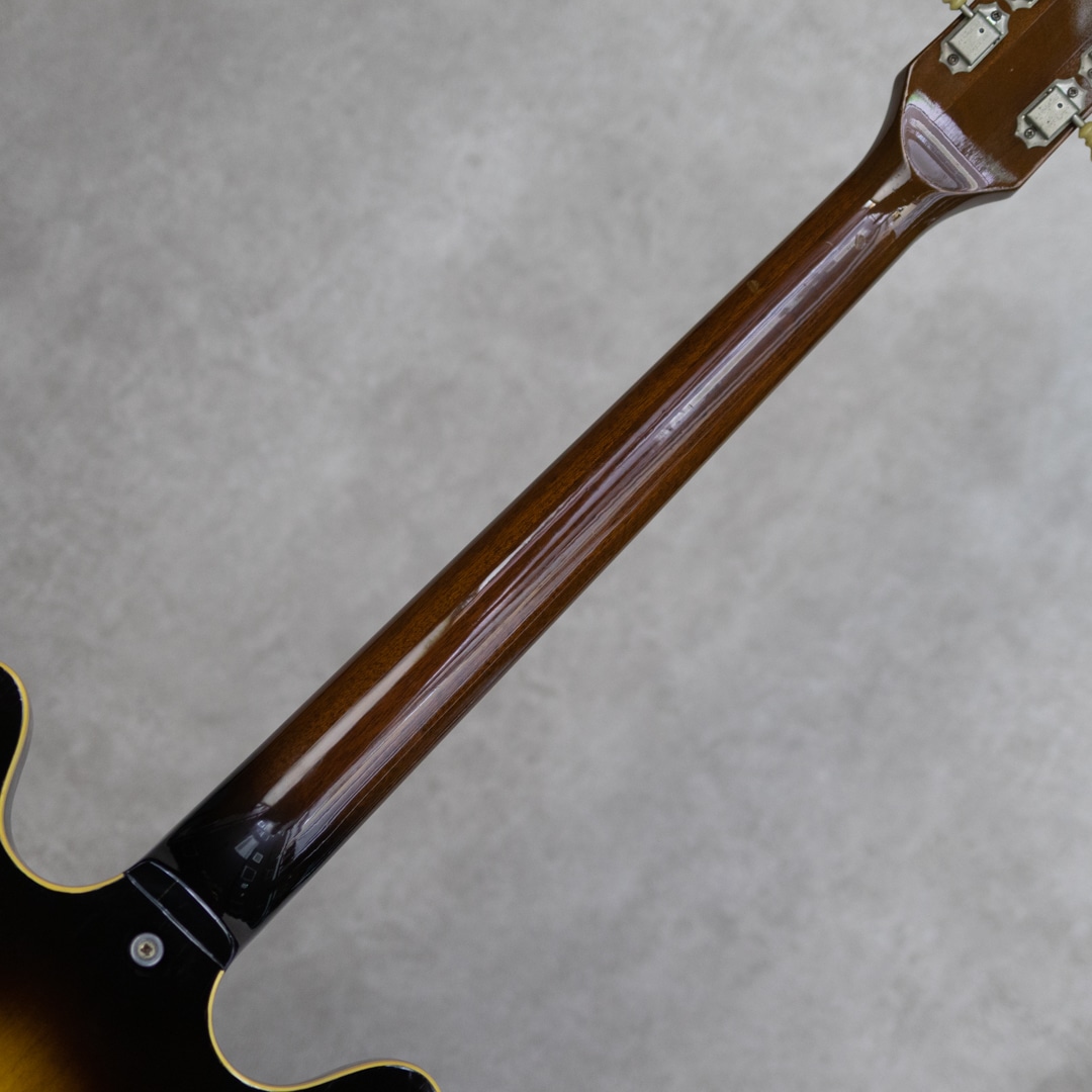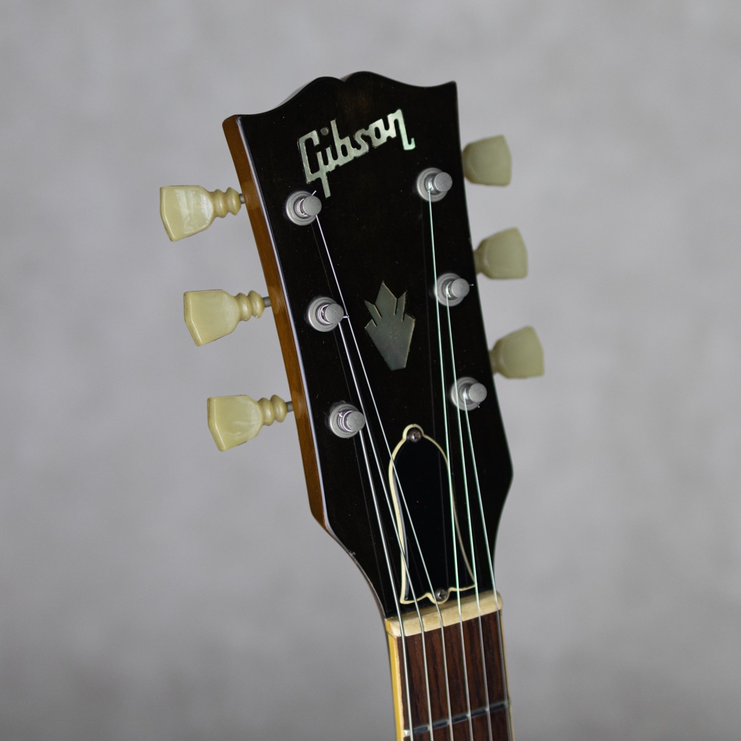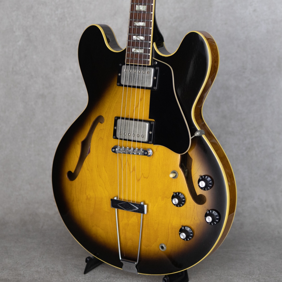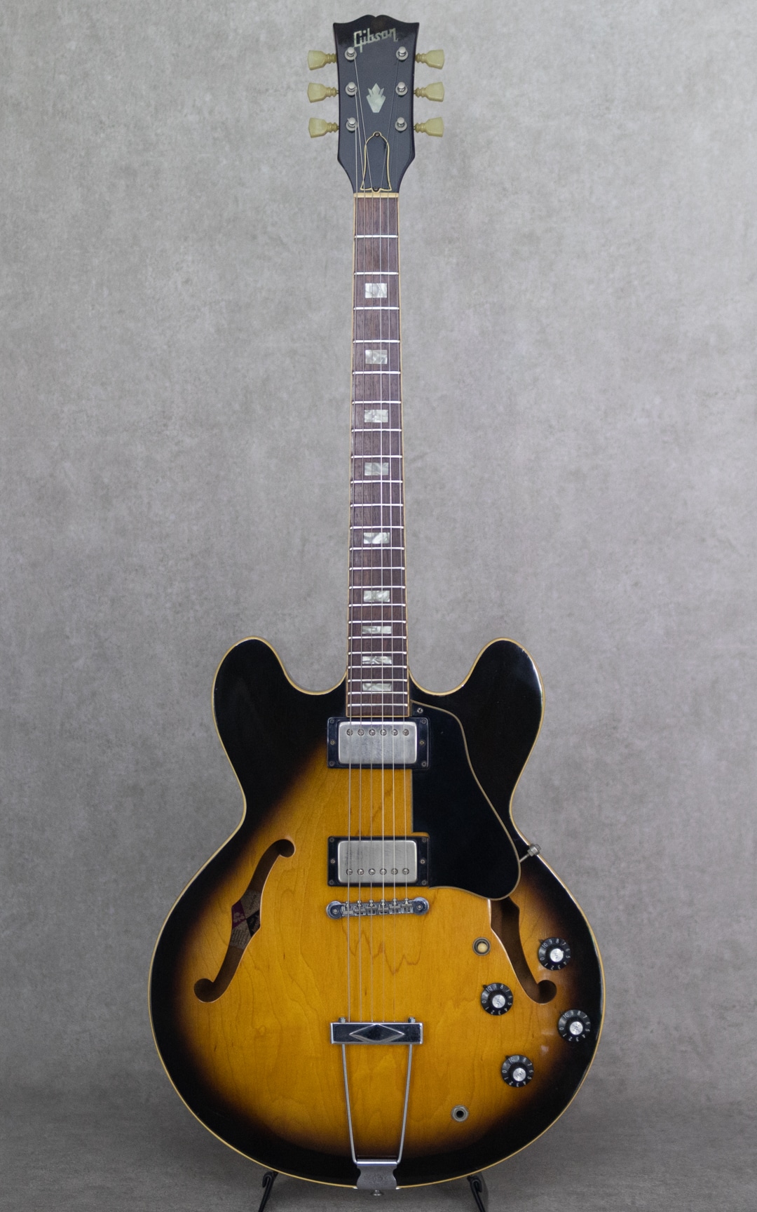 Les Paulに続き憧れのギブソンエレクトリックとして君臨する王道モデルES-335。"セミアコ"の代名詞としての存在感は言わずもがな、バーサタイルな実用性を伴った完成度から、古今あらゆる場面、あらゆるプレイヤーたちによって愛用され、数々の名演を彩ってきたことも絶えない人気の所以です。1958年頃の生産開始より、いくつもの仕様変更を伴いながら販売が続けられるES-335。加えて1975年の初頭にギブソンは元のカラマズー工場から現在のナッシュビル工場への移転をスタート。移転開始時期からは各種モデルでマテリアル/構造のより大きな変更がなされていき、ES-335においてもその例外ではありません。本器はカラマズー工場での製造最終期マホガニー3ピースネックの1974~75年製”ES-335TD” Sunburst。その他、14度の浅いヘッド角、ナローネック、スモールブロックポジション、空間が大きく開放されたセンターブロック、トラピーズ(ブランコ)テールピース、といったスペック。徐々にピックアップキャビティ部の空間が大きくなっていくES-335において、この年代が最も空間が大きく、センターブロックを貫通する形で開放されている様子が両f-ホールから確認できます。したがって最もホロウ感が強く特有の甘い響きが魅力の一つ。14度ヘッド角に加え、トラピーズテールピース仕様によって弦両端の侵入角が浅く、少しルーズなテンション感とそれ故の軽快な音の立ち上がりも大きな特徴です。ピッキングに対してライトな挙動の弦振動ながら、この年代特有の頂点が平らなオリジナルブリッジサドルは独特の野太さとメロウなキャラクターを持っており、素直な出力を持った刻印ナンバードとの相性も抜群。素早さと音像の太さが特有の共存をした不思議な魅力がこの年代だけで得られる魅力です。こちらピックアップ、各ポット等はオリジナルをキープ、ピックアップカバーはニッケルメッキのヴィンテージレプリカパーツに変更がされている他、コンデンサもヴィンテージフィルムコンデンサに換装されています。経年相応に細かな打痕や小傷などあるものの、塗装面の艶をしっかり残しており、比較的綺麗な印象。この年代特有の幅広のフレットは元よりあまり高くはないスペックですが、目立ったへこみ等なく気持ちよくお楽しみいただける良好なコンディション。ロッドの調整を含めネックコンディションも良好。オリジナルハードケースが付属。