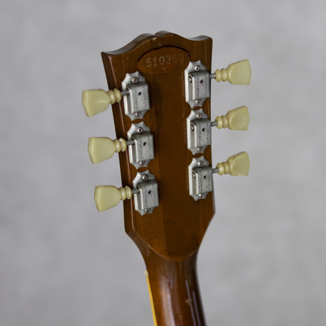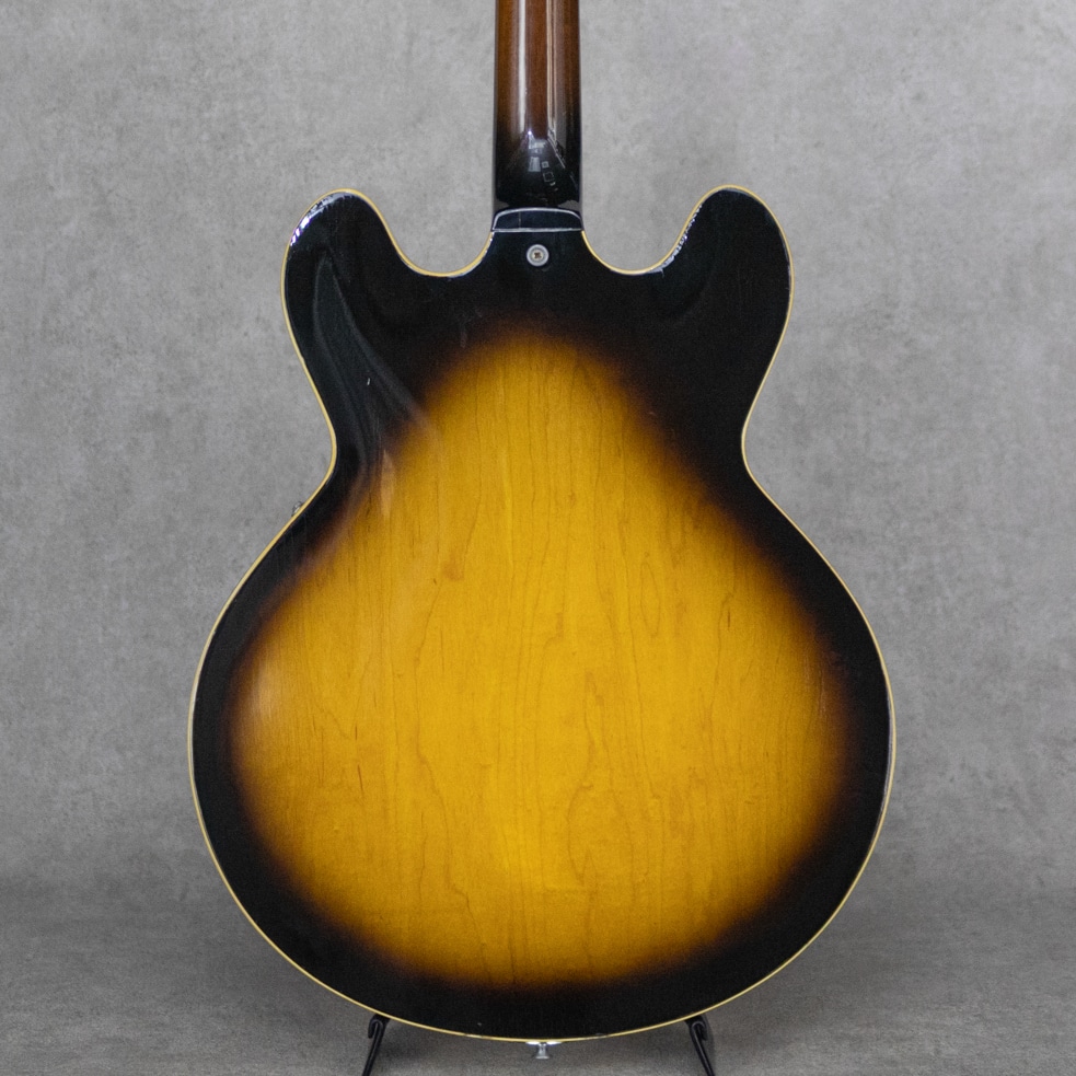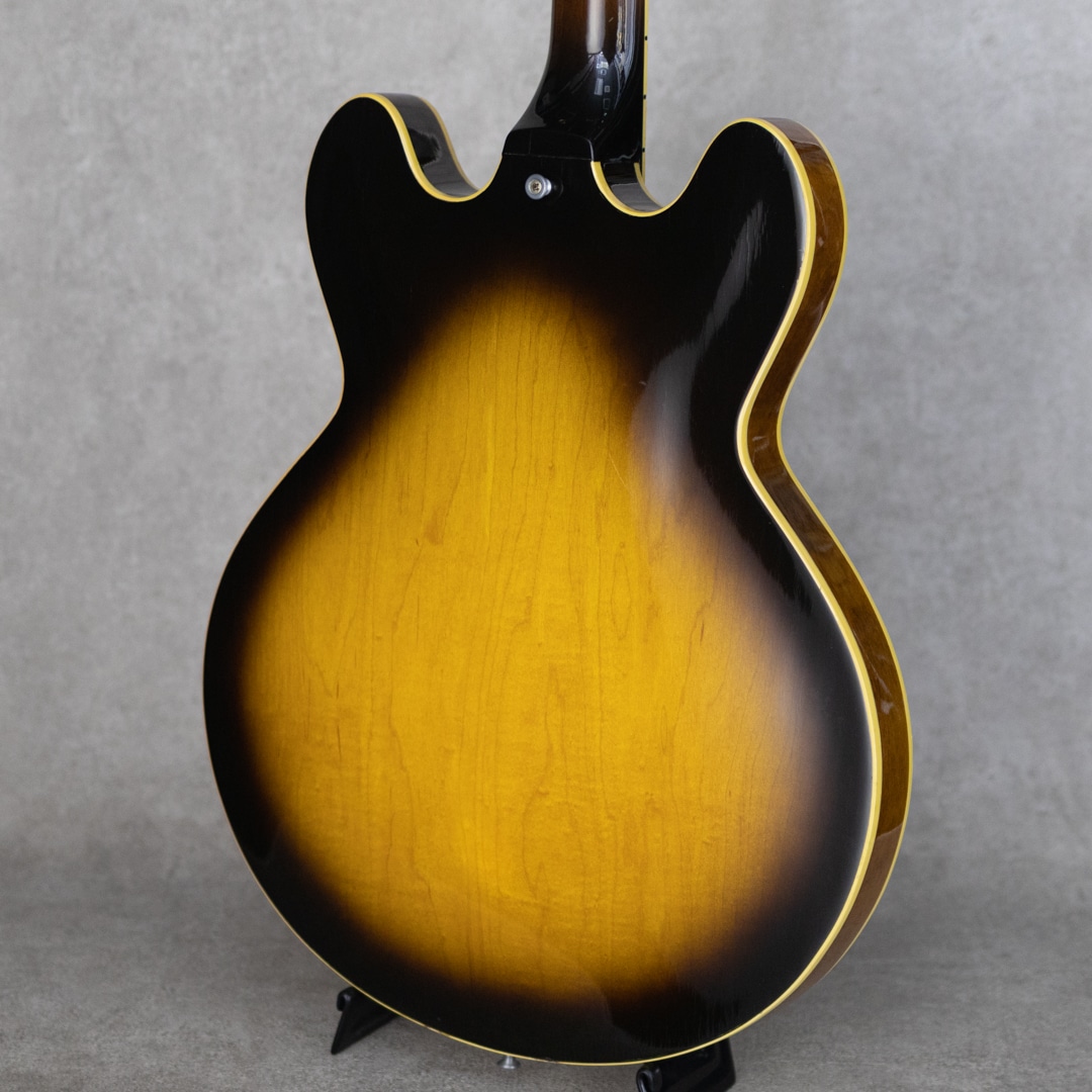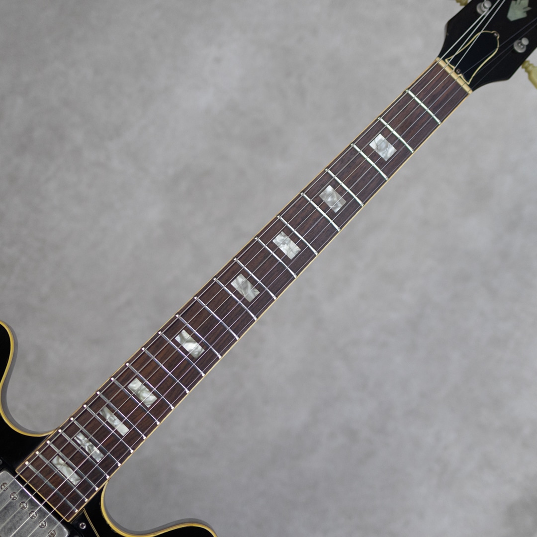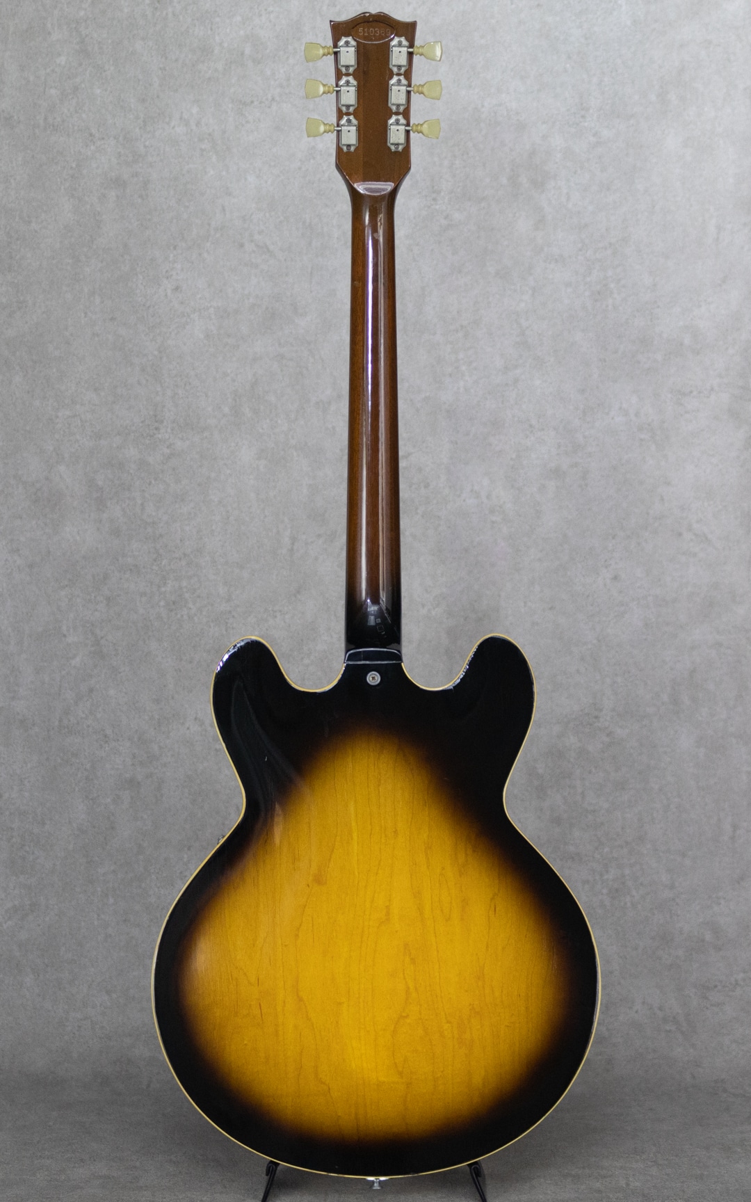 Les Paulに続き憧れのギブソンエレクトリックとして君臨する王道モデルES-335。"セミアコ"の代名詞としての存在感は言わずもがな、バーサタイルな実用性を伴った完成度から、古今あらゆる場面、あらゆるプレイヤーたちによって愛用され、数々の名演を彩ってきたことも絶えない人気の所以です。1958年頃の生産開始より、いくつもの仕様変更を伴いながら販売が続けられるES-335。加えて1975年の初頭にギブソンは元のカラマズー工場から現在のナッシュビル工場への移転をスタート。移転開始時期からは各種モデルでマテリアル/構造のより大きな変更がなされていき、ES-335においてもその例外ではありません。本器はカラマズー工場での製造最終期マホガニー3ピースネックの1974~75年製”ES-335TD” Sunburst。その他、14度の浅いヘッド角、ナローネック、スモールブロックポジション、空間が大きく開放されたセンターブロック、トラピーズ(ブランコ)テールピース、といったスペック。徐々にピックアップキャビティ部の空間が大きくなっていくES-335において、この年代が最も空間が大きく、センターブロックを貫通する形で開放されている様子が両f-ホールから確認できます。したがって最もホロウ感が強く特有の甘い響きが魅力の一つ。14度ヘッド角に加え、トラピーズテールピース仕様によって弦両端の侵入角が浅く、少しルーズなテンション感とそれ故の軽快な音の立ち上がりも大きな特徴です。ピッキングに対してライトな挙動の弦振動ながら、この年代特有の頂点が平らなオリジナルブリッジサドルは独特の野太さとメロウなキャラクターを持っており、素直な出力を持った刻印ナンバードとの相性も抜群。素早さと音像の太さが特有の共存をした不思議な魅力がこの年代だけで得られる魅力です。こちらピックアップ、各ポット等はオリジナルをキープ、ピックアップカバーはニッケルメッキのヴィンテージレプリカパーツに変更がされている他、コンデンサもヴィンテージフィルムコンデンサに換装されています。経年相応に細かな打痕や小傷などあるものの、塗装面の艶をしっかり残しており、比較的綺麗な印象。この年代特有の幅広のフレットは元よりあまり高くはないスペックですが、目立ったへこみ等なく気持ちよくお楽しみいただける良好なコンディション。ロッドの調整を含めネックコンディションも良好。オリジナルハードケースが付属。