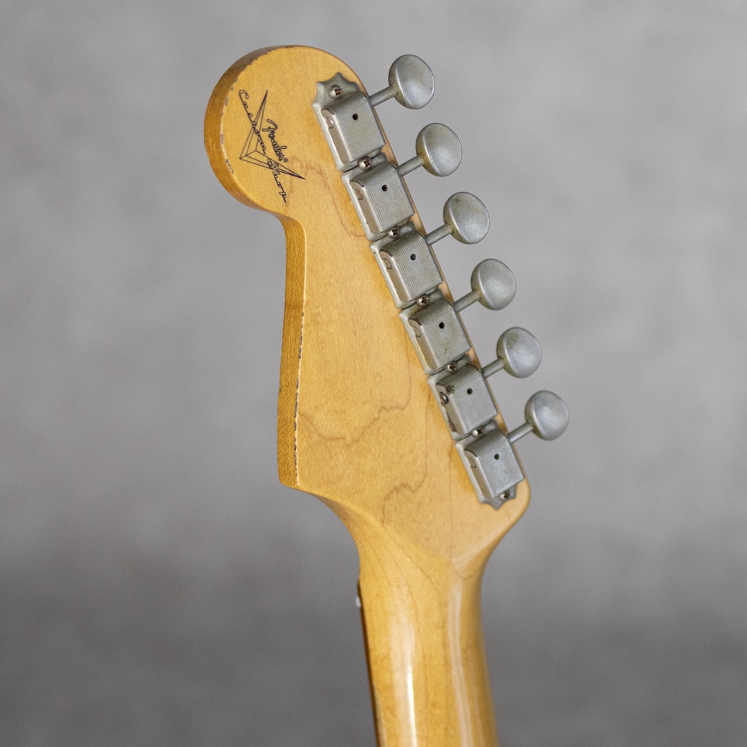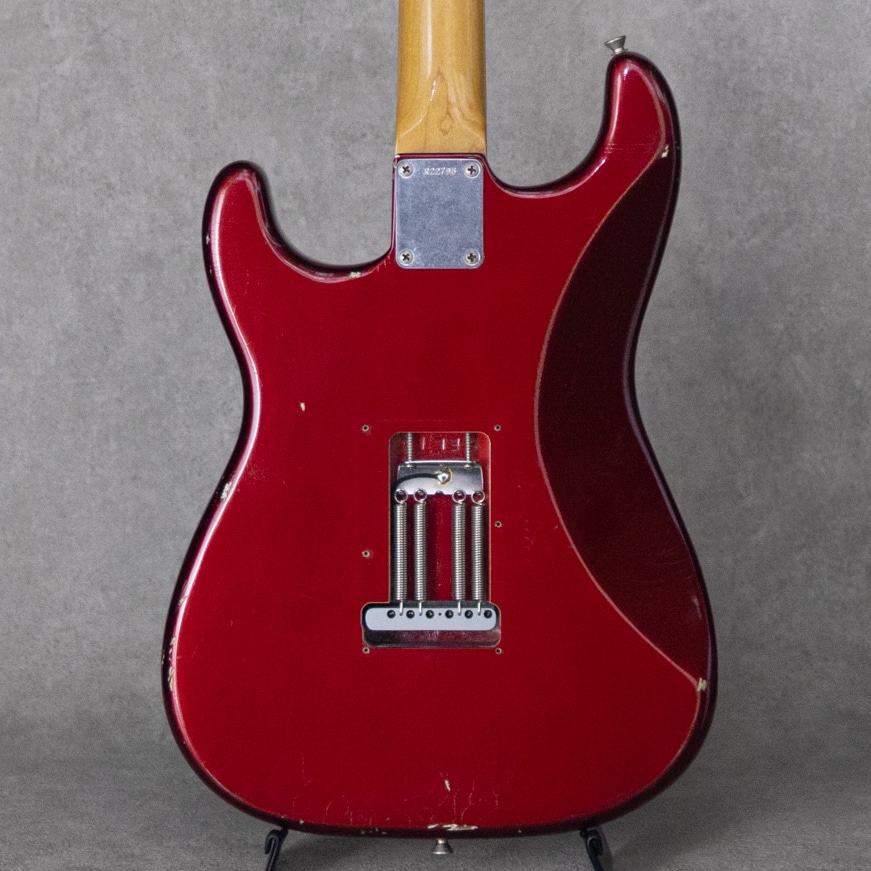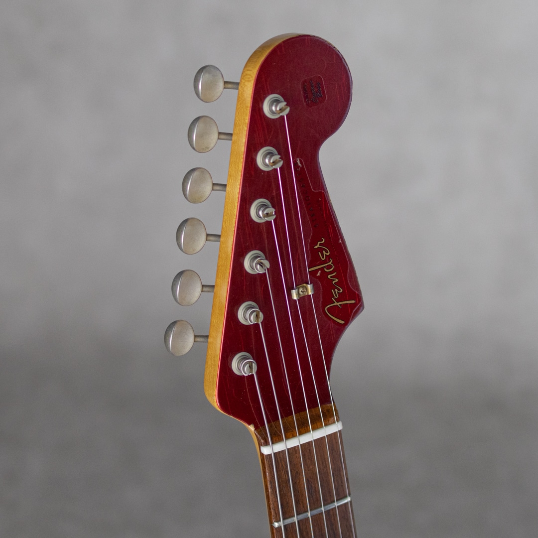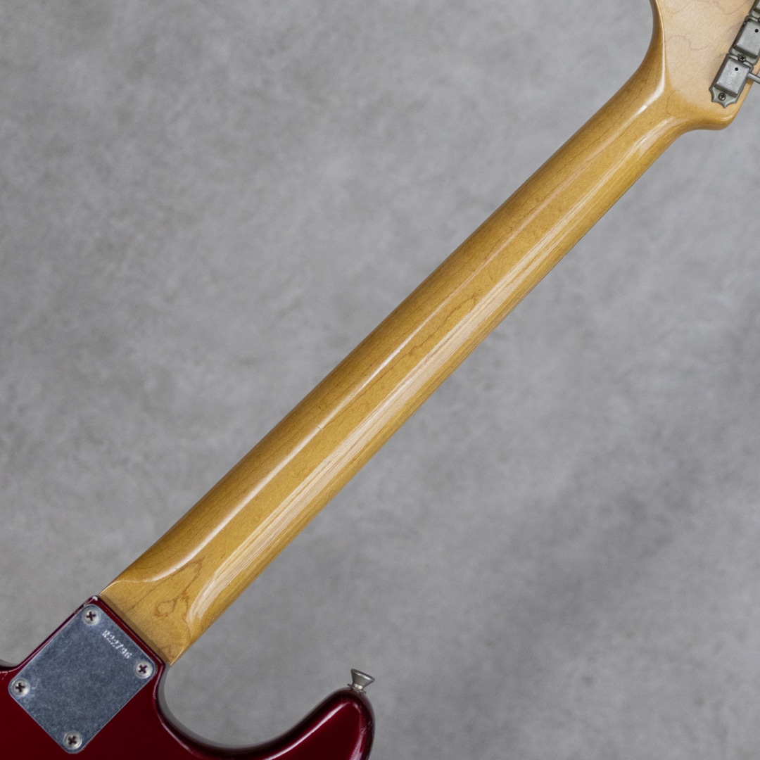マッチングヘッドがクールな”1960 Stratocaster Relic Candy Apple Red Matching Head”。2005年製USED品。当時タイムマシンシリーズのスポットモデルで、下地のゴールドが垣間見える色気ある濃いめのキャンディーアップルレッドカラーの1本。アルダー2pcsボディ、スラブローズ指板のウッドスペックといった王道スペック。ネックグリップは60 Style Oval Cシェイプで、薄くなく握り心地の良いネックシェイプ。ミントグリーンカラーのセルロイドピックガード、カスタムショップ製60sピックアップx3、0.1uFフィルムコンデンサー搭載。ファットなサウンドで、低音まで野太くレスポンスしてくれる60sストラトサウンド。艶やかなサスティンとアタックが小気味良い1本。トーン回路がフロント、ミドル・リアの配線にされており、エッジーなカッティングサウンドから、ウォームなブルージーサウンドまで網羅できる1本です。ウェザーチェックがびっしりと入りながら上品なレリック加工の本器。使用に伴う若干の小傷・打痕は若干見られますが、いやらしい質感はなく馴染んだよい質感です。ネックコンディションも良好でトラスロッドの余裕もあり、低いアクションにセットアップしていますがハイフレットまで音詰まりなく演奏面も良好です。フレットはジャンボサイズが使用されており約7?8割ほどの残りでしっかりとプレイいただけます。サウンド・ルックス共に申し分なしの色気あるマッチングヘッドのヴィンテージリイシュー・ストラト。程度の良い実戦向きのストラトをお探しの方にオススメの1本です。オリジナルブラウントーレックスハードケース、認定書、バックパネル&ネジ、オリジナルトレモロアーム、ブリッジカバー、トレモロスプリングなど新品時付属類も付属します。