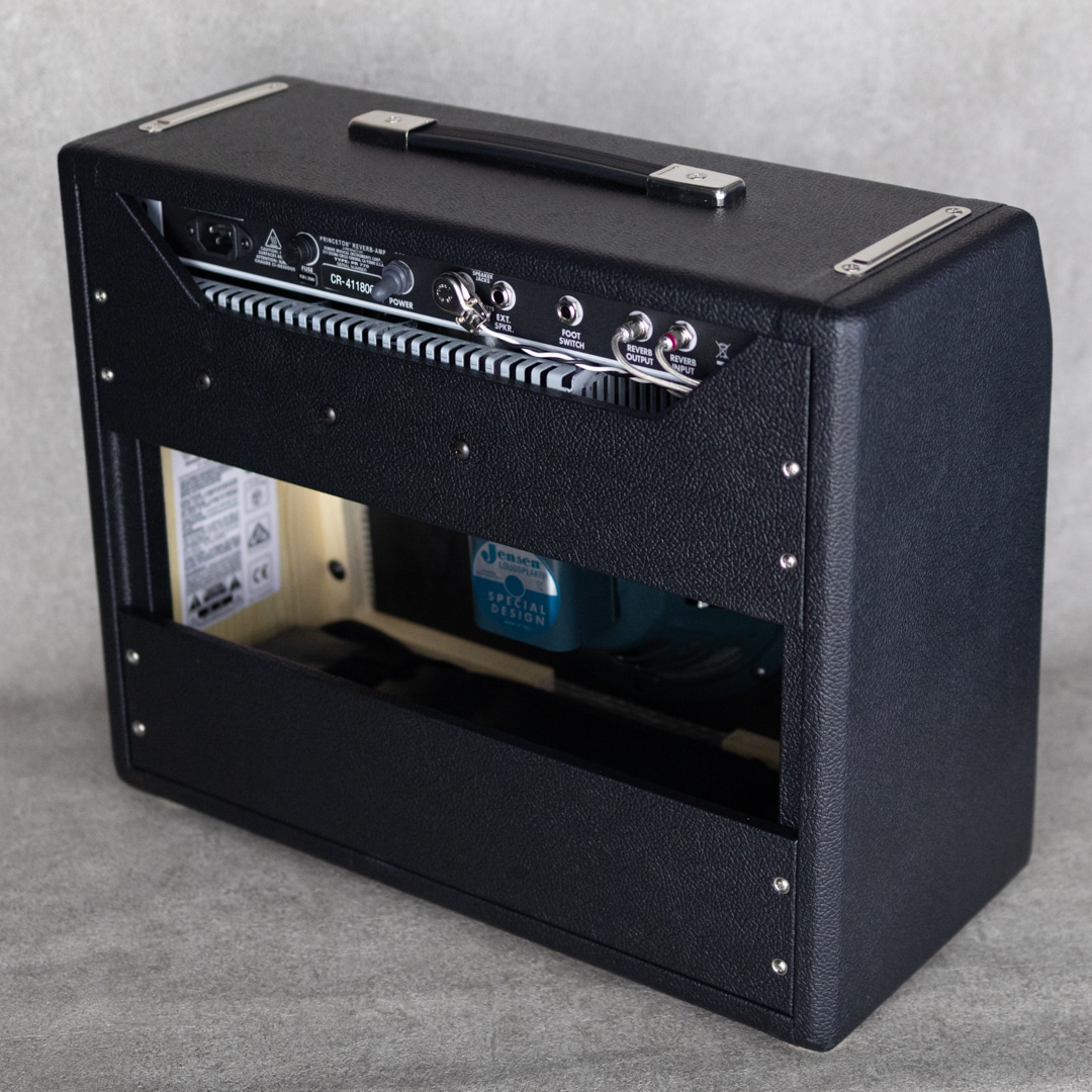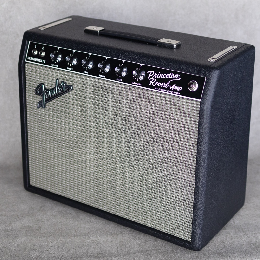 Fender “Princeton”アンプ。ツイード時期より”Champ”アンプの上位モデルとしてラインナップしていた”Princeton”アンプ。60年代に入りブラックフェイス時期にはリバーブユニットが搭載され、リバーブ搭載モデルとしては最小ワッテージモデルとしてラインナップされていました。発売当時は12w出力のこのモデルは練習用アンプの位置付けでラインナップされましたが、適度なパワー感とリバーブ/トレモロなどの多彩なサウンドを持つこともあり、レコーディングアンプとしてもとても高い評価をされてきました。本器は、そんな60年代ブラックフェイス時期モデルが再現された"'64 Custom Princeton Reverb”。2023年製極上USED品。ポイントトゥポイントのハンドワイヤードによる”AA764”回路で組み上げられており、真空管駆動のリバーブとトレモロエフェクトが搭載。Fender Vintage Blue toneキャパシターを使用、スピーカーには10”のJensen/アルニコP10Rが採用されています。艶やかでハリと音圧のある”Princeton”サウンド。ボリュームに比例して上がる音圧感はハンドワイヤードならではで、野太く芯からしっかりと立ち上がってくれます。金属質で耳をつくサウンドではなく、しっかりとヌケのあるフェンダーサウンドをお楽しみいただけます。ボリュームツマミの効き幅も良く、ご自宅部屋での練習音量でもお使いいただけます。使用感もほとんどなく新品同様コンディションの本器。フットスイッチ、アンプカバーなど新品時の付属品から元箱まで完備します。本家が作るビンテージリシューモデルのハンドワイヤードモデル。是非お手元でお楽しみくだだい。