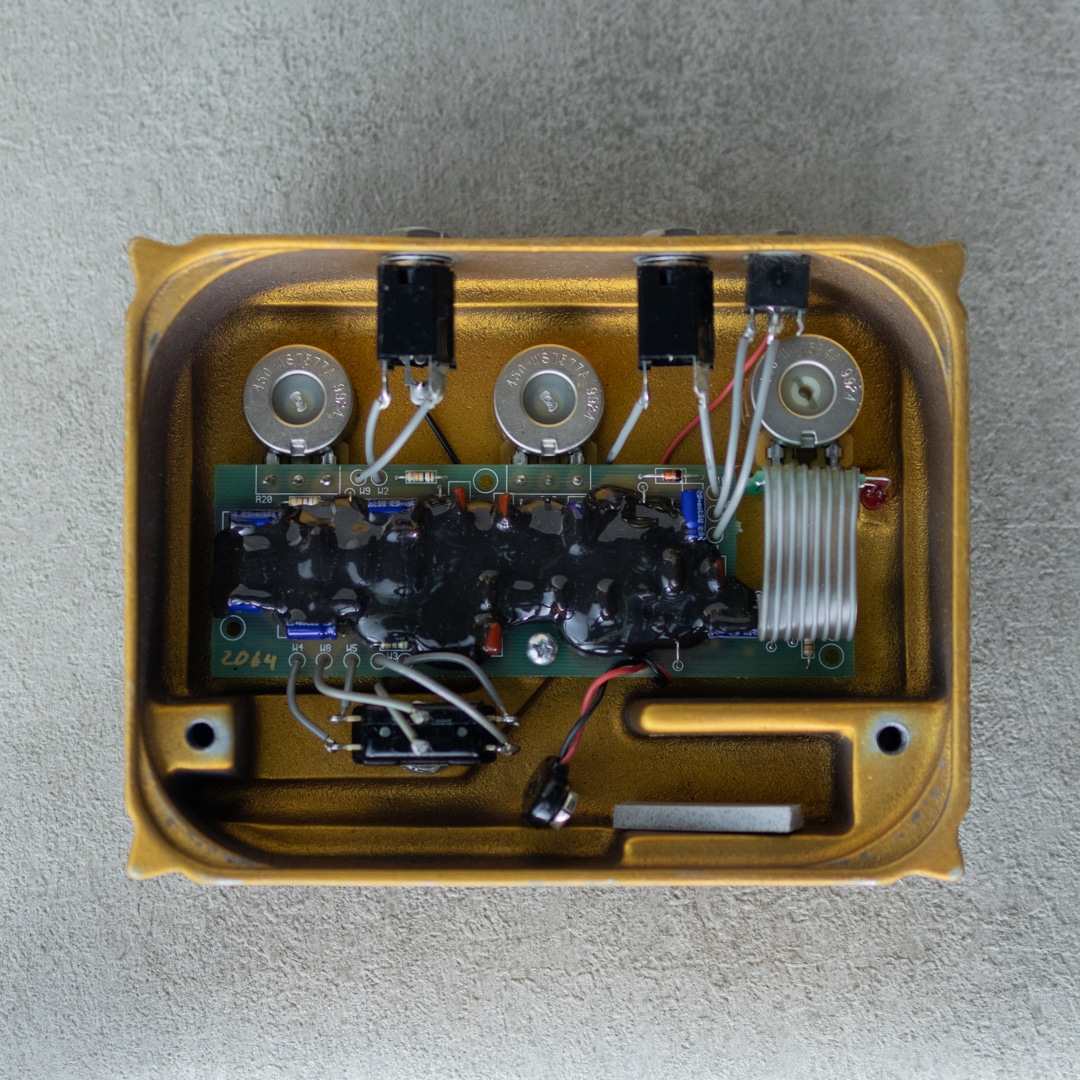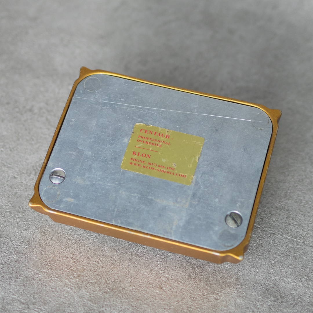 数あるストンプボックスの中でも、一際高い評価を得るKLON “CENTAUR”。その独特の外観とサウンドで数多くのギタリストを魅了し、今なおその人気は衰えない唯一無二のオーバードライブペダルです。”Centaur Professional Orverdrive”が製品化されたのは1994年のこと。製作者であるBill Finnegan(ビル・フィネガン)氏は、当時既存のペダルでは自身が演奏するサウンドに満足できず、それを満たすペダルの設計をすることとなります。友人の協力を得ながら2年間の試行錯誤の末に製品化を完成させました。2009年に受注ストップされるまでに製造された”Centaur Professional Orverdrive”は3バージョンの外観を持ちます。本器は、中期にあたる通称”ショートテール”モデル。POTデイト1999年、スイッチデイト1999年、ショートテール筐体、中期仕様2000番台シリアルの1999年頃製になります。この頃の”Centaur Professional Orverdrive”はミドルが太く、ファットかつエッジーなサウンドを味わえます。単体でもしっかりと歪んでくれ、オーバードライブでもブースターとしてデもその真価を発揮してくれます。足ゴムは欠損していますが内部の改造や修理などもなく、外装の小キズも少ないグッドコンディションの本器。レンジの広いファットなブースターとしても、クリーンchに合わせ抜けの良い図太いエッジーなオーバードライブとしても、その真価を味わえるキング・オブ・オーバードライブペダル。是非ご体感ください。