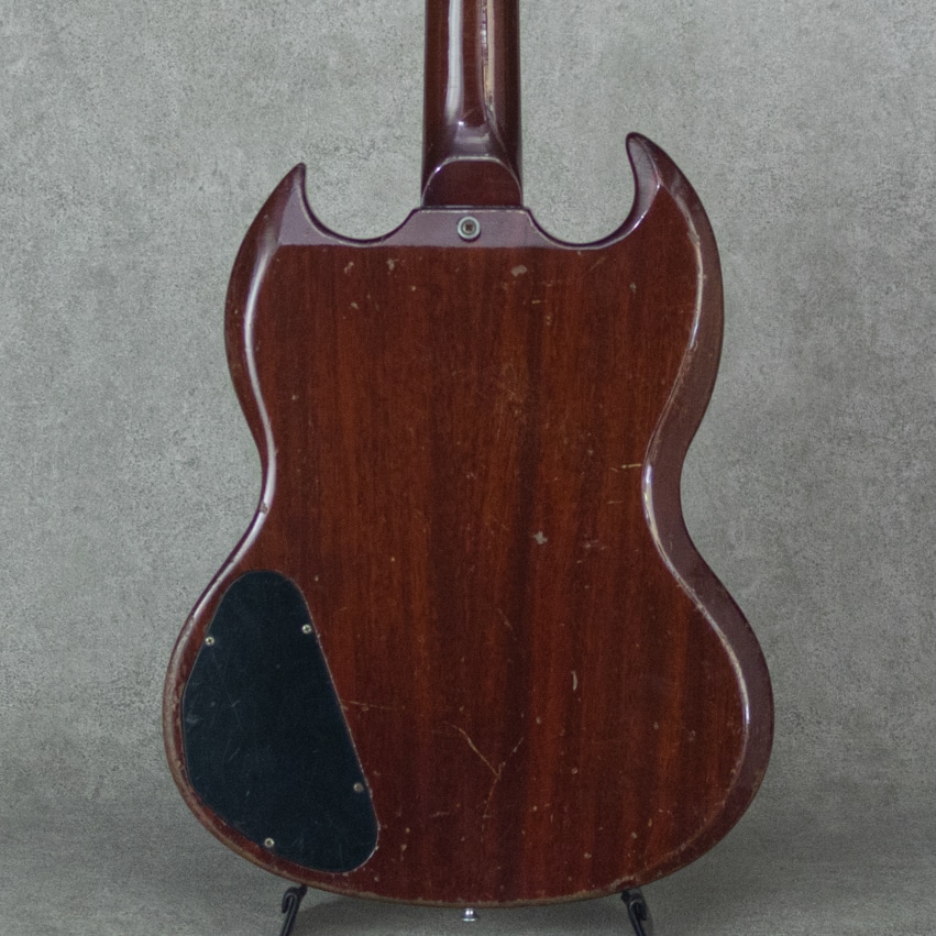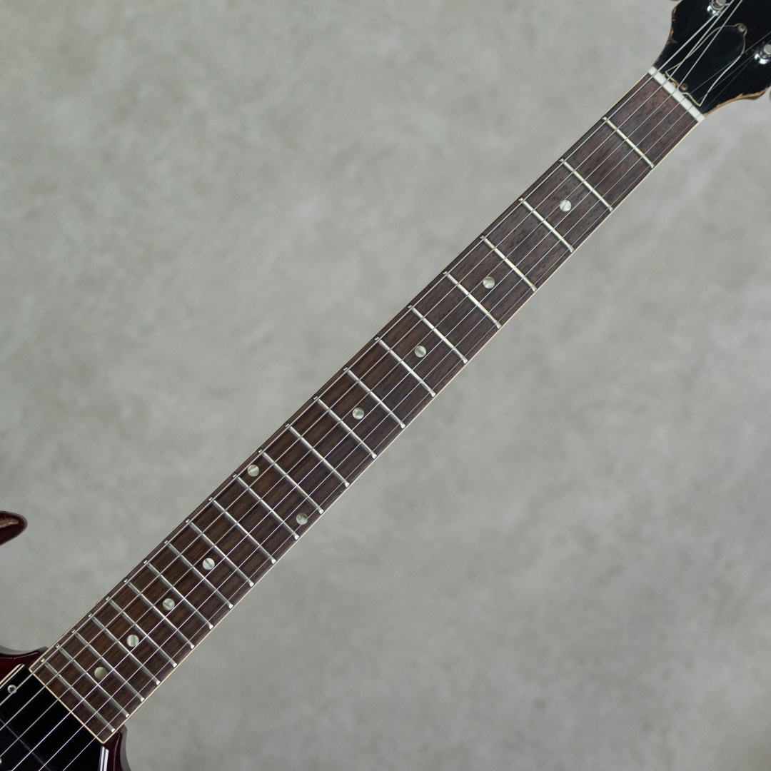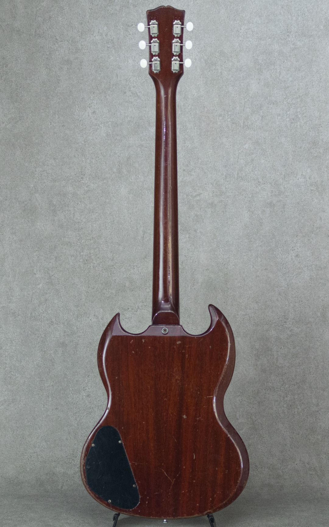1960年代、Gibsonソリッドエレクトリックの屋台骨としてセールスを支えた"SG"。58年~60年に言わずと知れたLes Paul Standard "サンバースト"が展開された後、Les Paulシリーズは61年に大胆なフルモデルチェンジがなされ、全てのグレードラインナップが所謂”SGシェイプ”へと変更。63年頃にはギタリストLes Paul氏との契約終了に伴い、モデル名"Les Paul"は全て"SG"へと切り替わることになりました。"Les Paul Model"が、高級機種の"Custom"、スチューデントモデルの"Junior"、ライムドマホガニーカラー採用の"TV"、そして中堅グレード2PUの"Special"と広げていったラインナップバリエーションに準じ、同様の展開がなされました。本器はナローネック、浅いヘッド角等が採用され始めた1966年製SG Special。約40・の握り込みやすいネックですが、この時期はまだネック裏プロファイルの厚み・丸みが残っており気持ちの良いグリップ感。軽量なボディ、狭い間隔で取り付けられたP-90ピックアップ等のデザインも影響して、軽く薄いサウンドになりがちなSG Specialですが、本器はSGらしい軽快なキャラクターを持ちつつ、ハリとコシの感じられる伸びやかなグッドサウンド。入力に対するパンっと弾けるダイナミックなアタック、ハイミッドに十分な倍音を伴ったサスティーンは、アンプでゲインアップすればたちまち存在感ある飽和感を放ち、ヴィンテージギブソントーンの醍醐味を存分に味わわせてくれます。こちらアイコニックなチェリーカラーが良く映える貫禄、全体的に経年相応のキズや塗装のチェッキングがございますが、演奏性や外観を顕著に損なうダメージ、構造上のウィークポイントはございません。ショートバイブローラーが取り外されている他、ペグは近年製KLUSONに換装。リフレット・リナットが施されている為、即戦力の演奏性です。ネックコンディションも良好で、ヴィンテージながらローアクションのセッティングができております。また古いSGで懸念されがちのネックジョイントに関してもとても良い状態で、しっかりと安心感のあるセットコンディション。ピックアップ他電装系はオリジナルをキープしており、紛うことなき60's Gibsonトーンを存分にお楽しみいただける一本です。搭載のP-90は内部ボビンに多少割れが見られますが、出力に問題はございません。まだまだステージで弾き倒していただきたいプレイヤーズヴィンテージ、ぜひお確かめください。オリジナルハードケースが付属。