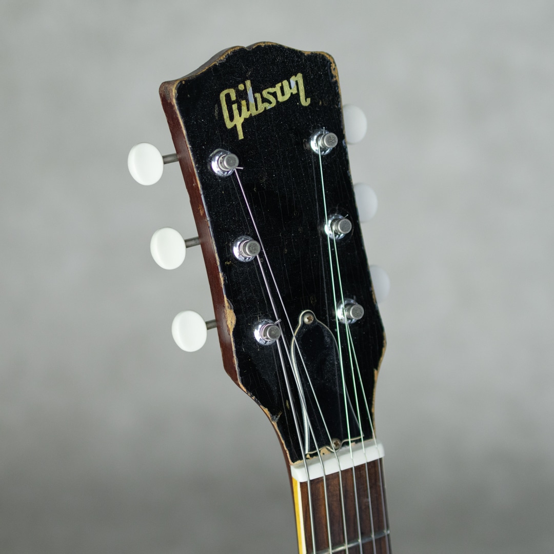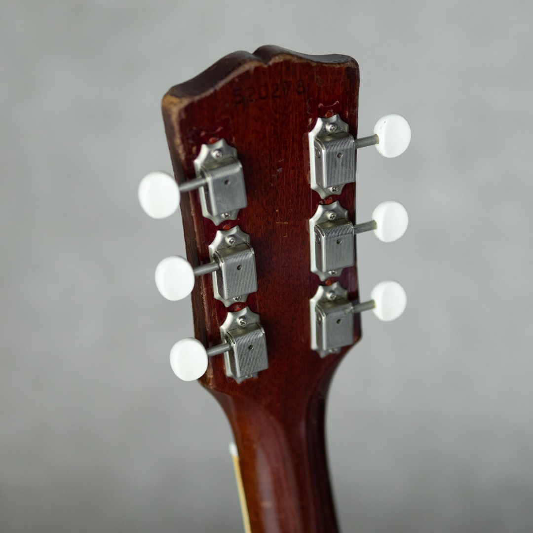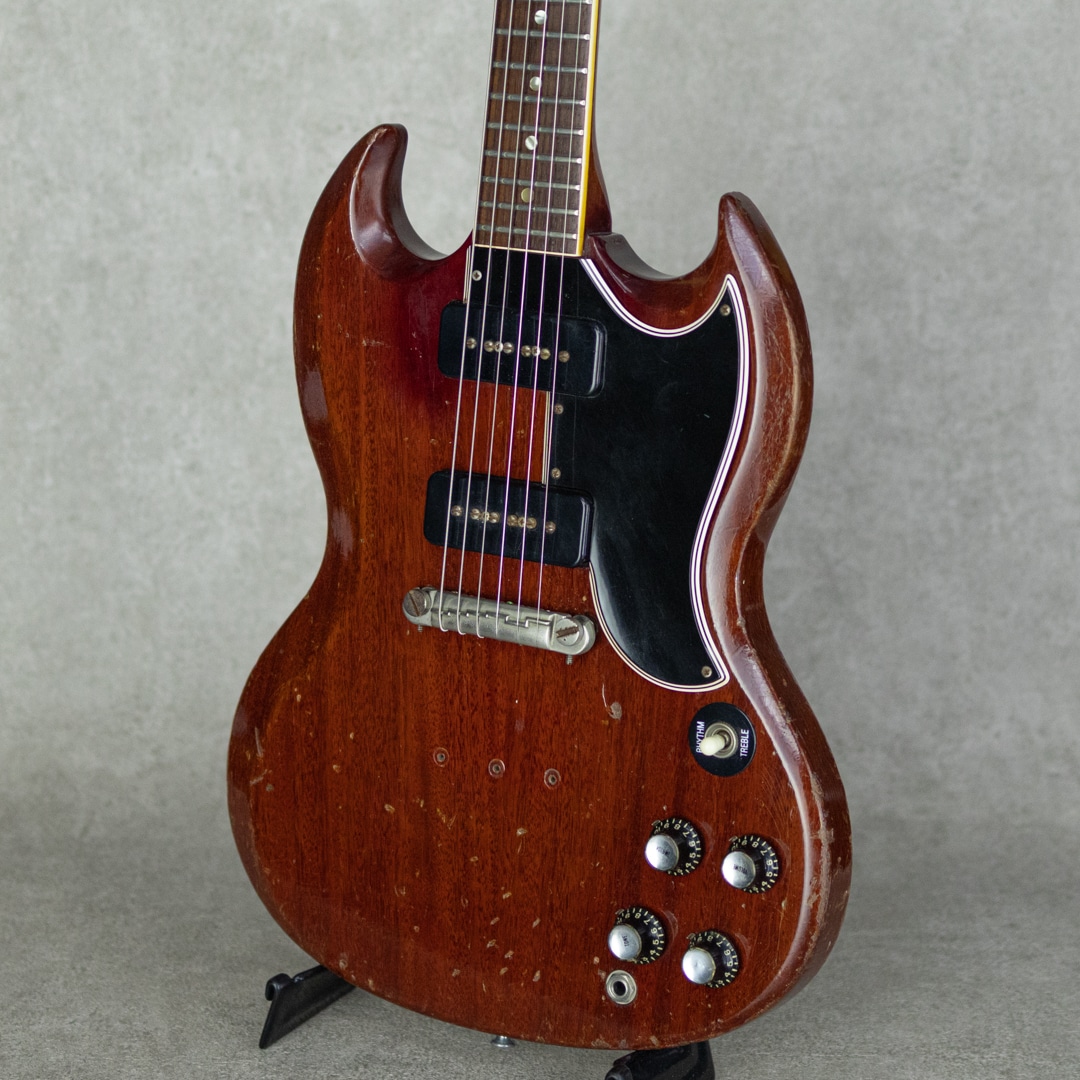 1960年代、Gibsonソリッドエレクトリックの屋台骨としてセールスを支えた"SG"。58年~60年に言わずと知れたLes Paul Standard "サンバースト"が展開された後、Les Paulシリーズは61年に大胆なフルモデルチェンジがなされ、全てのグレードラインナップが所謂”SGシェイプ”へと変更。63年頃にはギタリストLes Paul氏との契約終了に伴い、モデル名"Les Paul"は全て"SG"へと切り替わることになりました。"Les Paul Model"が、高級機種の"Custom"、スチューデントモデルの"Junior"、ライムドマホガニーカラー採用の"TV"、そして中堅グレード2PUの"Special"と広げていったラインナップバリエーションに準じ、同様の展開がなされました。本器はナローネック、浅いヘッド角等が採用され始めた1966年製SG Special。約40・の握り込みやすいネックですが、この時期はまだネック裏プロファイルの厚み・丸みが残っており気持ちの良いグリップ感。軽量なボディ、狭い間隔で取り付けられたP-90ピックアップ等のデザインも影響して、軽く薄いサウンドになりがちなSG Specialですが、本器はSGらしい軽快なキャラクターを持ちつつ、ハリとコシの感じられる伸びやかなグッドサウンド。入力に対するパンっと弾けるダイナミックなアタック、ハイミッドに十分な倍音を伴ったサスティーンは、アンプでゲインアップすればたちまち存在感ある飽和感を放ち、ヴィンテージギブソントーンの醍醐味を存分に味わわせてくれます。こちらアイコニックなチェリーカラーが良く映える貫禄、全体的に経年相応のキズや塗装のチェッキングがございますが、演奏性や外観を顕著に損なうダメージ、構造上のウィークポイントはございません。ショートバイブローラーが取り外されている他、ペグは近年製KLUSONに換装。リフレット・リナットが施されている為、即戦力の演奏性です。ネックコンディションも良好で、ヴィンテージながらローアクションのセッティングができております。また古いSGで懸念されがちのネックジョイントに関してもとても良い状態で、しっかりと安心感のあるセットコンディション。ピックアップ他電装系はオリジナルをキープしており、紛うことなき60's Gibsonトーンを存分にお楽しみいただける一本です。搭載のP-90は内部ボビンに多少割れが見られますが、出力に問題はございません。まだまだステージで弾き倒していただきたいプレイヤーズヴィンテージ、ぜひお確かめください。オリジナルハードケースが付属。