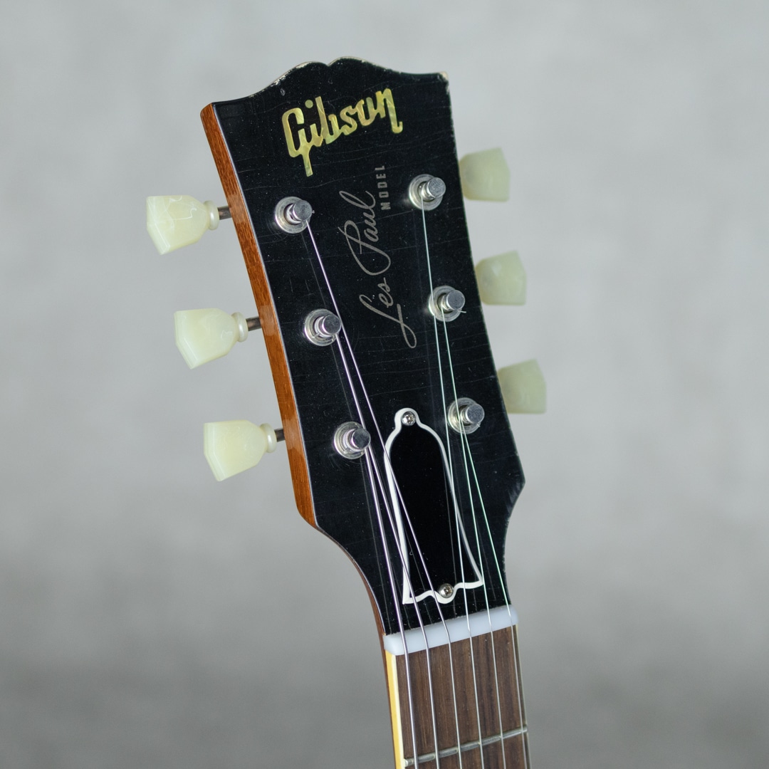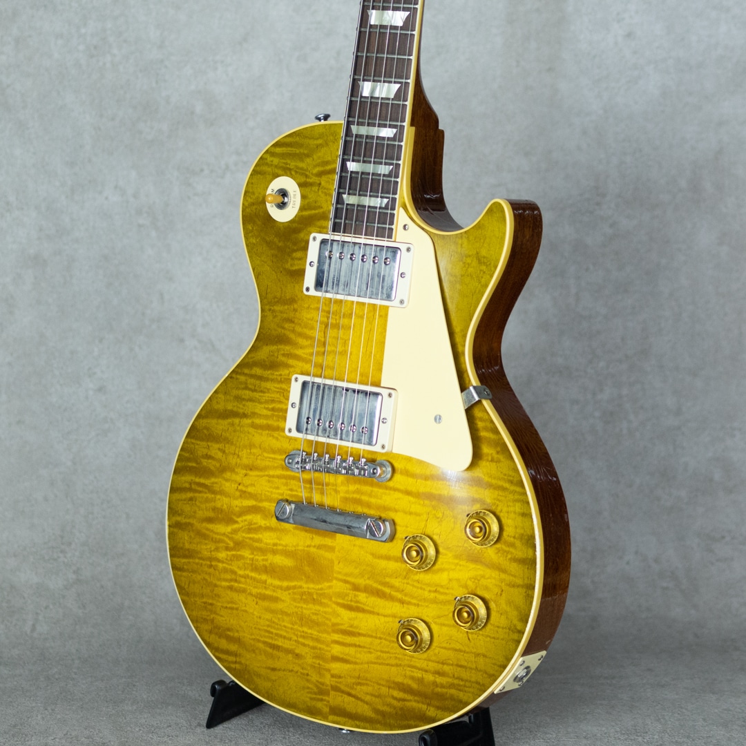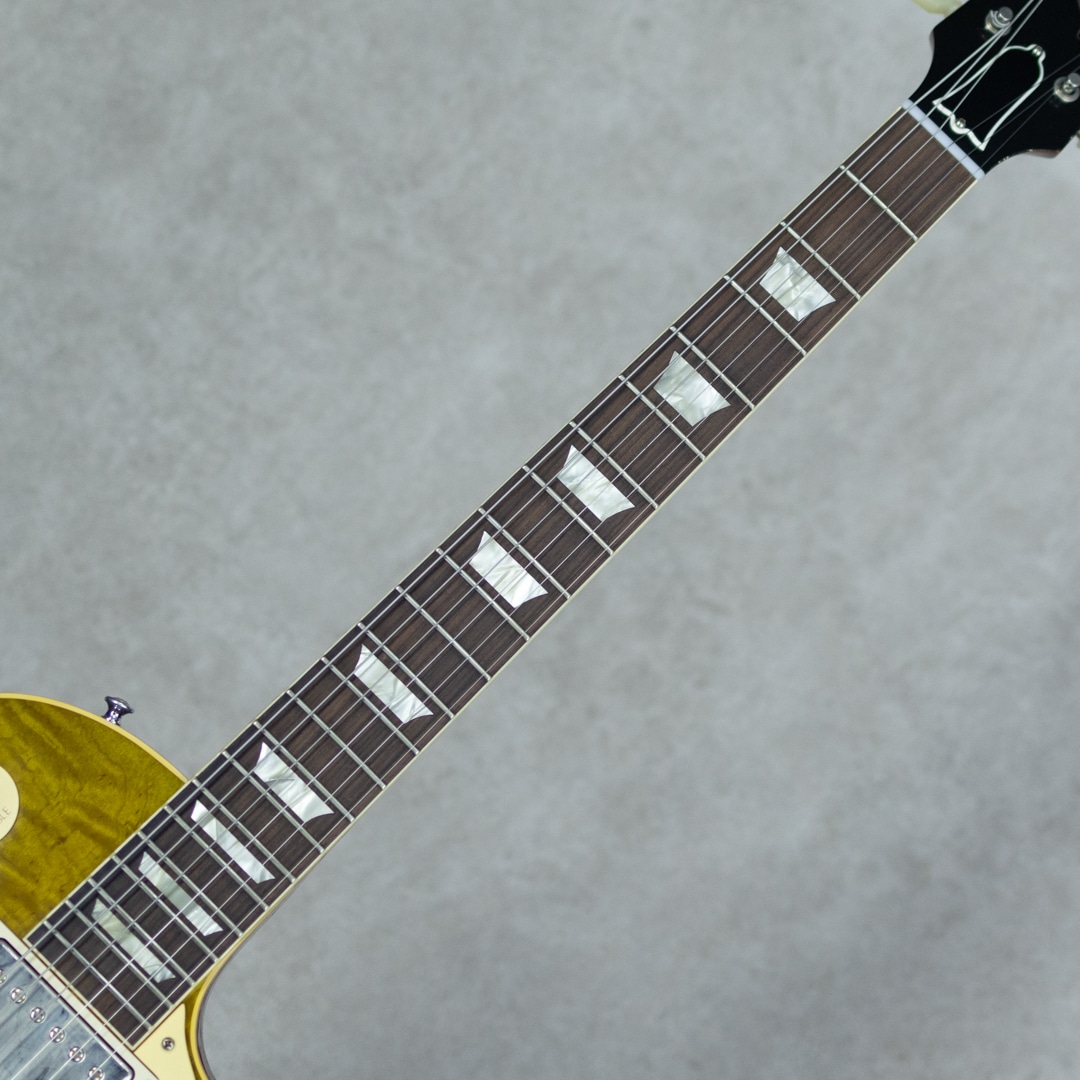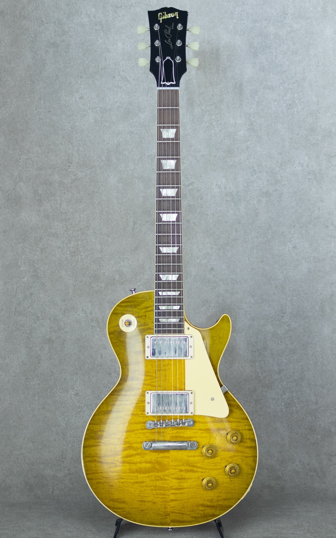 Gibson Custom Shopにおけるフラッグシップモデル"R9 Les Paul"。最新のアップデートは常に当モデルのブラッシュアップから波及していく形で進められます。2015年の"True Historic"登場、2018年の"Historic Collection"復活を経て、2019年の60周年記念モデルではデザインディテール、電装パーツ等がより詰められた決定版的スペックとなりました。より当時に近い書体と色味のヘッドロゴ、シルクスクリーン、ロウ付けをしないアンポッテド仕様のCustombuckerピックアップ、オールニカワ接着やTrue Historicパーツの採用…etc。90年代から続くリイシューLes Paulにおいて圧倒的な完成度を誇る現行最新仕様。しかしヴィンテージが持つ独自の雰囲気を、更なる技術によってアップチャージしたシリーズが"Murphy Lab"シリーズです。2021年より始動した"Murphy Lab Collection"は最新のHistoric Collectionと同スペックの完成度を持ちつつ、塗装のみ独自の手法を採用。従来のエイジドではウェザーチェックの再現を刃物で表現していましたが、"Murphy Lab"では1950~60年代のニトロセルロースラッカーを解析し新開発したラッカーを使用することにより、自然に発生させるリアルなウェザーチェックを実現。さらには薄めの塗装の質感により、ヴィンテージに迫る自然な風合いと豊かで力強い生鳴りは格別。ヴィンテージに迫るルックスとフィーリングを弾き手に与える、『究極のヴィンテージ・クローン・シリーズ』を実現しました。オリジナルサウンドに迫る立ち上がりのスピード感、反応の良さ、オープンなサウンドは圧巻。"Historic Collection"の一般的な塗装スペックである"VOS"仕様では、敢えてある程度柔軟性を持たせたラッカーが採用されています。これは新品製品として不用意に塗装チェッキングが入らないようにする工夫でもありますが、"本当に割れていてる"Murphy Labにおいて、その完成度はルックスのリアルさに留まらず、湿ったシャツを脱ぎ捨てたような圧倒的な解放感を感じさせます。こちらは人気のグリーンレモンフェイドカラー。均整が取れつつもフレックが散見される野性的な杢が、よりリアルなバースト然とした存在感を魅せてくれる面構え。既にボディエッジやカッタウェイ部等、塗装のチェッキングが進んでいる個所がございますが、使用に伴うフレットの減りなどは殆ど感じません。ロッドの調整を含め良好なネックコンディション。エイジング・オプション4段階中の2番目"Light Aged"が施されておりますが、ここからがっつり弾きこんでより貫禄ある姿に育つ姿も楽しみ。愛でて良し、弾いて良しの一本。ぜひお見逃しなく。オリジナルハードケース、認定書、新品時付属のキャンディ類等完備。