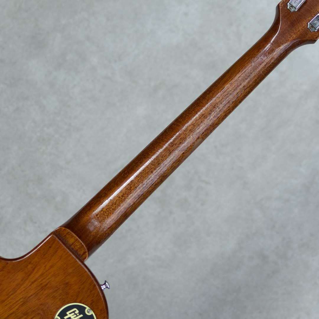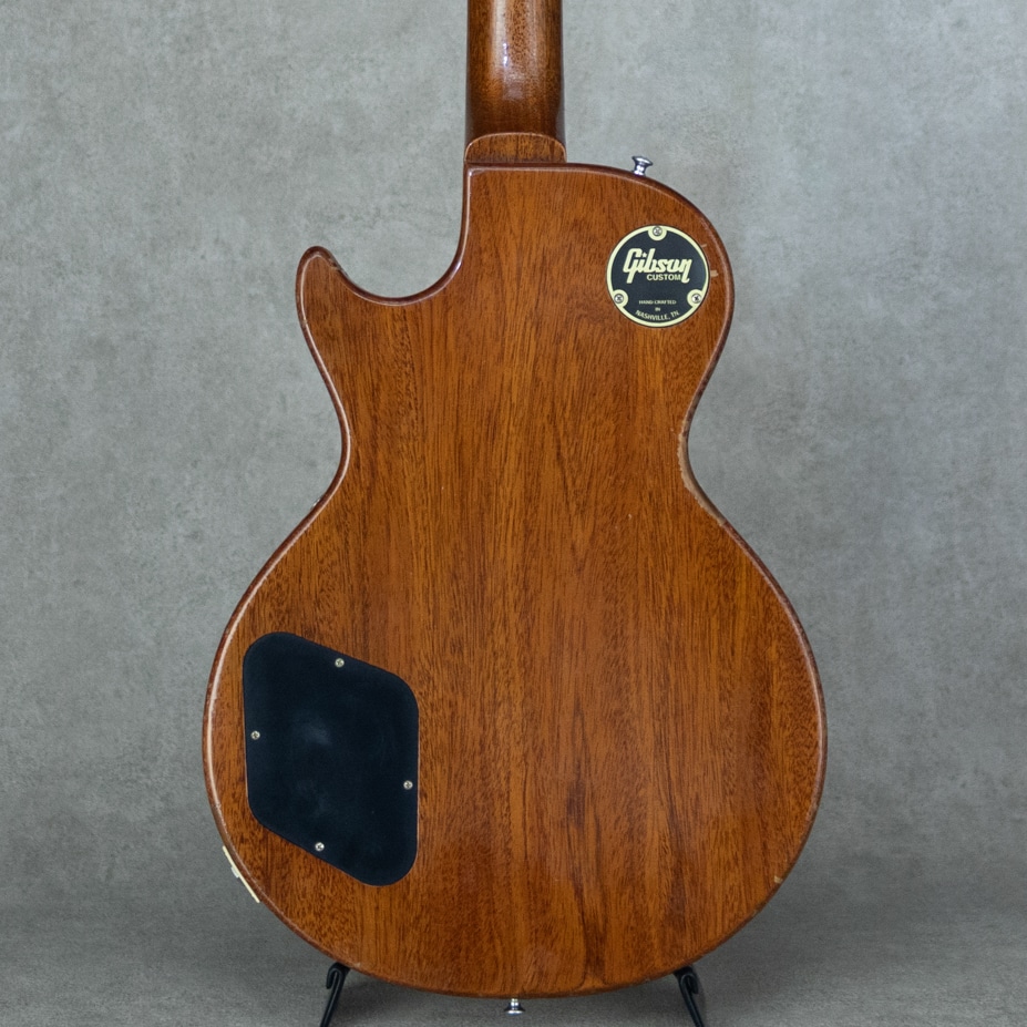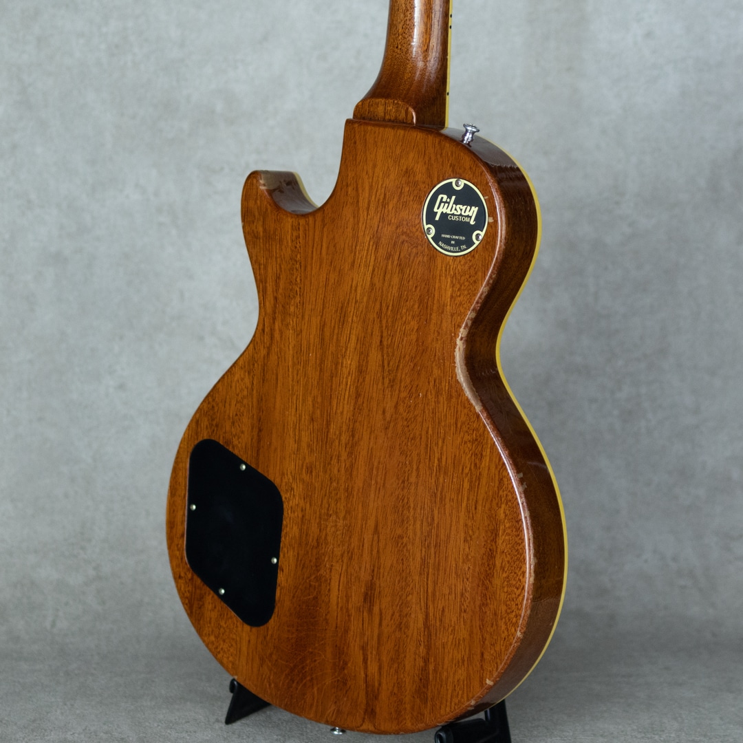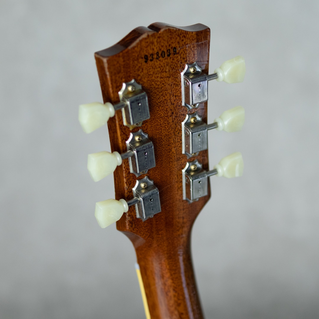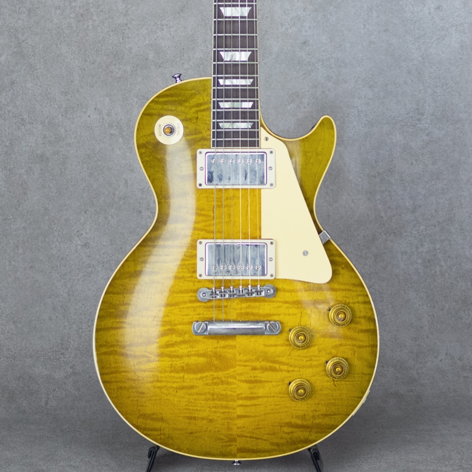 Gibson Custom Shopにおけるフラッグシップモデル"R9 Les Paul"。最新のアップデートは常に当モデルのブラッシュアップから波及していく形で進められます。2015年の"True Historic"登場、2018年の"Historic Collection"復活を経て、2019年の60周年記念モデルではデザインディテール、電装パーツ等がより詰められた決定版的スペックとなりました。より当時に近い書体と色味のヘッドロゴ、シルクスクリーン、ロウ付けをしないアンポッテド仕様のCustombuckerピックアップ、オールニカワ接着やTrue Historicパーツの採用…etc。90年代から続くリイシューLes Paulにおいて圧倒的な完成度を誇る現行最新仕様。しかしヴィンテージが持つ独自の雰囲気を、更なる技術によってアップチャージしたシリーズが"Murphy Lab"シリーズです。2021年より始動した"Murphy Lab Collection"は最新のHistoric Collectionと同スペックの完成度を持ちつつ、塗装のみ独自の手法を採用。従来のエイジドではウェザーチェックの再現を刃物で表現していましたが、"Murphy Lab"では1950~60年代のニトロセルロースラッカーを解析し新開発したラッカーを使用することにより、自然に発生させるリアルなウェザーチェックを実現。さらには薄めの塗装の質感により、ヴィンテージに迫る自然な風合いと豊かで力強い生鳴りは格別。ヴィンテージに迫るルックスとフィーリングを弾き手に与える、『究極のヴィンテージ・クローン・シリーズ』を実現しました。オリジナルサウンドに迫る立ち上がりのスピード感、反応の良さ、オープンなサウンドは圧巻。"Historic Collection"の一般的な塗装スペックである"VOS"仕様では、敢えてある程度柔軟性を持たせたラッカーが採用されています。これは新品製品として不用意に塗装チェッキングが入らないようにする工夫でもありますが、"本当に割れていてる"Murphy Labにおいて、その完成度はルックスのリアルさに留まらず、湿ったシャツを脱ぎ捨てたような圧倒的な解放感を感じさせます。こちらは人気のグリーンレモンフェイドカラー。均整が取れつつもフレックが散見される野性的な杢が、よりリアルなバースト然とした存在感を魅せてくれる面構え。既にボディエッジやカッタウェイ部等、塗装のチェッキングが進んでいる個所がございますが、使用に伴うフレットの減りなどは殆ど感じません。ロッドの調整を含め良好なネックコンディション。エイジング・オプション4段階中の2番目"Light Aged"が施されておりますが、ここからがっつり弾きこんでより貫禄ある姿に育つ姿も楽しみ。愛でて良し、弾いて良しの一本。ぜひお見逃しなく。オリジナルハードケース、認定書、新品時付属のキャンディ類等完備。