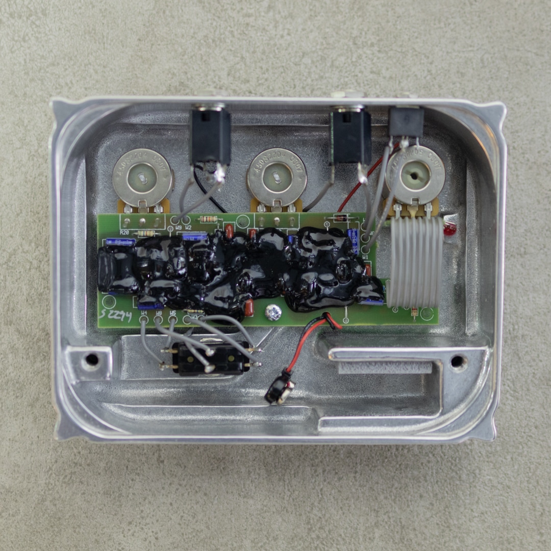 数あるストンプボックスの中でも、一際高い評価を得るKLON “CENTAUR”。その独特の外観とサウンドで数多くのギタリストを魅了し、今なおその人気は衰えない唯一無二のオーバードライブペダルです。”Centaur Professional Orverdrive”が製品化されたのは1994年のこと。製作者であるBill Finnegan(ビル・フィネガン)氏は、当時既存のペダルでは自身が演奏するサウンドに満足できず、それを満たすペダルの設計をすることとなります。友人の協力を得ながら2年間の試行錯誤の末に製品化を完成させました。2009年に受注ストップされるまでに製造された”Centaur Professional Orverdrive”は3バージョンの外観を持ちます。本器は、最終期にあたる通称”ノーピクチャー”モデル。POTデイト2003年、スイッチデイト2005年、ノーピクチャー筐体、最終モデル仕様S2200番台シリアルの2005年頃製になります。この頃の”Centaur Professional Orverdrive”はゲインの倍率も高く、単体でもしっかりと歪んでくれます。アンプブースターとしてはもちろん、きらびやかで抜けと歯切れの良いオーバードライブとしてもその真価を発揮してくれます。シルバー・ノンピクチャーは現”Centaur”人気を牽引するアイコニックなモデル。筐体のくすみもほとんど見られず、バックパネルのくすみもほとんど見られないニアミントコンディションの本器。もちろん内部の改造や修理などもなく、また外装の傷も極々わずかです。また、シリアルマッチドの元箱・英文取扱説明書、電源用プラグパーツまで揃ったコレクタブルな逸品です。レンジの広いクリーンブースターとしても、クリーンchに合わせ艶やかで荒々しいドライブとしても、その真価を味わえるキング・オブ・オーバードライブペダル。是非ご体感ください。