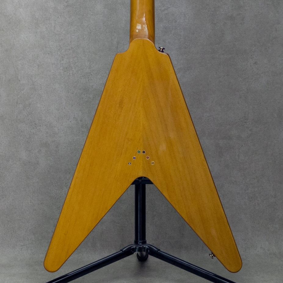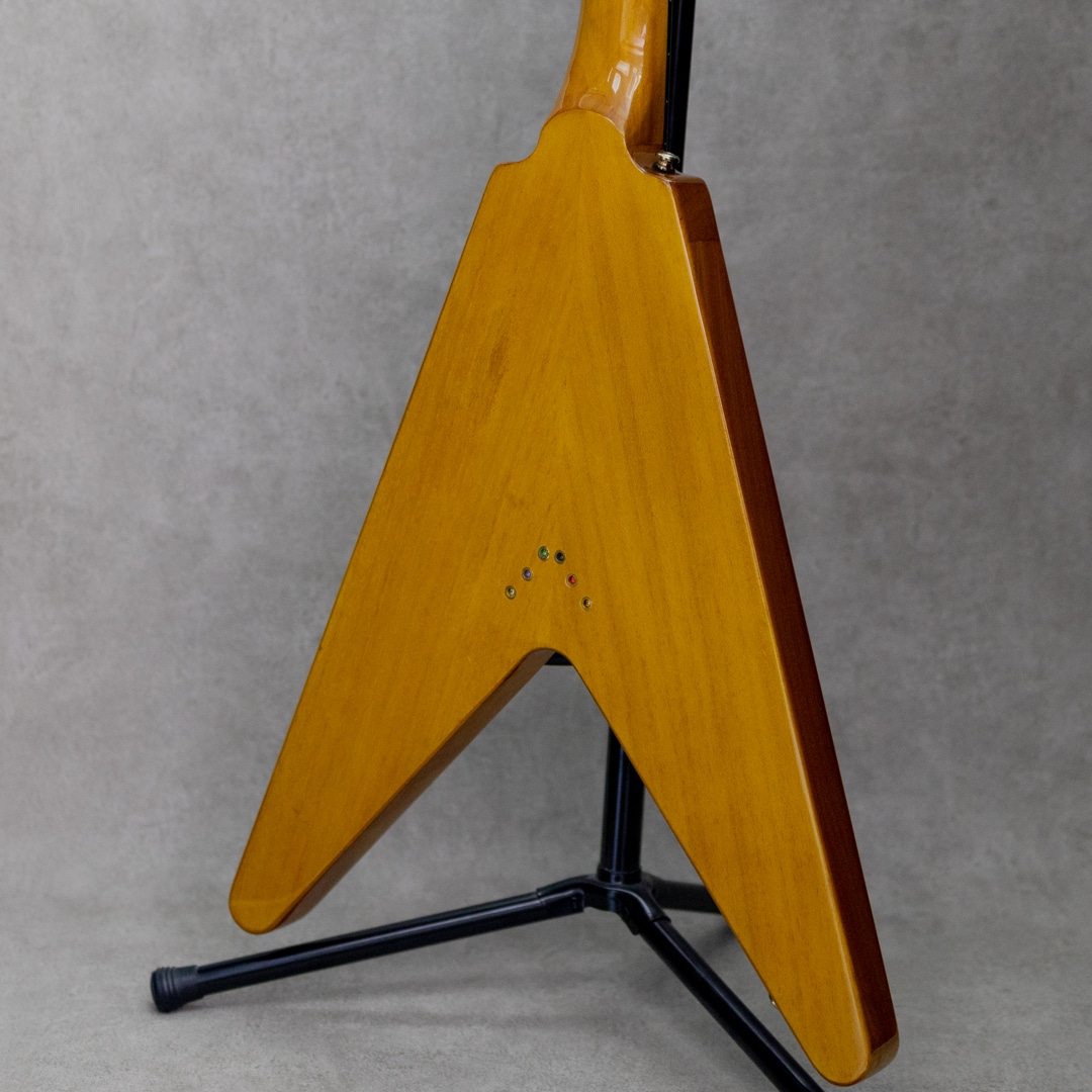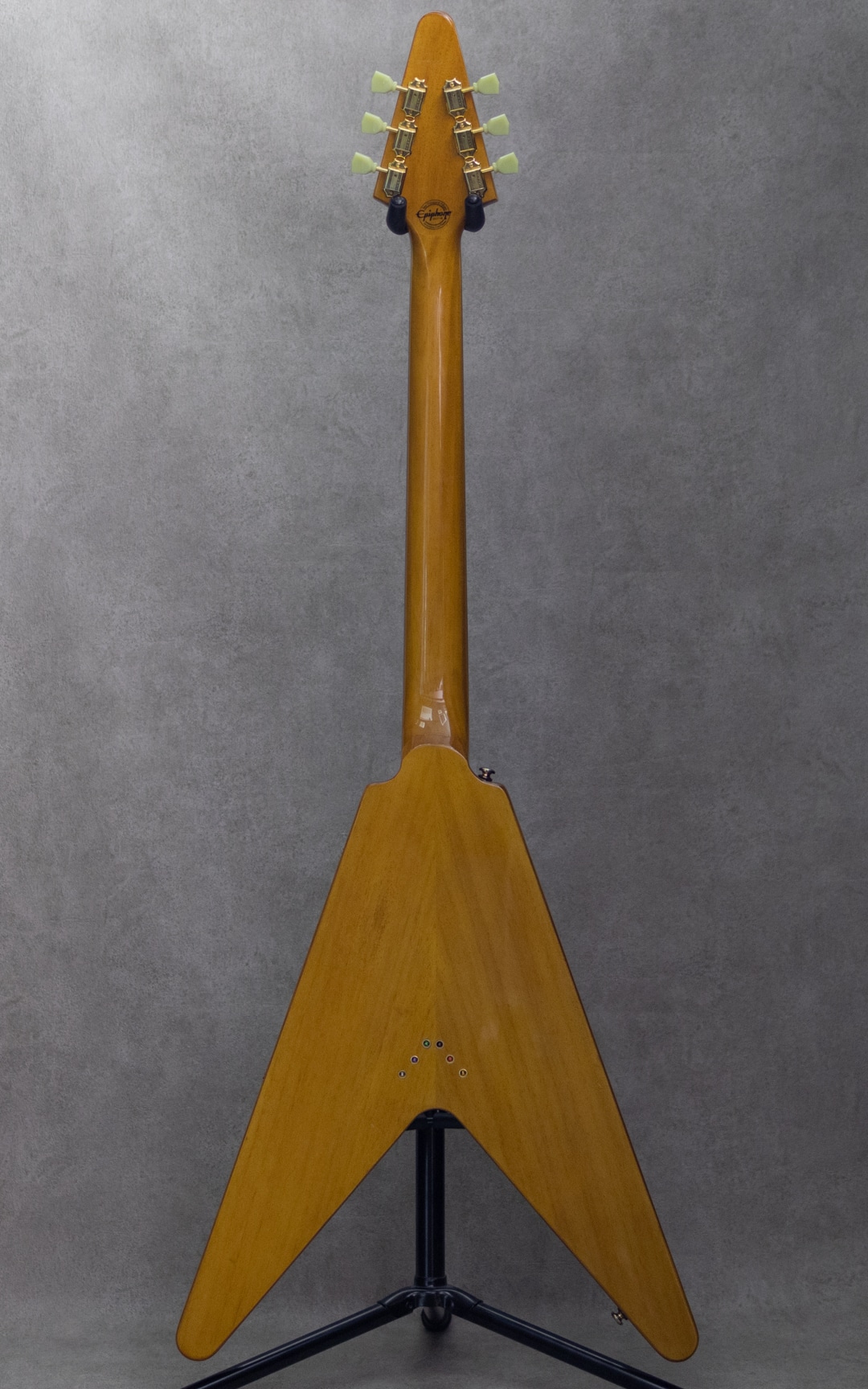 1950年代の終盤、まだまだ黎明期であったソリッドエレクトリックギターの世界において、初の"変形ギター"の登場と言ってもよいであろうGibson Flying V。Gibsonソリッドモデルの父テッドマッカーティの元、時代を大きく先取りしての発表がされましたが、コアなラインナップとは至らず少数生産に限られました。しかし60年代以降、数々ギタリストたちのアイコニックなアイテムとしても認知されるようになり、その後のハードロック、メタル~という系譜の中でもなくてはならない存在へと登りつめていったことはご多分に漏れずです。本器Epiphone は、ボディにコリーナ材が使われていたことで知られる1958年のオリジナルFlying Vをトリビュートした人気モデル。1998年に初めてEpiphoneブランドより登場したKorina Vでは、ルックスこそ特有の50'sスタイルを再現しておりましたが、コリーナ材の使用はボディ表裏の化粧板部分に限られ、実際にボディ材を占める部分はアルダーで構成されておりました。その後2010年頃までこの仕様が販売されましたが、2016年から新しくリリースされた際にはボディの大部分を占める中心部もコリーナを採用しての登場となりました。その他、全フレットがボディから突き出たネックジョイント、V字のプレートテールピース、ボディサイドのラバー、センターシームでV字に柾目の木目が走るパターン...50'sコリーナスタイルをしっかりと踏襲したスペックが採用されています。独特なレゾナンス感を持った低音がしっかりと効き、コリーナらしく歯切れが良いクリーンなミッドレンジが魅力的なアウトプット。こちら、多少のピックのスレ跡等ゴールドハードウェアのくすみ等はあるものの顕著なダメージはございません。フレットの残りも9割程で使用感は感じない綺麗なコンディション。ロッドの調整を含めネックの状態も良好です。ルックス抜群コリーナV、お見逃しなく。ギグケースが付属。