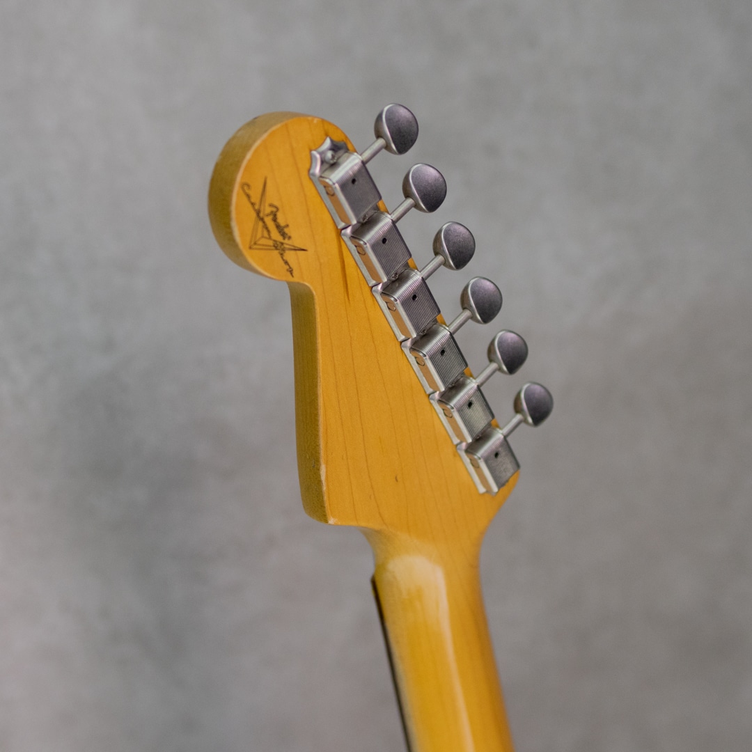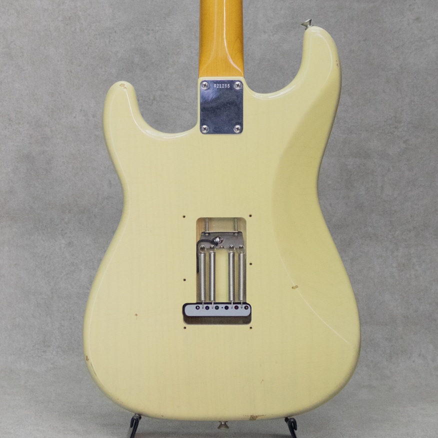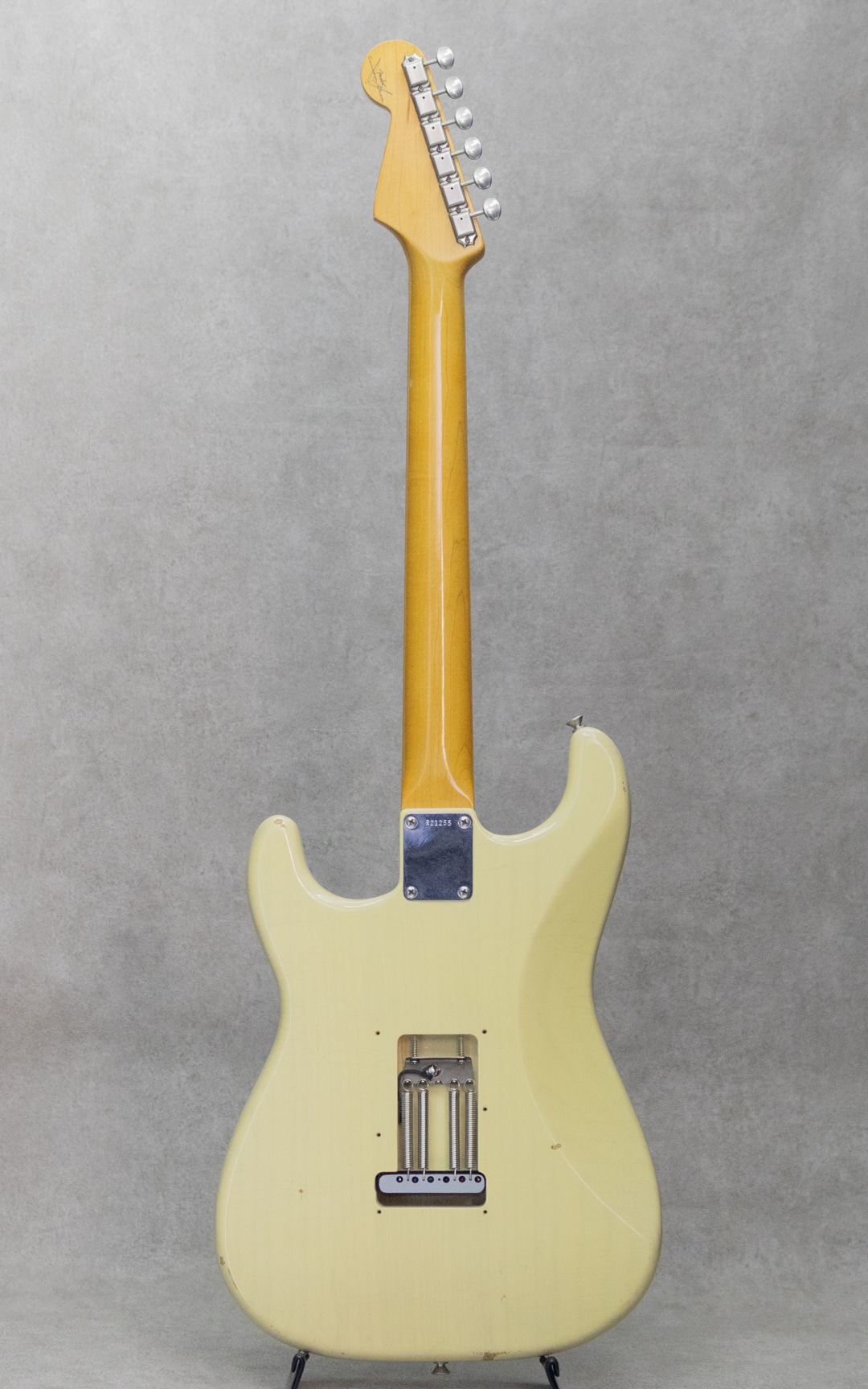 アッシュボディの”1960 Stratocaster Relic Ash Vintage Blonde”。2004年製USED品。当時タイムマシンシリーズを基にした当時代理店のカスタムオーダーシリーズ(COS)。アッシュボディに焼けたビンテージブロンドカラー、べっ甲柄PGを合わせたレリックモデルの1本。アッシュ2pcsボディ、スラブローズ指板のウッドスペックで、指板材には美しい杢目のマダガスカルローズウッドが使用されています。ネックグリップは60 Style Oval Cシェイプで、薄くなく握り心地の良いネックシェイプ。4plyべっ甲柄セルロイドピックガード、カスタムショップ製60sピックアップx3搭載。コンデンサーはフェンダーワックスペーパー0.1uFを搭載しています。コントロールレイアウトはマスタボリュームと、トーン回路がフロント、ミドル・リアの配線で、セレクターはCRL5wayスイッチを使用。歯切れ良く、しっかりと倍音をまとった60sストラトサウンドながら、芯の通ったアッシュならではの野太いサウンド。アルダーのそれと比べると、アタックが力強く、存在感あるミドルレンジをもたらしてくれます。使用に伴う小傷・打痕と思われる傷見られますが、元のレリック加工との違和感もほとんどなく良い経年感を魅せる本器。ウェザーチェックも程よく見られ、良い質感です。ネックコンディションも良好でトラスロッドの余裕もあり、低いアクションにセットアップしていますがハイフレットまで音詰まりなく演奏面も良好です。フレットはナロウトールサイズが使用されており約8?9割ほどの残りでしっかりとプレイいただけます。エイジド加減も控えめで上品かつ雰囲気のある仕上がり。色気ある見た目もクールなヴィンテージリイシュー・ストラト。程度の良い実戦向きのストラトをお探しの方にオススメの1本です。オリジナルブラウントーレックスハードケース、認定書、バックパネル&ネジ、オリジナルトレモロアーム、ブリッジカバー、トレモロスプリングなど新品時付属類も付属します。