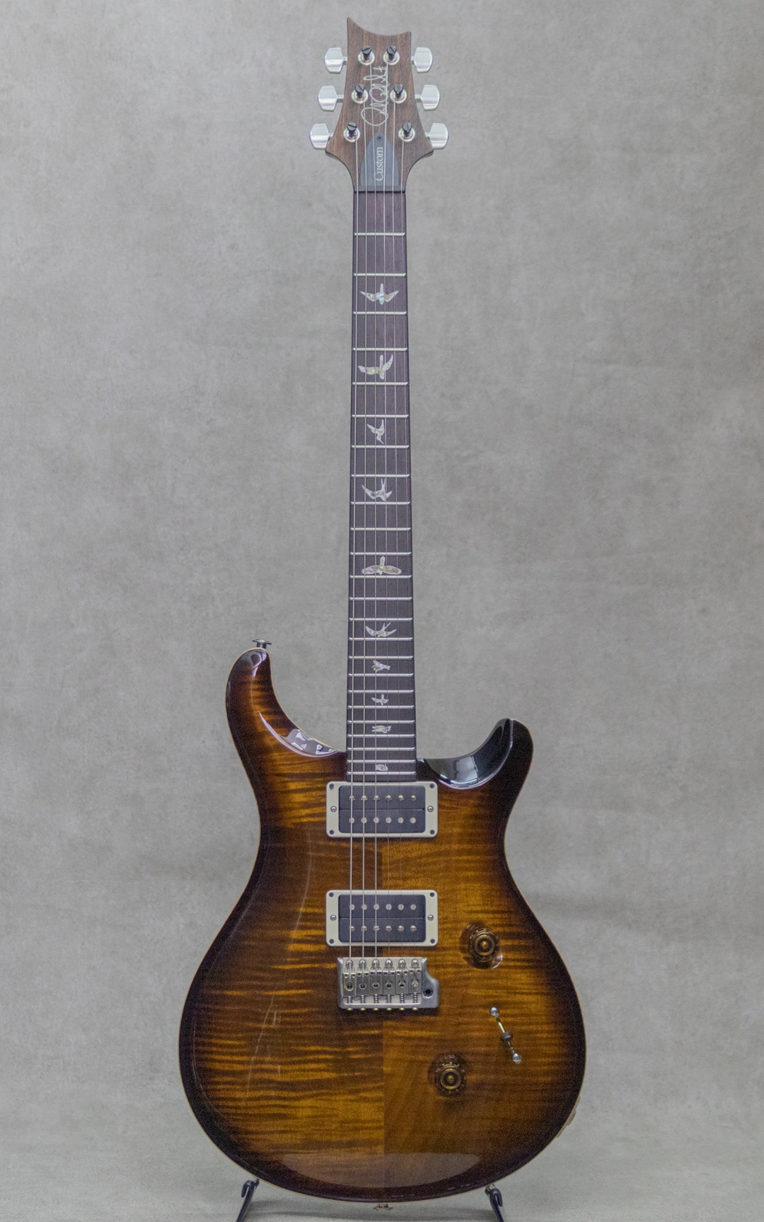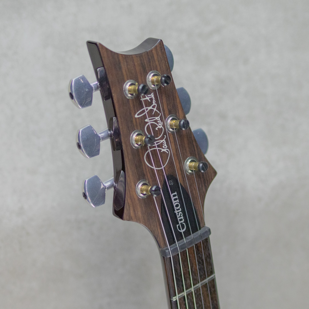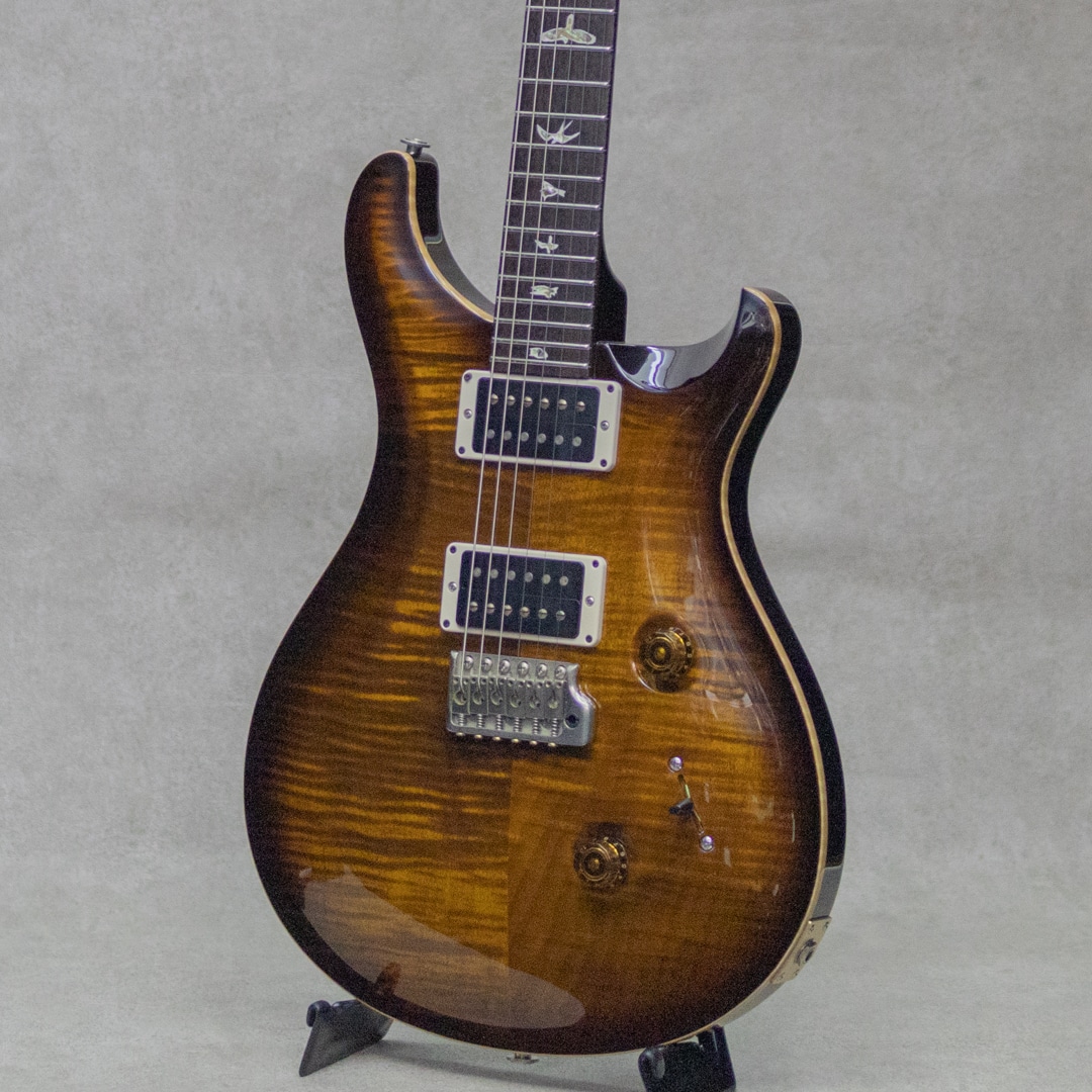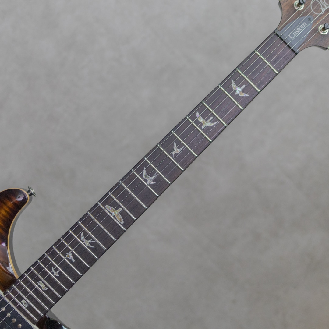 PRSを代表するフラッグシップモデル”Custom 24”。"Paul Reed Smith"が1985年に初めて出展したトレード・ショーで世に発表し、今日でもPRSの中で代表的存在かつ最も人気の高いPRSオリジナルモデルの決定版とも言えるモデル。本器は、2019年製USED品。独自のダブルカッタウェイシェイプのボディには美しいフレイム杢がしっかりと浮き出たメイプルトップとマホガニーを合わせ、ナチュラルバインディングを施した美しく陰影を縁取るブラックゴールドバーストカラーが眩い1本。ローズウッド指板を持つマホガニーネックは、”Pattern Thin(パターン・シン)”シェイプで、ハイフレットまで弾きやすく人気のシェイプです。PRSトレモロブリッジ、ロッキングチューナー、そしてPUには”TCI”プロセスにてチューニングされた”85/15”ピックアップx2を搭載。コントロールレイアウトは、マスターボリューム、マスタートーン、5wayスイッチ。クリアでコシのあるサウンド。しっかりと喰いつくサスティンは伸びやかでいて色気あるトーンを魅せてくれ、弾きにくさを感じさせない絶妙なトーンバランスをもたらしてくれます。金属パーツの若干のくすみは見られますが、打痕など見られず美しいコンディションを保った本器。PRSならではの美しい流線型ボディを心ゆくまで堪能できます。ネックコンディションも良好でフレット減りも殆んど無く、弾きやすいアクションでしっかりとお使いいただけます。PRSと言えばの”Custom 24”。幅広いプレイスタイルをしっかりと高いレベルで対応してくれる頼り甲斐のある1本です。オリジナルハードケース、オリジナルトレモロアーム、調整レンチ付属。