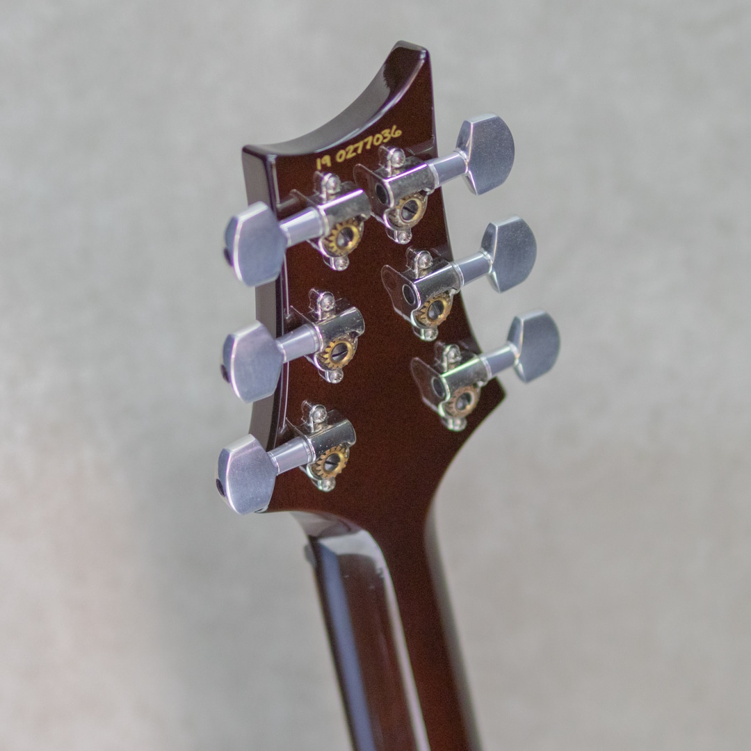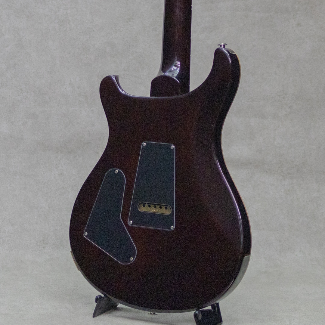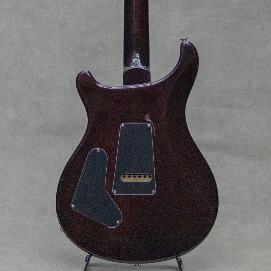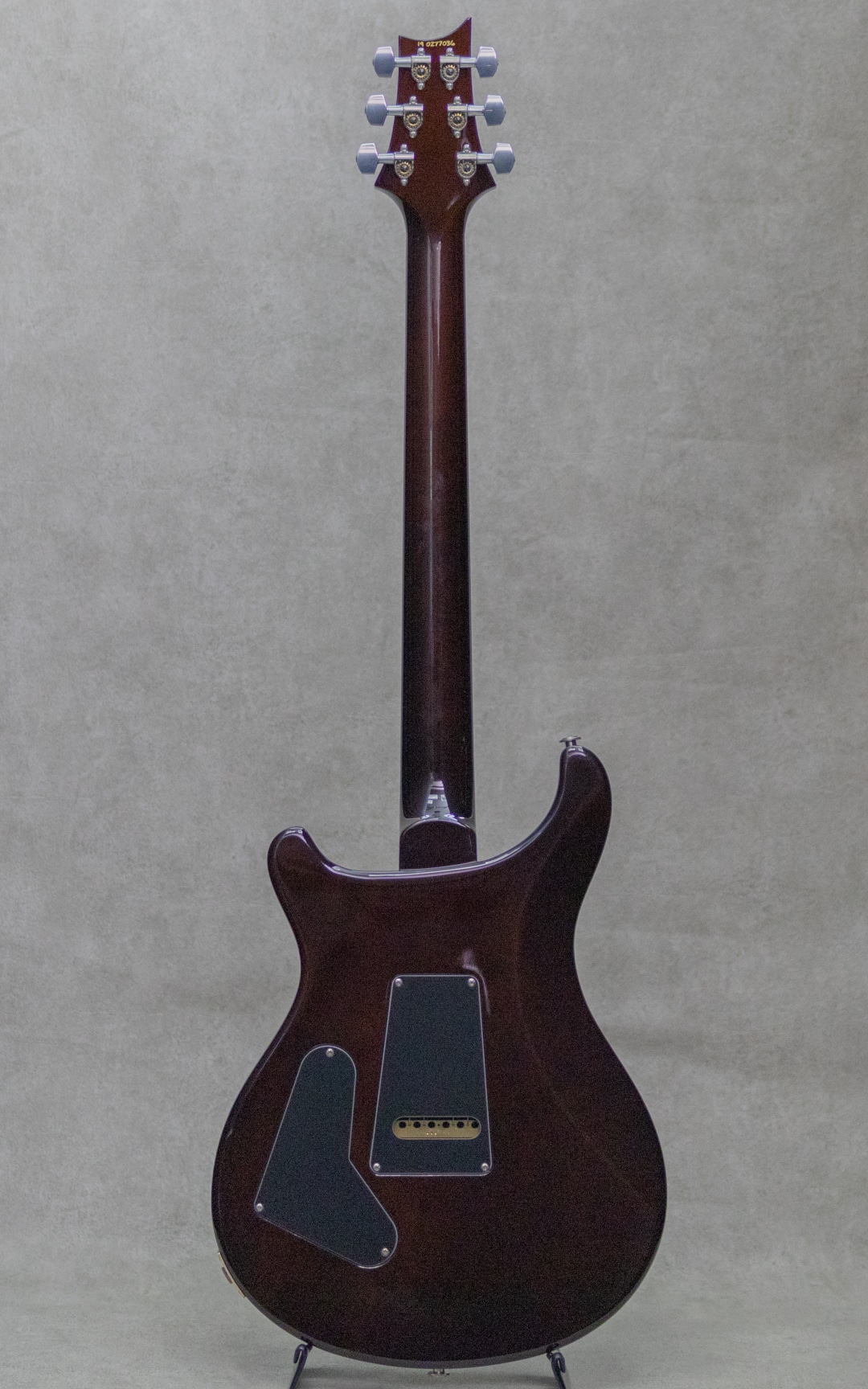 PRSを代表するフラッグシップモデル”Custom 24”。"Paul Reed Smith"が1985年に初めて出展したトレード・ショーで世に発表し、今日でもPRSの中で代表的存在かつ最も人気の高いPRSオリジナルモデルの決定版とも言えるモデル。本器は、2019年製USED品。独自のダブルカッタウェイシェイプのボディには美しいフレイム杢がしっかりと浮き出たメイプルトップとマホガニーを合わせ、ナチュラルバインディングを施した美しく陰影を縁取るブラックゴールドバーストカラーが眩い1本。ローズウッド指板を持つマホガニーネックは、”Pattern Thin(パターン・シン)”シェイプで、ハイフレットまで弾きやすく人気のシェイプです。PRSトレモロブリッジ、ロッキングチューナー、そしてPUには”TCI”プロセスにてチューニングされた”85/15”ピックアップx2を搭載。コントロールレイアウトは、マスターボリューム、マスタートーン、5wayスイッチ。クリアでコシのあるサウンド。しっかりと喰いつくサスティンは伸びやかでいて色気あるトーンを魅せてくれ、弾きにくさを感じさせない絶妙なトーンバランスをもたらしてくれます。金属パーツの若干のくすみは見られますが、打痕など見られず美しいコンディションを保った本器。PRSならではの美しい流線型ボディを心ゆくまで堪能できます。ネックコンディションも良好でフレット減りも殆んど無く、弾きやすいアクションでしっかりとお使いいただけます。PRSと言えばの”Custom 24”。幅広いプレイスタイルをしっかりと高いレベルで対応してくれる頼り甲斐のある1本です。オリジナルハードケース、オリジナルトレモロアーム、調整レンチ付属。