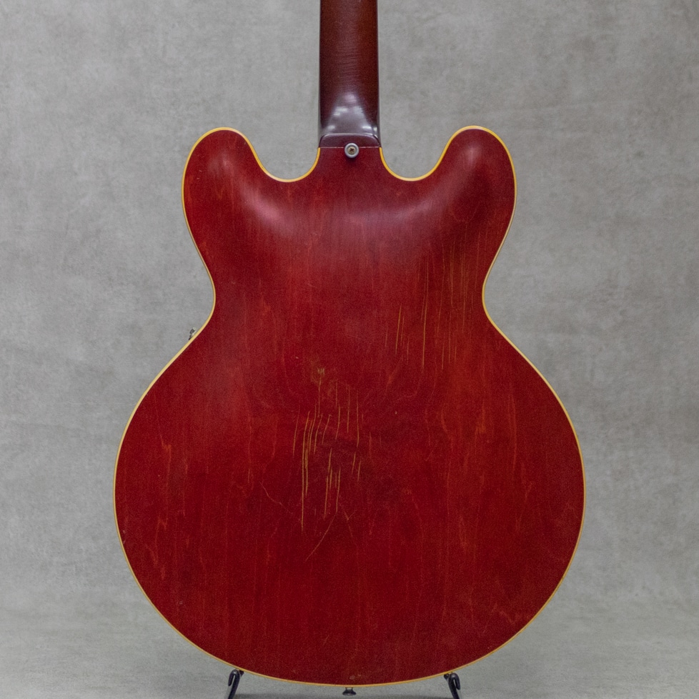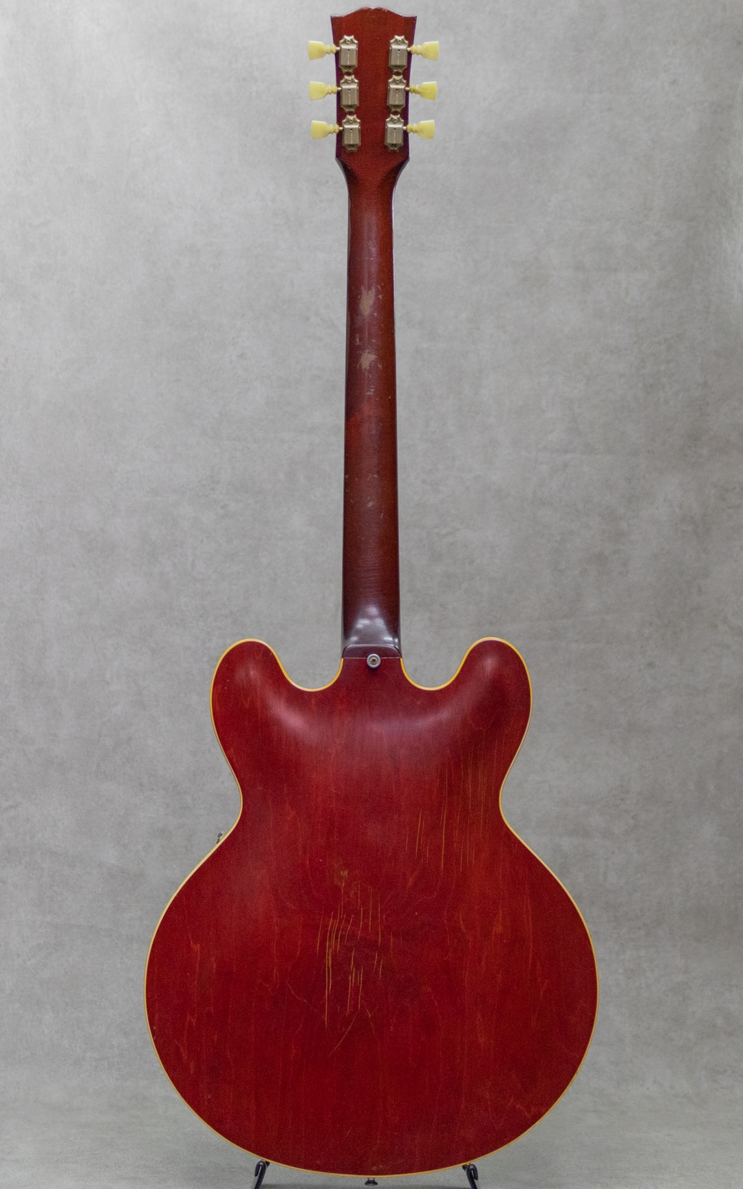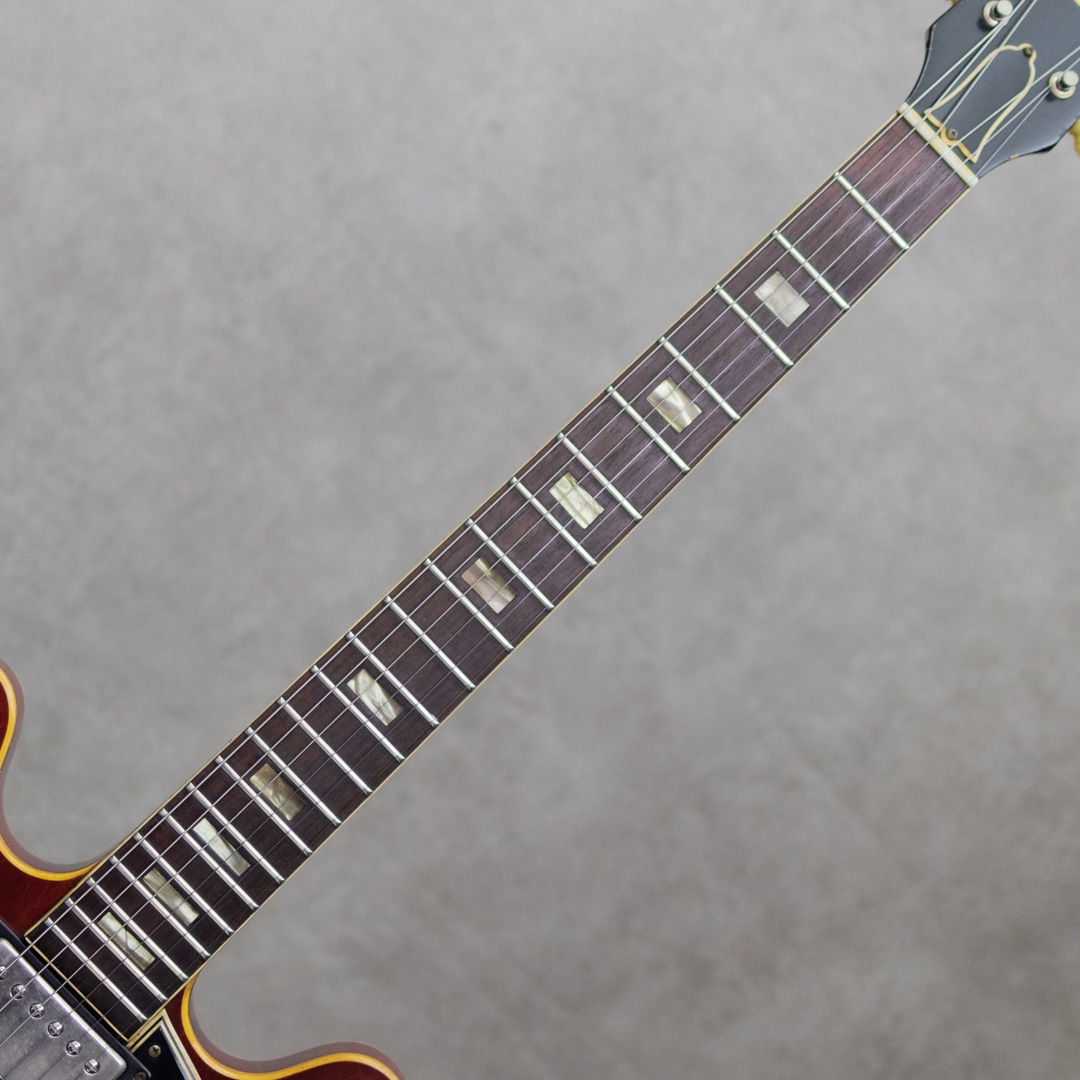 不朽の傑作、Gibson “ES-335TD”。ホロウ構造のシンボディにセンターブロックを合わせたセミアコースティックギターとして、1958年に発売されてよりセミアコモデルの代名詞として数多くのミュージシャンによりそのサウンドが残される銘器中の銘器です。本器は、1962年頃に製造された1本、”ES-335TDC”。ドット指板インレイからブロック指板インレイに移行した最初期の1本。ラミネイトメイプルを用いたホロウボディに合わせるメイプルセンターブロック、セルロイドバインディングを持つマホガニーネックにハカランダ指板、スモールブロック指板インレイ、Gibsonロゴ&クラウンヘッドインレイ、オリジナル"2コブ"シングルラインクルーソンデラックスペグ。細身ながら握り心地のあるネックシェイプで、細すぎず弾き心地良い本器。ピックアップは、オリジナルのステッカードナンバードの”PU-490”ハムバッキングPUx2が搭載されています(フロントPUのステッカーは剥がれてしまっていますが、交換跡は見られずリアとも同質です)。S/Nレンジは1962年?1964年頃、POTデイト1962年製のオリジナルCRL製POTx4。ブラックビューティコンデンサー、ベベルドプライのショートピックガード、エスカッション、リフレクターノブなどのパーツはオリジナルをストック。ブリッジとストップテールピースはリプレイスメントパーツが搭載されています。過去にビグスビーを搭載していた跡が確認できますが、現在は丁寧にネジ穴の補修がされています。テイルピースのスタッドはオリジナルのもので、スタッドを隠すプレートの跡は見られません。とても倍音豊かでファットなグッドサウンドの本器。素直でスムースなレスポンス、しっかりと粘りながら喰いつくサスティン。335独特のミドルレンジの抑えられたトーンでその色気を体感できる1本です。ネック裏の塗装剥がれは少し見られますが、オーバースプレイなどはなく、経年による貫禄のウェザーチェックがたまらない本器。ブルース、ロック、ジャズ、、数多くの音楽に囲まれて経年して来たオリジナル335。是非その歴史を共にしてください。その他詳細はお気軽にお問い合わせください。オリジナルブラックハードケース付属