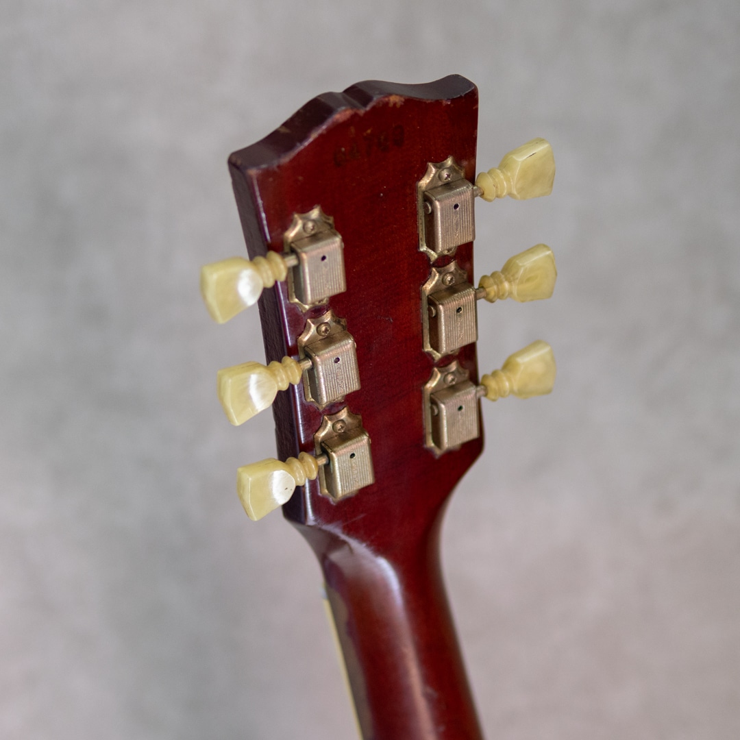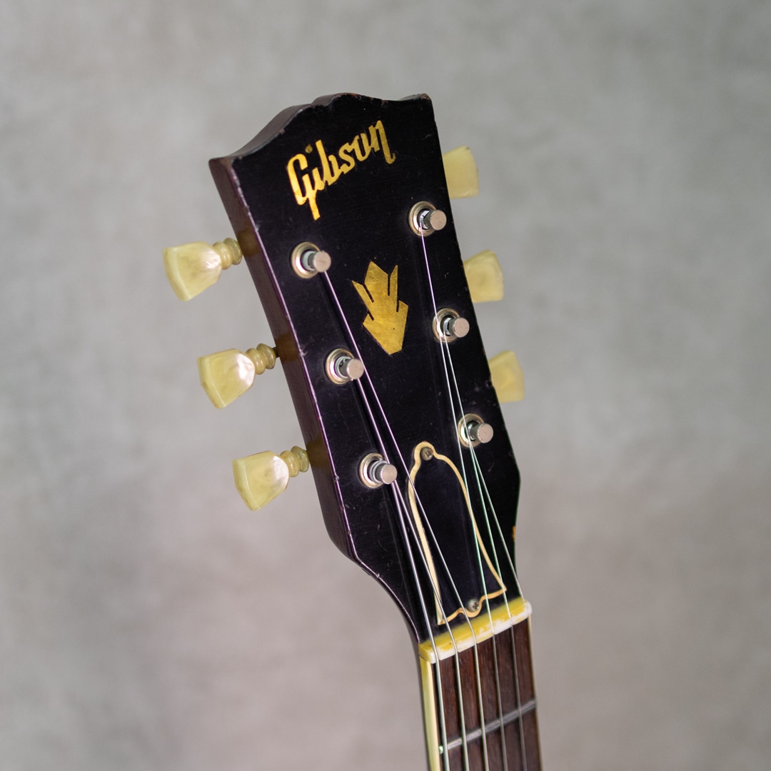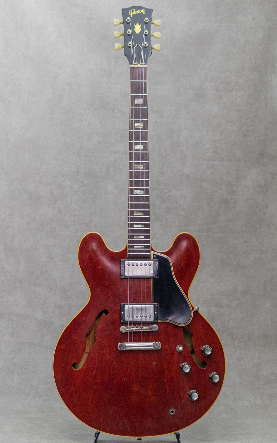 不朽の傑作、Gibson “ES-335TD”。ホロウ構造のシンボディにセンターブロックを合わせたセミアコースティックギターとして、1958年に発売されてよりセミアコモデルの代名詞として数多くのミュージシャンによりそのサウンドが残される銘器中の銘器です。本器は、1962年頃に製造された1本、”ES-335TDC”。ドット指板インレイからブロック指板インレイに移行した最初期の1本。ラミネイトメイプルを用いたホロウボディに合わせるメイプルセンターブロック、セルロイドバインディングを持つマホガニーネックにハカランダ指板、スモールブロック指板インレイ、Gibsonロゴ&クラウンヘッドインレイ、オリジナル"2コブ"シングルラインクルーソンデラックスペグ。細身ながら握り心地のあるネックシェイプで、細すぎず弾き心地良い本器。ピックアップは、オリジナルのステッカードナンバードの”PU-490”ハムバッキングPUx2が搭載されています(フロントPUのステッカーは剥がれてしまっていますが、交換跡は見られずリアとも同質です)。S/Nレンジは1962年?1964年頃、POTデイト1962年製のオリジナルCRL製POTx4。ブラックビューティコンデンサー、ベベルドプライのショートピックガード、エスカッション、リフレクターノブなどのパーツはオリジナルをストック。ブリッジとストップテールピースはリプレイスメントパーツが搭載されています。過去にビグスビーを搭載していた跡が確認できますが、現在は丁寧にネジ穴の補修がされています。テイルピースのスタッドはオリジナルのもので、スタッドを隠すプレートの跡は見られません。とても倍音豊かでファットなグッドサウンドの本器。素直でスムースなレスポンス、しっかりと粘りながら喰いつくサスティン。335独特のミドルレンジの抑えられたトーンでその色気を体感できる1本です。ネック裏の塗装剥がれは少し見られますが、オーバースプレイなどはなく、経年による貫禄のウェザーチェックがたまらない本器。ブルース、ロック、ジャズ、、数多くの音楽に囲まれて経年して来たオリジナル335。是非その歴史を共にしてください。その他詳細はお気軽にお問い合わせください。オリジナルブラックハードケース付属