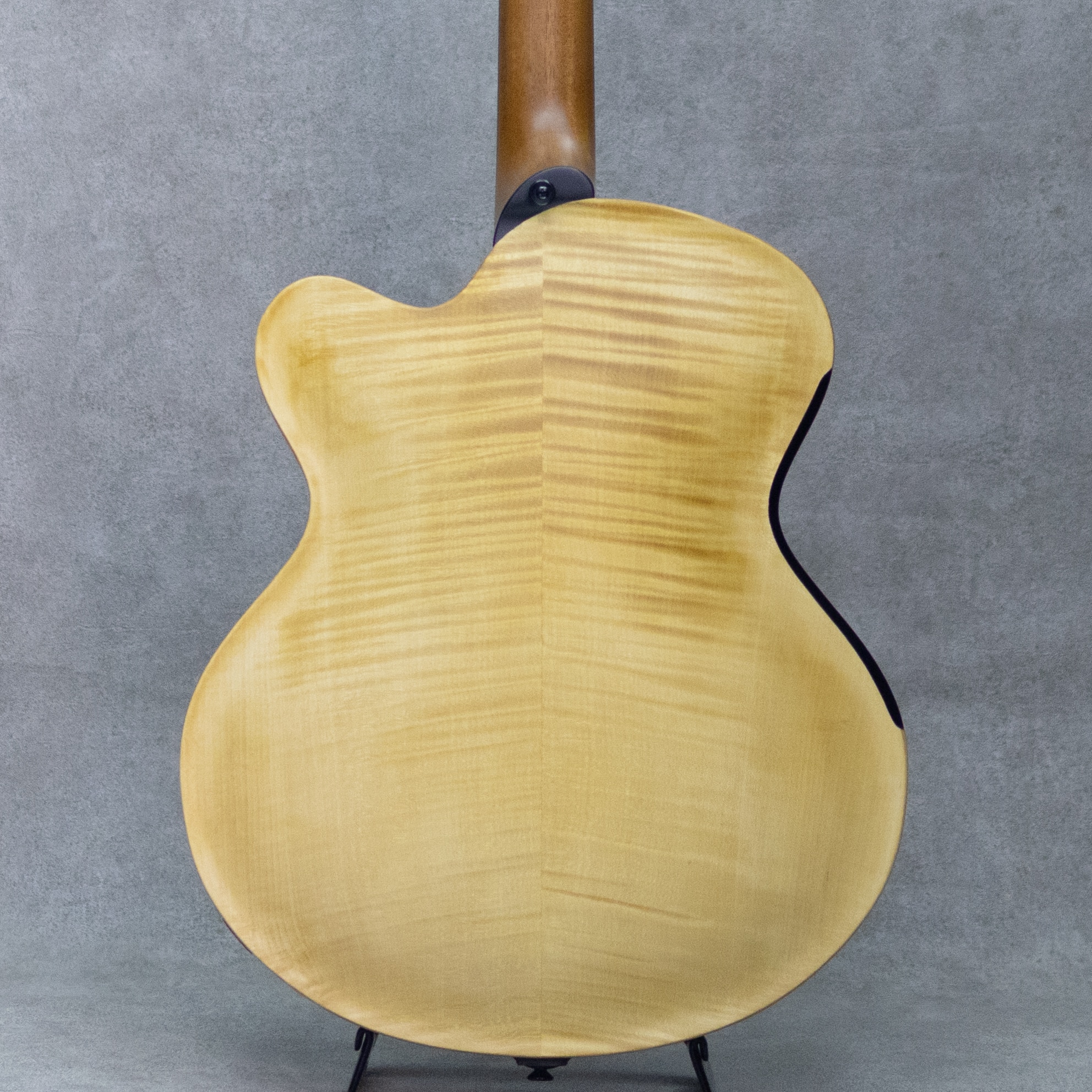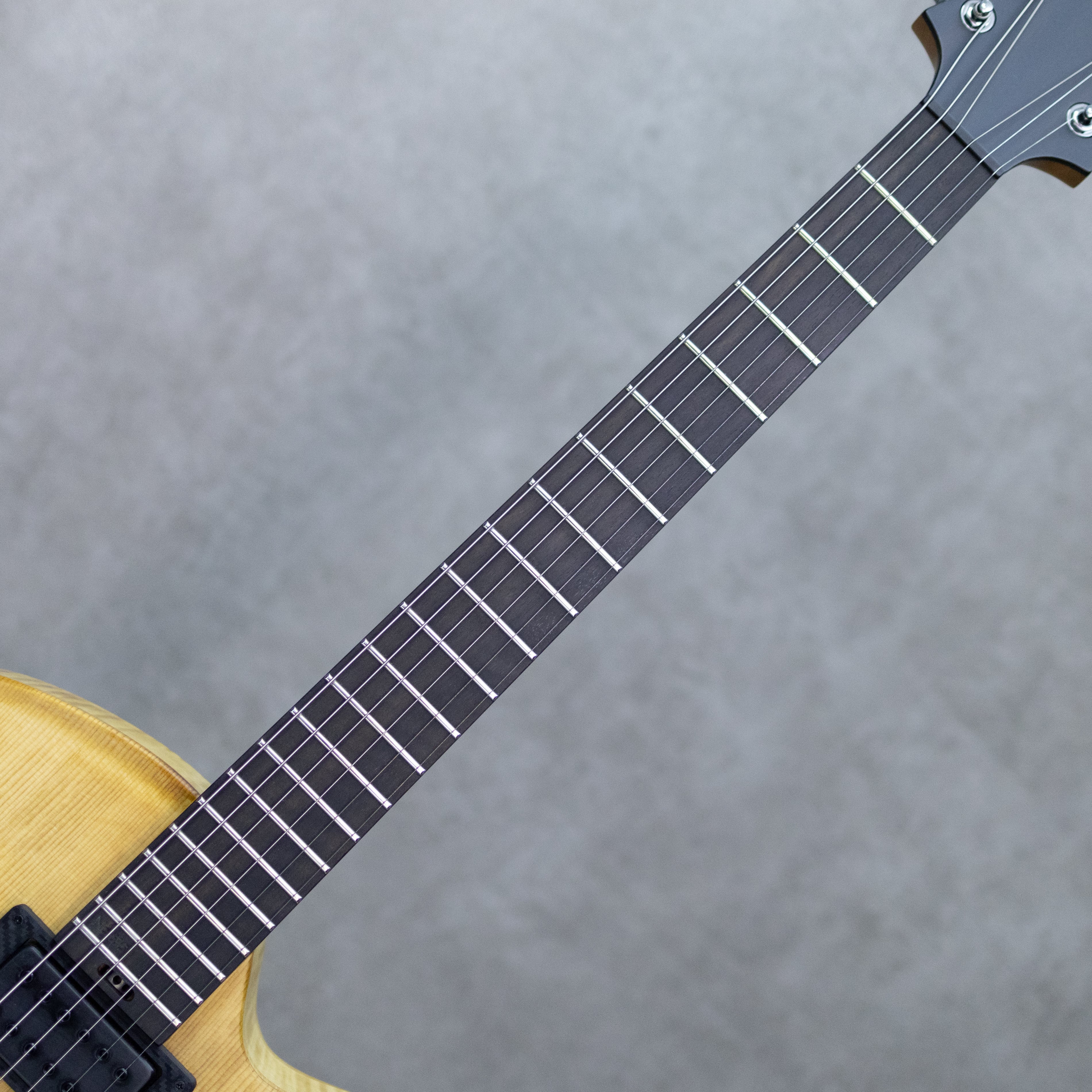 "Victor Baker(ヴィクター・ベイカー)"。自身も卓越したジャズギタリストであり、本拠地とするニューヨークにてアーチトップギター製作開始。ニューヨークの名門と呼ばれるジャズクラブを渡り歩き、名を挙げたベイカーがギター製作に着手したのは2000年。多くのギタリストに愛用されその品質は現場で証明されています。Victor Bakerで最もポピュラーといえるフルホロー15インチモデル。15インチのソリッドスプルーストップ、ソリッドメイプルサイド&バック。マホガニーネック、エボニー指板といったウッドスペックを採用。当機は弊社がオーダーした1本。ナチュラルカラーにサテンフィニッシュで仕上げられており、木材を直に感じられるようなシックで上品な仕上がりとなっております。フロントにケント・アームストロングPickupを搭載、エボニーテイルピース、ブリッジのエボニーベースにはトーンプロス社製のチューOマチック・ブリッジを搭載。塗装面は非常に薄くサテン調に仕上げられており、ギターの重量は2,38kgと、驚くほど軽量でかつ心地よいフィット感を持った見事な仕上がりとなっております。非常にバランス良く各弦が鳴る出音は圧巻です。素直に抜ける一音一音の存在感は、決して嫌味な押し出し感は無く、艶やかで繊細さも持った美しい響きを聞かせてくれます。ストレスなくプレイできる持ち心地とプレイアビリティの高さも申し分無しのモデルです。Reunion BluesのGig caseが付属します。多くのプレイヤーから支持されるビクターベイカーを代表するモデル!ぜひお手元に。
