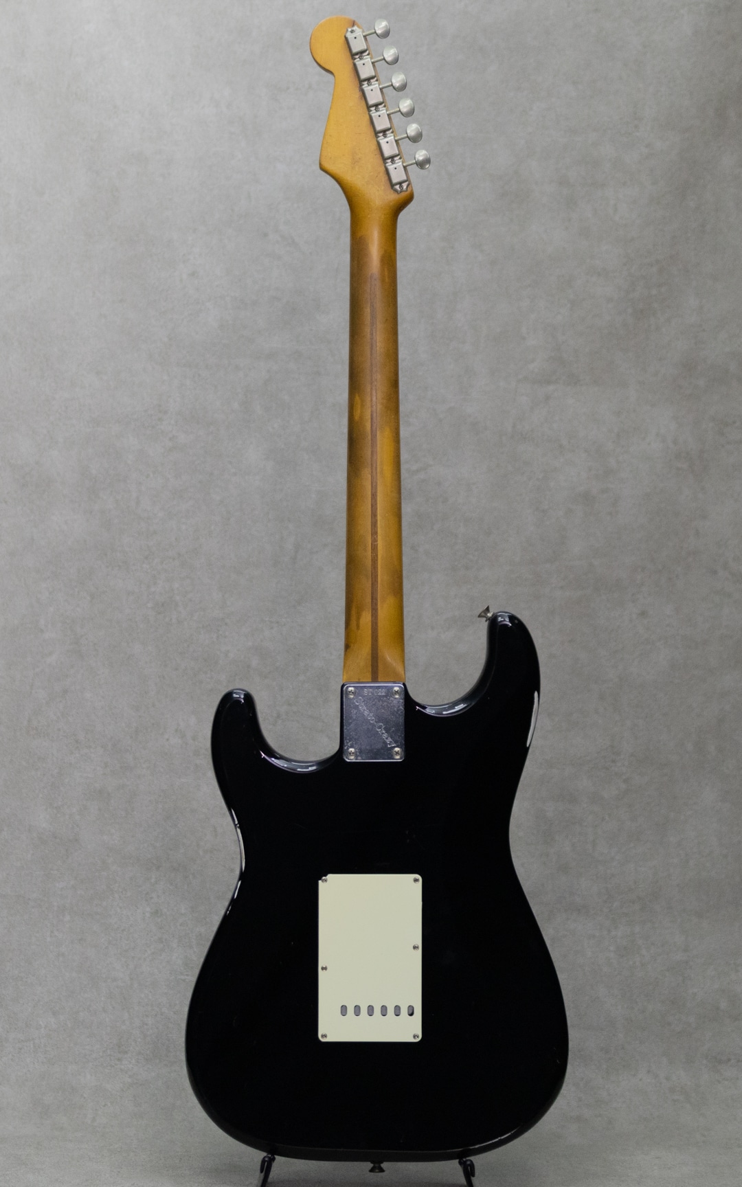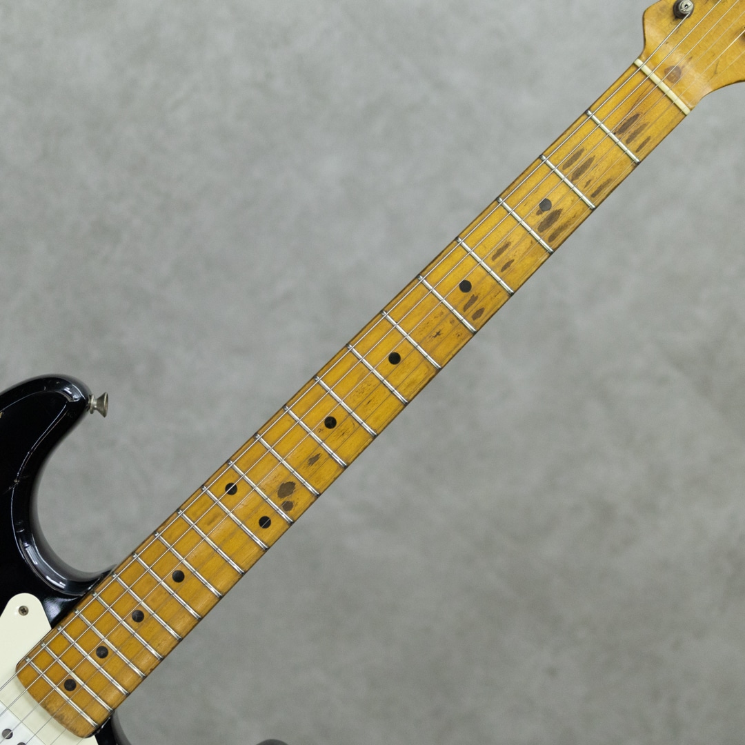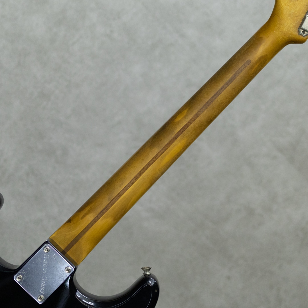 1950年代”Stratocaster”のネックをもとに組み込まれたビンテージコンポストラト。50年代のオリジナルメイプルワンピースネックを惜しげもなく使用しており、ブラッキーを思わせる仕様にて仕上げられた1本。ボディにはアルダーと思われるコンポーネントパーツを使用しており、ホワイトシーラーがところどころに顔を覗かせる雰囲気グッドなブラックカラー仕上げ。そして、アセンブリーにFender +25db アクティブミッドブーストサーキットとTBXトーン回路を搭載したリアルブラッキー仕様になっています。ピックアップには80年代のセイモアダンカン製と見られるシングルコイルPUをフロント&リアに、もう少し近年のセイモアダンカン製と思われるシングルコイルPUをミドルに搭載。いずれもビンテージタイプのモデルです。セレクターは5wayです。ブライトでグラッシーなトーン。そして、それに付随する倍音感は、近年モデルとは趣向の違う、まさにビンテージミックスなサウンド。タッチによるトーンの変化もしっかりと味わえ、様々なサウンドを楽しんでいただけます。オリジナルネックハ古い時期に全体的にリフィニッシュがされており、リデカール・リフレットが見られます。また、ヘッド部にヒビ割れの補修痕が見られますが、丁寧に補修されており現在は懸念を覚えません。ネックコンディションも良くハイフレットまで詰まりなくしっかりと演奏いただけます。見た目の雰囲気も良く、おもしろいコンセプトでまとめ上げられた本器。憧れのサウンドをワンランク上で楽しめる魅力的なビンテージコンポストラトです。プラスチックモールドハードケース付属。その他修理履歴など詳細はお気軽にお問い合わせください。
