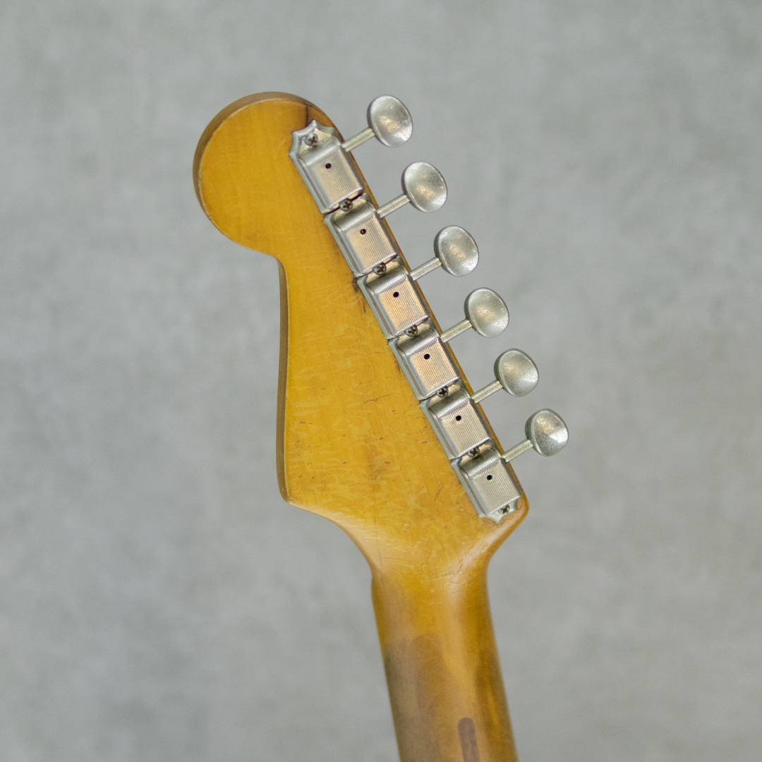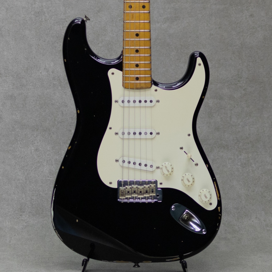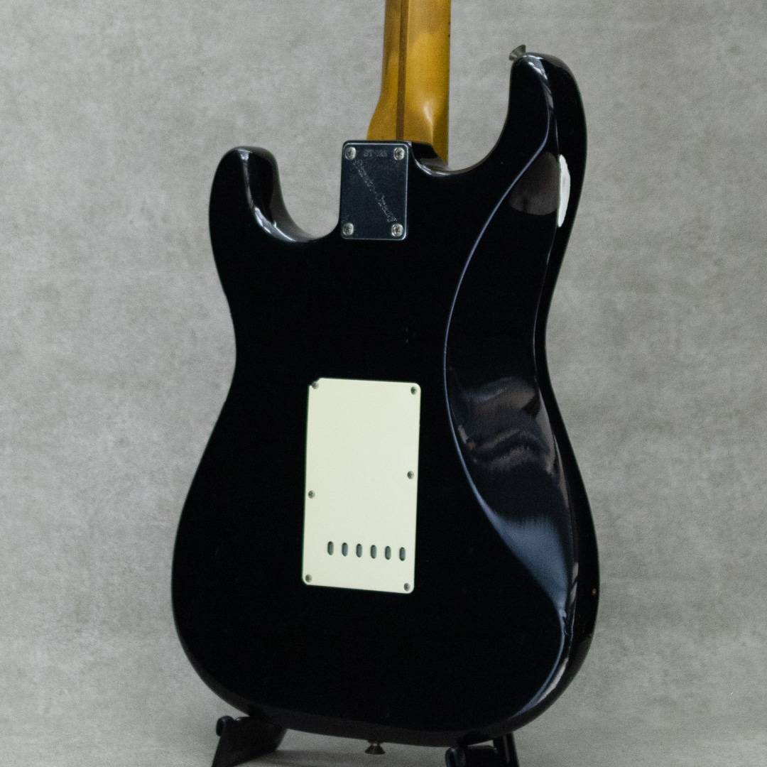 1950年代”Stratocaster”のネックをもとに組み込まれたビンテージコンポストラト。50年代のオリジナルメイプルワンピースネックを惜しげもなく使用しており、ブラッキーを思わせる仕様にて仕上げられた1本。ボディにはアルダーと思われるコンポーネントパーツを使用しており、ホワイトシーラーがところどころに顔を覗かせる雰囲気グッドなブラックカラー仕上げ。そして、アセンブリーにFender +25db アクティブミッドブーストサーキットとTBXトーン回路を搭載したリアルブラッキー仕様になっています。ピックアップには80年代のセイモアダンカン製と見られるシングルコイルPUをフロント&リアに、もう少し近年のセイモアダンカン製と思われるシングルコイルPUをミドルに搭載。いずれもビンテージタイプのモデルです。セレクターは5wayです。ブライトでグラッシーなトーン。そして、それに付随する倍音感は、近年モデルとは趣向の違う、まさにビンテージミックスなサウンド。タッチによるトーンの変化もしっかりと味わえ、様々なサウンドを楽しんでいただけます。オリジナルネックハ古い時期に全体的にリフィニッシュがされており、リデカール・リフレットが見られます。また、ヘッド部にヒビ割れの補修痕が見られますが、丁寧に補修されており現在は懸念を覚えません。ネックコンディションも良くハイフレットまで詰まりなくしっかりと演奏いただけます。見た目の雰囲気も良く、おもしろいコンセプトでまとめ上げられた本器。憧れのサウンドをワンランク上で楽しめる魅力的なビンテージコンポストラトです。プラスチックモールドハードケース付属。その他修理履歴など詳細はお気軽にお問い合わせください。