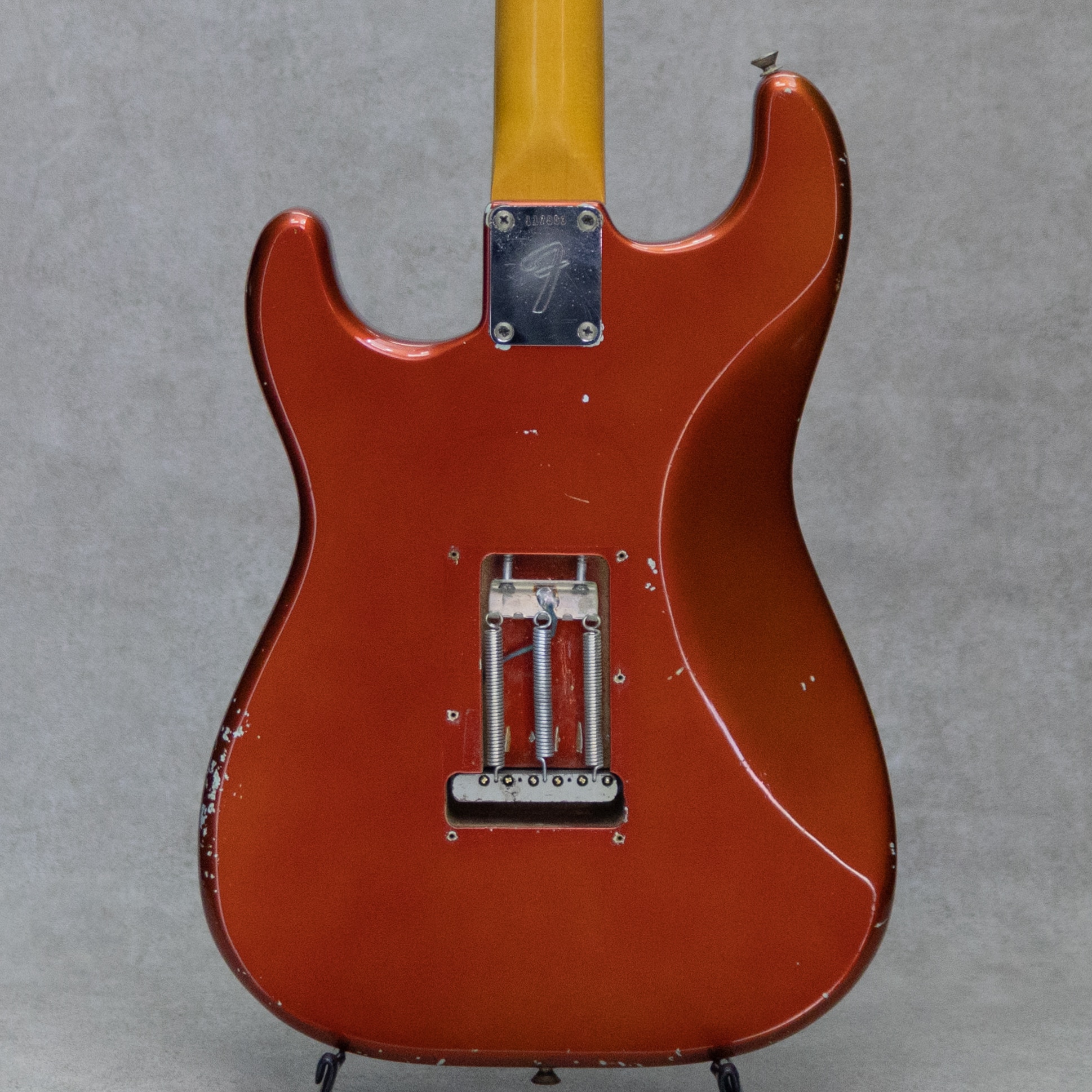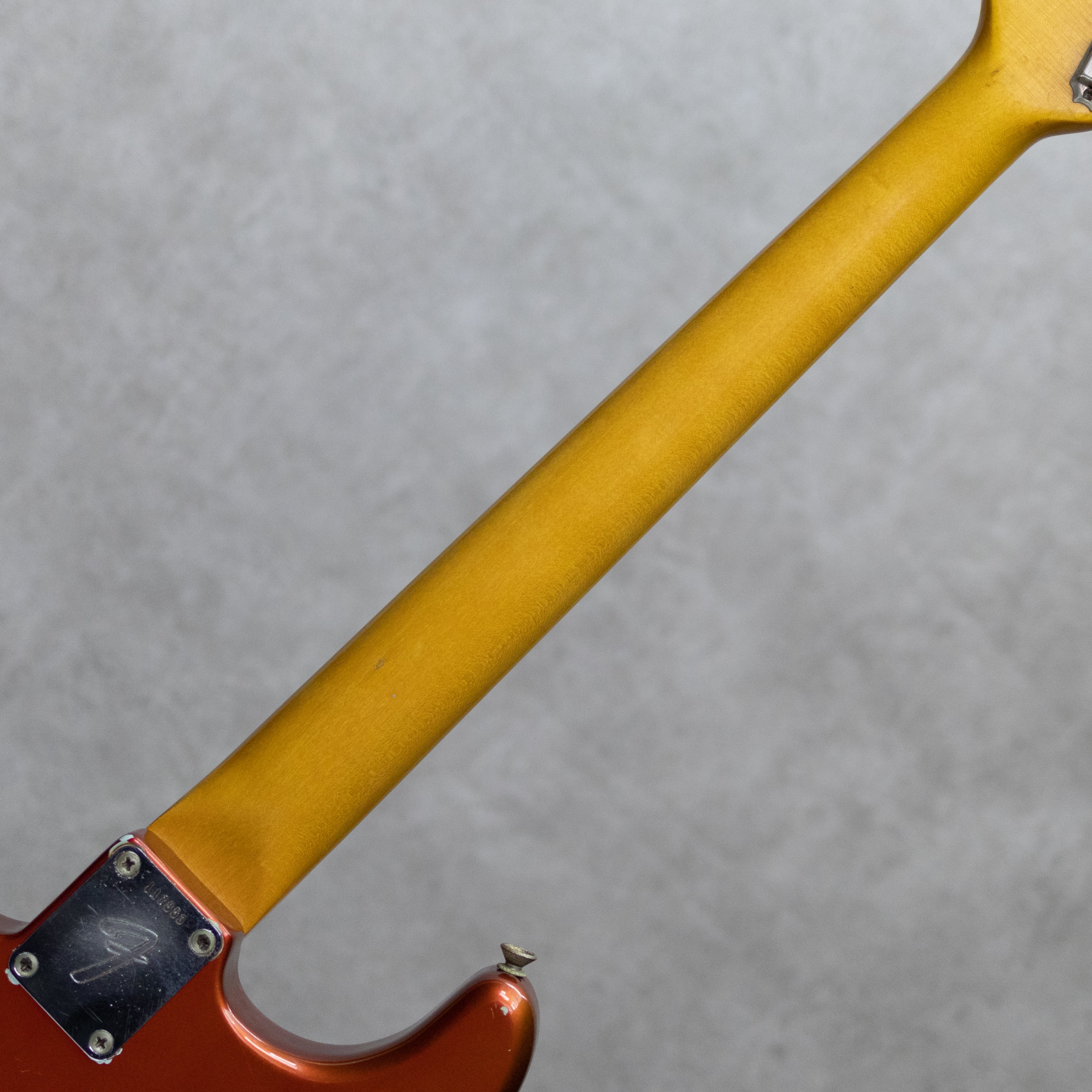 鮮やかな色味が美しいカスタムカラーの"Stratocaster"。ソニックブルーにオーバーレイされたキャンディアップルカラーの1966年製Vintage品。アルダー2pcsボディ、ラウンド貼りローズ指板、クオーターソン目取のラージヘッドメイプルネック、トランジションロゴ。ピックアップはグレイボビン期のブラックファイバーPUx3で、年代マッチングのPOT、3wayPUセレクター、セラミックディスクコンデンサー搭載。Volumeノブ交換や一部のサドルスプリングとストリングハイト調整イモネジ、トレモロスプリングスクリューなど若干のパーツ交換は見られますが、概ねキレイに残された本器。オリジナルフレットは65%?70%残りと少し低めですが、ネックコンディションもとても良好で音つまりなどもなくプレイいただけます。サウンドの方もしっかりと弾かれており、くたびれ感のない元気な立ち上がりがとても気持ち良い本器。グレイボビン期ならではの粒立ちの良さも合間って、ストラトらしい歯切れの良さと、ファットで粘りのあるサスティンを持ち合わせロックにもブルースにも聞かせてくれるグッドサウンドです。打痕から見える下地がソニックブルーカラーとなっており、独特の色味のオーバーレイカラー。珍しい重ね塗りですが、リフィニッシュやファクトリーリフの可能性も極めて少なく、出荷段階でのレイヤードカラーと判断できます。通常のキャンディアップルレッドに比べカラーコートが薄く、下地のソニックブルーカラーが透けて見え、経年での褪色で赤みが少ない部分はゴールドのようなオレンジのような色味を魅せるとても色気のあるカラーが大変魅力的です。1弦側ホーン部にストラップピンを増設していた穴が残っています。なかなか良いコンディションで保たれた珍しいカスタムカラーの本器。是非お見逃しなくチェックください。その他修理履歴や詳細もお気軽にお問い合わせください。オリジナルブラックトーレックスハードケース(ロゴ欠損)、トレモロアーム付属