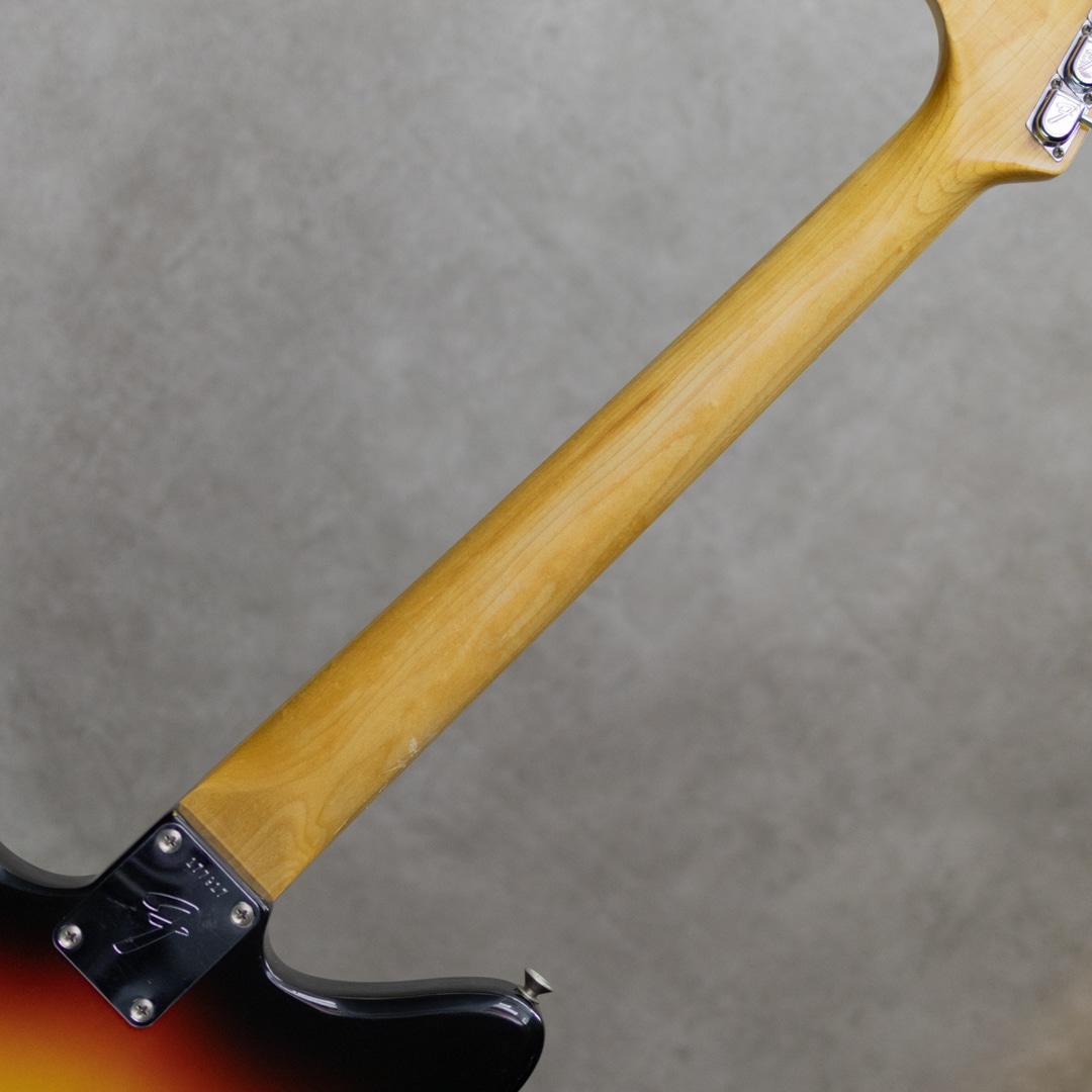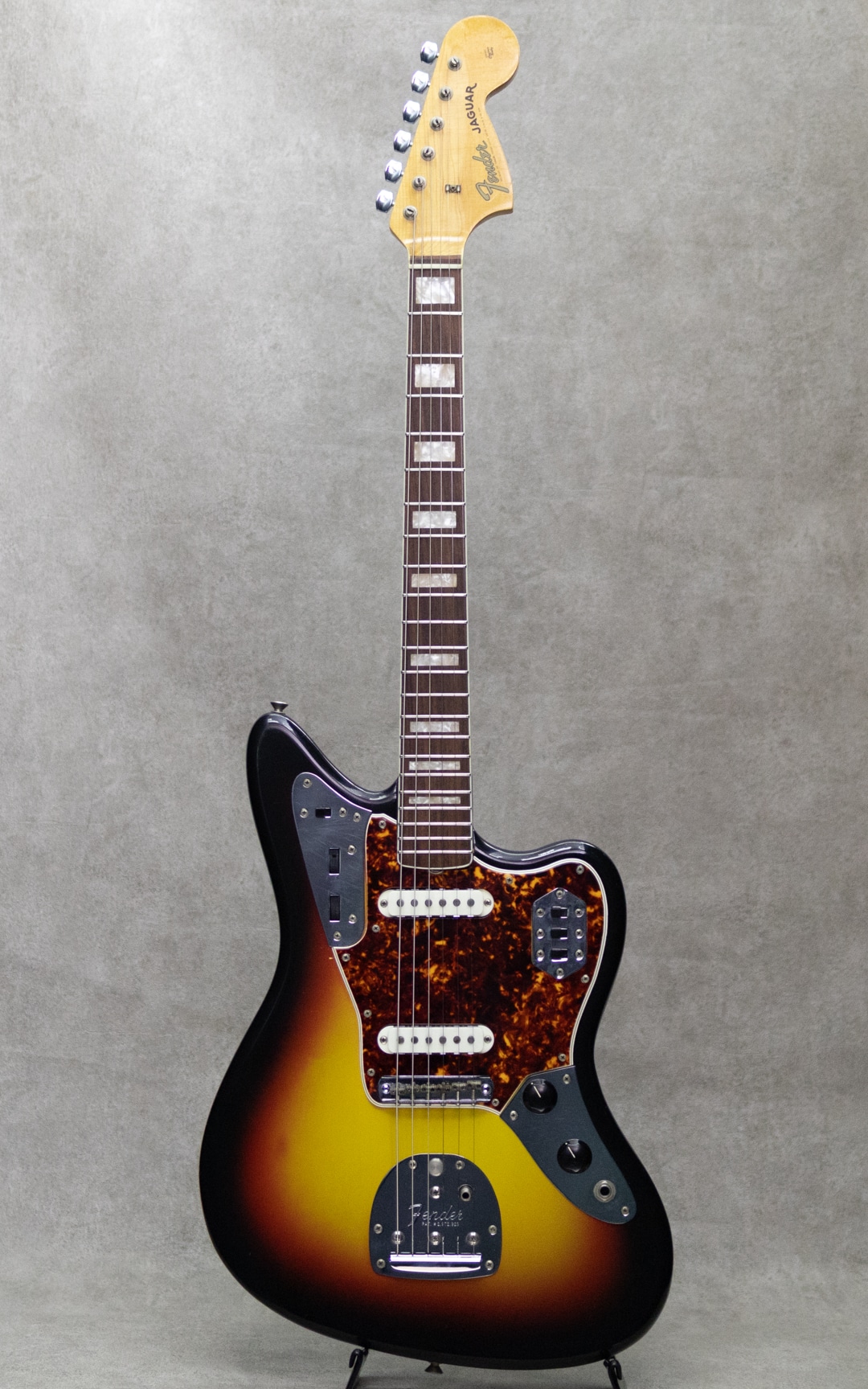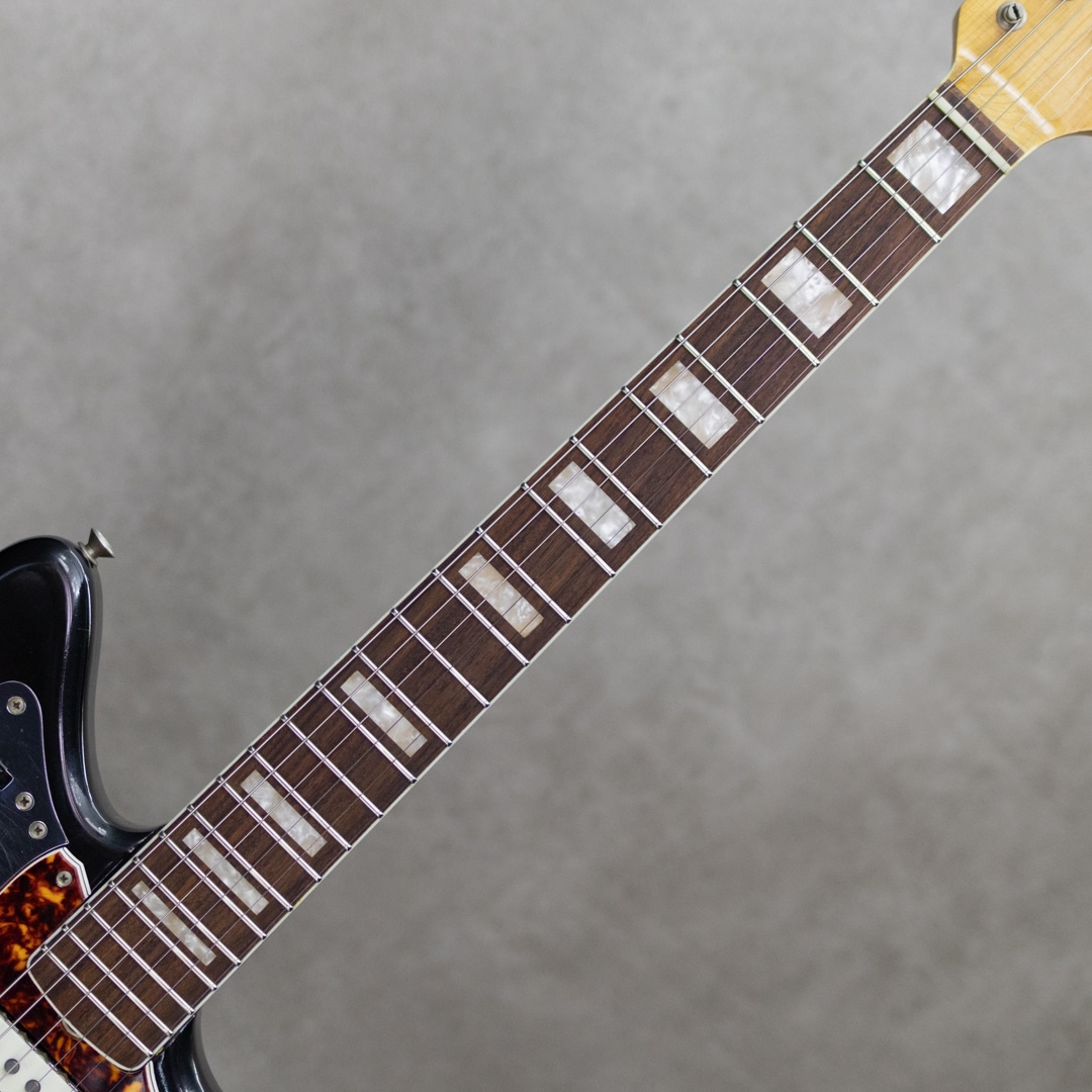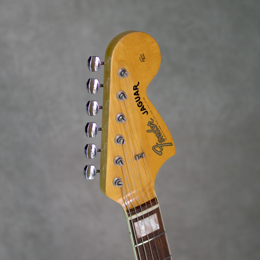1962年登場の"Jaguar"は、先行して1958年に発売が開始されていた"Jazzmaster"の兄弟機種としても知られるフェンダー上位機種。登場すぐの1960年代前半ではサーフミュージック等において重用されたものの、その後のロックシーンではサスティーンの短さもあり人気は衰え1975年に生産を終了、その後しばらく日の目を見ない時代が続いたのの、1990年代に台頭するグランジ/オルタナティブといったインディロックシーンにおいて大きな存在感を示すこととなりました。経済的に選択肢のなかった若者にとって、当時価値が認められていなかった機種が手に取られたという事情は確かなものの、鋭くエッジの立ったサウンドとともに、商業的ミュージックシーンへのアンチテーゼたるアイコンとなった功績は、間違いなく当モデルのポテンシャルによるものでしょう。本器は1966年製”Jaguar”、王道のSunburstカラー。ブロックポジションにネックバインディングが施され、より上位機種然としたルックスを手に入れたスペック。ショートスケールながらしっかりとした弦テンションをもって安定した出力で楽しめる一本。まさにジャガーらしい"カリーン"とクリアでシャープに弾き出されるトーンは、特有の"イナタ"い余韻とともに無二の世界観を表現。かき鳴らせば一種のヴァイオレンスさも感じられるほど。ルックスの印象通り若い音の芯を残しており、良好なコンディション故の演奏性も相まってまだまだ弾きこんでいく楽しみを感じさせてくれる1本。こちら全体的に綺麗な印象のコンディションを維持。ボディエッジなどトップコートの剥がれが見られる部分もありますが、顕著に外観を損ねるダメージはなく各所樹脂パーツの焼けなども見られません。ナット・フレットは交換済みでクリーンな演奏性を確保。ネックのコンディションも良好でハイフレットまで音詰まり等なく気持ちよくお楽しみいただけます。その他電装系、ピックアップ、コンデンサ、ポット、スイッチ類等は全てオリジナルをキープ。ぜひお確かめください。オリジナルハードケース他、ブリッジカバー、取り外し済みのミュート機構、オリジナルアームが完備。