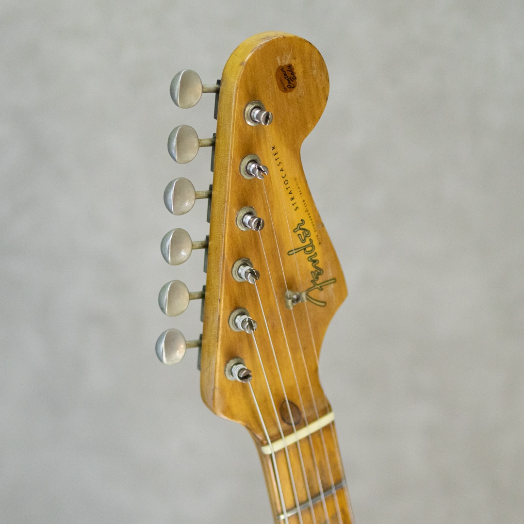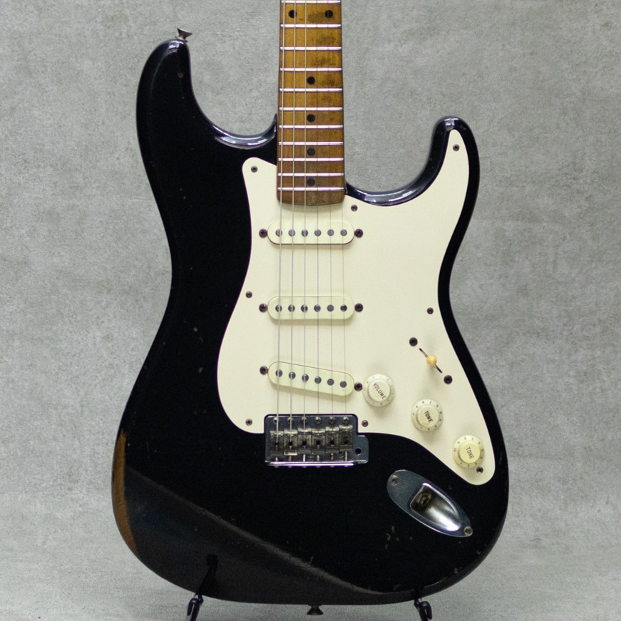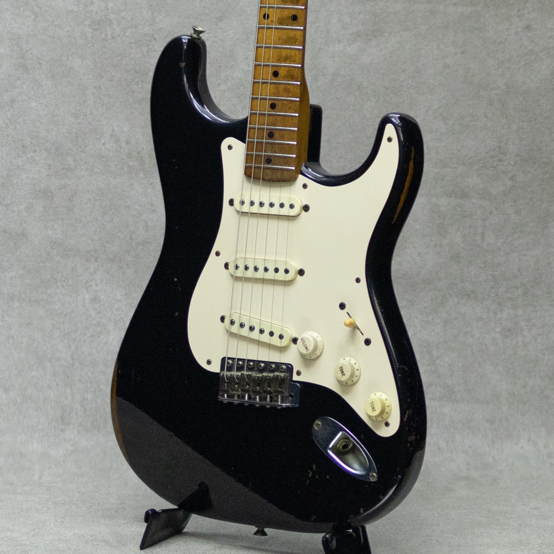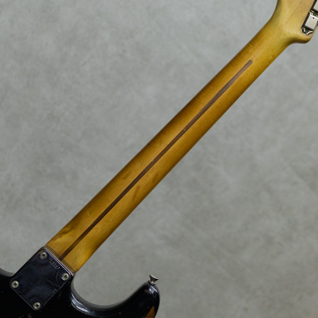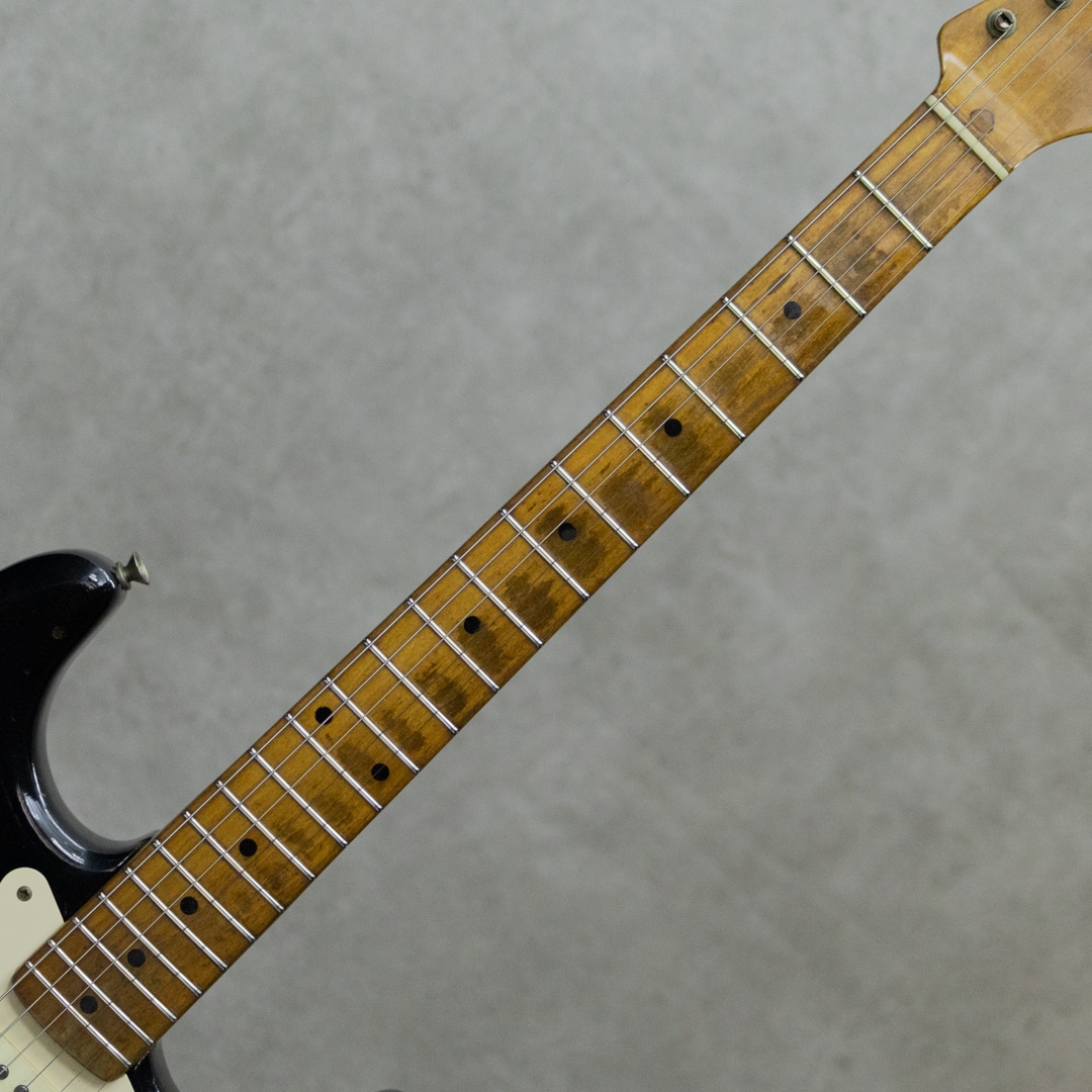 1956年製”Stratocaster”のネックと、1950年代製”Stratocaster”のボディにて組み込まれたビンテージコンポストラト。1956年製のメイプルワンピースネック。山なりはあるもののVまではいかない56ネックシェイプ。歴戦の使用が感じられる良い雰囲気で丸みのある握り具合が心地よいです。ペグは50年代後半からのパテントNo.入りクルーソンデラックスペグが搭載。リフィニッシュ・リデカールが施されており、ナロートールフレットでのリフレットがされておりフレット残りもしっかりとあり、音詰まりなどなく積極的にプレイいただけます。ボディは1950年代製。ネイルホールや形状など確かなFender製の特徴を残していますが、ボディデイトは残念ながら確認できません。かなり古い時期にブラックカラーにリフィニッシュされた様子で、現在はとても雰囲気のあるウェザーチェックがびっしりと出ており、経年と使用に伴う傷や塗装剥がれがとても良い雰囲気を出してくれています。サドルは4/5がリプロパーツ、サスティンブロックはカラハム製。ピックアップには”Lindy Fralin”の”Real '54s”x3が搭載。POTはCTSビンテージテーパー250K/Ax3、スイッチはCRL5way、コンデンサーにはフェンダーワックスペーパー0.1uFを使用し、クロスワイヤーでしっかりとビンテージの仕様を踏襲し組み込んでいます。とても甘くファットな倍音が豊かで、各ポジションでメイプルストラトならではの少しミドルの落ち着いたトーンを味わわせてくれます。くたびれた印象は受けず、かと言って近年アッセンとは思えないまとまったサウンドを放つ本器。グラッシーで抜けの良いグッドサウンドのプレイヤーズビンテージです。指板Rはオリジナルの7.25Rを残しており、ストラトプレイヤーが好むストラトサウンド&フィーリングを存分にお楽しみいただけます。しっかりとしたビンテージモデルに組み込まれたビンテージコンポストラト。是非、積極的にプレイされる方にオススメの1本です。近年Fenderのブラウントーレックスハードケースが付属します。その他詳細はお気軽にお問い合わせください。