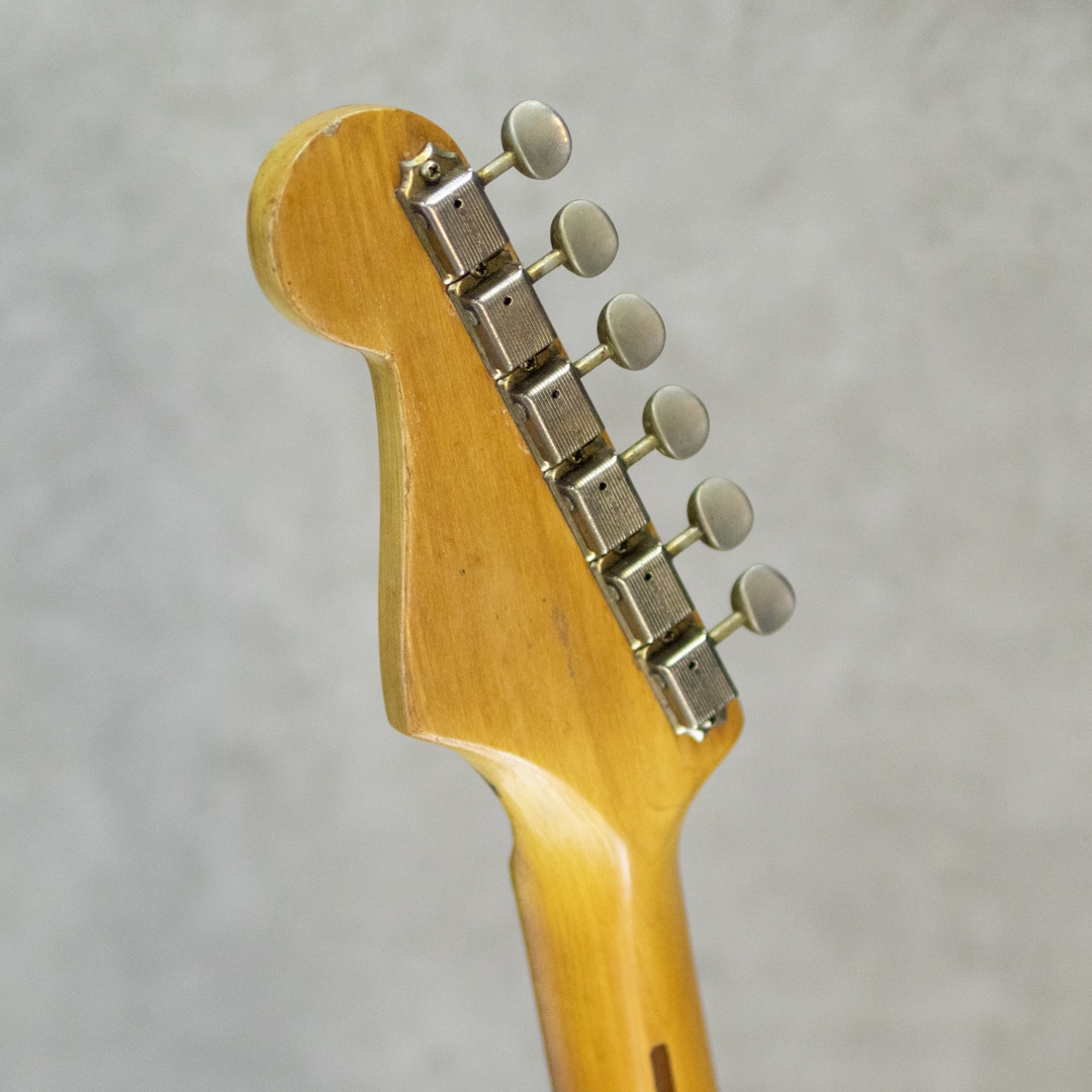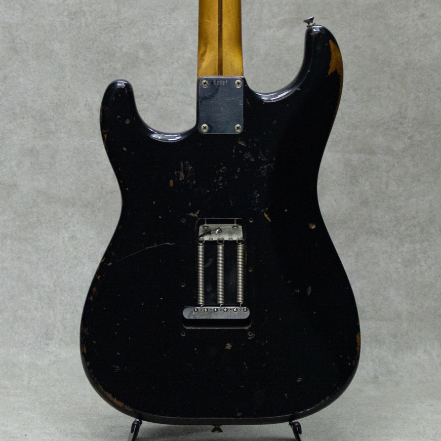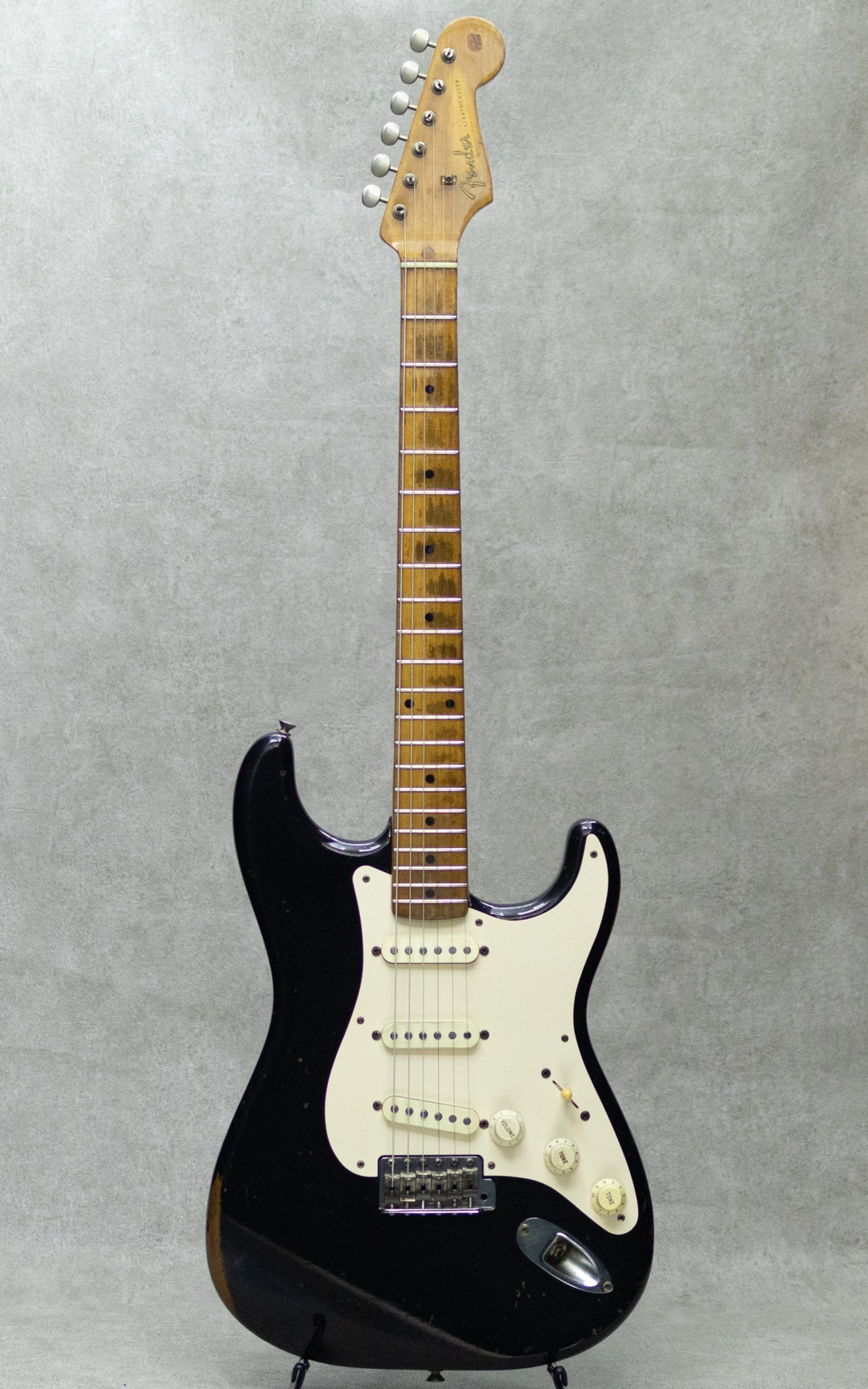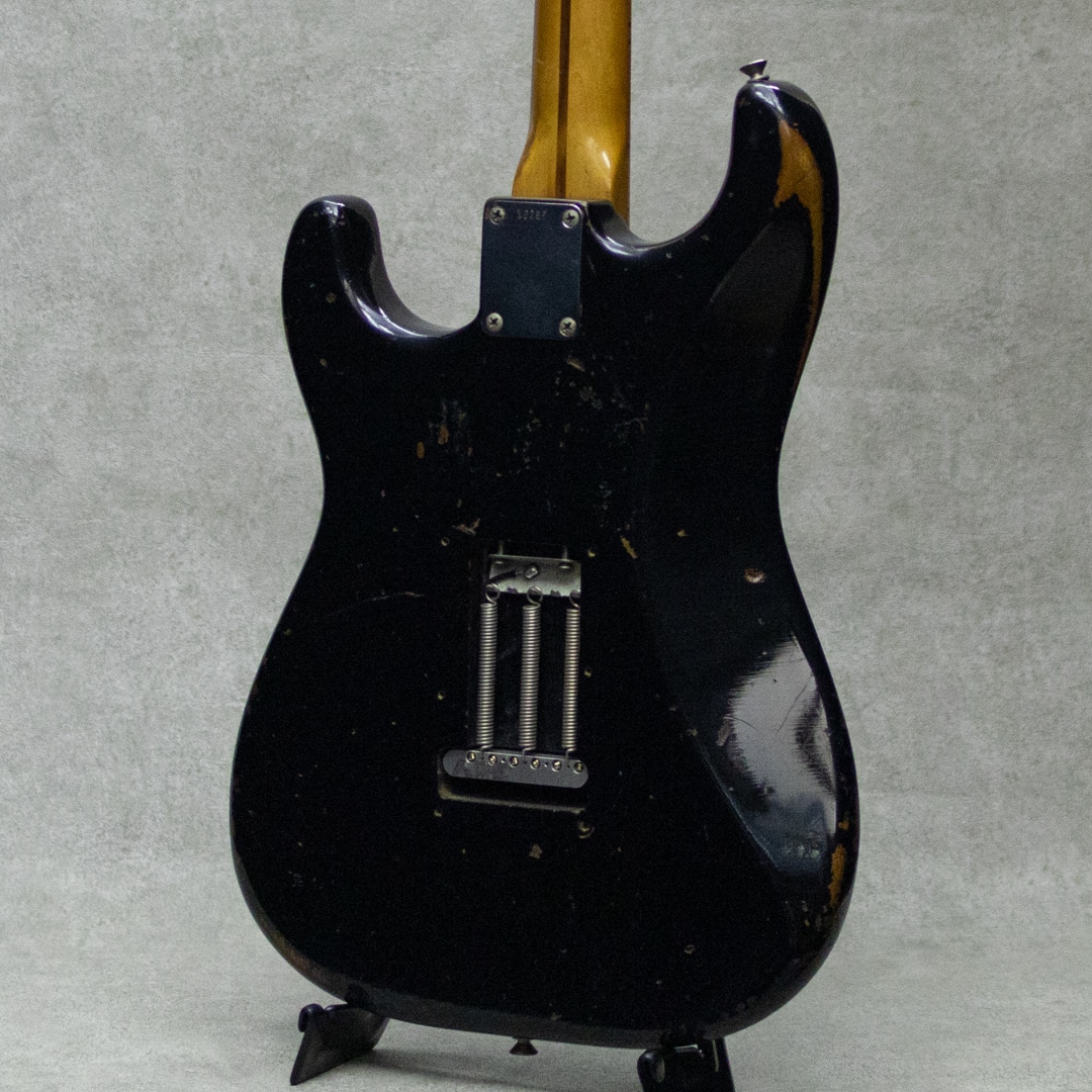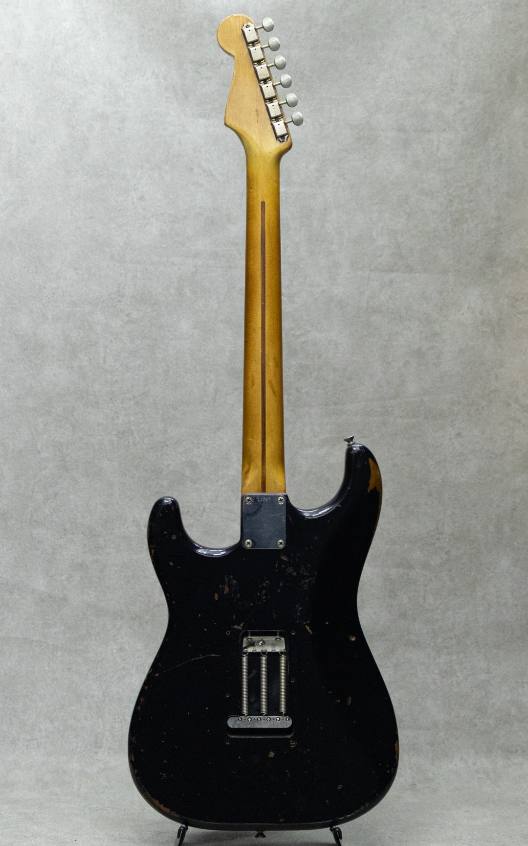 1956年製”Stratocaster”のネックと、1950年代製”Stratocaster”のボディにて組み込まれたビンテージコンポストラト。1956年製のメイプルワンピースネック。山なりはあるもののVまではいかない56ネックシェイプ。歴戦の使用が感じられる良い雰囲気で丸みのある握り具合が心地よいです。ペグは50年代後半からのパテントNo.入りクルーソンデラックスペグが搭載。リフィニッシュ・リデカールが施されており、ナロートールフレットでのリフレットがされておりフレット残りもしっかりとあり、音詰まりなどなく積極的にプレイいただけます。ボディは1950年代製。ネイルホールや形状など確かなFender製の特徴を残していますが、ボディデイトは残念ながら確認できません。かなり古い時期にブラックカラーにリフィニッシュされた様子で、現在はとても雰囲気のあるウェザーチェックがびっしりと出ており、経年と使用に伴う傷や塗装剥がれがとても良い雰囲気を出してくれています。サドルは4/5がリプロパーツ、サスティンブロックはカラハム製。ピックアップには”Lindy Fralin”の”Real '54s”x3が搭載。POTはCTSビンテージテーパー250K/Ax3、スイッチはCRL5way、コンデンサーにはフェンダーワックスペーパー0.1uFを使用し、クロスワイヤーでしっかりとビンテージの仕様を踏襲し組み込んでいます。とても甘くファットな倍音が豊かで、各ポジションでメイプルストラトならではの少しミドルの落ち着いたトーンを味わわせてくれます。くたびれた印象は受けず、かと言って近年アッセンとは思えないまとまったサウンドを放つ本器。グラッシーで抜けの良いグッドサウンドのプレイヤーズビンテージです。指板Rはオリジナルの7.25Rを残しており、ストラトプレイヤーが好むストラトサウンド&フィーリングを存分にお楽しみいただけます。しっかりとしたビンテージモデルに組み込まれたビンテージコンポストラト。是非、積極的にプレイされる方にオススメの1本です。近年Fenderのブラウントーレックスハードケースが付属します。その他詳細はお気軽にお問い合わせください。