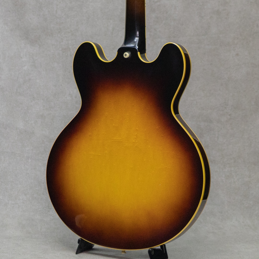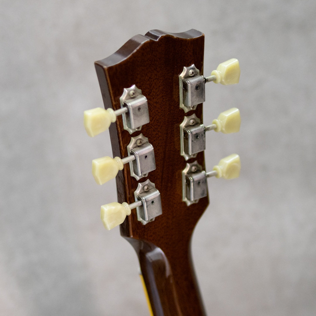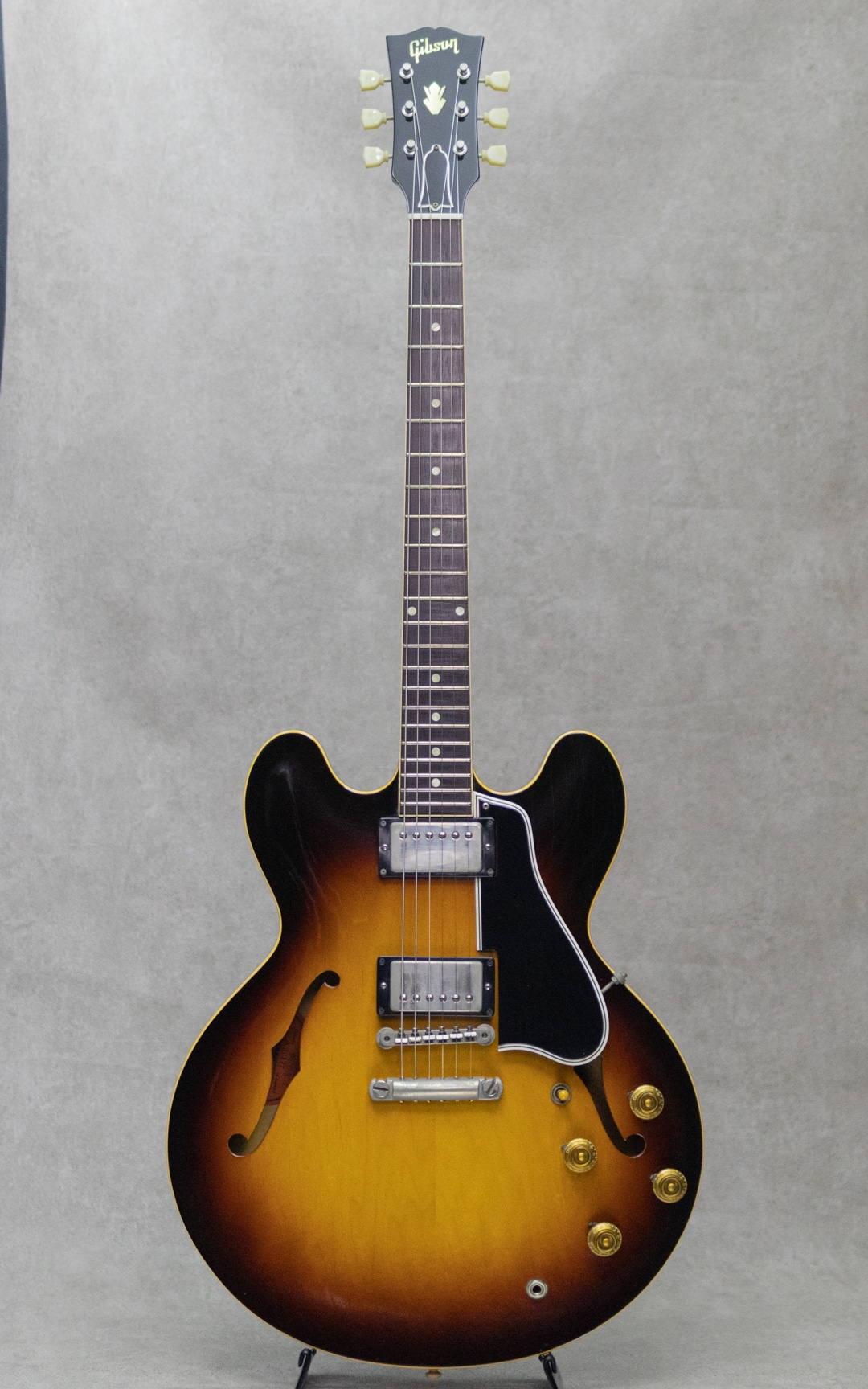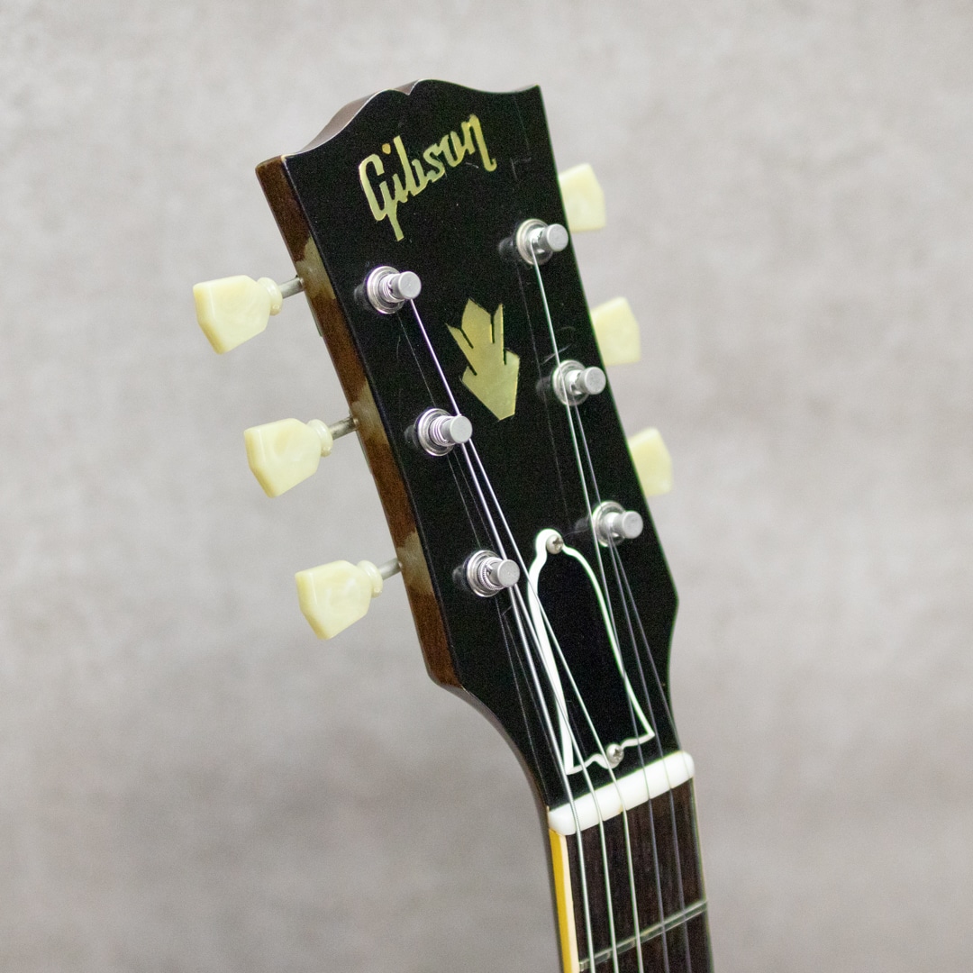 不朽の傑作、Gibson “ES-335TD”。ホロウ構造のシンボディにセンターブロックを合わせたセミアコースティックギターとして、1958年に発売されてよりセミアコモデルの代名詞として数多くのミュージシャンによりそのサウンドが残される銘器中の銘器です。本器は、1959年製の”ES-335TD”。色褪せもなく、鮮やかなサンバーストが眩い極上コンディションの1本。うっすらと浮かぶ玉目がゴージャスなラミネイトメイプルを用いたホロウボディに合わせるメイプルセンターブロック、セルロイドバインディングを持つマホガニーネックにハカランダ指板、ドット指板インレイ、Gibsonロゴ&クラウンヘッドインレイ。59年の中では少し細身となる弾きやすく手に馴染むネックシェイプの本器。ピックアップは、オリジナル”P.A.F"の”PU-490”ハムバッキングPUx2が搭載されています。ABR-1ブリッジ、アルミストップテイルピース、CRL製POT、バンブルビーコンデンサー、ベベルドプライのロングピックガード、エスカッション、ゴールドハットノブなどのパーツはオリジナルをストックと、パーフェクトなコンディションです。オリジナルシングルラインクルーソンデラックスペグのノブがシュリンクしているため、現在はリプレイスメントパーツを装着していますが、ケース内にオリジナルペグも残されています。ビンテージとは思えない元気でフレッシュなサウンド。色気や艶っぽさもみられますが、その元気なサウンドはコンディションのそれと同等で、如何にキレイに保管されていたかが伺えます。また、ピックアップもとても出力が安定しており、しっかりと野太いサウンドをお楽しみいただけます。フレット残りもしっかりとあり、ネックコンディションもとても良好。ハイフレットまで音詰まりもなくスムースにプレイいただけます。極々僅かな小傷のみで、ウェザーチェッキングも最小限。まさにビンテージミント。この光沢と鮮やかな色味は、一見の価値ありです。新品のような鮮やかな色味を魅せてくれる59の335。コンディション・サウンド、そしてスペック。全てにおいてマスターピースの1本です。本体同様にグッドコンディションのオリジナルブラウンハードケースが付属します。