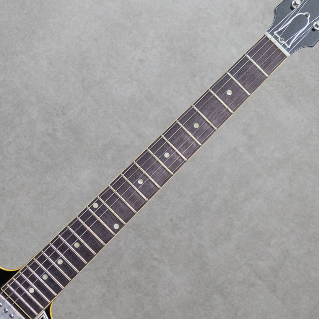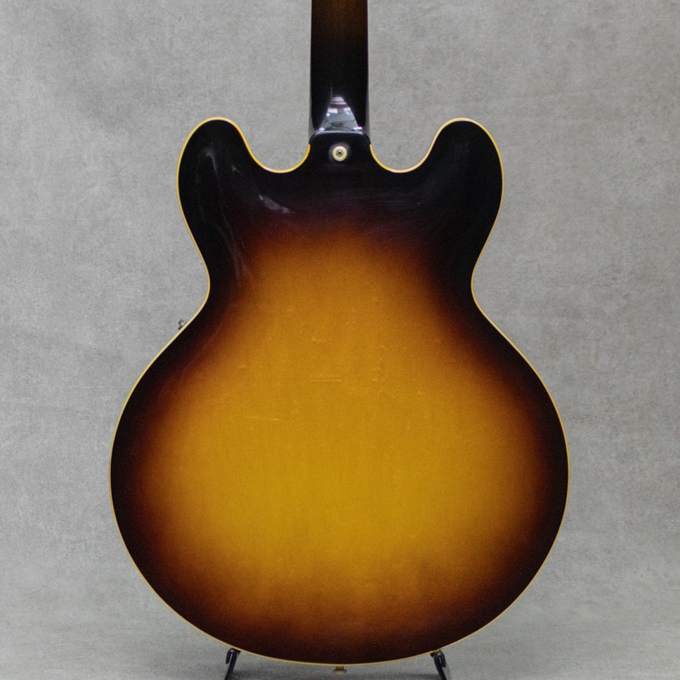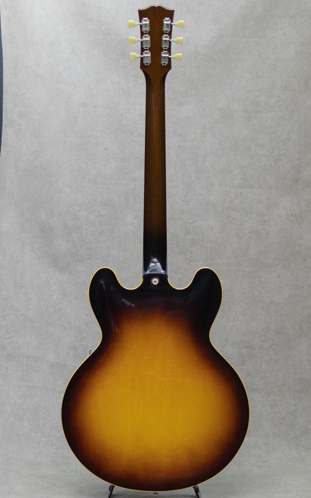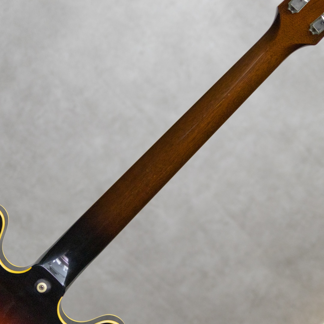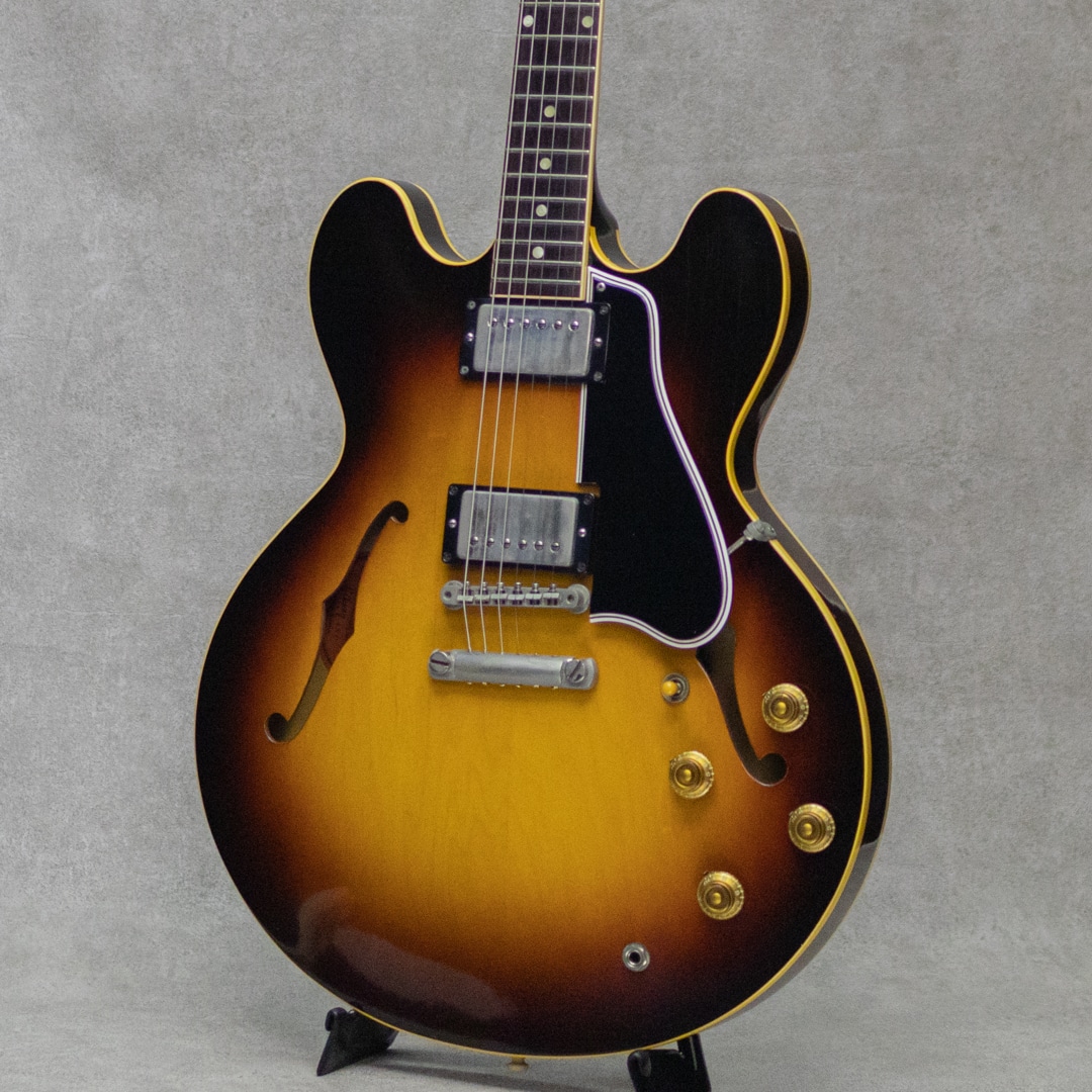 不朽の傑作、Gibson “ES-335TD”。ホロウ構造のシンボディにセンターブロックを合わせたセミアコースティックギターとして、1958年に発売されてよりセミアコモデルの代名詞として数多くのミュージシャンによりそのサウンドが残される銘器中の銘器です。本器は、1959年製の”ES-335TD”。色褪せもなく、鮮やかなサンバーストが眩い極上コンディションの1本。うっすらと浮かぶ玉目がゴージャスなラミネイトメイプルを用いたホロウボディに合わせるメイプルセンターブロック、セルロイドバインディングを持つマホガニーネックにハカランダ指板、ドット指板インレイ、Gibsonロゴ&クラウンヘッドインレイ。59年の中では少し細身となる弾きやすく手に馴染むネックシェイプの本器。ピックアップは、オリジナル”P.A.F"の”PU-490”ハムバッキングPUx2が搭載されています。ABR-1ブリッジ、アルミストップテイルピース、CRL製POT、バンブルビーコンデンサー、ベベルドプライのロングピックガード、エスカッション、ゴールドハットノブなどのパーツはオリジナルをストックと、パーフェクトなコンディションです。オリジナルシングルラインクルーソンデラックスペグのノブがシュリンクしているため、現在はリプレイスメントパーツを装着していますが、ケース内にオリジナルペグも残されています。ビンテージとは思えない元気でフレッシュなサウンド。色気や艶っぽさもみられますが、その元気なサウンドはコンディションのそれと同等で、如何にキレイに保管されていたかが伺えます。また、ピックアップもとても出力が安定しており、しっかりと野太いサウンドをお楽しみいただけます。フレット残りもしっかりとあり、ネックコンディションもとても良好。ハイフレットまで音詰まりもなくスムースにプレイいただけます。極々僅かな小傷のみで、ウェザーチェッキングも最小限。まさにビンテージミント。この光沢と鮮やかな色味は、一見の価値ありです。新品のような鮮やかな色味を魅せてくれる59の335。コンディション・サウンド、そしてスペック。全てにおいてマスターピースの1本です。本体同様にグッドコンディションのオリジナルブラウンハードケースが付属します。