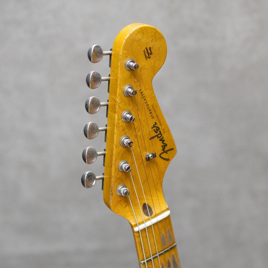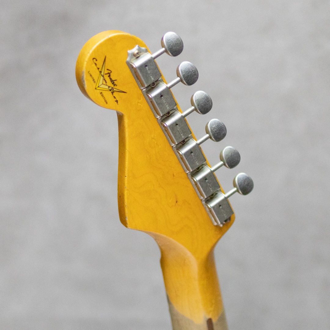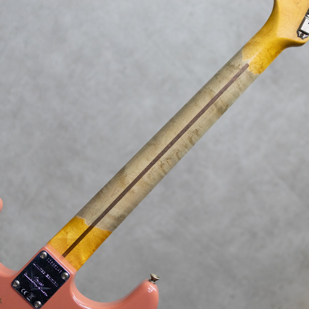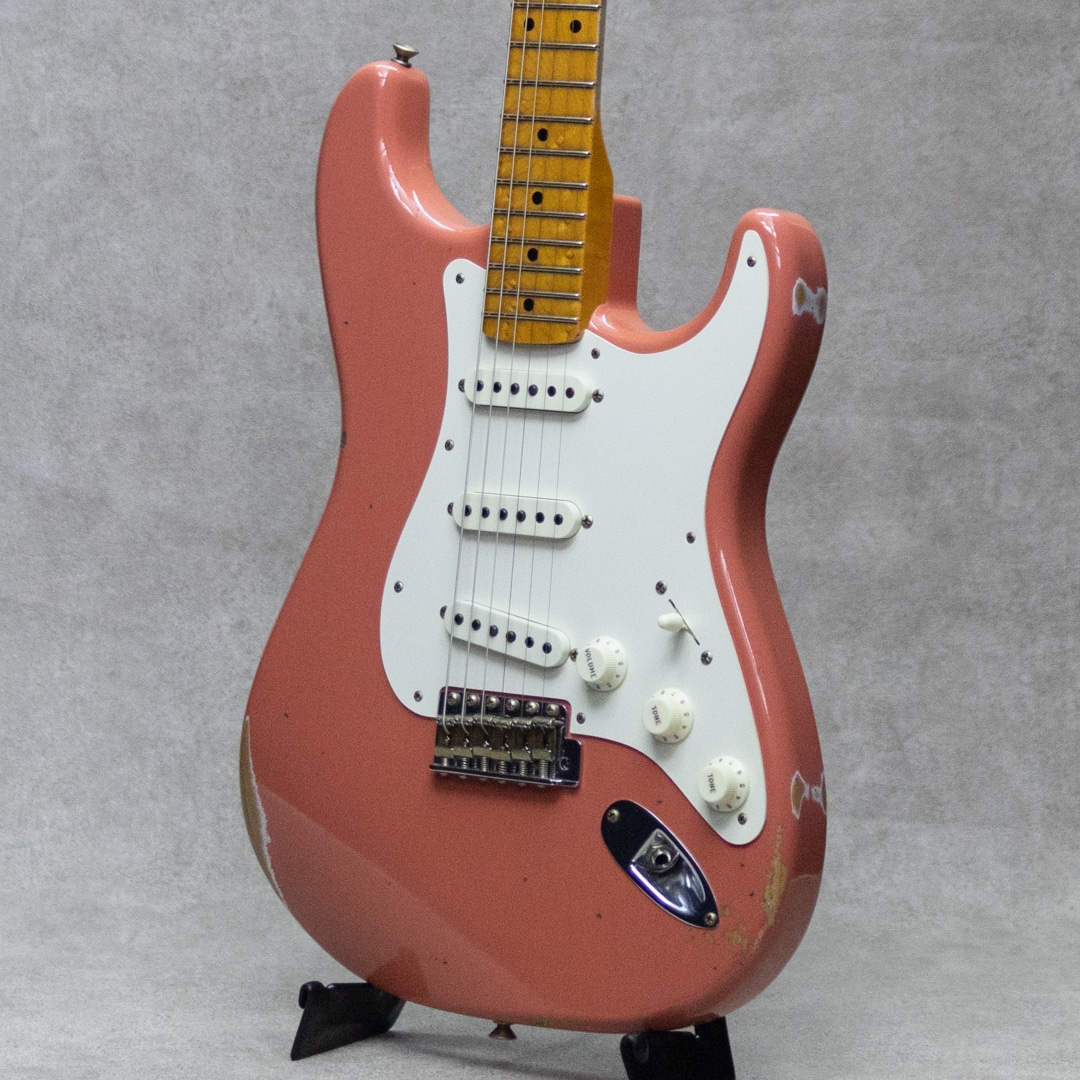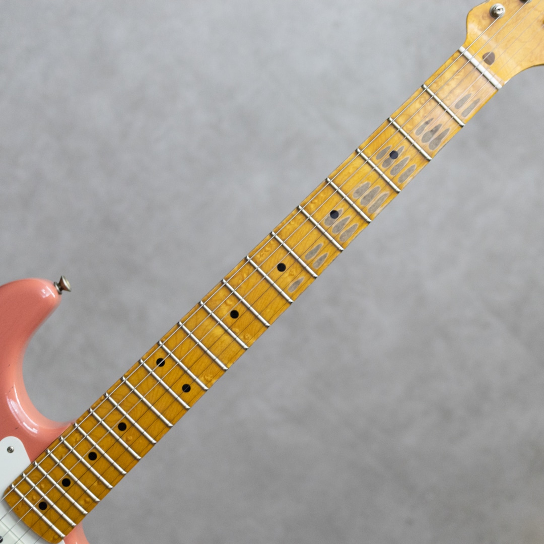 Limited Model “Tomatillo Stratocaster Relic Super Faded Aged Tahitian Coral”。トラッドなモデルにモダンな要素を取り入れた、使い勝手と使い幅の広い実用的な1本。また、マテルアルにも厳選素材を使用したワンクラス上の完成度を持ち合わせます。2023年製極上USED品。選定された2pcsアルダーボディとフラットソーンで目取られたメイプルネックを使用した1956年モデルを元にした本器。ネック材にはAAバーズアイメイプルを使用しているリミテッドモデルならではのスペック。ネックグリップはオフセンターVの左右非対称ネックシェイプで、握り心地はありながら、演奏時には邪魔な感覚を覚えにくい手に馴染むフィールのネックシェイプ。ピックアップにはカスタムショップ製ハンドワウンド”Tomatillo”ピックアップx3(ミドルRWRP)を搭載。コントロールレイアウト&配線は、マスターボリューム、マスターミドルトーン、そして独立してブレンダーになっています。ブレンダーを使用することで、ネック・ブリッジポジションではネック&ブリッジのパラレルサウンドガ、そしてハーフトーンポジションではALL3サウンドがお楽しみいただけます。マスターボリュームには”Fender Treble Bleed”が並装されており、ボリュームトーンを絞った際の顕著なハイ落ちがせずスムースな音量調整が可能。トーンには0.05uFホットロッドコンデンサーが搭載されています。クリアでファットな野太いサウンド。しっかりと芯のあるグラッシーかつレンジ感のあるサウンドをしっかりとアウトしてくれるワンクラス上の1本です。塗装はフラッシュコート製法で、ビンテージさながらの極薄塗装になっています。レリックならではの雰囲気満点な外観で、ウェザーチェックがびっしり。その雰囲気は愛でるだけでも満足度の高い仕上がりです。使用に伴う傷や使用感は伺いにくく、新品時レリック加工以外の傷は見受けられないとても良好なコンディションで保たれた本器。ネックコンディションも良好でフレット減りも殆んど無く、弾きやすいアクションでしっかりとお使いいただけます。ビンテージスタイル1956年モデルをベースに、使い勝手を考慮したモダン要素をしっかりと融合させた実用的な1本。積極的なプレイをお求めの方にオススメの1本です。オリジナルブラウントーレックスハードケース、認定書、オリジナルトレモロアーム、ブリッジカバー、トレモロスプリング、ストラップなど新品時付属類もしっかり付属します。