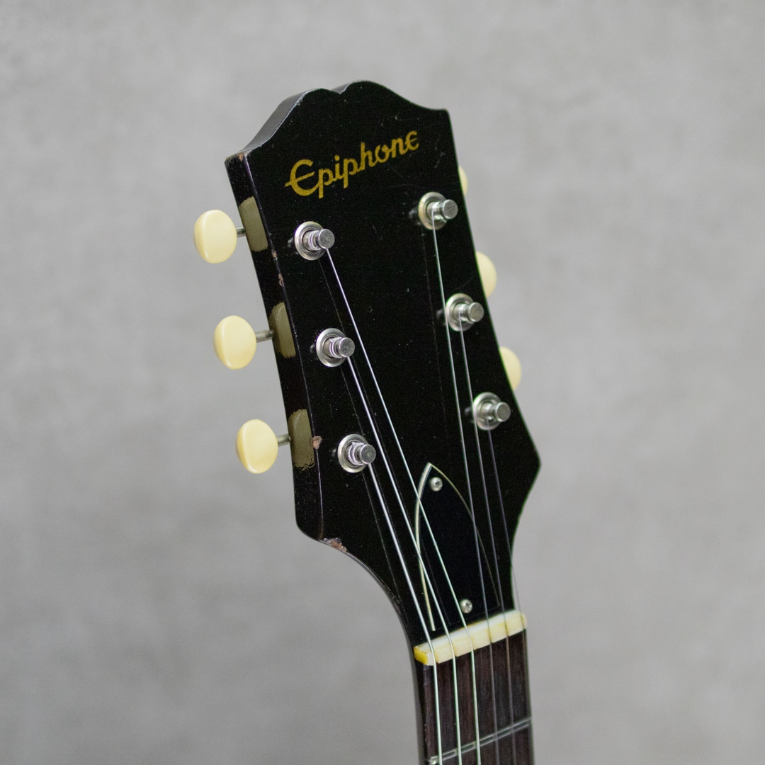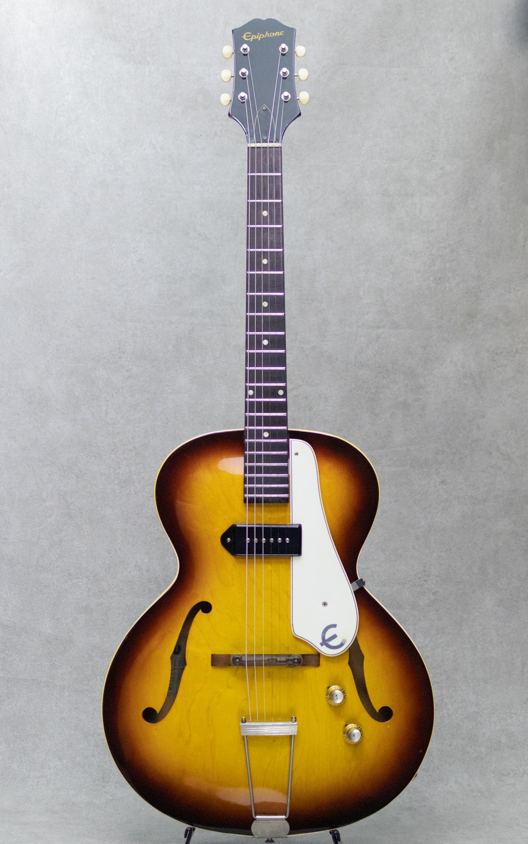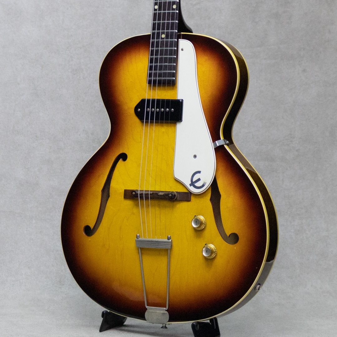 ギリシャ系移民の一家によって始まったEpiphone。20世紀の初めにマンハッタンに居を構えた一家は、マンドリンを始めとした楽器の製造・販売・修理業を住居兼工房の建物で経営し始めます。家業を受け継いだ長男のエパミノンダスは1928年に社名を現在のEpiphoneに改名。1930年代、ブームがバンジョーやアーチトップギターと変遷していく中、ライバルのGibson社としのぎを削りながらも両社は名声を大きくしていきます、しかし大戦中に生産体制に大きくダメージを受けた同社は、その後労働争議等も経て経営的に大きく落ち込む低迷期へと突入。50年代初頭に工房と深く所縁のあったレス・ポール氏はEpiphone救済をGibsonのテッド・マッカーティに進言。1957年同社はGibson傘下となり、翌年には新しいラインナップが展開され新たな道を進むこととなりました。本器は1963年Gibsonカラマズー工場製の一本、E422T "Century"。マホガニーネック/ハカランダ指板/16インチメイプルラミネイトボディ/P-90搭載。GibsonのES-125Tに準じたラインナップで近い仕様のシンボディーアーチトップですが、多くのGibsonのギターと同じく24.75インチ/約628mmのスケールを持つ"125"に対し、本器は25.5インチ/647.7mmのロングスケールで、故のより明るくハリのある軽快な響きが魅力。ジャッジャッと歯切れの良いコードワークは同じアコースティック感を持つES-125と比べても、よりも秀でたポイントと言えるでしょう。乾いた子気味の良い生鳴に、しっかりと押し出し感のあるP-90の組み合わせも抜群。こちら63年製ということもありナット幅42・強のレギュラーネックも魅力。気持ちの良い握り応えで、出音にも安定感のある太い音の芯が感じられます。こちら経年相応の細かな傷、チェッキングなどはあるものの、塗装表面の艶をしっかりと残し、サンバーストの発色も良く外観バッチリの一般。P-90、ポット、"ブラックビューティ"コンデンサ...他各所オリジナルパーツを残しており、コレクタブルなアイテムとしても十分なコンディション。リフレットがされている為、プレイヤビリティも良く、ハイフレットまでノンストレスにお楽しみいただけます。ハードケースが付属。