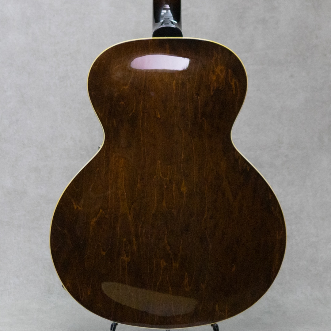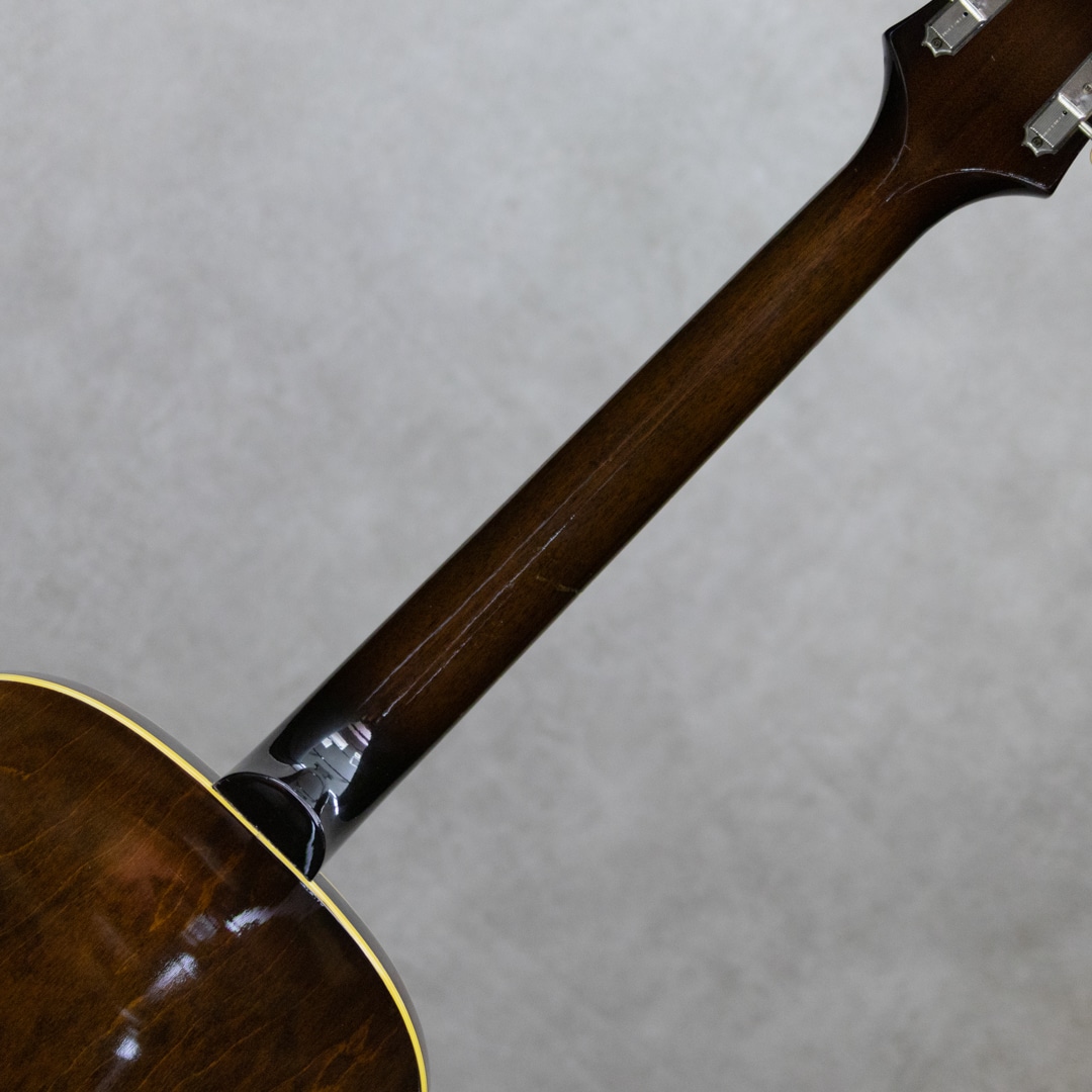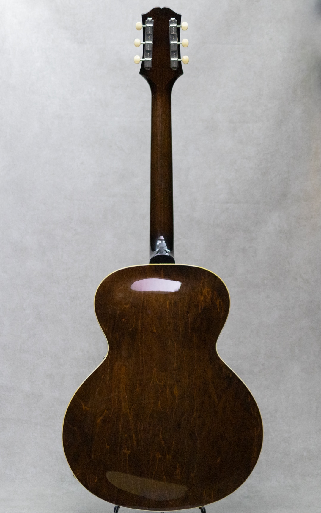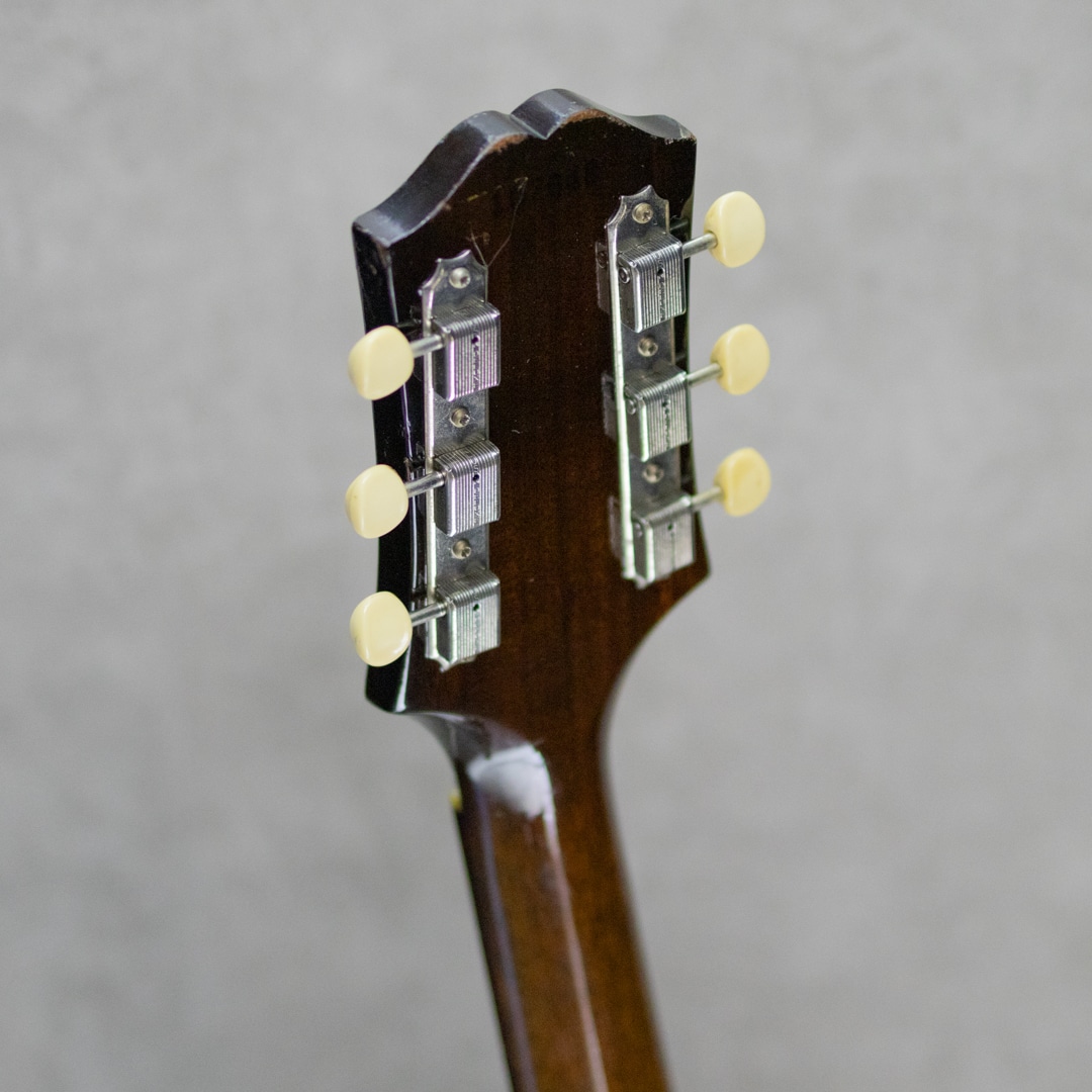 ギリシャ系移民の一家によって始まったEpiphone。20世紀の初めにマンハッタンに居を構えた一家は、マンドリンを始めとした楽器の製造・販売・修理業を住居兼工房の建物で経営し始めます。家業を受け継いだ長男のエパミノンダスは1928年に社名を現在のEpiphoneに改名。1930年代、ブームがバンジョーやアーチトップギターと変遷していく中、ライバルのGibson社としのぎを削りながらも両社は名声を大きくしていきます、しかし大戦中に生産体制に大きくダメージを受けた同社は、その後労働争議等も経て経営的に大きく落ち込む低迷期へと突入。50年代初頭に工房と深く所縁のあったレス・ポール氏はEpiphone救済をGibsonのテッド・マッカーティに進言。1957年同社はGibson傘下となり、翌年には新しいラインナップが展開され新たな道を進むこととなりました。本器は1963年Gibsonカラマズー工場製の一本、E422T "Century"。マホガニーネック/ハカランダ指板/16インチメイプルラミネイトボディ/P-90搭載。GibsonのES-125Tに準じたラインナップで近い仕様のシンボディーアーチトップですが、多くのGibsonのギターと同じく24.75インチ/約628mmのスケールを持つ"125"に対し、本器は25.5インチ/647.7mmのロングスケールで、故のより明るくハリのある軽快な響きが魅力。ジャッジャッと歯切れの良いコードワークは同じアコースティック感を持つES-125と比べても、よりも秀でたポイントと言えるでしょう。乾いた子気味の良い生鳴に、しっかりと押し出し感のあるP-90の組み合わせも抜群。こちら63年製ということもありナット幅42・強のレギュラーネックも魅力。気持ちの良い握り応えで、出音にも安定感のある太い音の芯が感じられます。こちら経年相応の細かな傷、チェッキングなどはあるものの、塗装表面の艶をしっかりと残し、サンバーストの発色も良く外観バッチリの一般。P-90、ポット、"ブラックビューティ"コンデンサ...他各所オリジナルパーツを残しており、コレクタブルなアイテムとしても十分なコンディション。リフレットがされている為、プレイヤビリティも良く、ハイフレットまでノンストレスにお楽しみいただけます。ハードケースが付属。