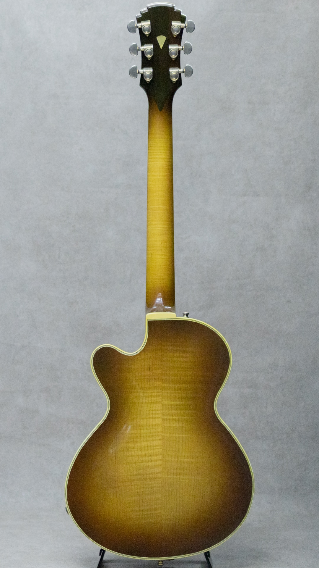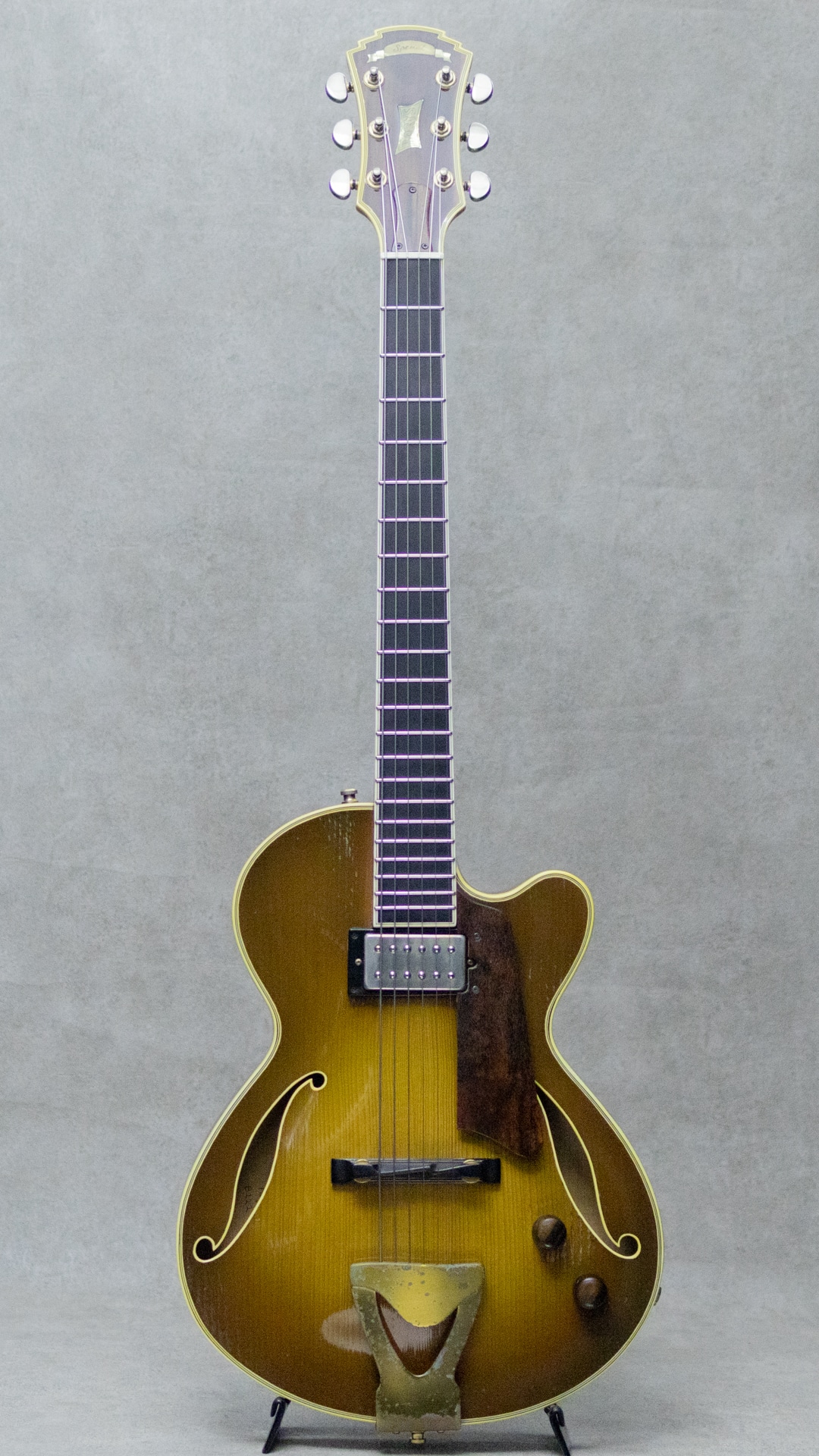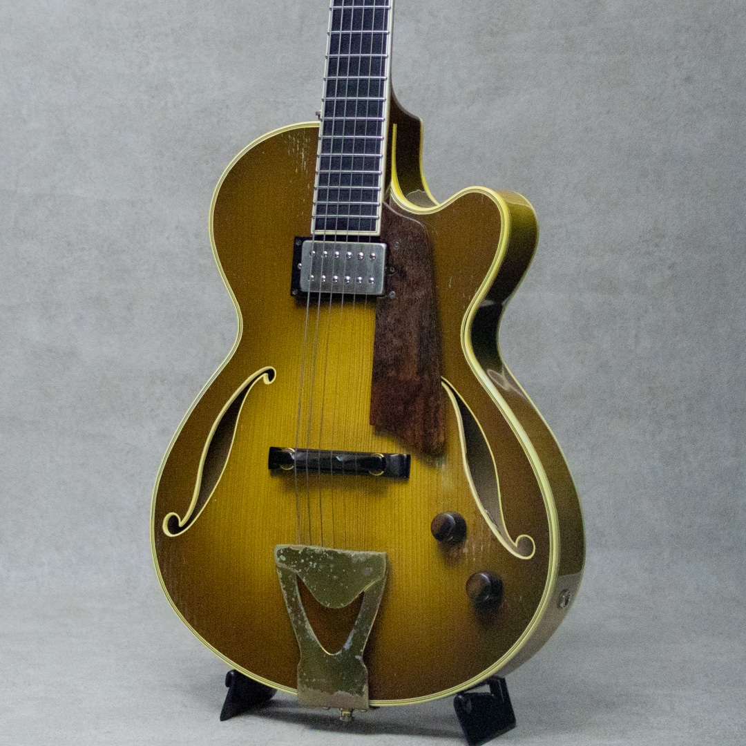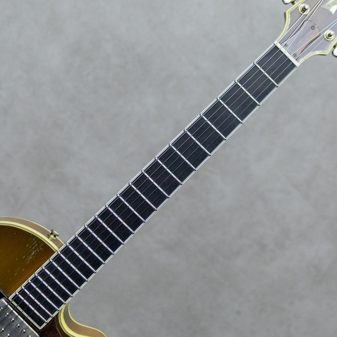 Roger Borys(ロジャーボリス)は1953年ニュージャージーに生まれ、今なお精力的に活動を続ける製作家。1970年代にギターの修理を主とした工房を立ち上げ、1978年までに11本のギターを試作。その後ニューヨークのJames L. D'Aquisto(ジェームス・ダキスト)にコンタクトをとり親交を深めました。名工John D'Angelico(ジョン・ディアンジェリコ)の元に師事したダキストは、その後亡くなる1995年までロジャーの良き指導者、ビジネスパートナー、友人となりました。20世紀の偉大なアーチトップ製作家の系譜に大きな影響を受け、そのバックボーンを色濃く感じさせるギターを製作。本器は削り出しハンドカーブドのスプルーストップに、同じくハンドカーブドのフレイムメイプルバック、フレイムメイプルネック、エボニー指板、ボディ幅13インチに24 3/4インチスケールのぱっと手に取りやすい一本。同シェイプの"Jazz Solid"にfホールを設けホロウキャラクターを強調したオーダーと思われます。テールピースにはテンション調整機構を持たせたオリジナルパーツを採用。小さいボディながら全体で響くラウドな鳴感をもち、氏の経歴をしっかりと感じられるドライながらもどこか暖かみのあるトーン。アンプからの出音も一音一音がしっかりと前に飛んでくれる説得力のあるジャズトーン。しっかりと引き込まれてきた印象を受け、各所の塗装の剥がれや打痕、ボディバックの擦れキズなど、ヴィンテージフィールな経年が見られます。しかし顕著に外観を損なるダメージや、割れ、大きな修理跡や構造的な瑕疵などなくネックのコンディションもしっかりとした良い状態。現状12‐52ゲージのフラットワウンドにてセッティングをしておりますが、弦高もローアクションのとても弾きやすいコンディションです。かわいらしいルックスとサウンド、部屋でぱっと手に取るのにも素敵な一本。ぜひご検討ください。ハードケースが付属。