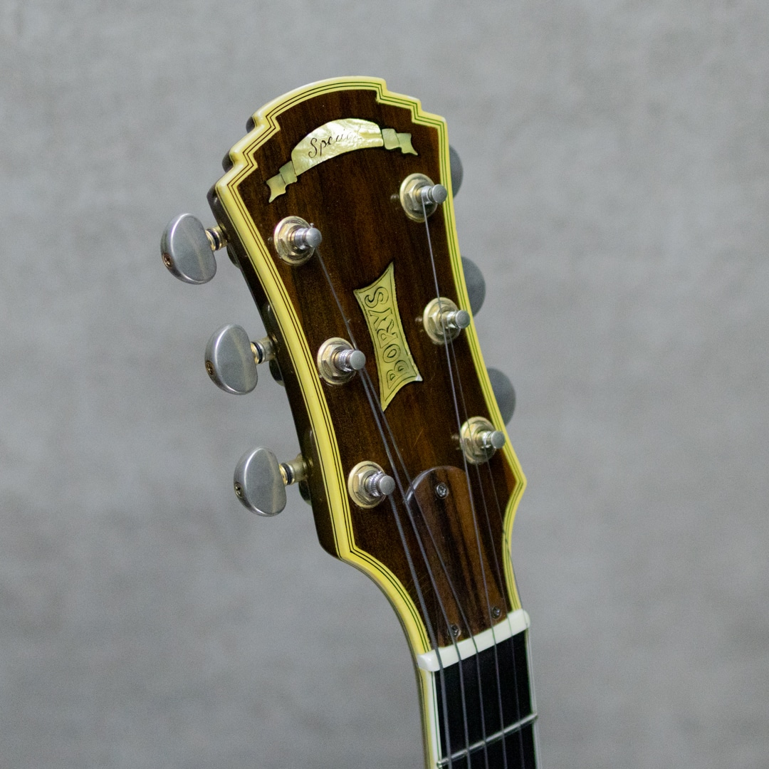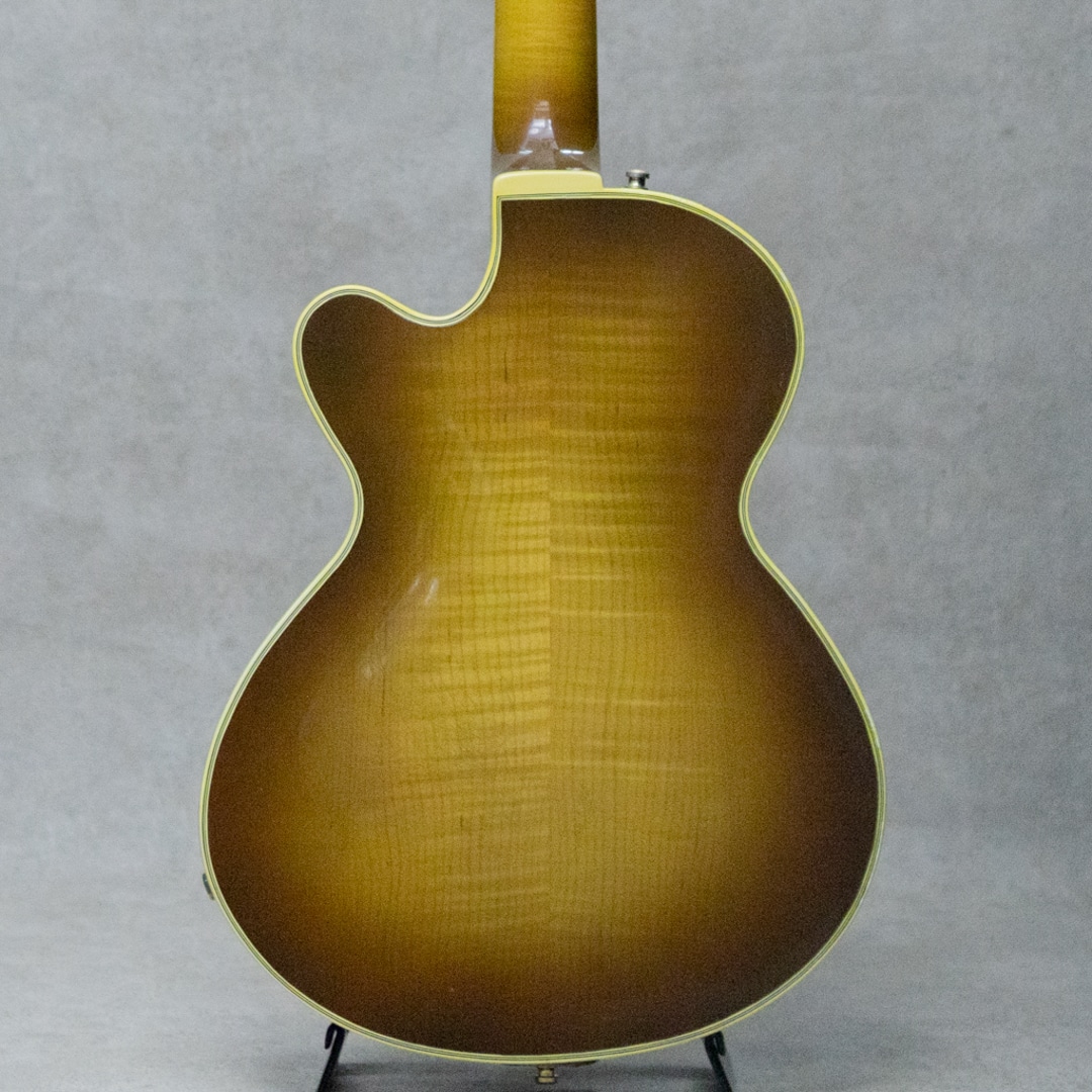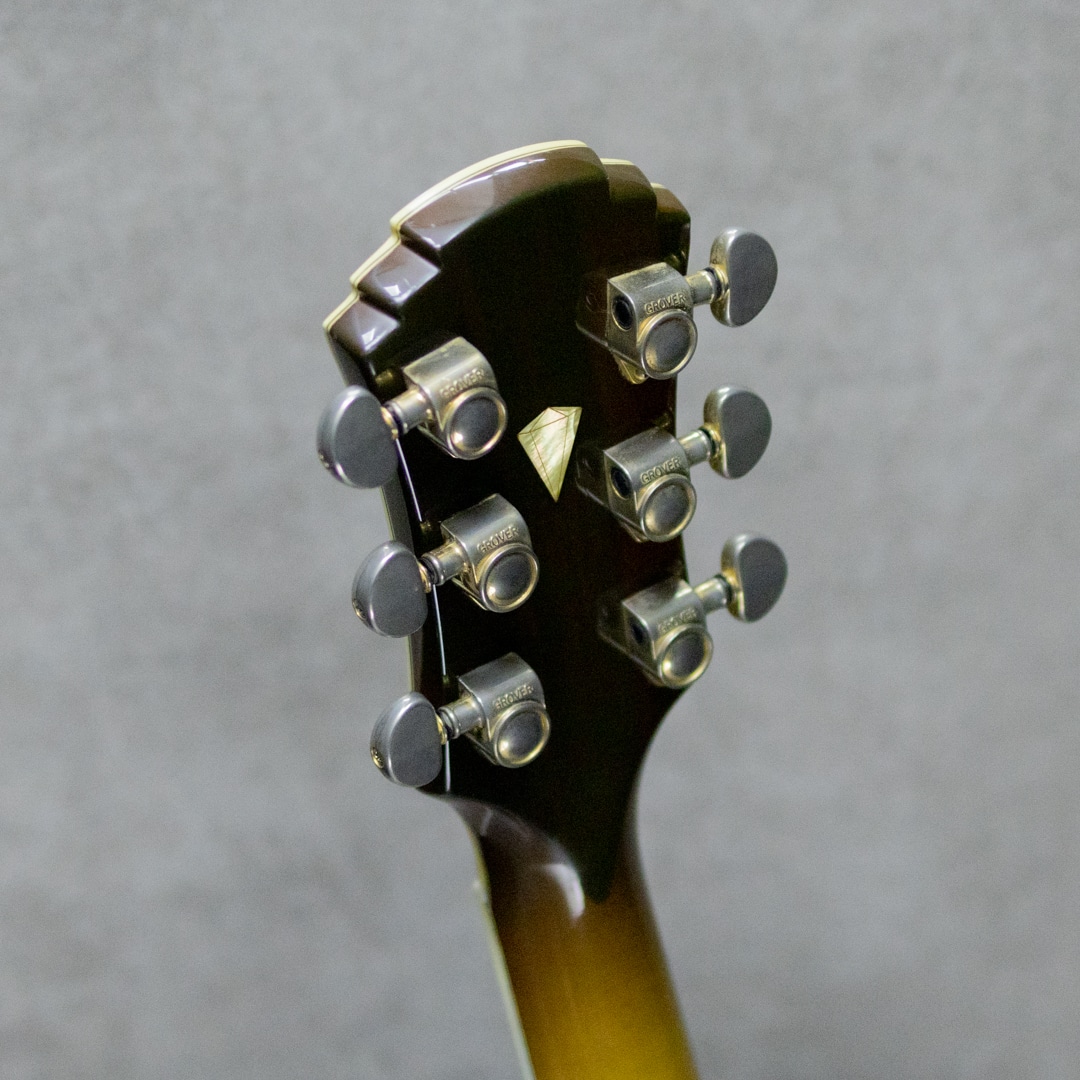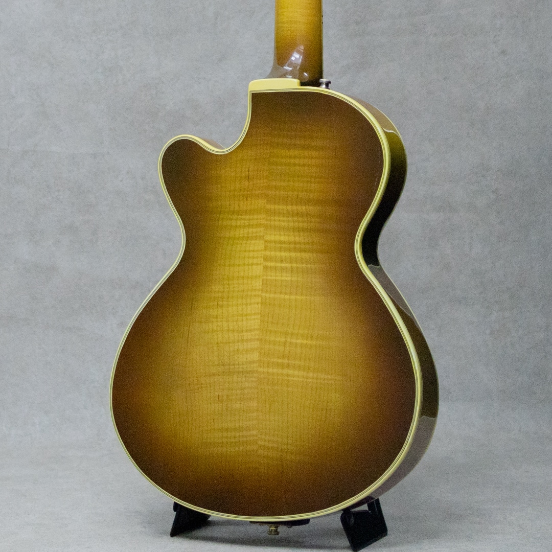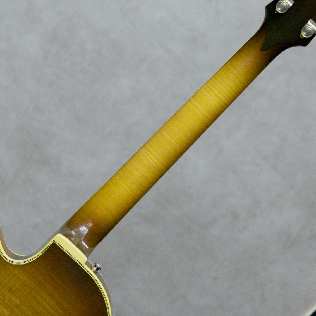 Roger Borys(ロジャーボリス)は1953年ニュージャージーに生まれ、今なお精力的に活動を続ける製作家。1970年代にギターの修理を主とした工房を立ち上げ、1978年までに11本のギターを試作。その後ニューヨークのJames L. D'Aquisto(ジェームス・ダキスト)にコンタクトをとり親交を深めました。名工John D'Angelico(ジョン・ディアンジェリコ)の元に師事したダキストは、その後亡くなる1995年までロジャーの良き指導者、ビジネスパートナー、友人となりました。20世紀の偉大なアーチトップ製作家の系譜に大きな影響を受け、そのバックボーンを色濃く感じさせるギターを製作。本器は削り出しハンドカーブドのスプルーストップに、同じくハンドカーブドのフレイムメイプルバック、フレイムメイプルネック、エボニー指板、ボディ幅13インチに24 3/4インチスケールのぱっと手に取りやすい一本。同シェイプの"Jazz Solid"にfホールを設けホロウキャラクターを強調したオーダーと思われます。テールピースにはテンション調整機構を持たせたオリジナルパーツを採用。小さいボディながら全体で響くラウドな鳴感をもち、氏の経歴をしっかりと感じられるドライながらもどこか暖かみのあるトーン。アンプからの出音も一音一音がしっかりと前に飛んでくれる説得力のあるジャズトーン。しっかりと引き込まれてきた印象を受け、各所の塗装の剥がれや打痕、ボディバックの擦れキズなど、ヴィンテージフィールな経年が見られます。しかし顕著に外観を損なるダメージや、割れ、大きな修理跡や構造的な瑕疵などなくネックのコンディションもしっかりとした良い状態。現状12‐52ゲージのフラットワウンドにてセッティングをしておりますが、弦高もローアクションのとても弾きやすいコンディションです。かわいらしいルックスとサウンド、部屋でぱっと手に取るのにも素敵な一本。ぜひご検討ください。ハードケースが付属。