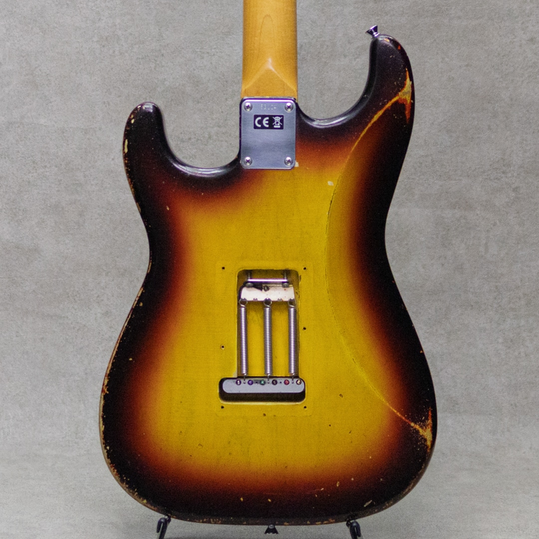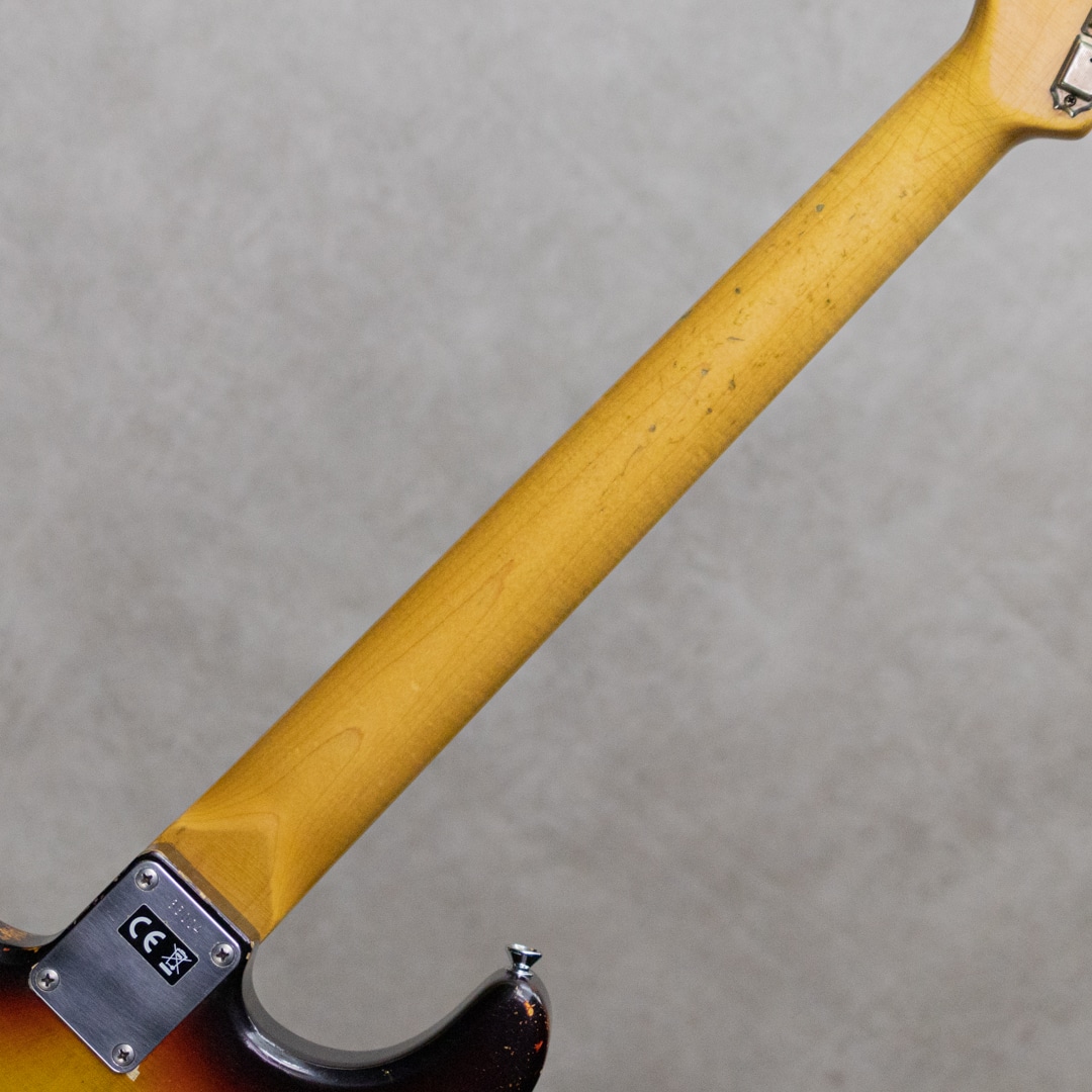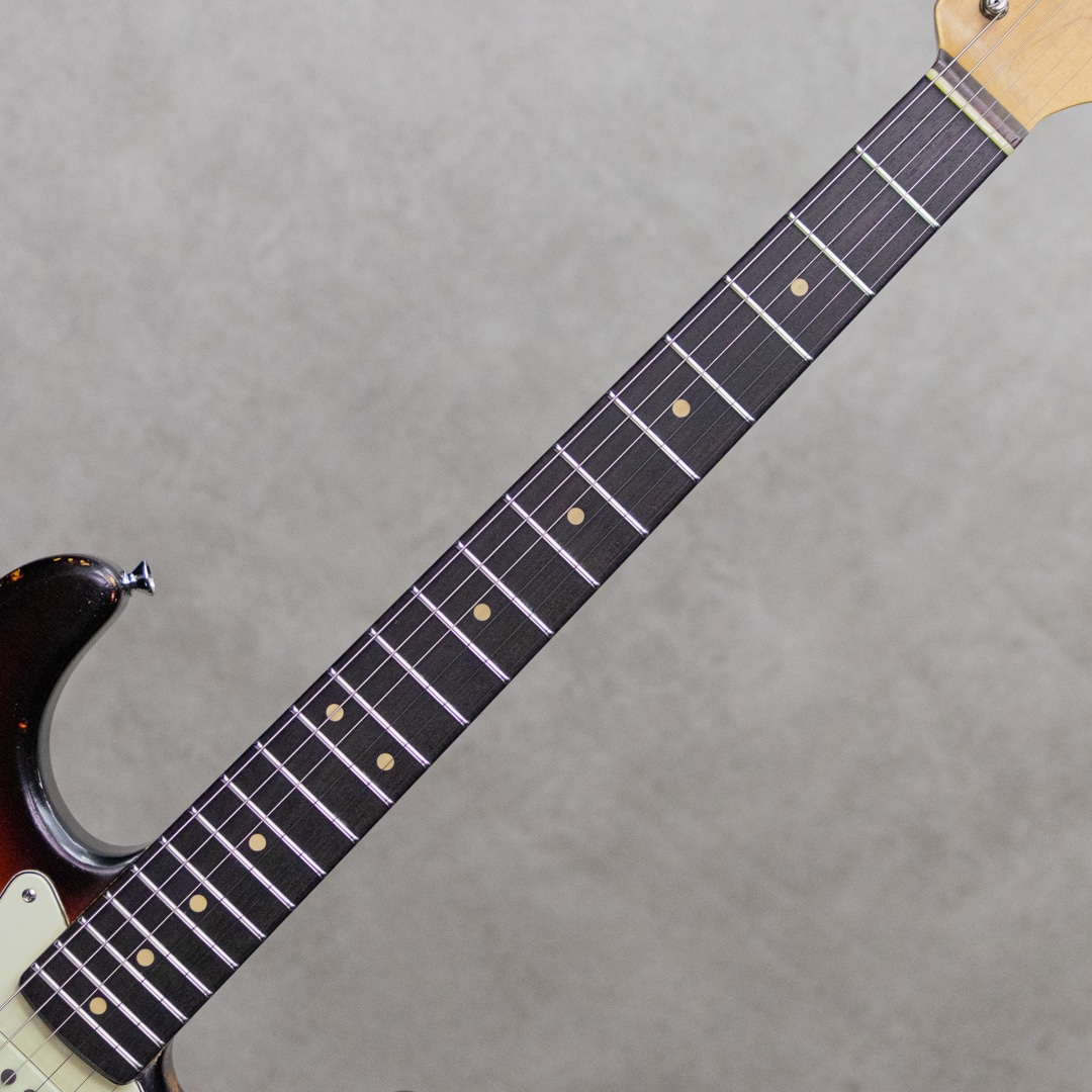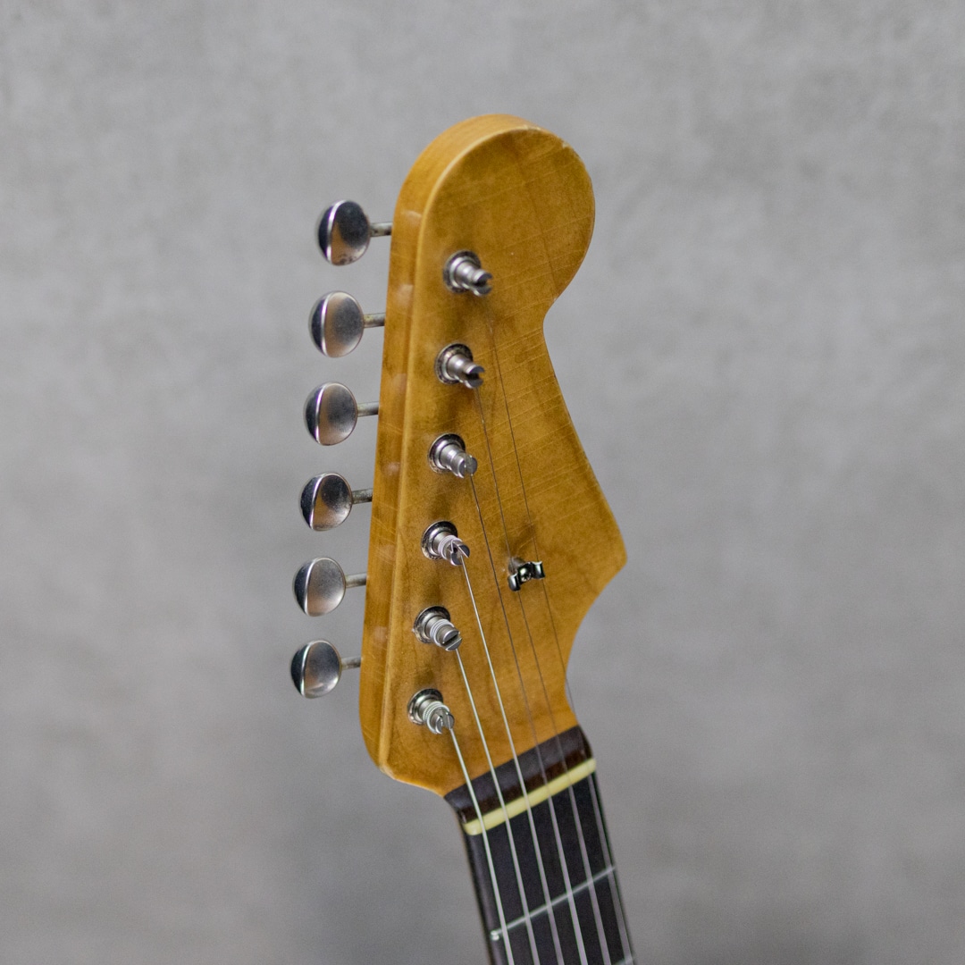 "THE BLACKGUARD BOOK"の著書でもあるNacho Banos氏による、究極のBlackguard Replicaブランド"Nacho Guitars”。年間の製作本数は非常に少なく日本国内への入荷数も限られており、カタログモデルといった概念は無く1本1本個性を宿したギターをワンオフで製作するようなスタイルが貫かれています。同じ年代・特徴のモデルであっても、それぞれが個性を持った外観・弾き心地・そしてサウンドが表現されております。本器は、”Early 60s Contour Body #44010 Heavy Aging Sunburst Medium C Neck”。オリジナル・ブラックガードを知り尽くしたNacho氏の経験値を元に製作される、圧巻の完成度を誇る 60’sレプリカの1本。スラブローズウッド指板、メイプルネック、アッシュボディのウッドスペック。オールドを知り尽くしたNacho氏ならではの雰囲気あるヘビーエイジド加工が施された3トーンサンバーストカラー。ミディアムCシェイプに仕上げられたネックは細すぎず薄すぎない握り心地の良いネックシェイプです。本物さながらの経年したハードウェア、褪色感を再現したエイジングカラーの3plyミントグリーンPGは、その作り込みを愛でるだけでも楽しめる仕上がり。9.5”ラジアス指板、ミディアムフレット、Early60’sスタイルトレモロブリッジ、スチールサドル、Early 60’sスタイルピックアップ。ピックアップセレクターワイヤリングは5wayで、ネックPUトーン、センターPU&ブリッジPUトーンです。ファットで野太いレスポンス、倍音感にあふれる甘いトーンから、ベルトーンの美しいハーフトーンまで、このスタイルに求められるサウンドを遺憾なく発揮してくれます。ストイックにブラックガードを愛したNacho氏ながら、指板ラジアスやピックアップワイヤリングなどはモダンで使いやすいセットをセレクトしており、より実戦向きで使えるビンテージレプリカに仕上げられています。こちら2022年製Used品。ボディバック等の小さな塗装チップなど、元の表現に加えて多少エイジングの進んだ様子も見受けられますが、顕著に外観を損ねるものはございません。ロッドの調整を含めネックの状態も良く抜群のプレイコンディション。即戦力でお楽しみいただける一本。オリジナルビンテージと見まごうほどの雰囲気と仕上がりの話題と人気を集めるスペイン発”Nacho Guitars”。オリジナルハードケース、トレモロアーム、バックパネル、オリジナル・レザーバック、スペックシート、当機の画像データが入ったUSBとUSB用の木箱が付属。