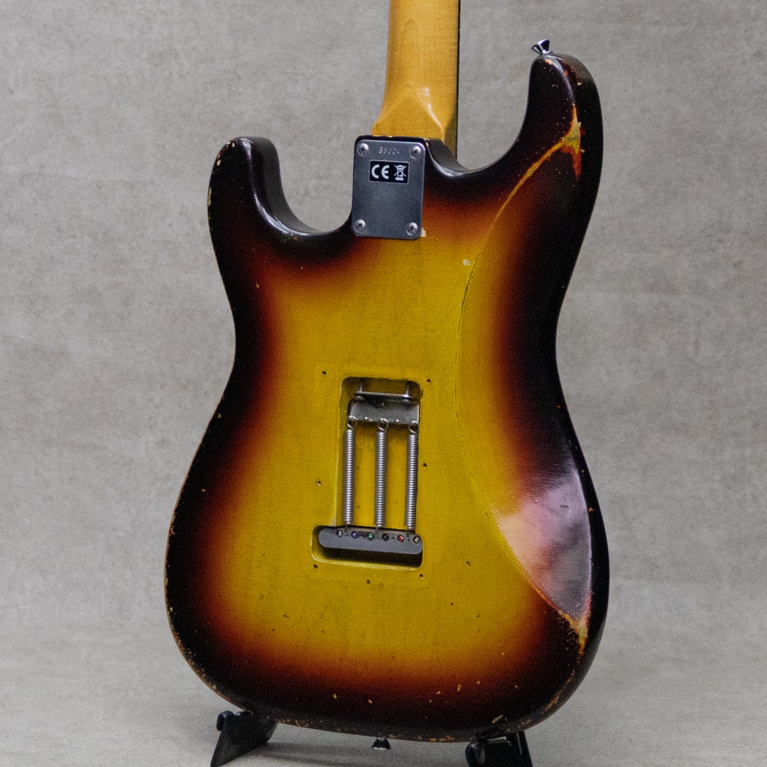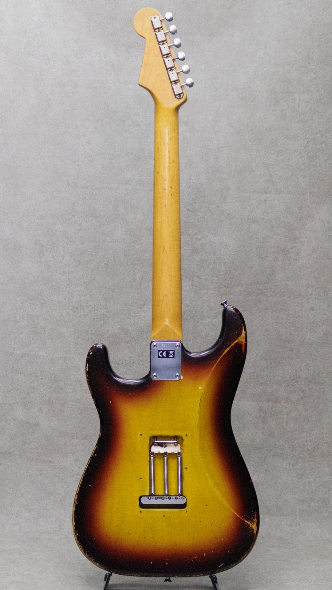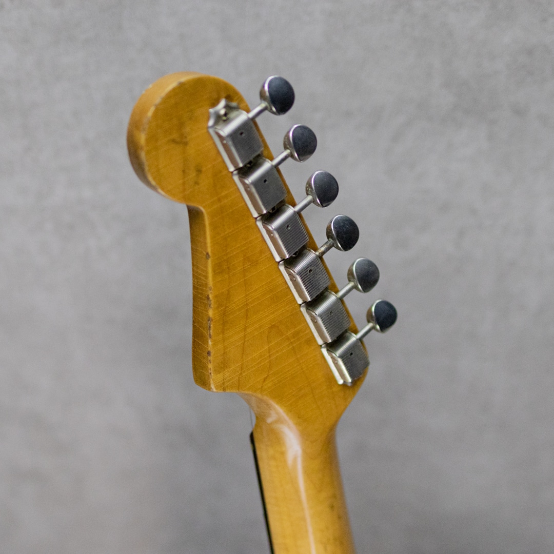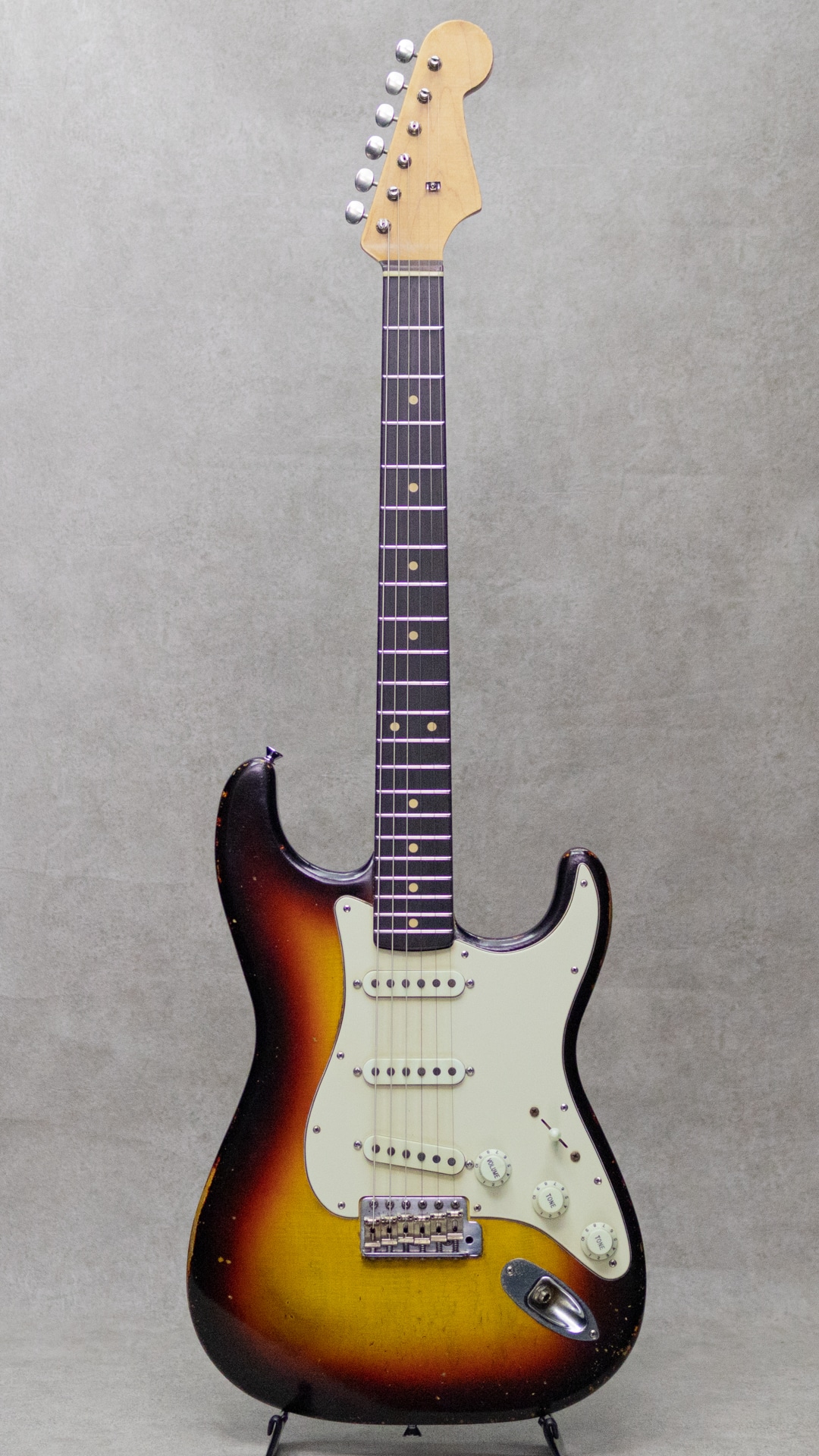"THE BLACKGUARD BOOK"の著書でもあるNacho Banos氏による、究極のBlackguard Replicaブランド"Nacho Guitars”。年間の製作本数は非常に少なく日本国内への入荷数も限られており、カタログモデルといった概念は無く1本1本個性を宿したギターをワンオフで製作するようなスタイルが貫かれています。同じ年代・特徴のモデルであっても、それぞれが個性を持った外観・弾き心地・そしてサウンドが表現されております。本器は、”Early 60s Contour Body #44010 Heavy Aging Sunburst Medium C Neck”。オリジナル・ブラックガードを知り尽くしたNacho氏の経験値を元に製作される、圧巻の完成度を誇る 60’sレプリカの1本。スラブローズウッド指板、メイプルネック、アッシュボディのウッドスペック。オールドを知り尽くしたNacho氏ならではの雰囲気あるヘビーエイジド加工が施された3トーンサンバーストカラー。ミディアムCシェイプに仕上げられたネックは細すぎず薄すぎない握り心地の良いネックシェイプです。本物さながらの経年したハードウェア、褪色感を再現したエイジングカラーの3plyミントグリーンPGは、その作り込みを愛でるだけでも楽しめる仕上がり。9.5”ラジアス指板、ミディアムフレット、Early60’sスタイルトレモロブリッジ、スチールサドル、Early 60’sスタイルピックアップ。ピックアップセレクターワイヤリングは5wayで、ネックPUトーン、センターPU&ブリッジPUトーンです。ファットで野太いレスポンス、倍音感にあふれる甘いトーンから、ベルトーンの美しいハーフトーンまで、このスタイルに求められるサウンドを遺憾なく発揮してくれます。ストイックにブラックガードを愛したNacho氏ながら、指板ラジアスやピックアップワイヤリングなどはモダンで使いやすいセットをセレクトしており、より実戦向きで使えるビンテージレプリカに仕上げられています。こちら2022年製Used品。ボディバック等の小さな塗装チップなど、元の表現に加えて多少エイジングの進んだ様子も見受けられますが、顕著に外観を損ねるものはございません。ロッドの調整を含めネックの状態も良く抜群のプレイコンディション。即戦力でお楽しみいただける一本。オリジナルビンテージと見まごうほどの雰囲気と仕上がりの話題と人気を集めるスペイン発”Nacho Guitars”。オリジナルハードケース、トレモロアーム、バックパネル、オリジナル・レザーバック、スペックシート、当機の画像データが入ったUSBとUSB用の木箱が付属。
