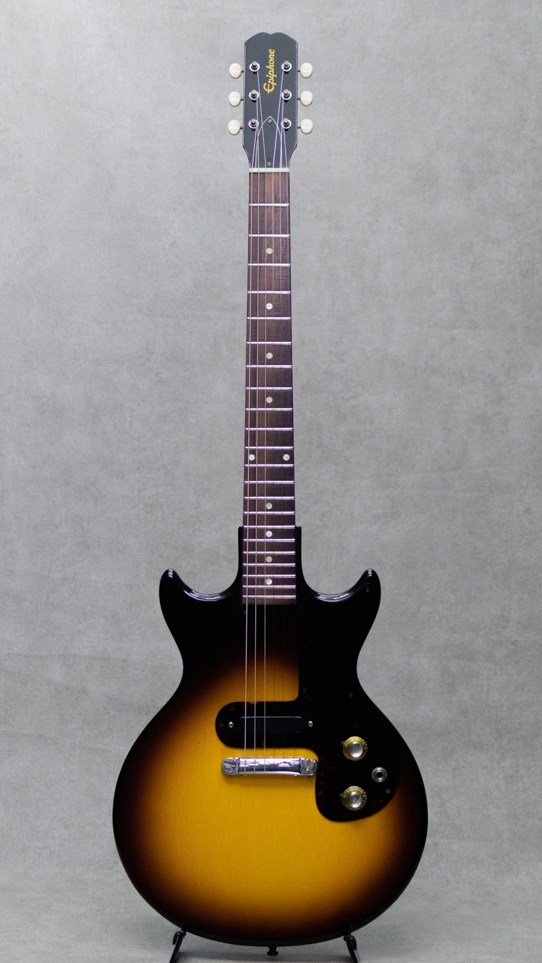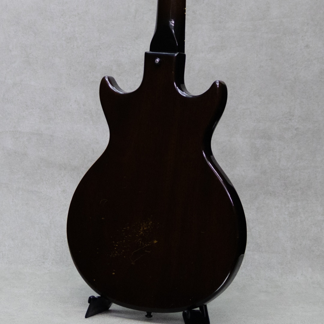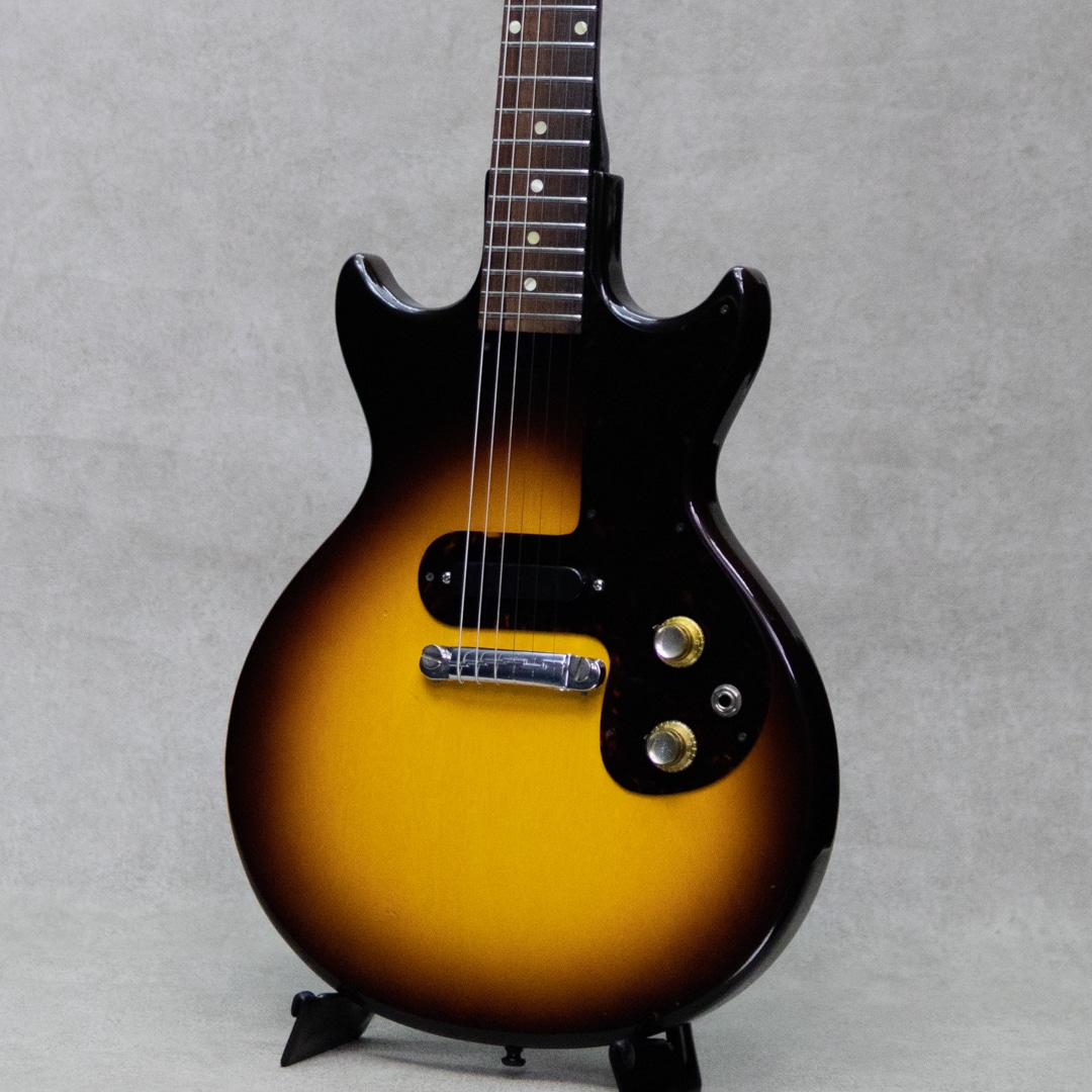 1960年登場のEpiphone OlympicはGibson "Melodymaker"の従妹ともいえるラインナップで、当時の普及価格ソリッドモデルとして同じカラマズーの工場にて製造がされました。実はMelodymakerよりも細かな仕様変更が多いOlympic。登場初期は"MM"と同じシングルカット、62年頃ダブルカットスタイルに変更、しかしそのすぐ後には兄弟機のCoronet、Wilshire、Crestwoodとともに、Epiphoneオリジナルのダブルカットスタイルに変更がされ、Melodymakerの単なるコピーではなくなっていきます。本器はMelodymakerに倣いシングルカットデザインからダブルカットへと変更がされた2期目デザインの63年製。約42.9mmナット幅のレギュラーネック、ハカランダ指板、マホガニー1ピースボディ。握り応えの心地よいネックプロファイルと、軽いボディから放たれる軽快ながらもラウドな広がりを持った響きが楽しい一本。素体の鳴りが良く、思いのほかボディから豊かなサスティンも感じられます。この頃はヘッドストックの形もまだGibsonヘッドの名残を残したデザイン性ある造詣。こちら全体的にとてもコンディションの良い印象で勿論経年相応のウェザーチェックはあるものの塗装表面の艶感をしっかりと残しております。細かなうち傷、ボディバックのバックル痕等あるものの、顕著に外観を損ねるものはございません。ロッドの調整を含め良好なネックコンディション。ラップアラウンドブリッジがクロームメッキの為、少し後の年代のものに変わっている可能性がございますが、同モデルに使われていた純正パーツです。可愛いルックスながらまさにヴィンテージらしい風格をしっかり備えた魅力的なモデル。ぜひお見逃しなく。当時物のチップボードケースが付属いたします。