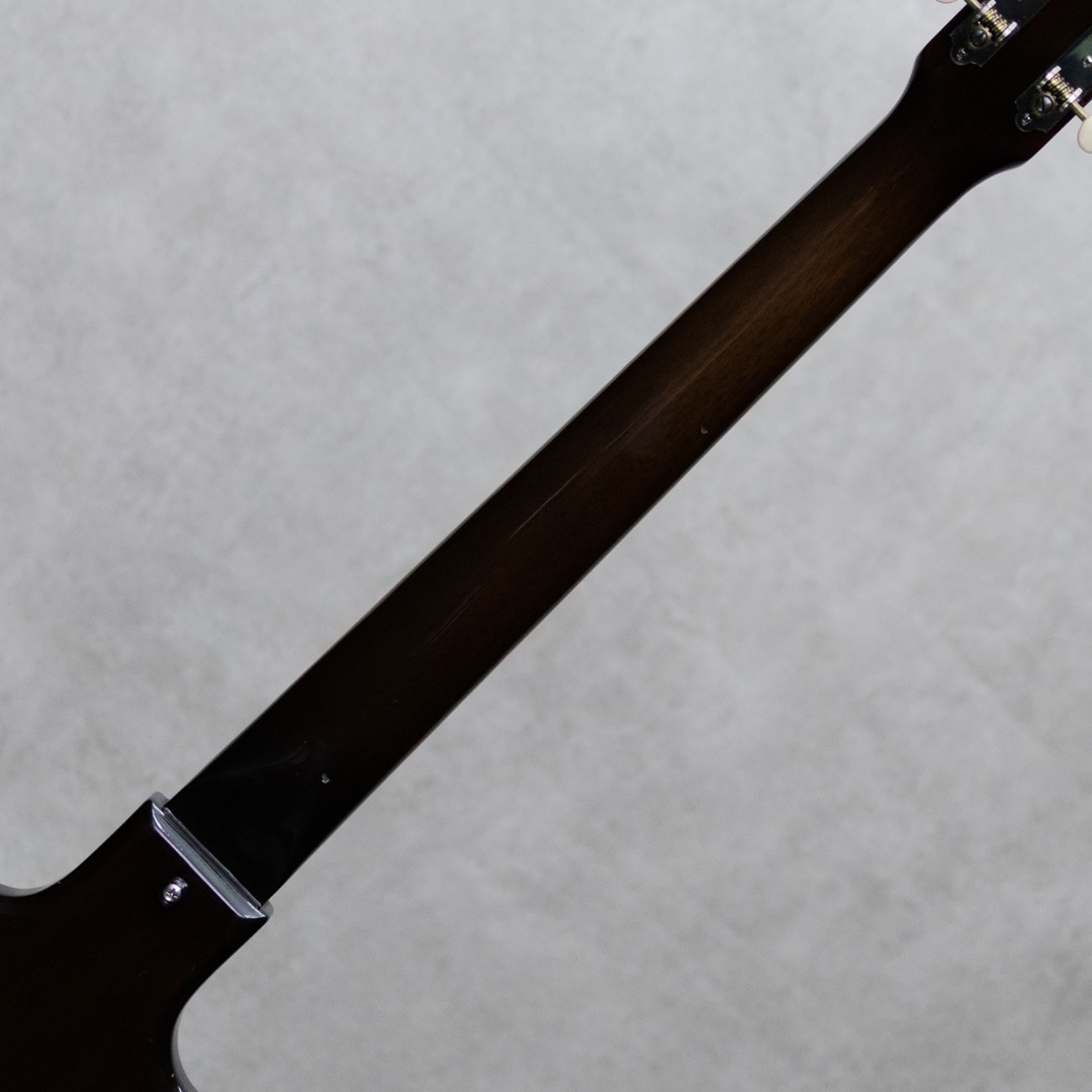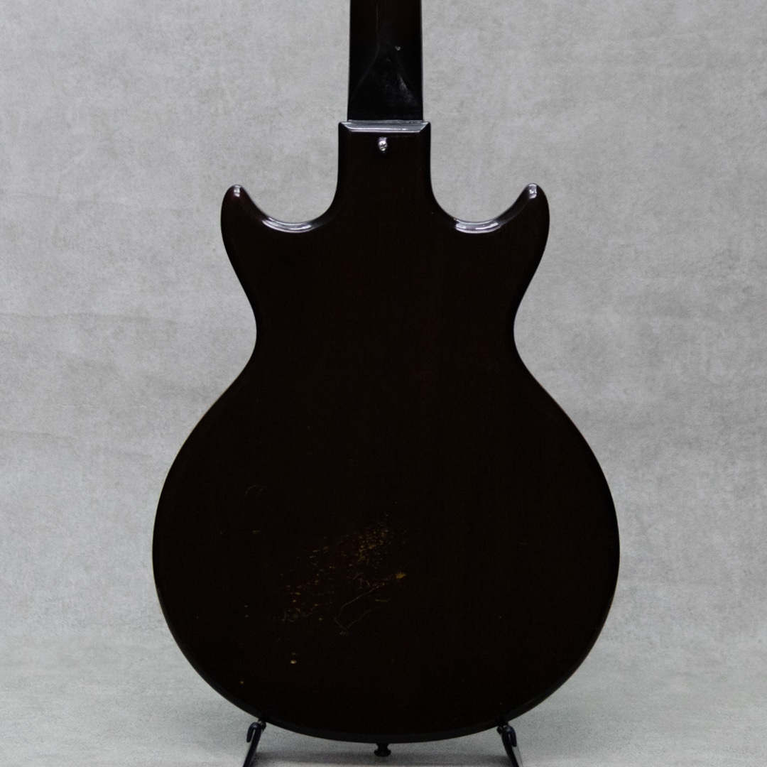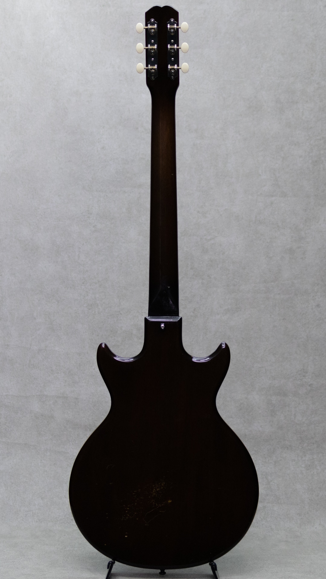 1960年登場のEpiphone OlympicはGibson "Melodymaker"の従妹ともいえるラインナップで、当時の普及価格ソリッドモデルとして同じカラマズーの工場にて製造がされました。実はMelodymakerよりも細かな仕様変更が多いOlympic。登場初期は"MM"と同じシングルカット、62年頃ダブルカットスタイルに変更、しかしそのすぐ後には兄弟機のCoronet、Wilshire、Crestwoodとともに、Epiphoneオリジナルのダブルカットスタイルに変更がされ、Melodymakerの単なるコピーではなくなっていきます。本器はMelodymakerに倣いシングルカットデザインからダブルカットへと変更がされた2期目デザインの63年製。約42.9mmナット幅のレギュラーネック、ハカランダ指板、マホガニー1ピースボディ。握り応えの心地よいネックプロファイルと、軽いボディから放たれる軽快ながらもラウドな広がりを持った響きが楽しい一本。素体の鳴りが良く、思いのほかボディから豊かなサスティンも感じられます。この頃はヘッドストックの形もまだGibsonヘッドの名残を残したデザイン性ある造詣。こちら全体的にとてもコンディションの良い印象で勿論経年相応のウェザーチェックはあるものの塗装表面の艶感をしっかりと残しております。細かなうち傷、ボディバックのバックル痕等あるものの、顕著に外観を損ねるものはございません。ロッドの調整を含め良好なネックコンディション。ラップアラウンドブリッジがクロームメッキの為、少し後の年代のものに変わっている可能性がございますが、同モデルに使われていた純正パーツです。可愛いルックスながらまさにヴィンテージらしい風格をしっかり備えた魅力的なモデル。ぜひお見逃しなく。当時物のチップボードケースが付属いたします。