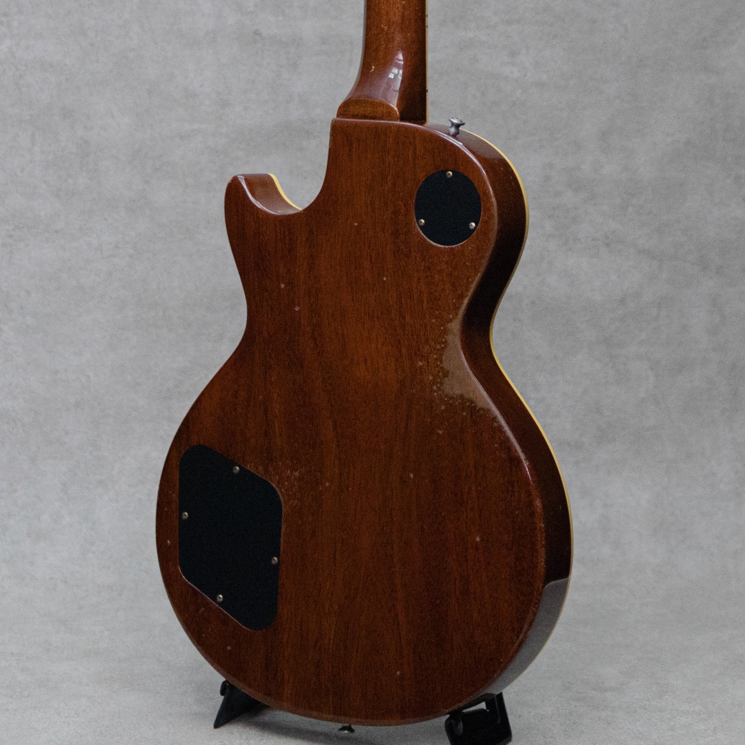 Gibson Custom Shopにおけるフラッグシップモデル"R9 Les Paul"。最新のアップデートは常に当モデルのブラッシュアップから波及していく形で進められます。2015年の"True Historic"登場、2018年の"Historic Collection"復活を経て、2019年の60周年記念モデルではデザインディテール、電装パーツ等がより詰められた決定版的スペックとなりました。より当時に近い書体と色味のヘッドロゴ、シルクスクリーン、ロウ付けをしないアンポッテド仕様のCustombuckerピックアップ、オールニカワ接着やTrue Historicパーツの採用…etc。90年代から続くリイシューLes Paulにおいて圧倒的な完成度を誇る現行最新仕様。加えてヴィンテージが持つ独自の雰囲気を、更なる技術によってアップデートしたシリーズが"Murphy Lab"シリーズです。2021年より始動した"Murphy Lab Collection"は最新のHistoric Collectionと同スペックの完成度を持ちつつ、塗装のみ独自の手法を採用。従来のエイジドではウェザーチェックの再現を刃物で表現していましたが、"Murphy Lab"では1950~60年代のニトロセルロースラッカーを解析し新開発したラッカーを使用することにより、自然に発生させるリアルなウェザーチェックを実現。さらには薄めの塗装の質感による、ヴィンテージに迫る自然な風合いと豊かで力強い生鳴りは格別。ヴィンテージに迫るルックスとフィーリングを弾き手に与える、『究極のヴィンテージ・クローン・シリーズ』を実現しました。オリジナルサウンドに迫る立ち上がりのスピード感、反応の良さ、オープンなサウンドは圧巻。"Historic Collection"の一般的な塗装スペックである"VOS"仕様では、敢えてある程度柔軟性を持たせたラッカーが採用されています。これは新品製品として不用意に塗装チェッキングが入らないようにする工夫でもありますが、"本当に割れていてる"Murphy Labにおいて、その完成度はルックスのリアルさに留まらず、湿ったシャツを脱ぎ捨てたような圧倒的な解放感を感じさせます。本器は4段階のエイジング・オプション中、3段目にあたるヘヴィエイジド。基本的にチェッキングの塗装表現のみのライトエイジドに対し、エルボー部分の塗装ハゲ、ボディバックのバックル跡、細かな打痕やスクラッチ、より経年が進行したハードウェア類といった抜群の表現を追加。視覚的情報量が増えることによって、いつまでも眺めていられる圧倒的な存在感を実現しています。赤みの飛んだサンバーストに焼けでティントしたクリア層が重なった様子のダブルダーティレモンカラー。エイジング表現とも抜群の相性。見る角度によって表情を変えるメイプルトップも非常にリアル。こちらエイジドモデルの為、細かな判断は難しい部分もございますが、2024年製ということもあり、使用に伴うものは感じられない美品コンディション、フレットの使用感もほとんど感じません。ロッドの調整を含め良好なネックコンディション。ぜひお見逃しなく。オリジナルハードケース、認定書、新品時付属のキャンディ類等完備。